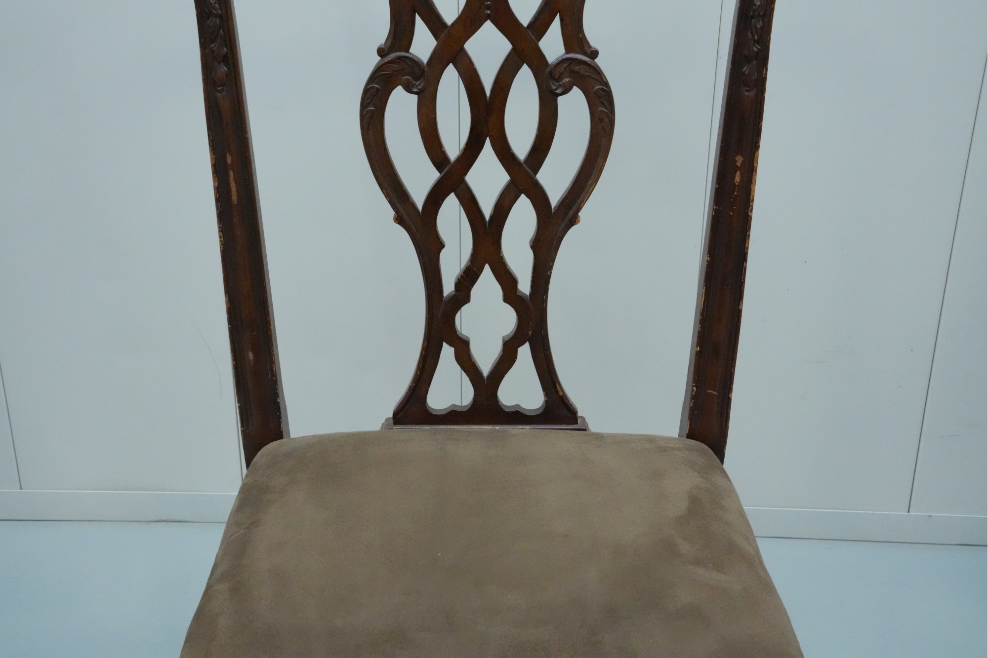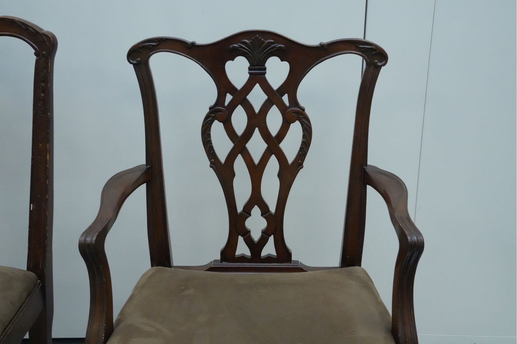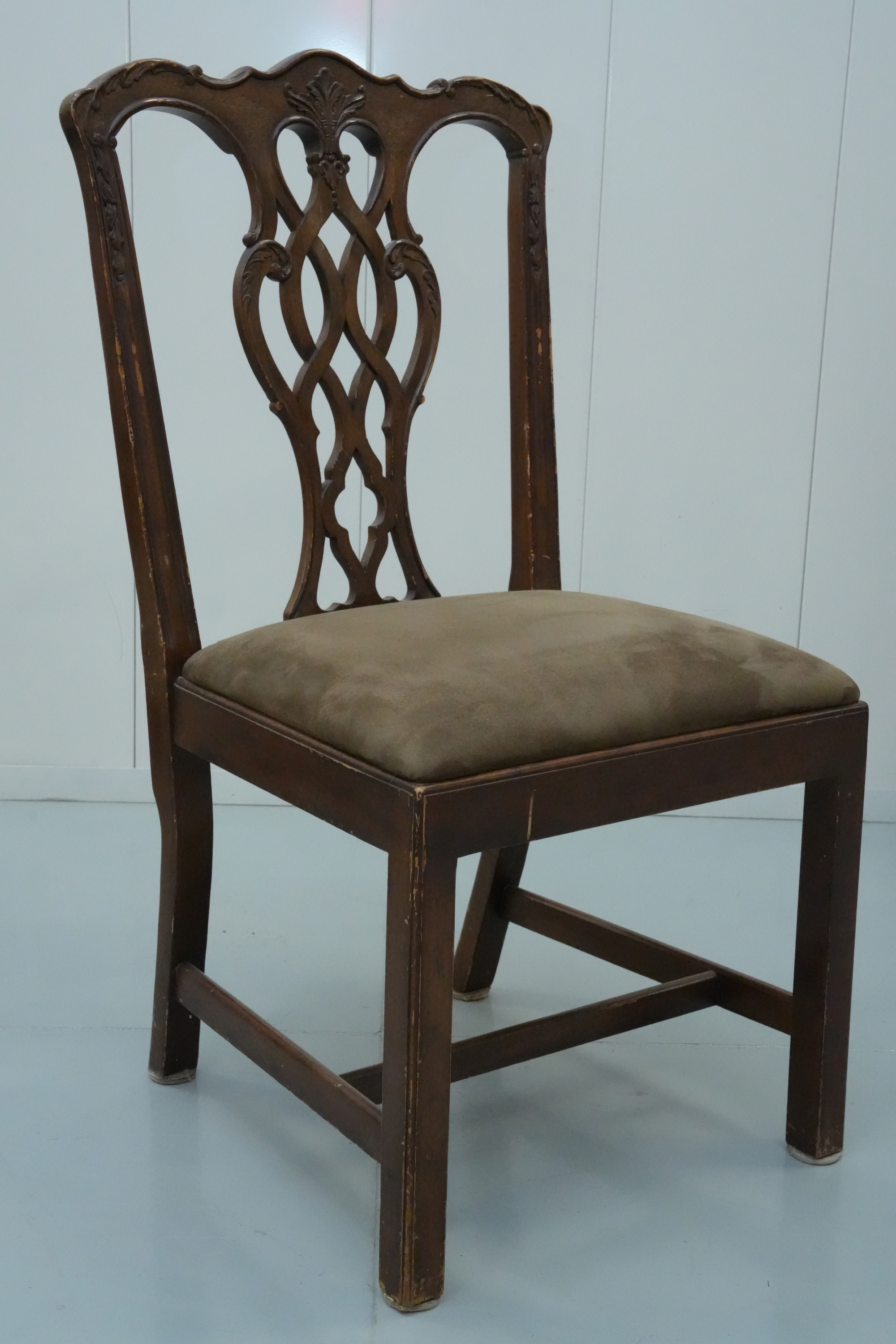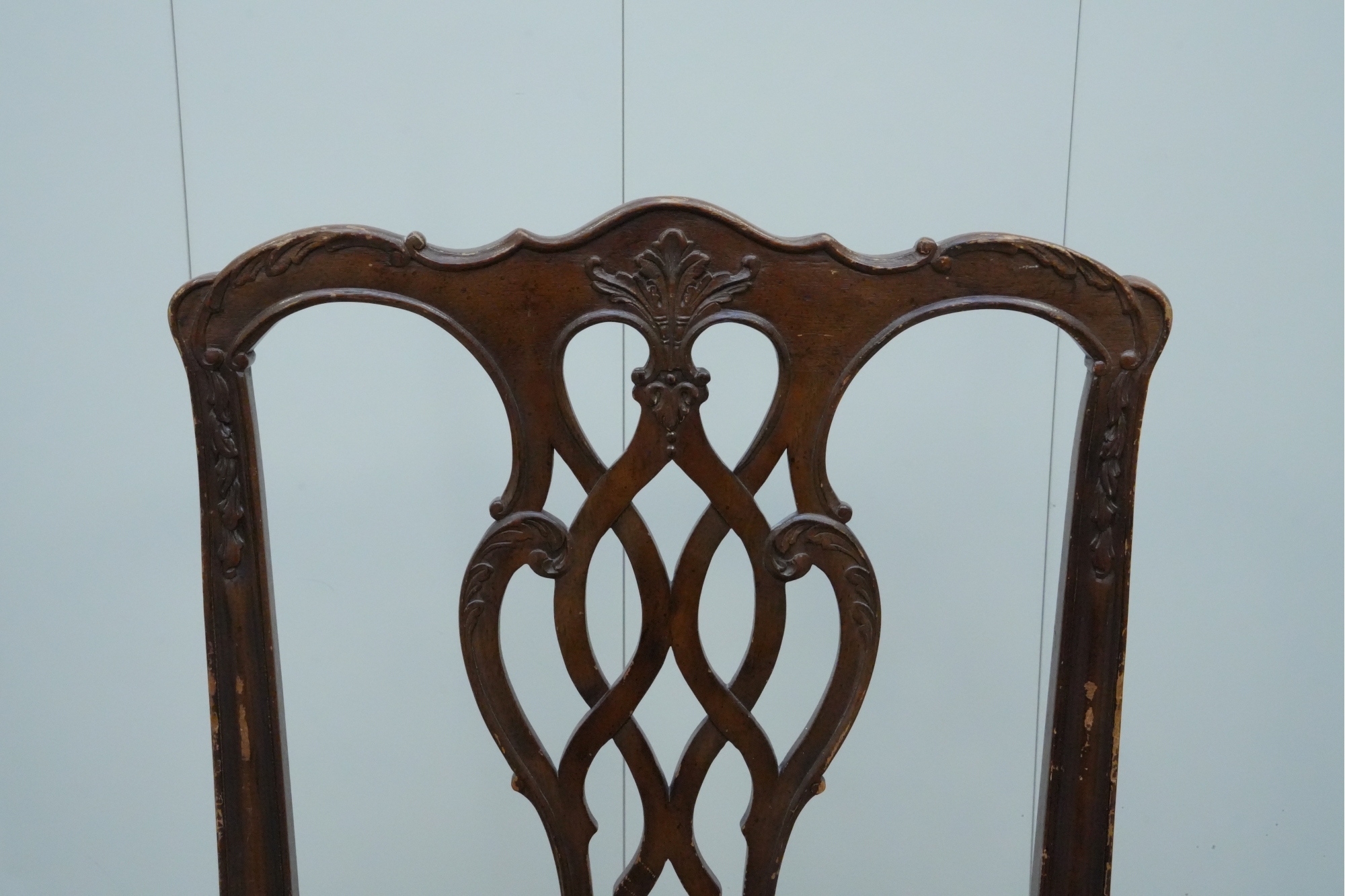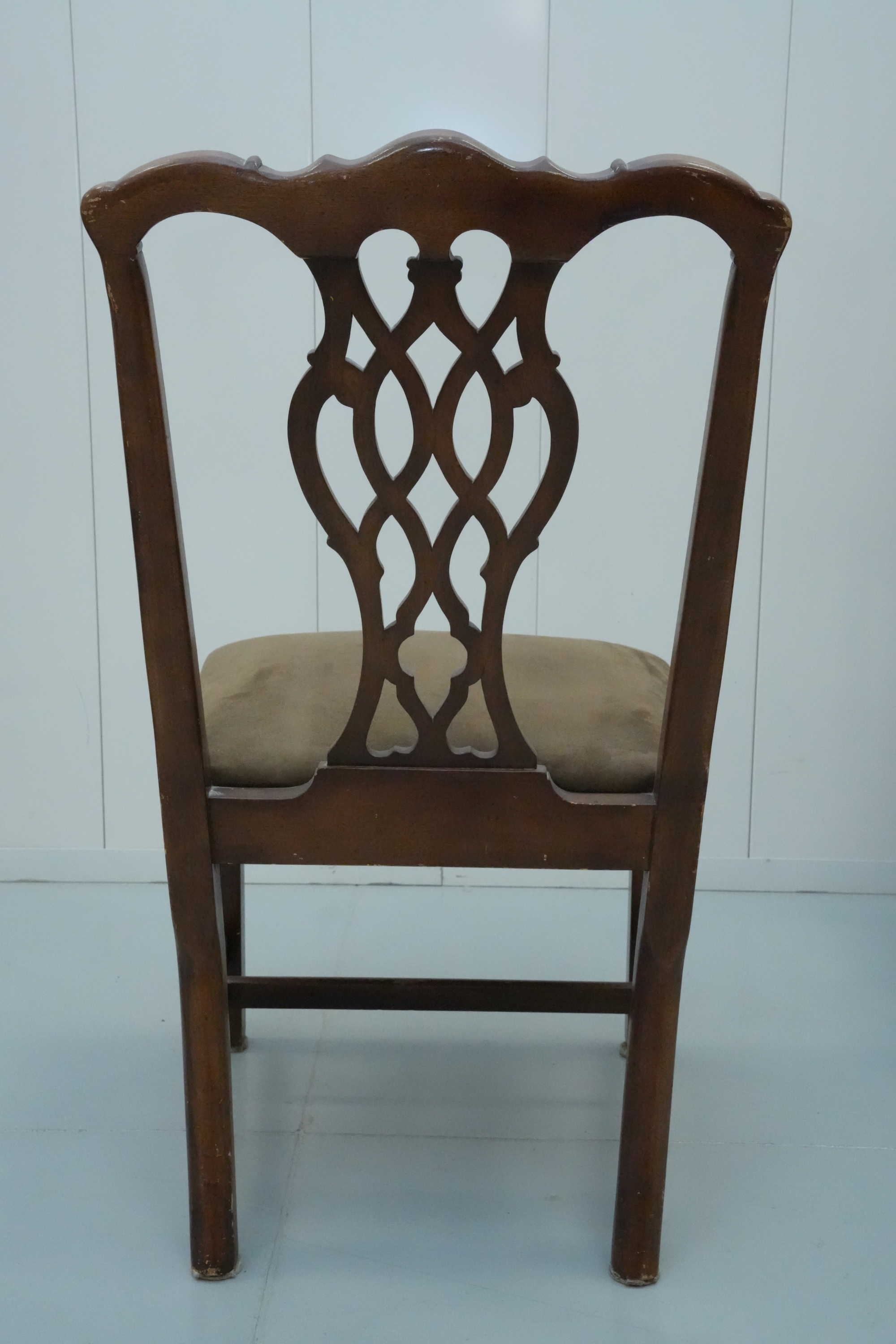 Set of eight Chippendale-style mahogany dining chairs with upholstered fabric seats, six side chairs and two armchairs. Some signs of wear due to age and use.