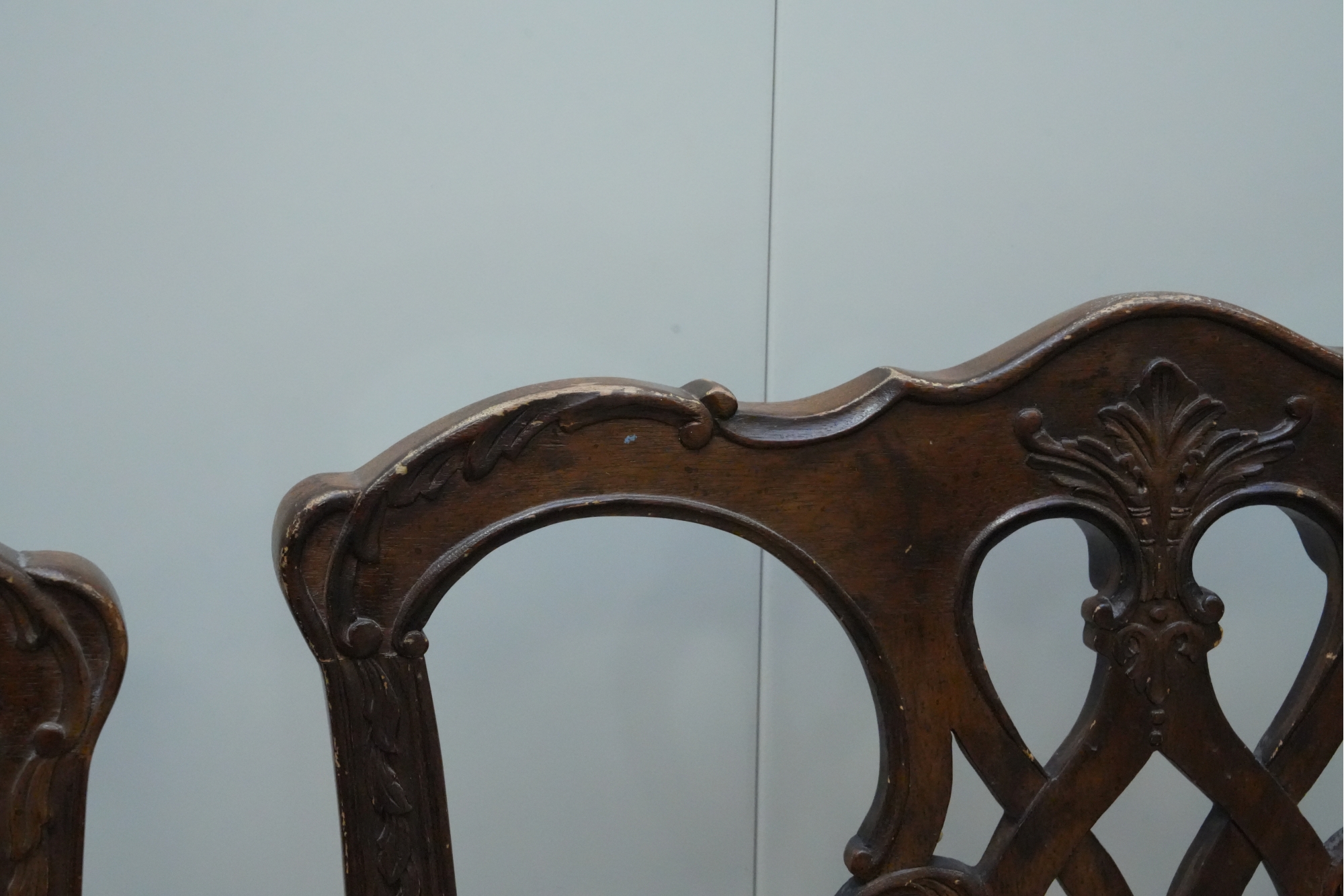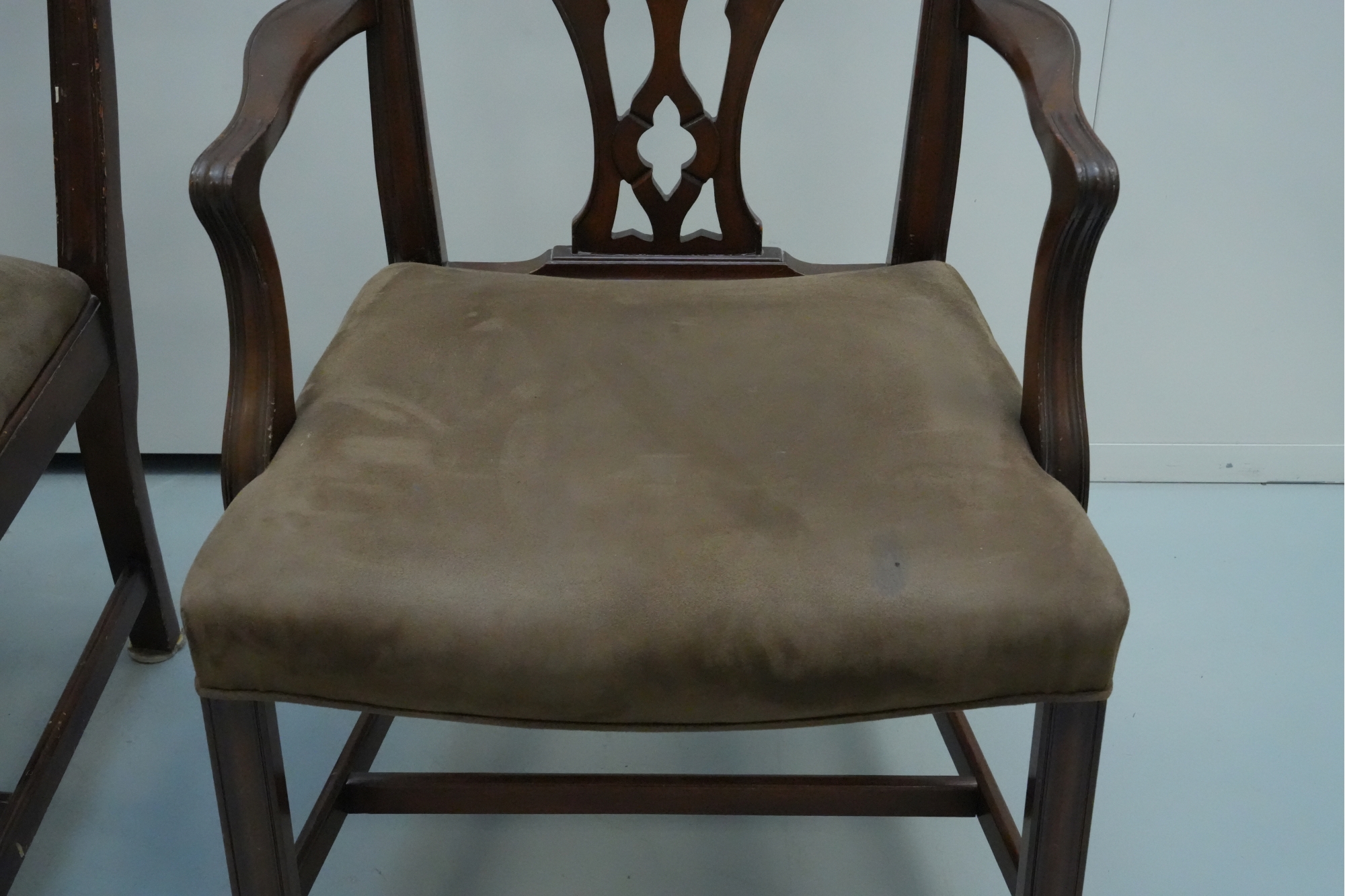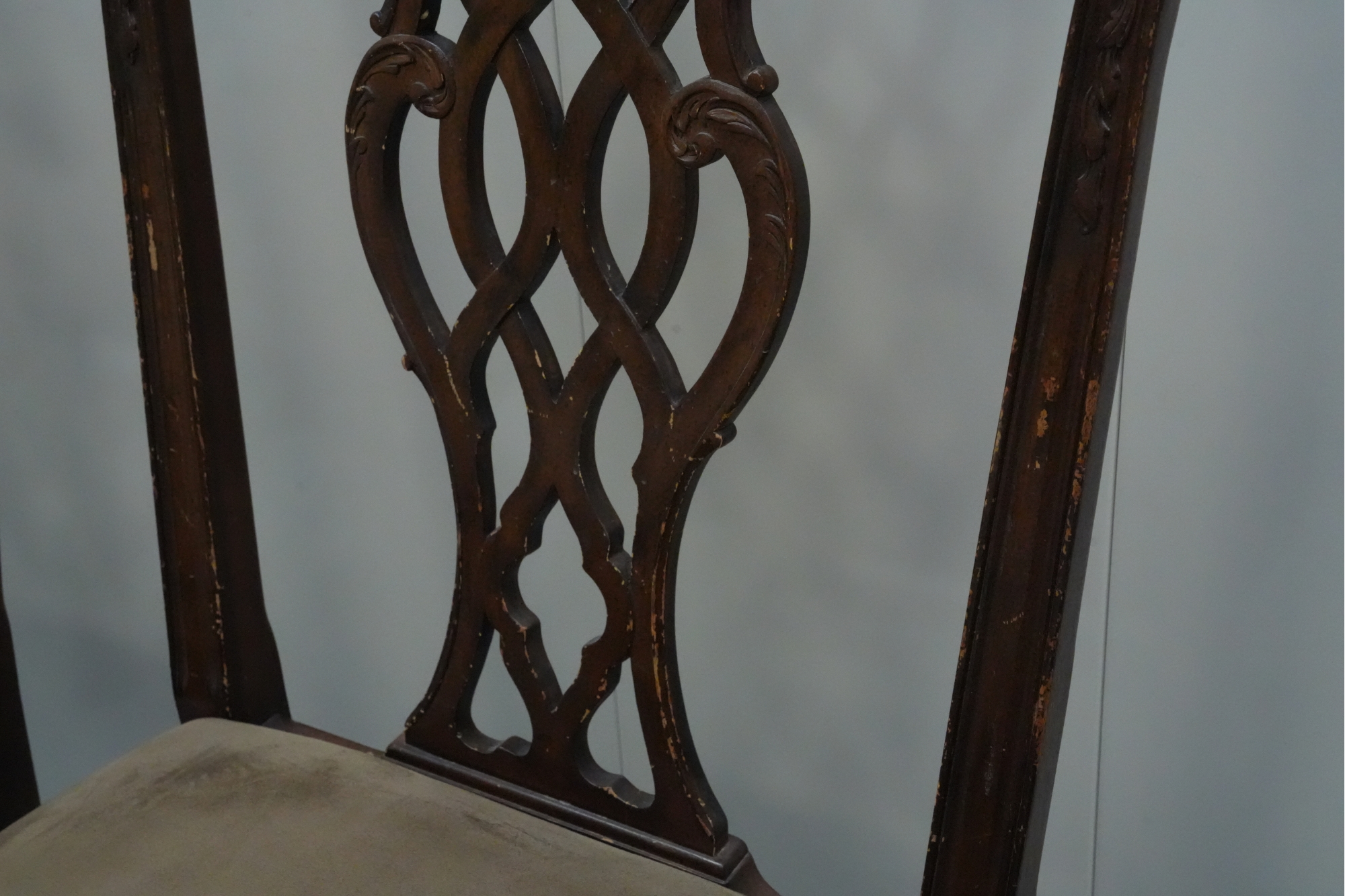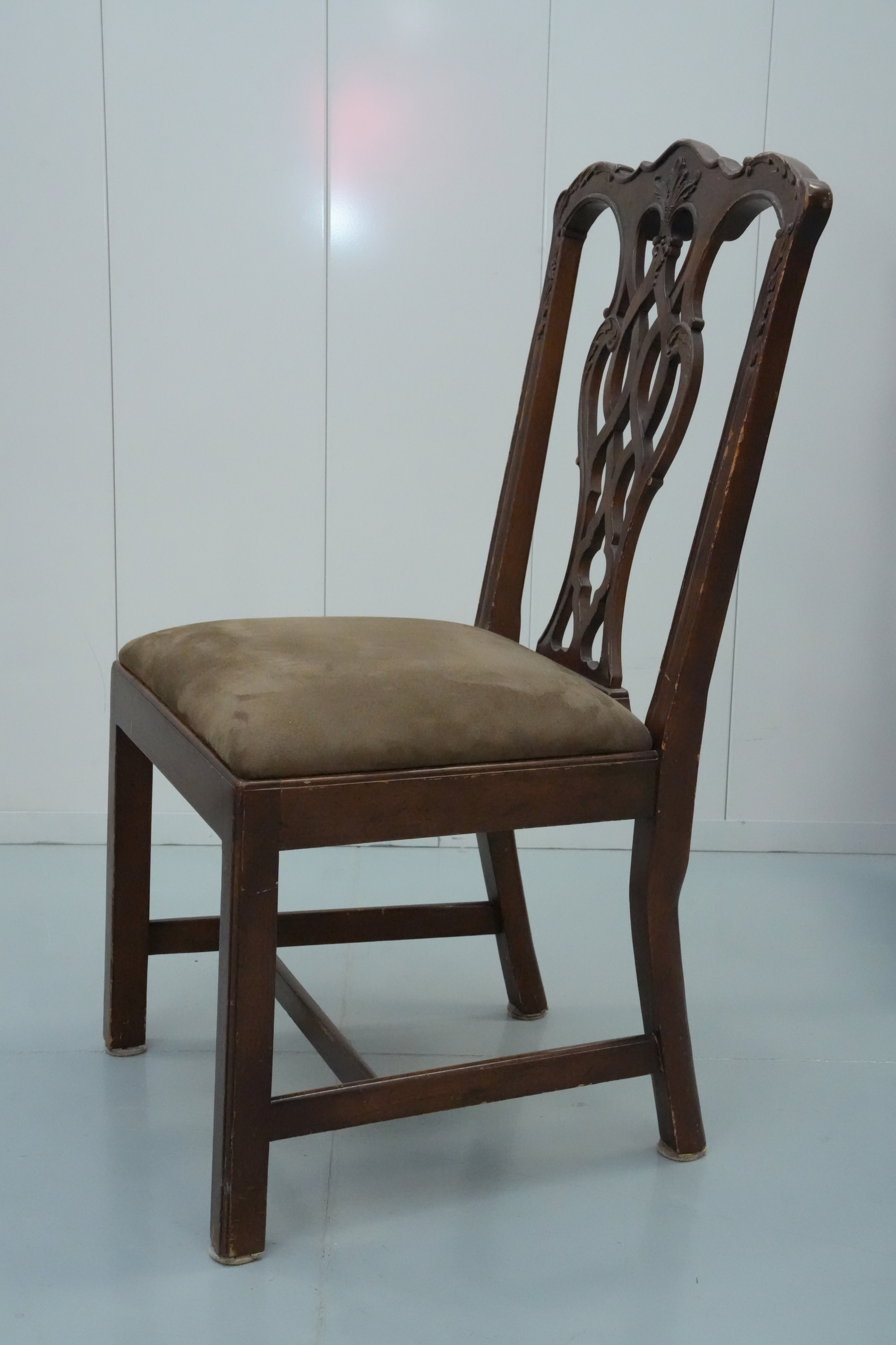 Set of eight Chippendale-style mahogany dining chairs with upholstered fabric seats, six side chairs and two armchairs. Some signs of wear due to age and use.