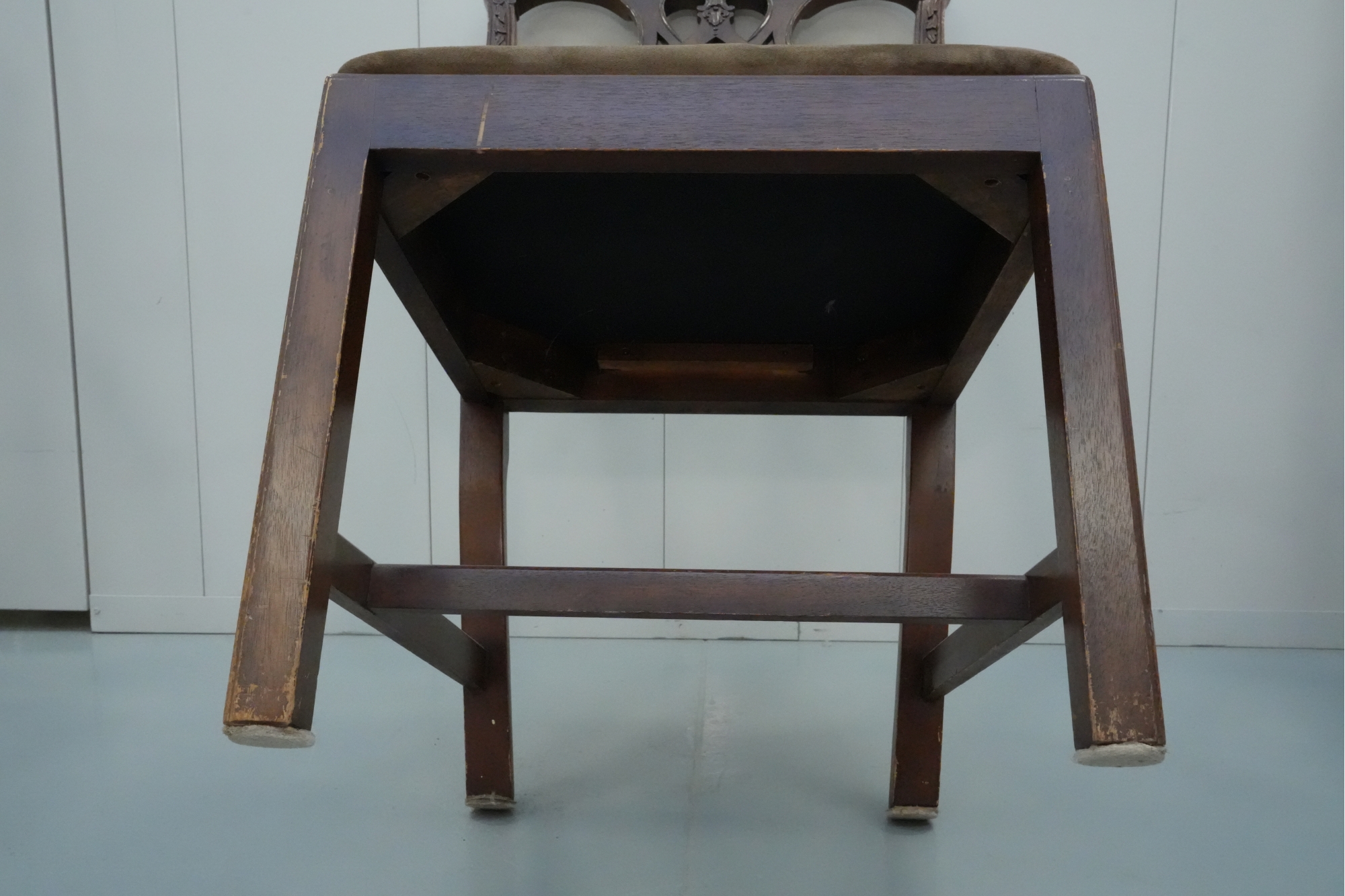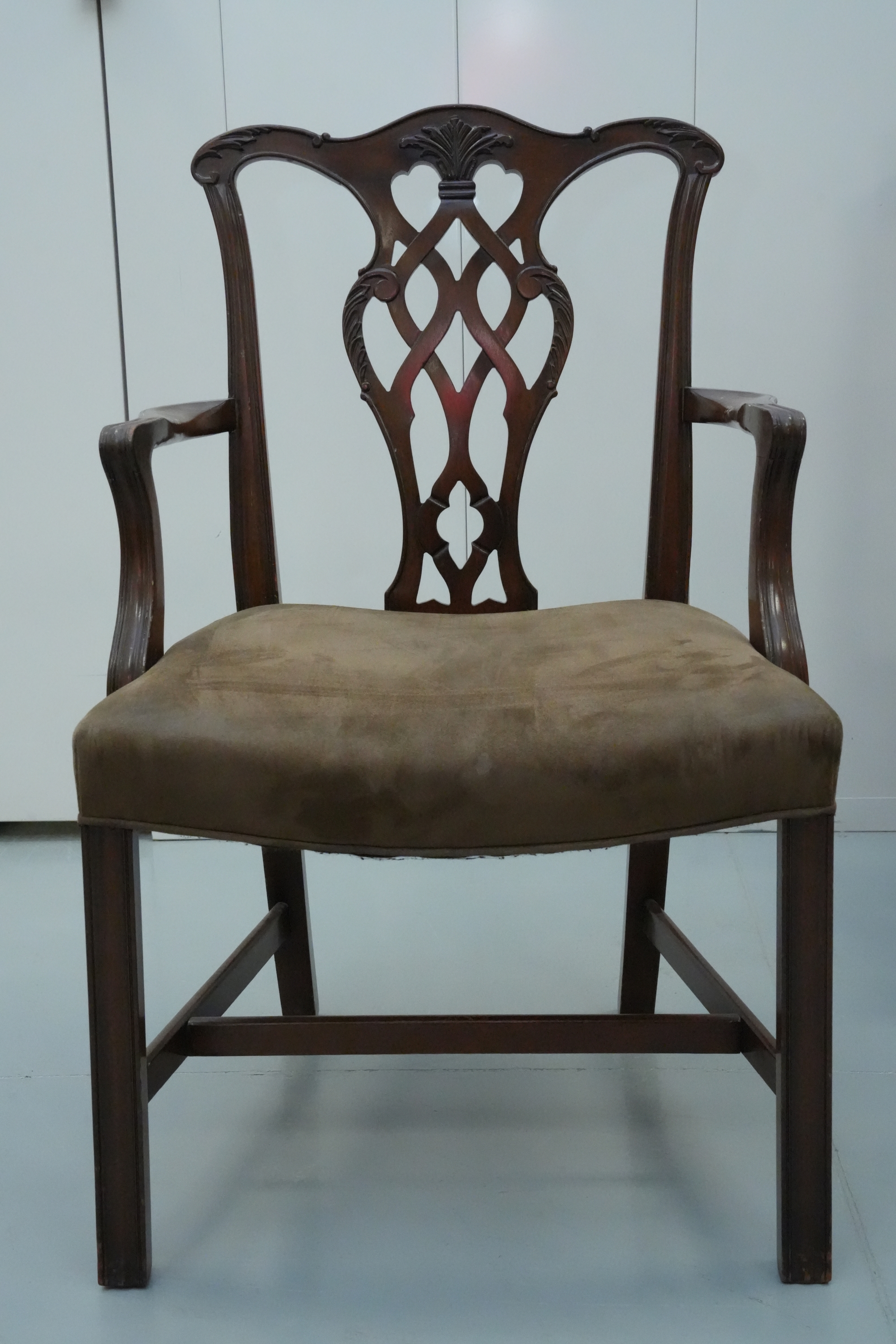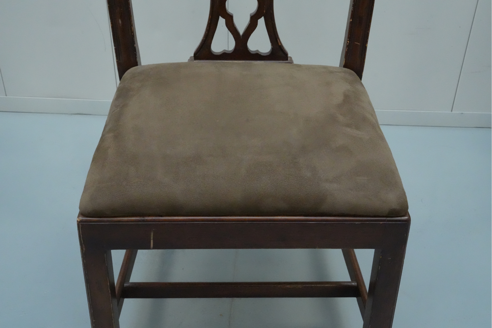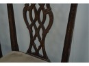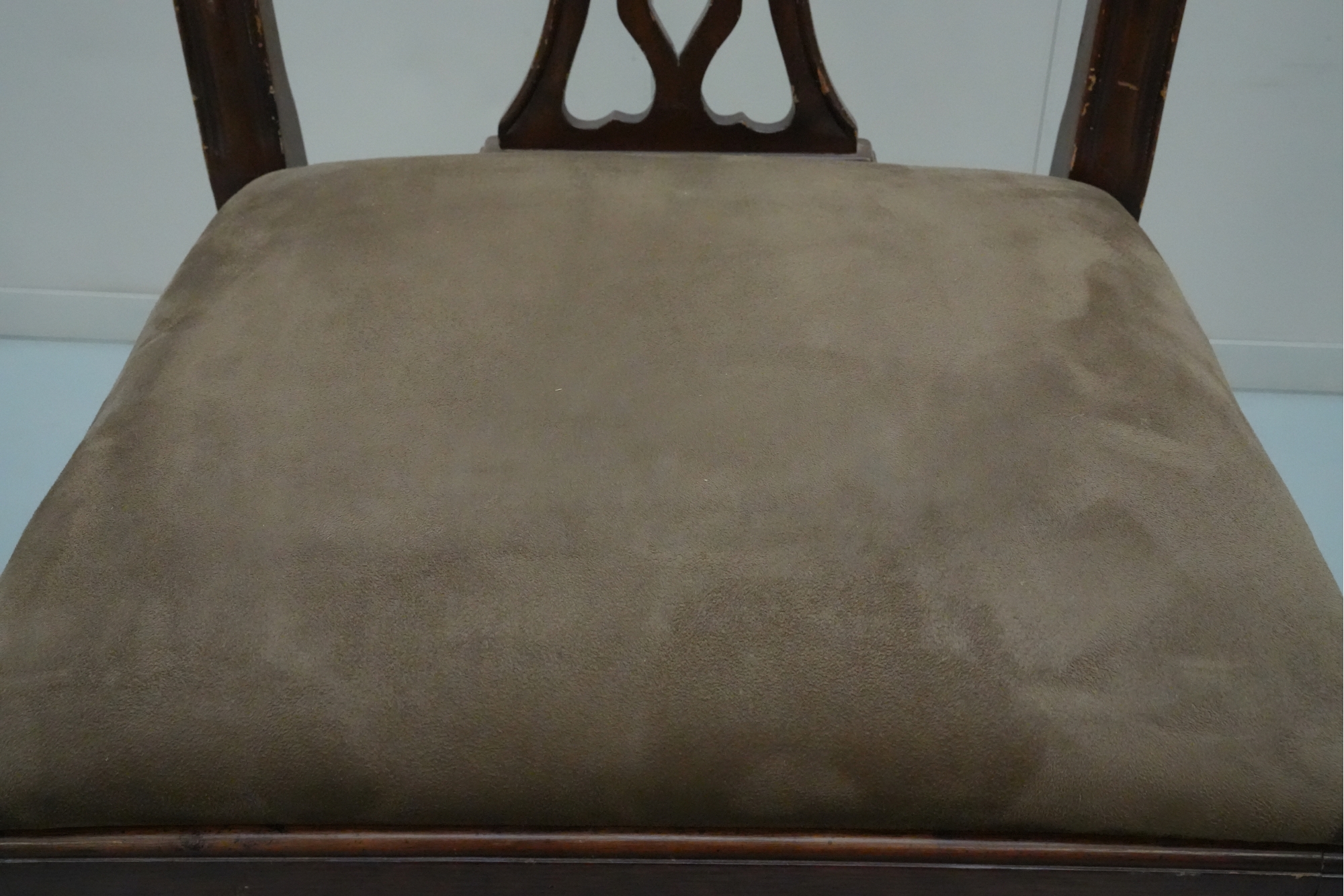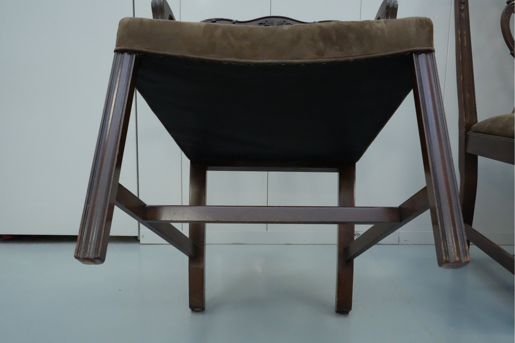 Set of eight Chippendale-style mahogany dining chairs with upholstered fabric seats, six side chairs and two armchairs. Some signs of wear due to age and use.