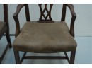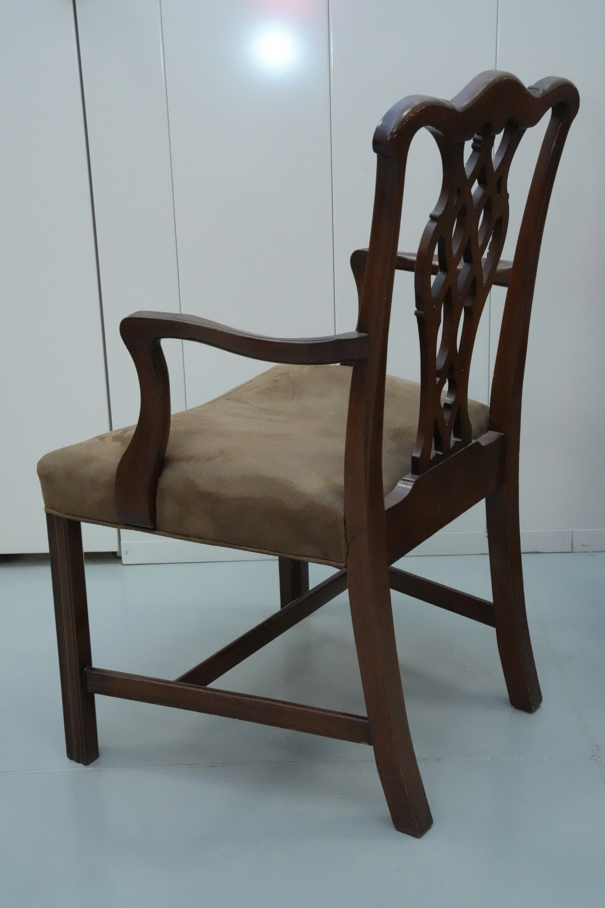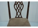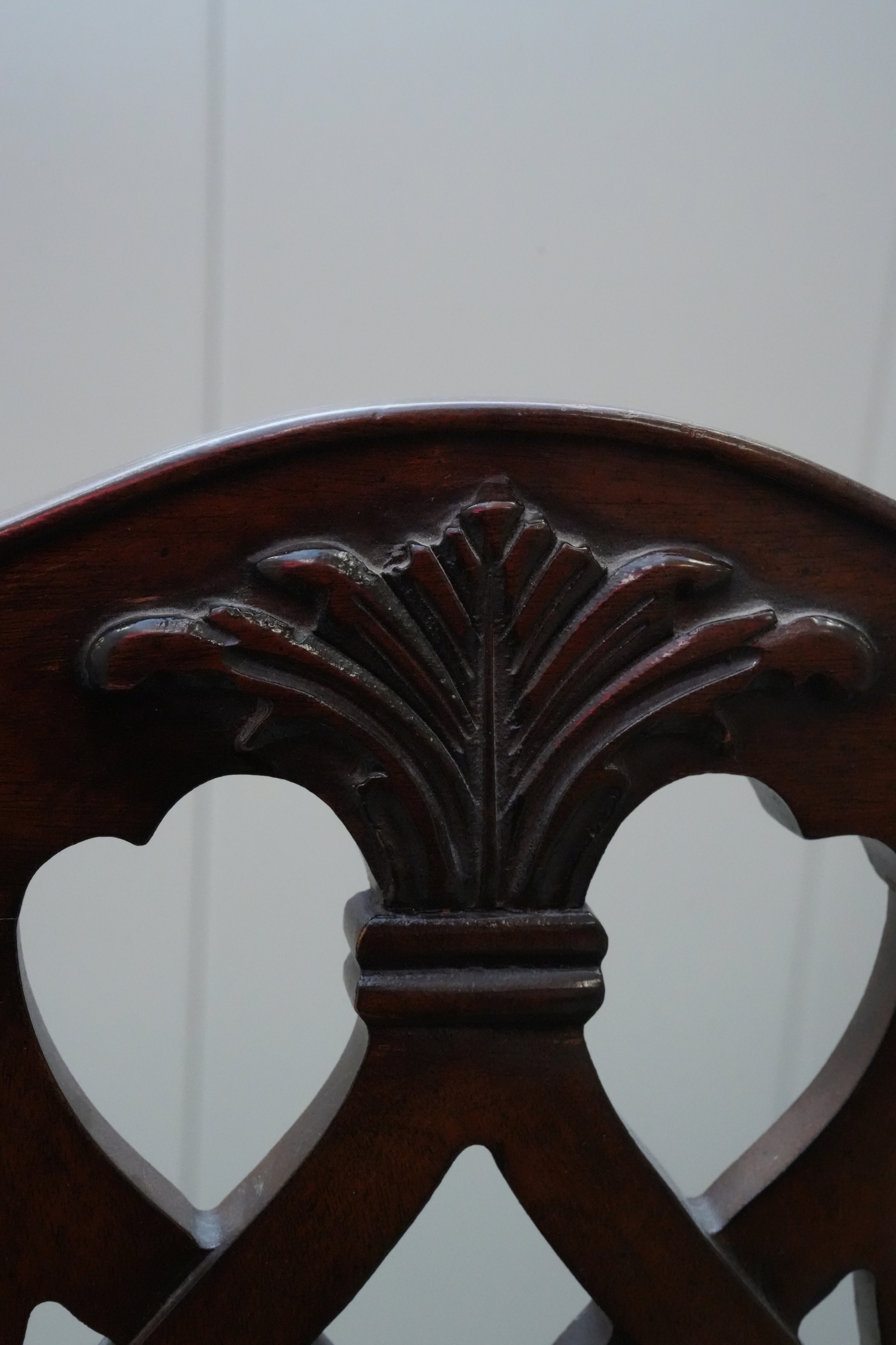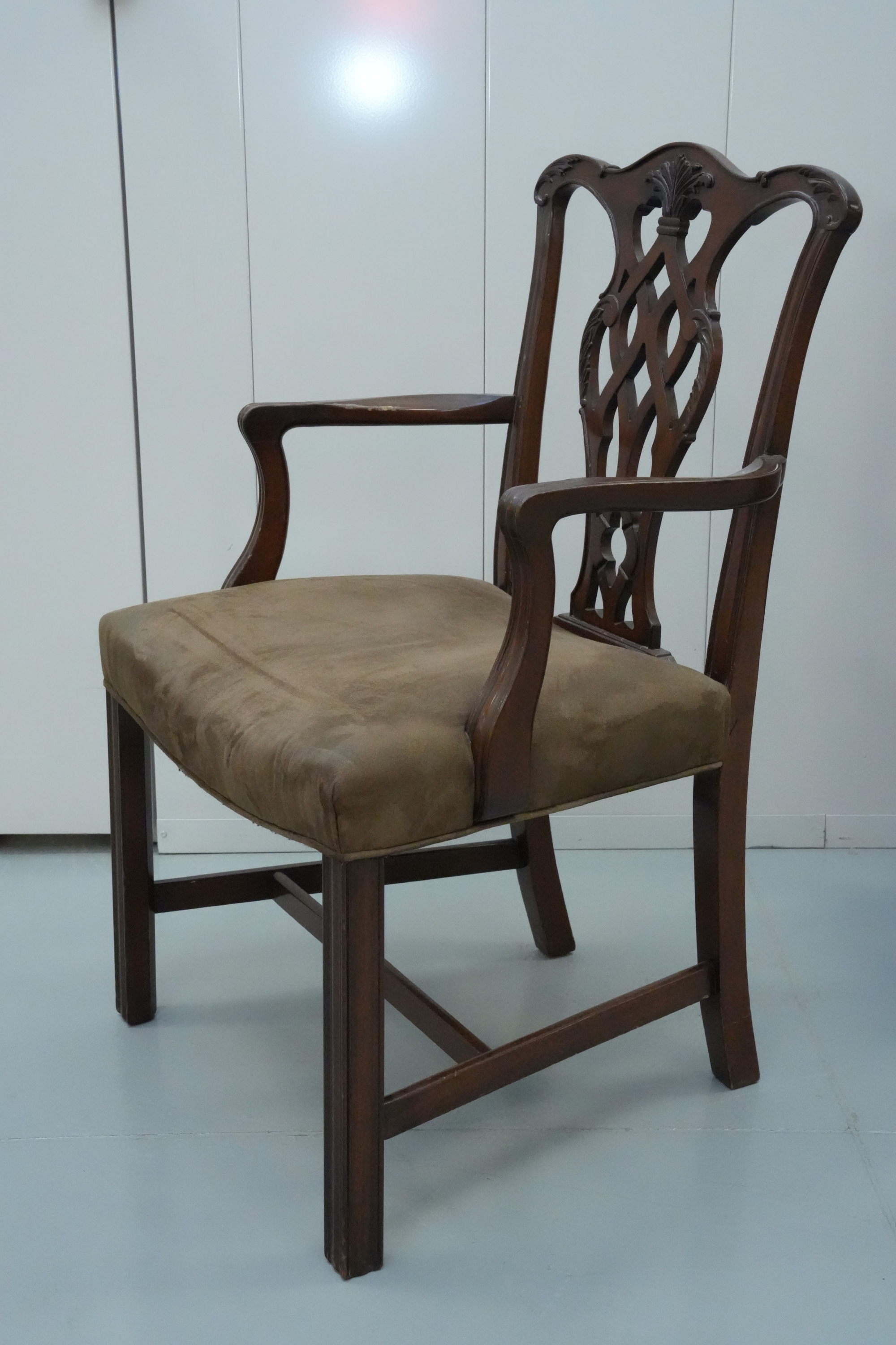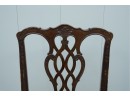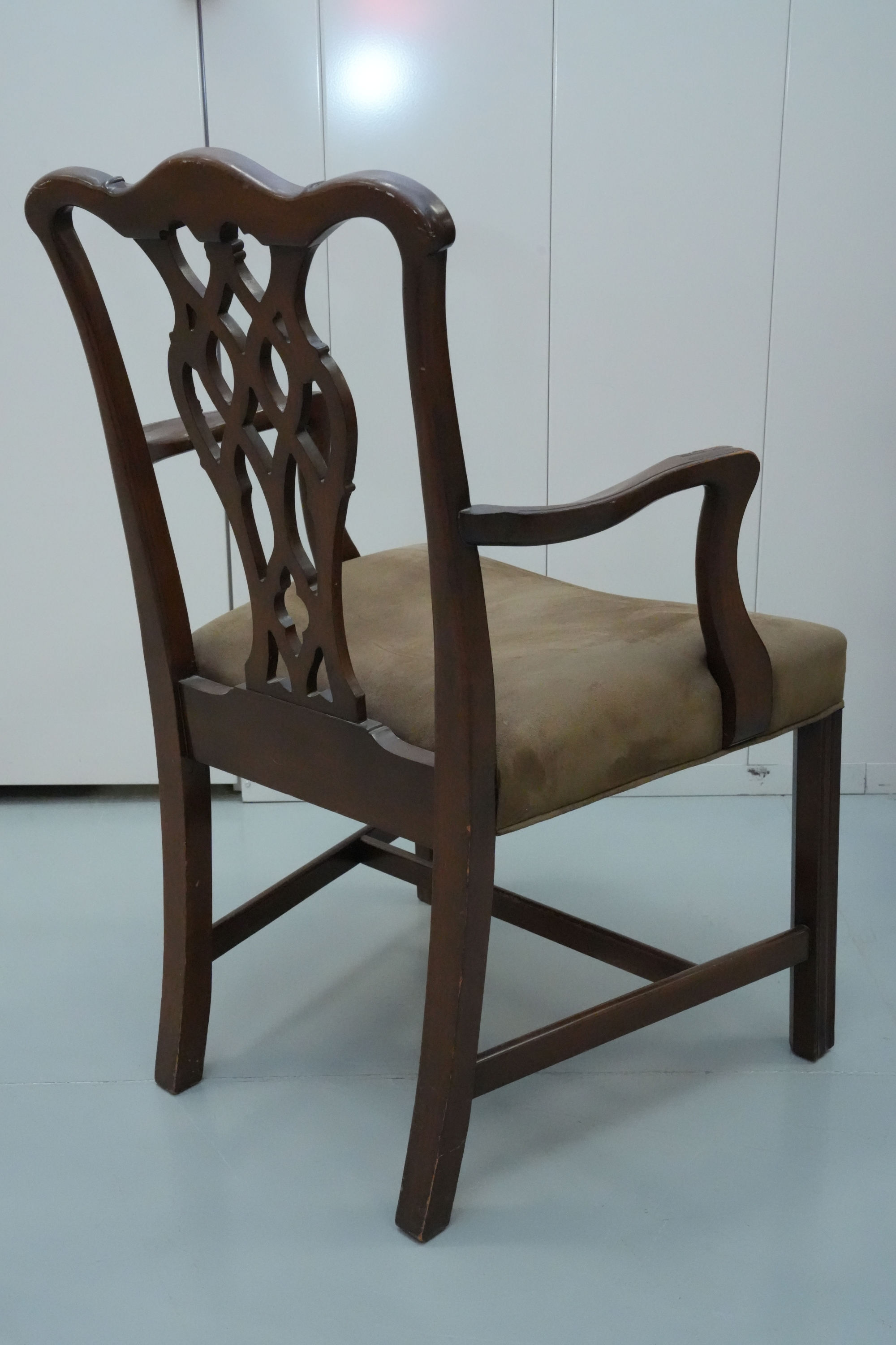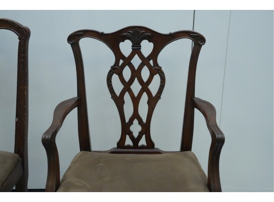 Set of eight Chippendale-style mahogany dining chairs with upholstered fabric seats, six side chairs and two armchairs. Some signs of wear due to age and use.