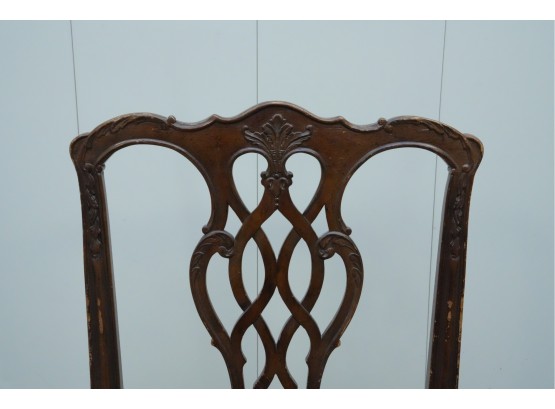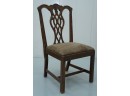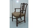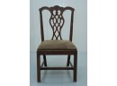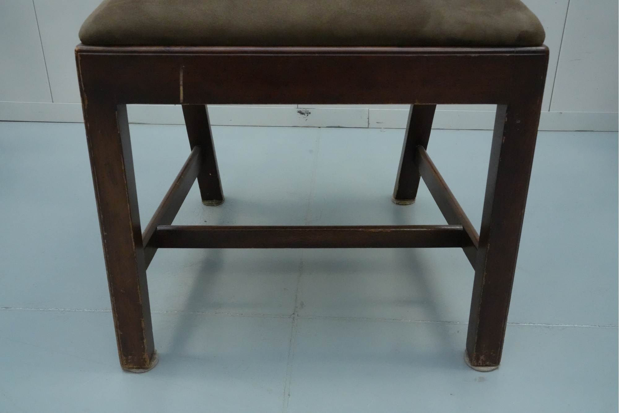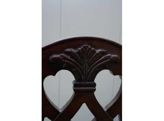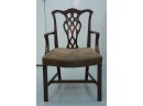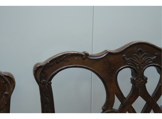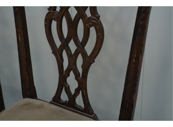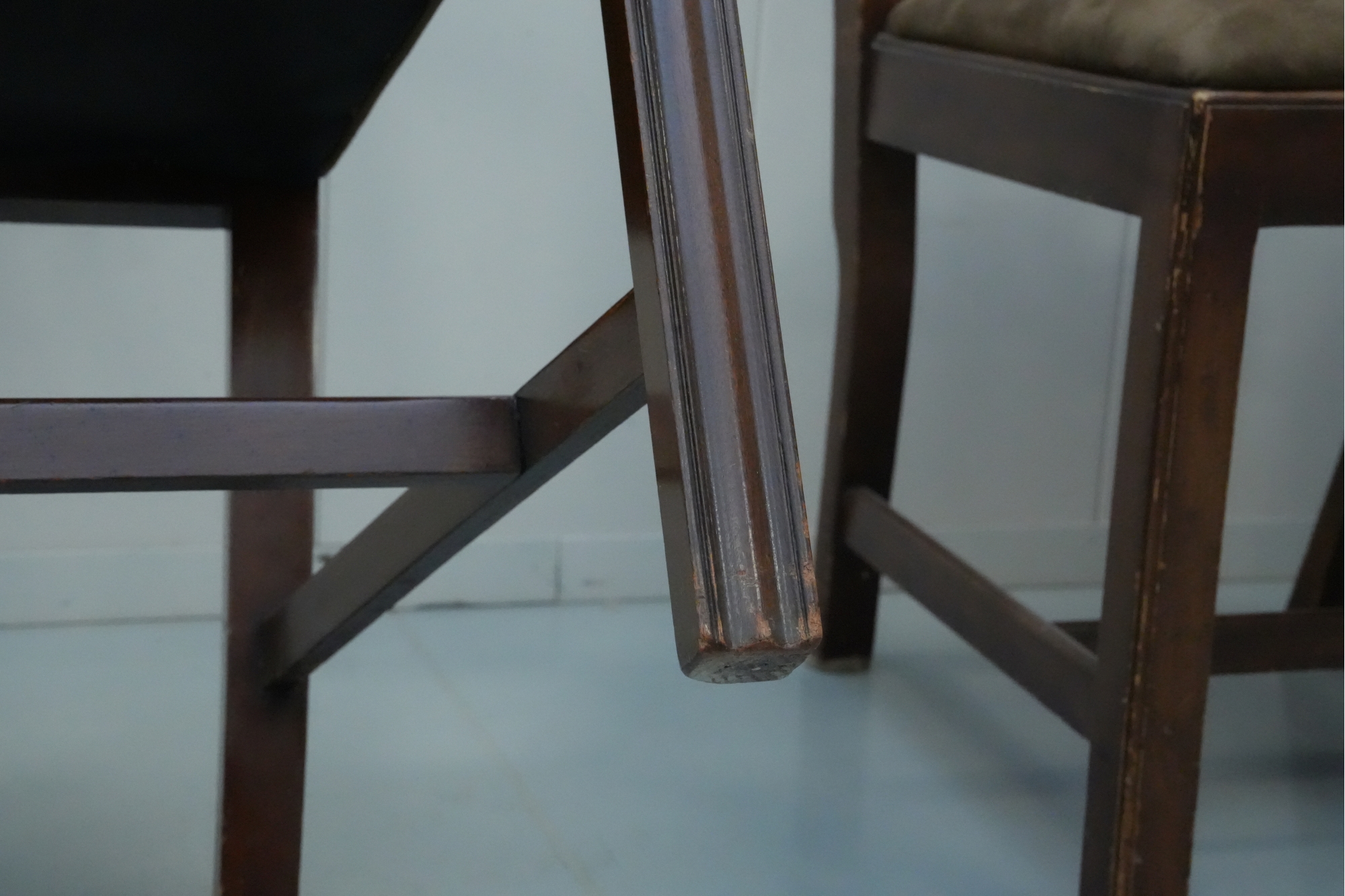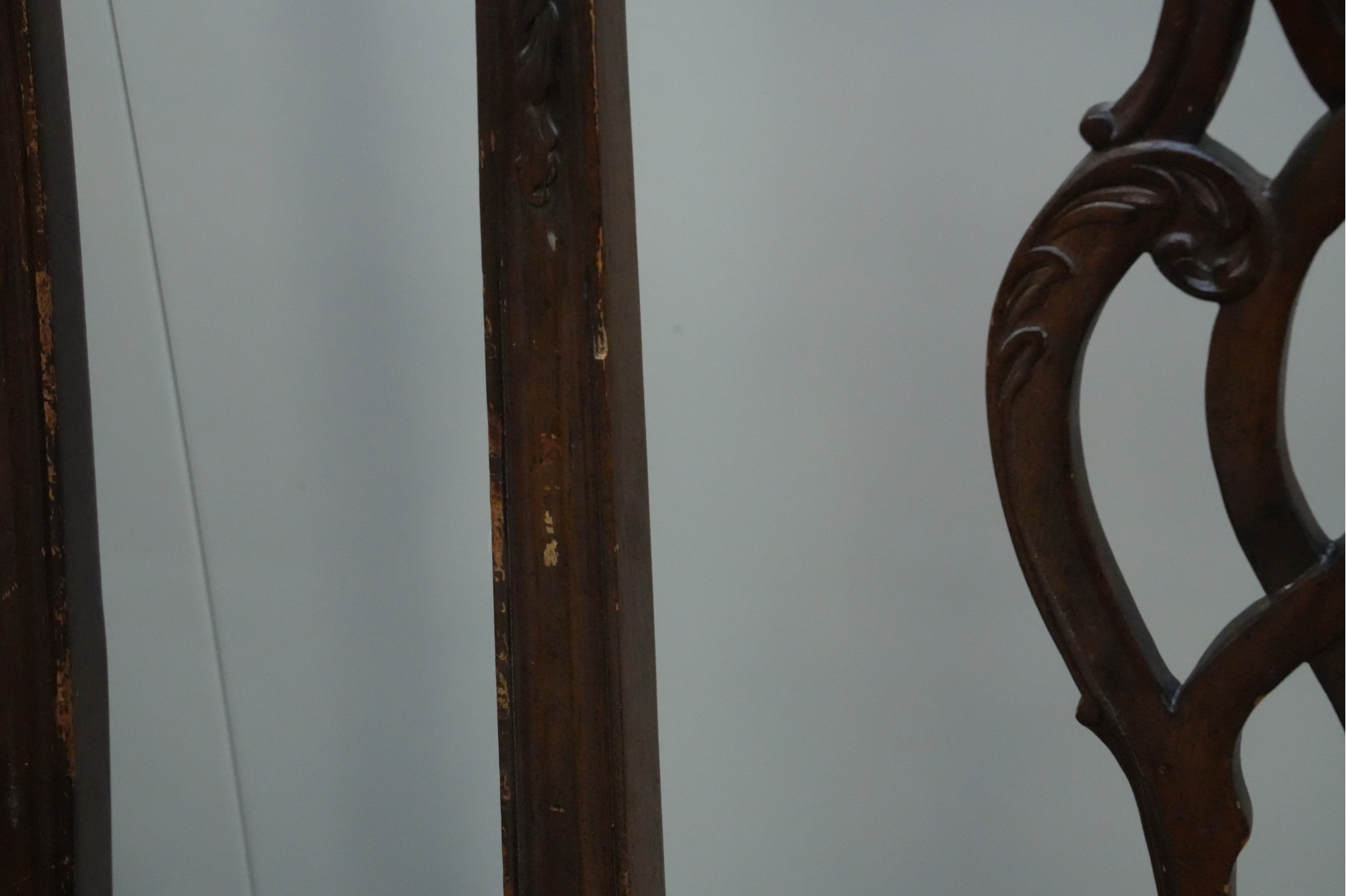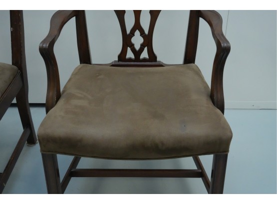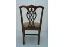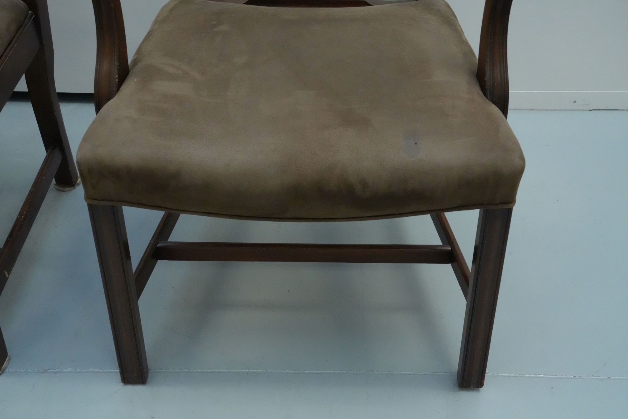Set of eight Chippendale-style mahogany dining chairs with upholstered fabric seats, six side chairs and two armchairs. Some signs of wear due to age and use.