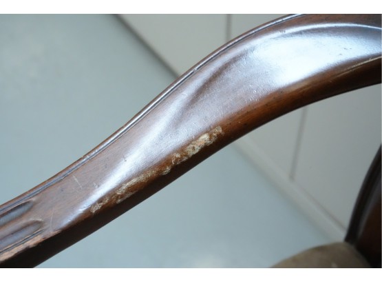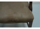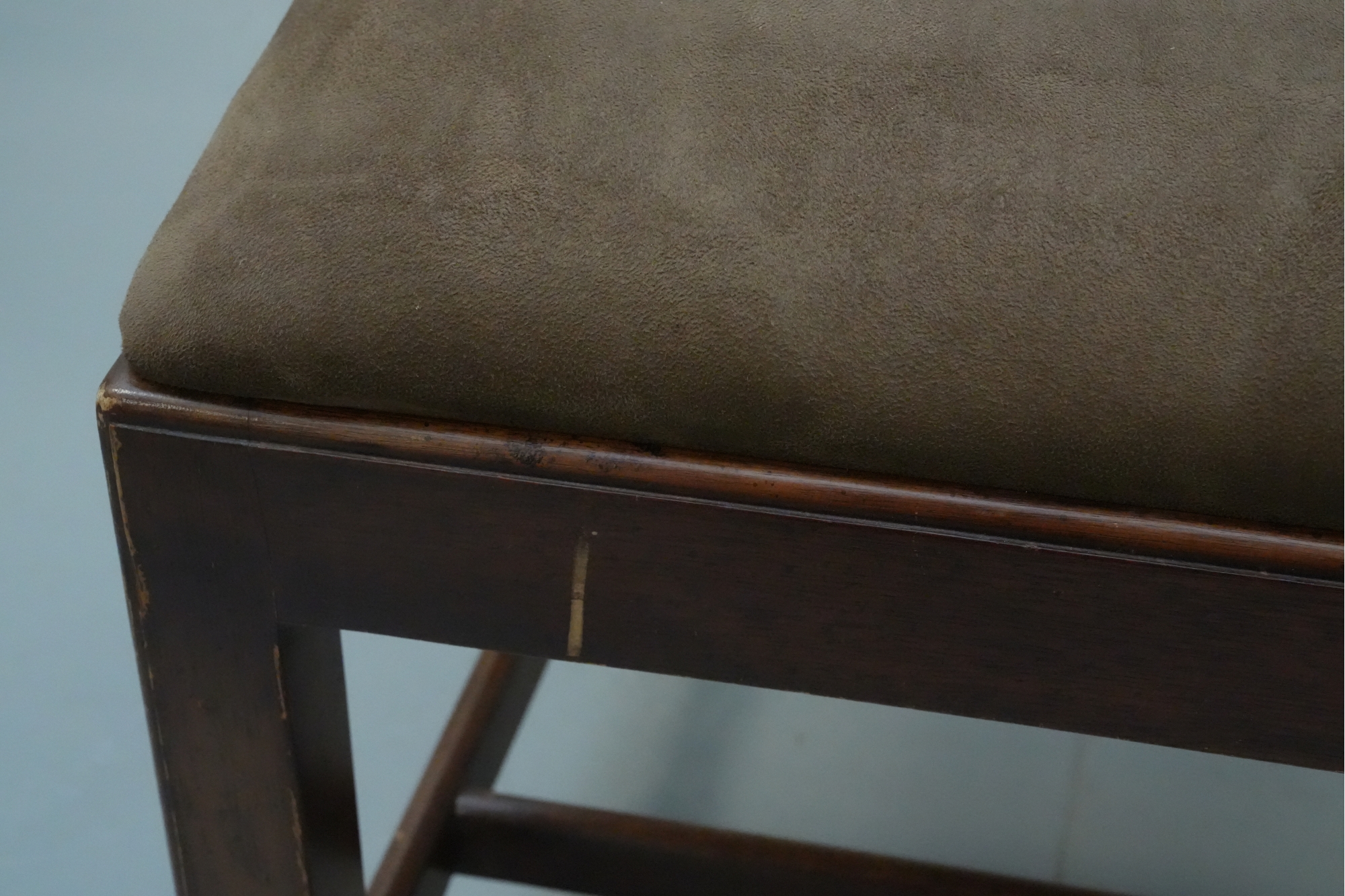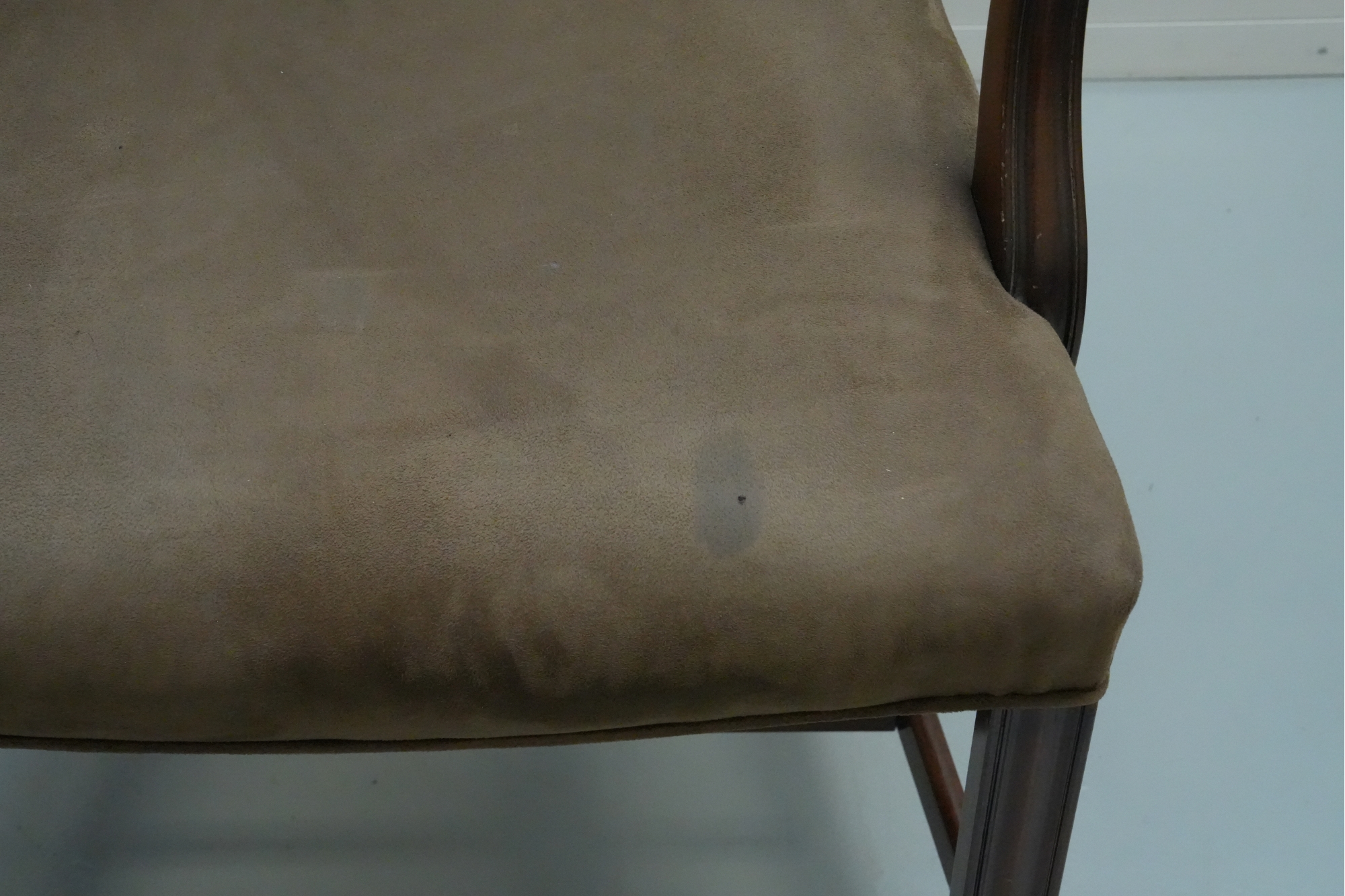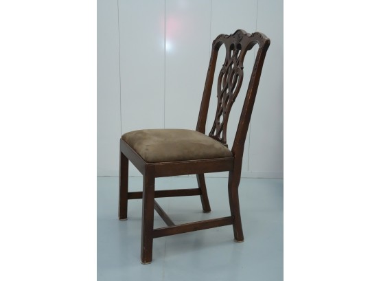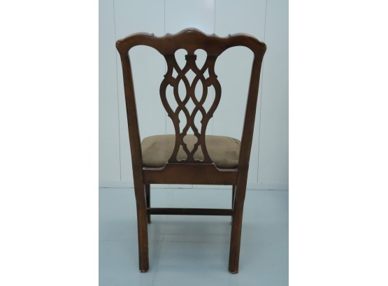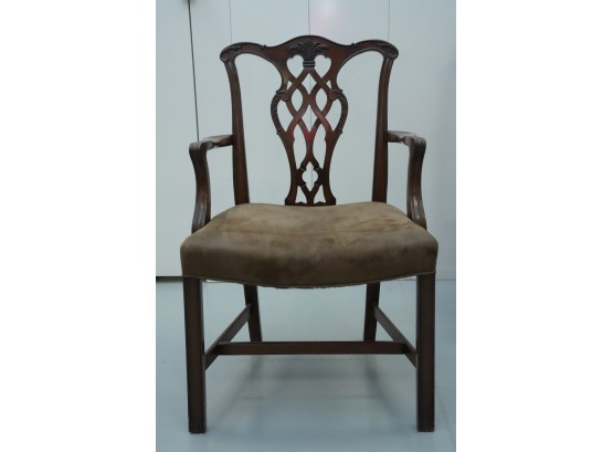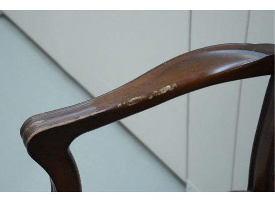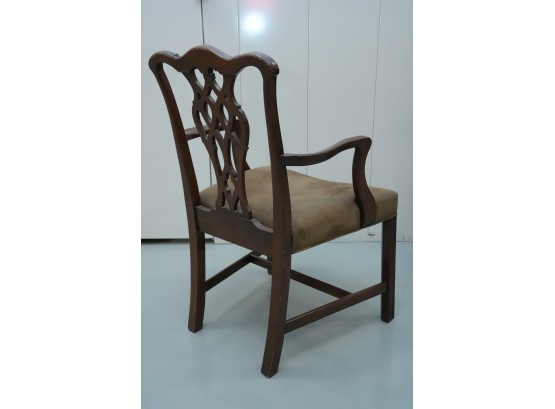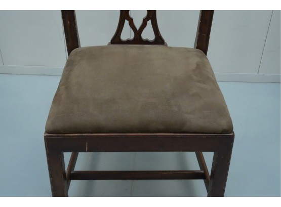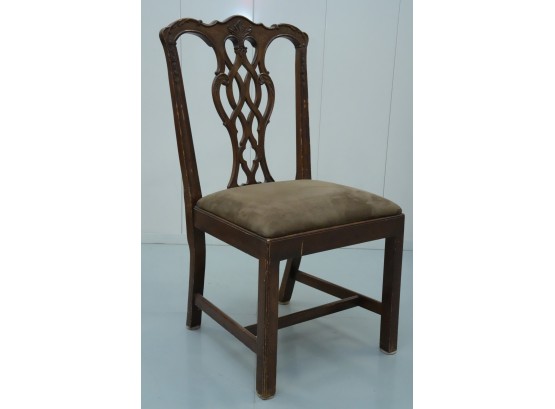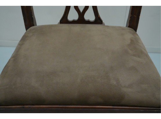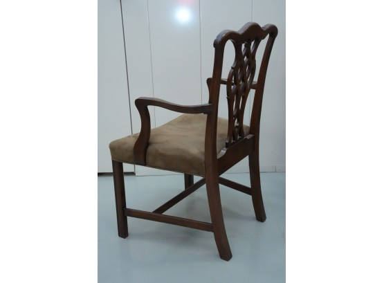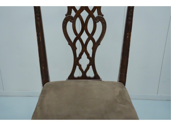 Set of eight Chippendale-style mahogany dining chairs with upholstered fabric seats, six side chairs and two armchairs. Some signs of wear due to age and use.