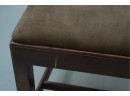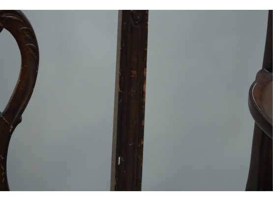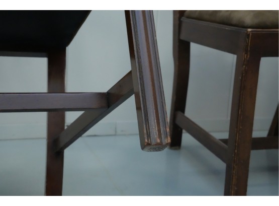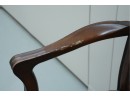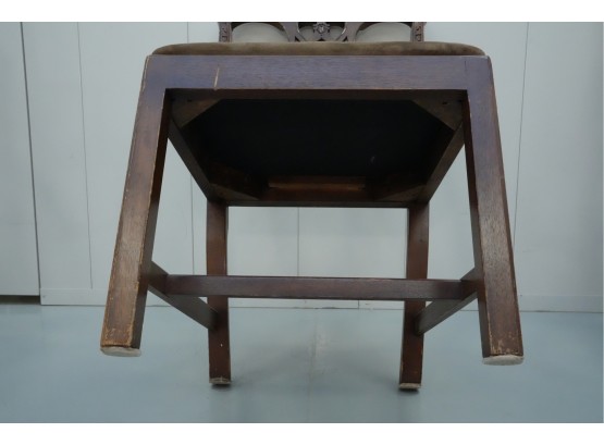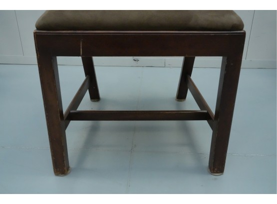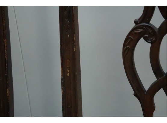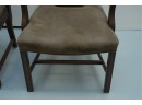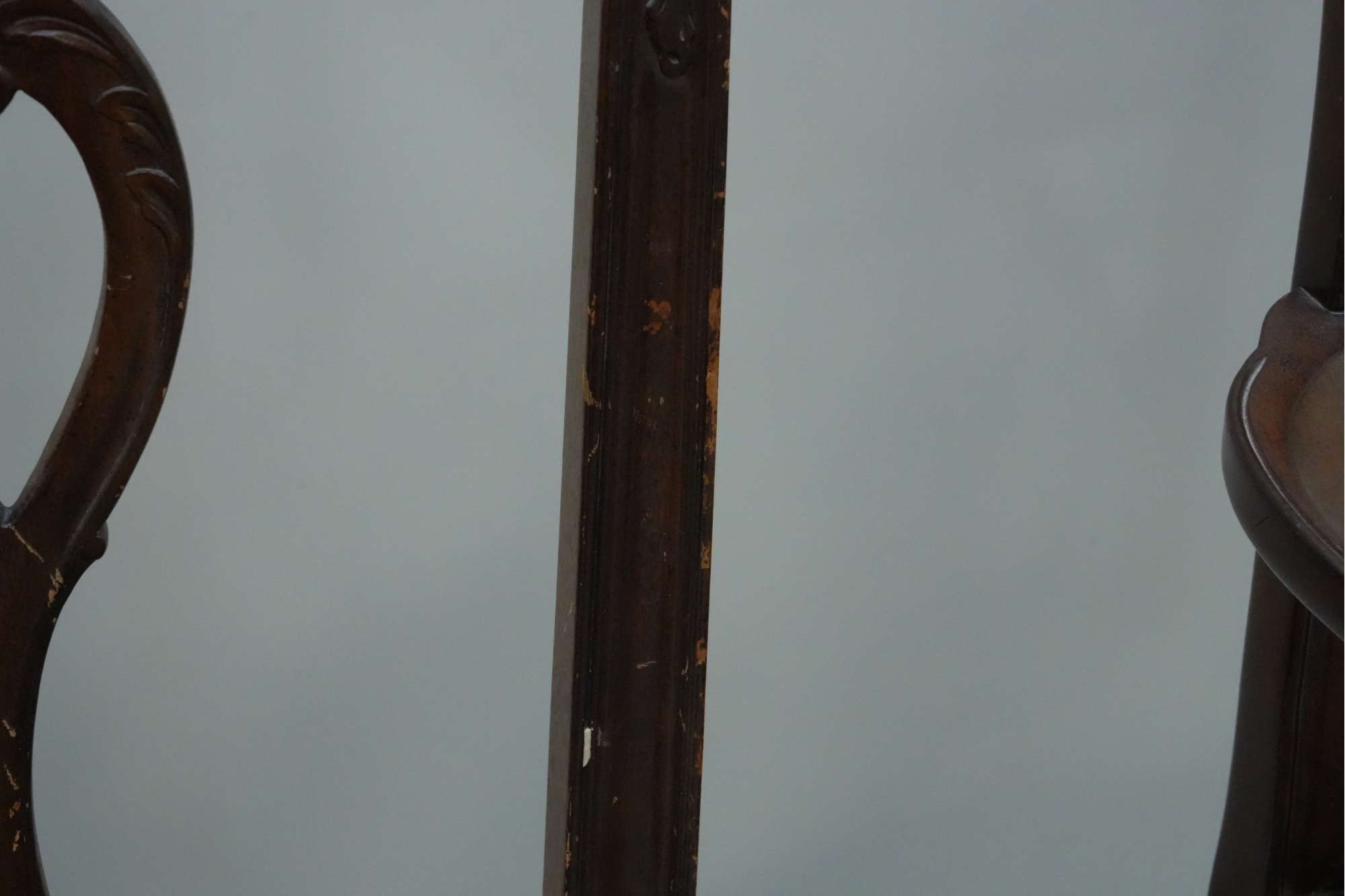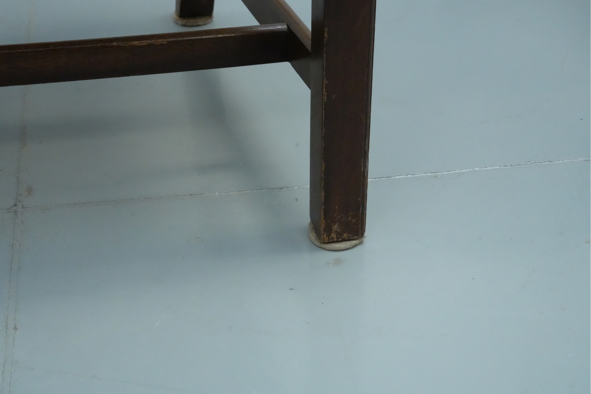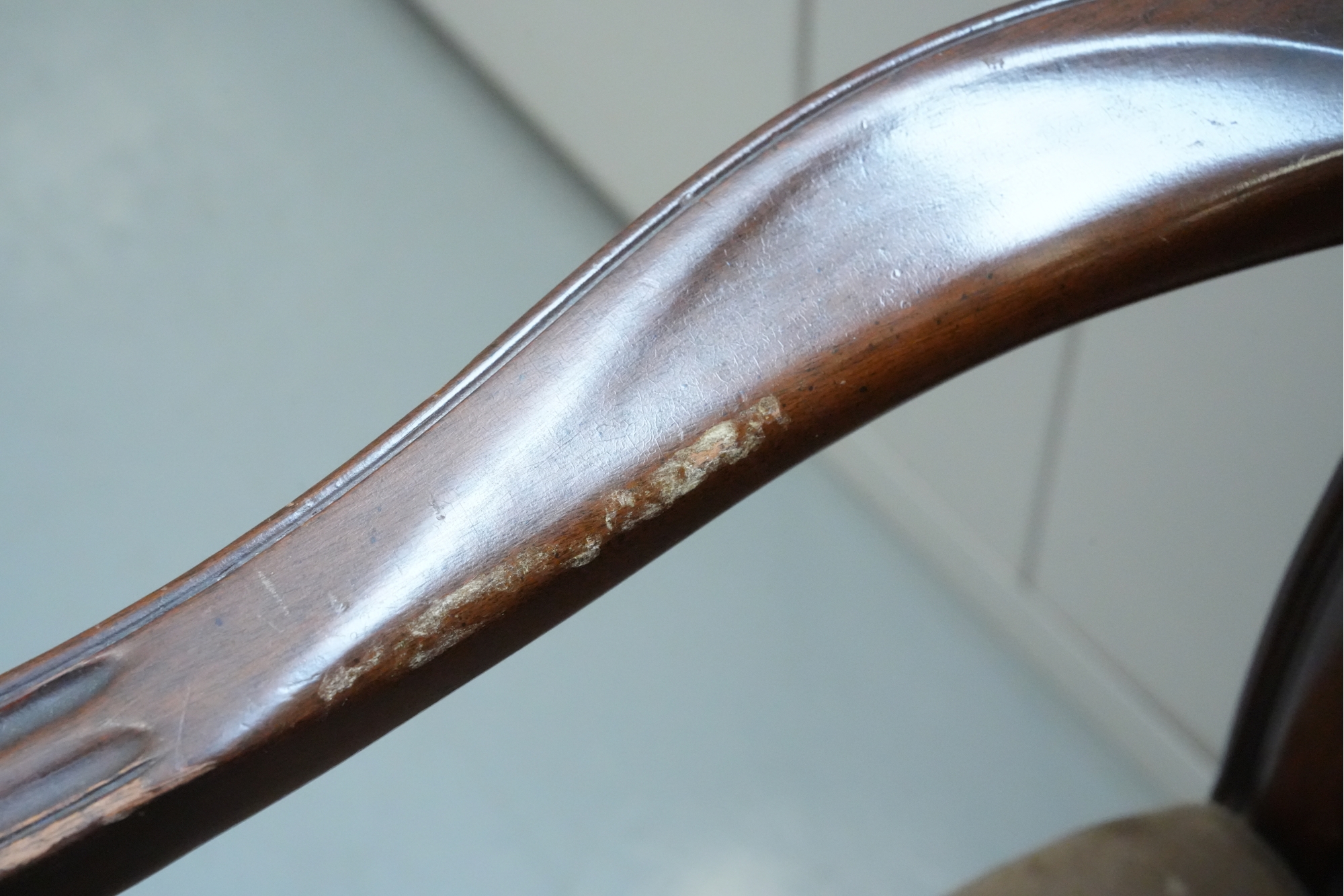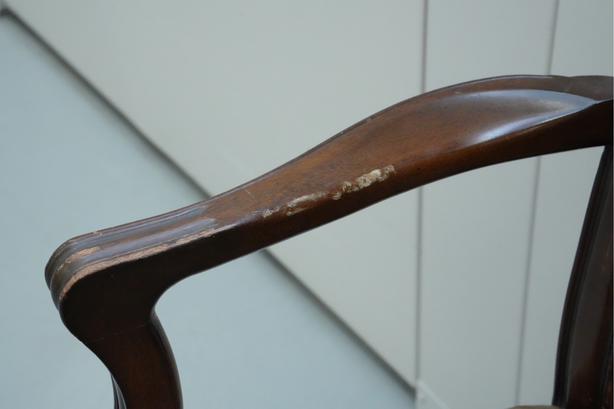 Set of eight Chippendale-style mahogany dining chairs with upholstered fabric seats, six side chairs and two armchairs. Some signs of wear due to age and use.