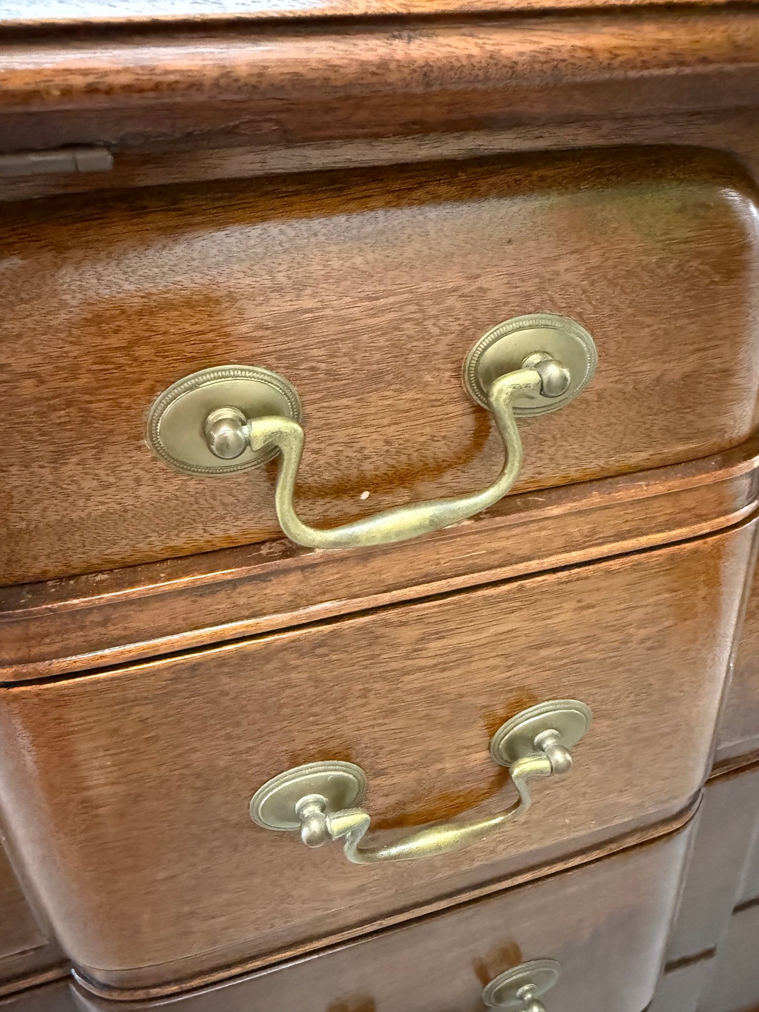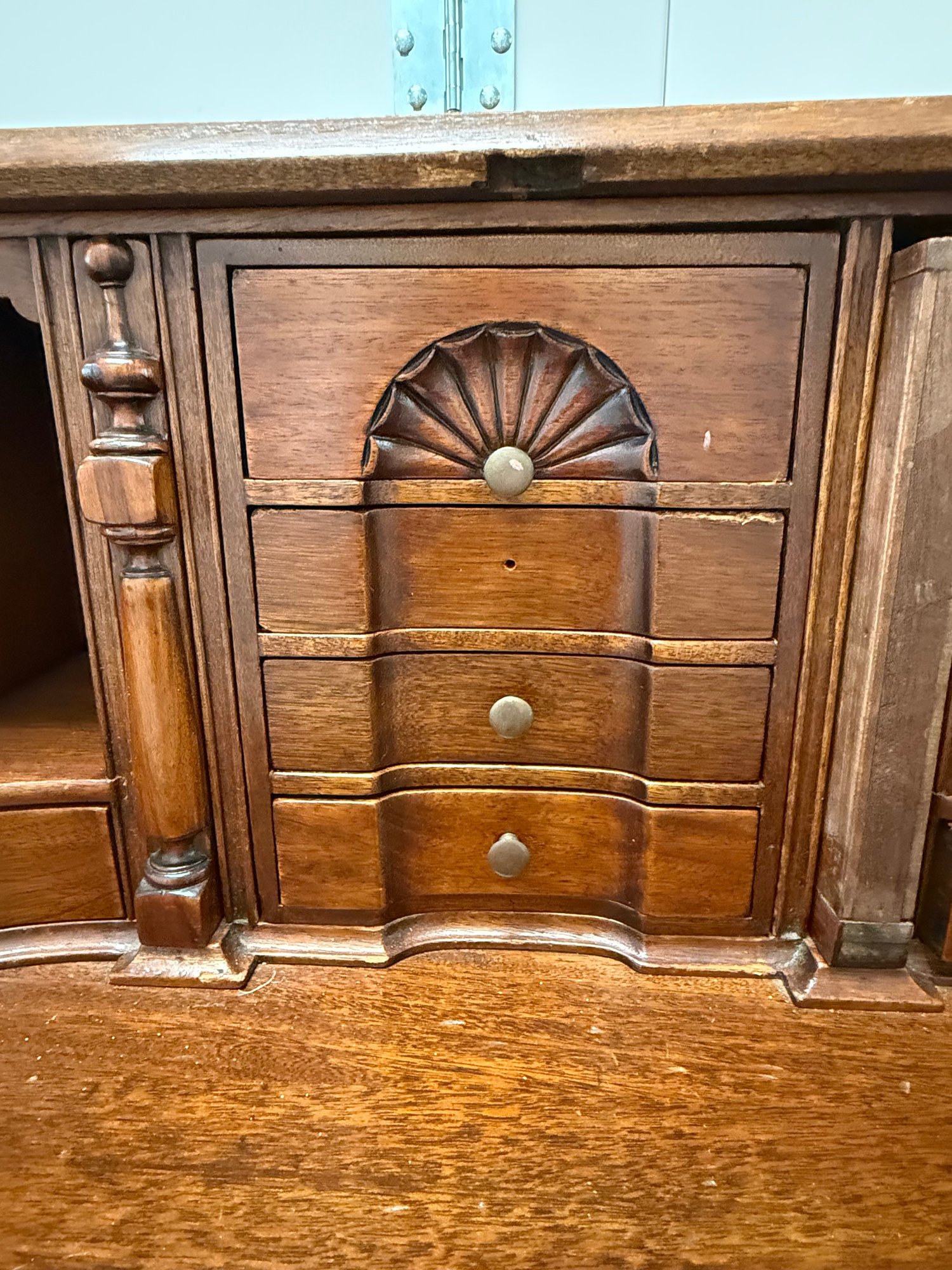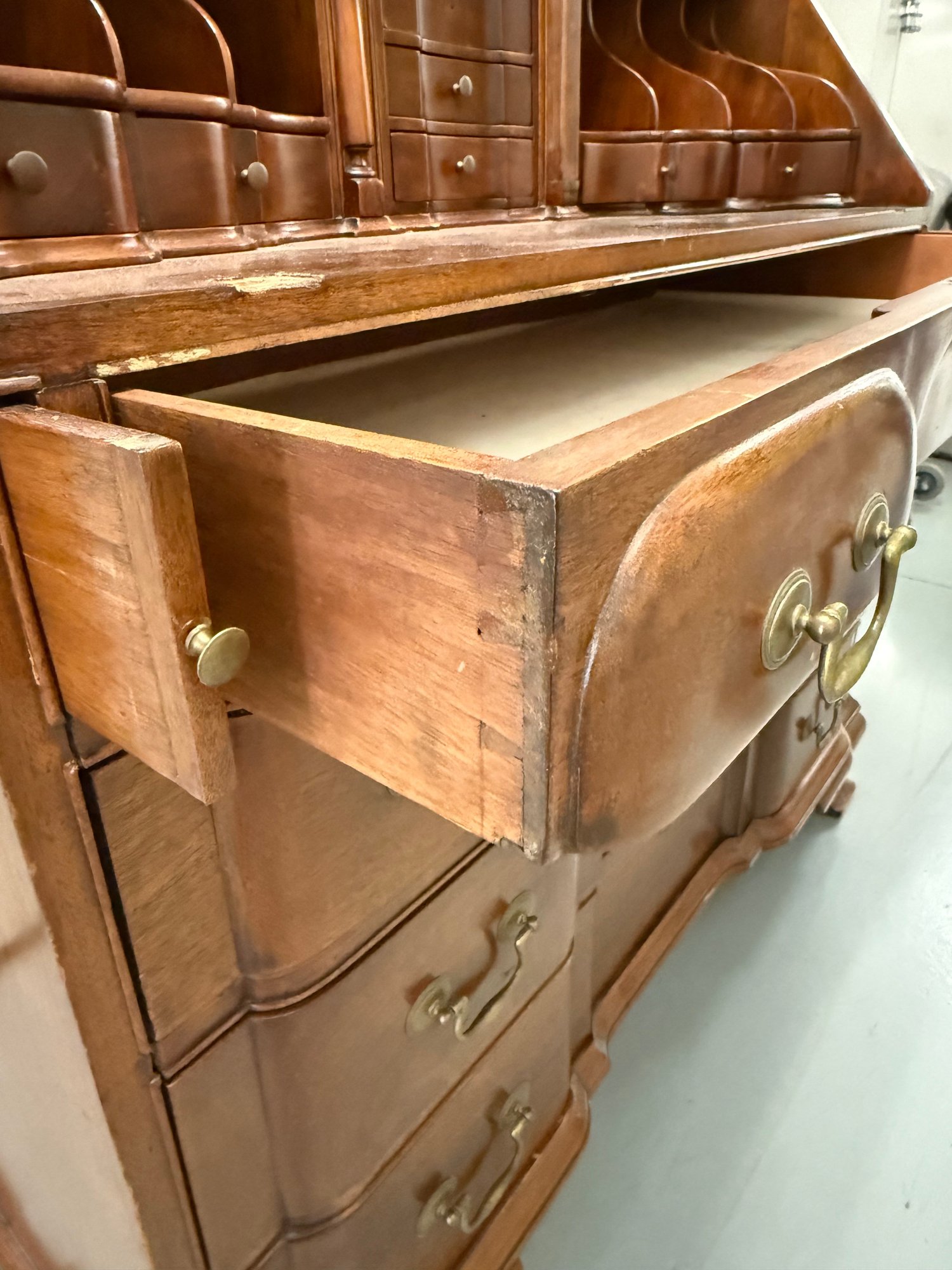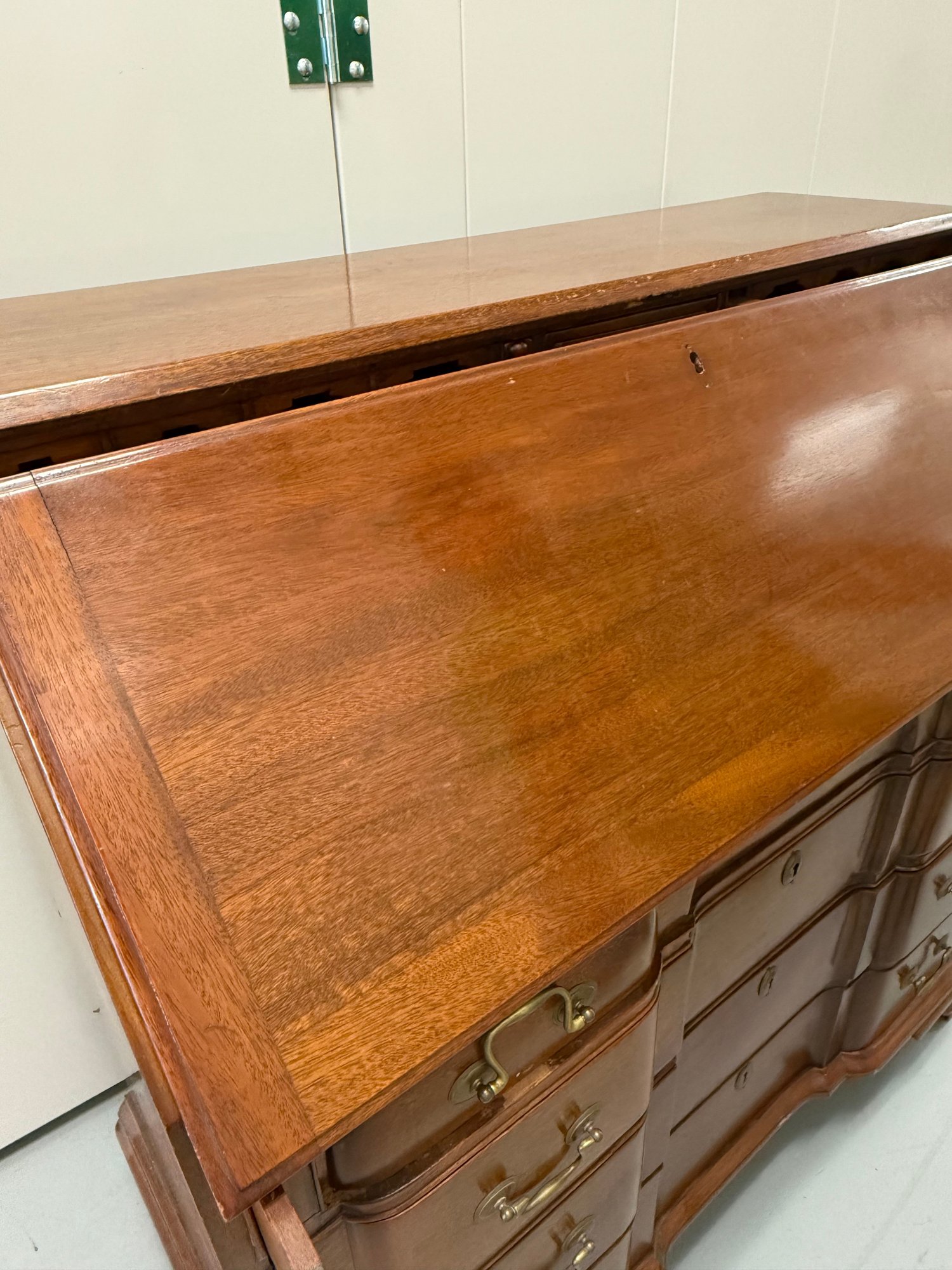 Please note drop front door is disconnected from the unit and needs repair. Chippendale-style mahogany drop-front secretary desk with an interior of cubbyholes, small drawers, and a central door, above four full-width dovetailed drawers with solid brass hardware.