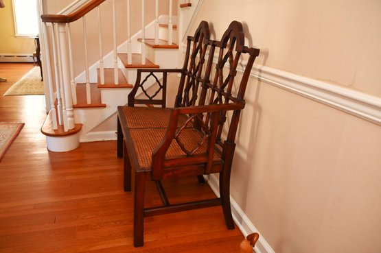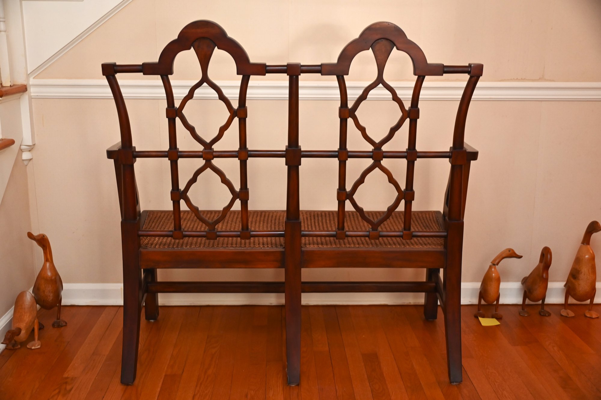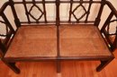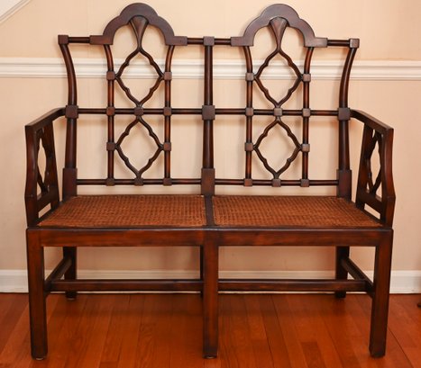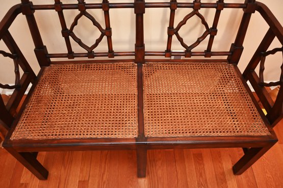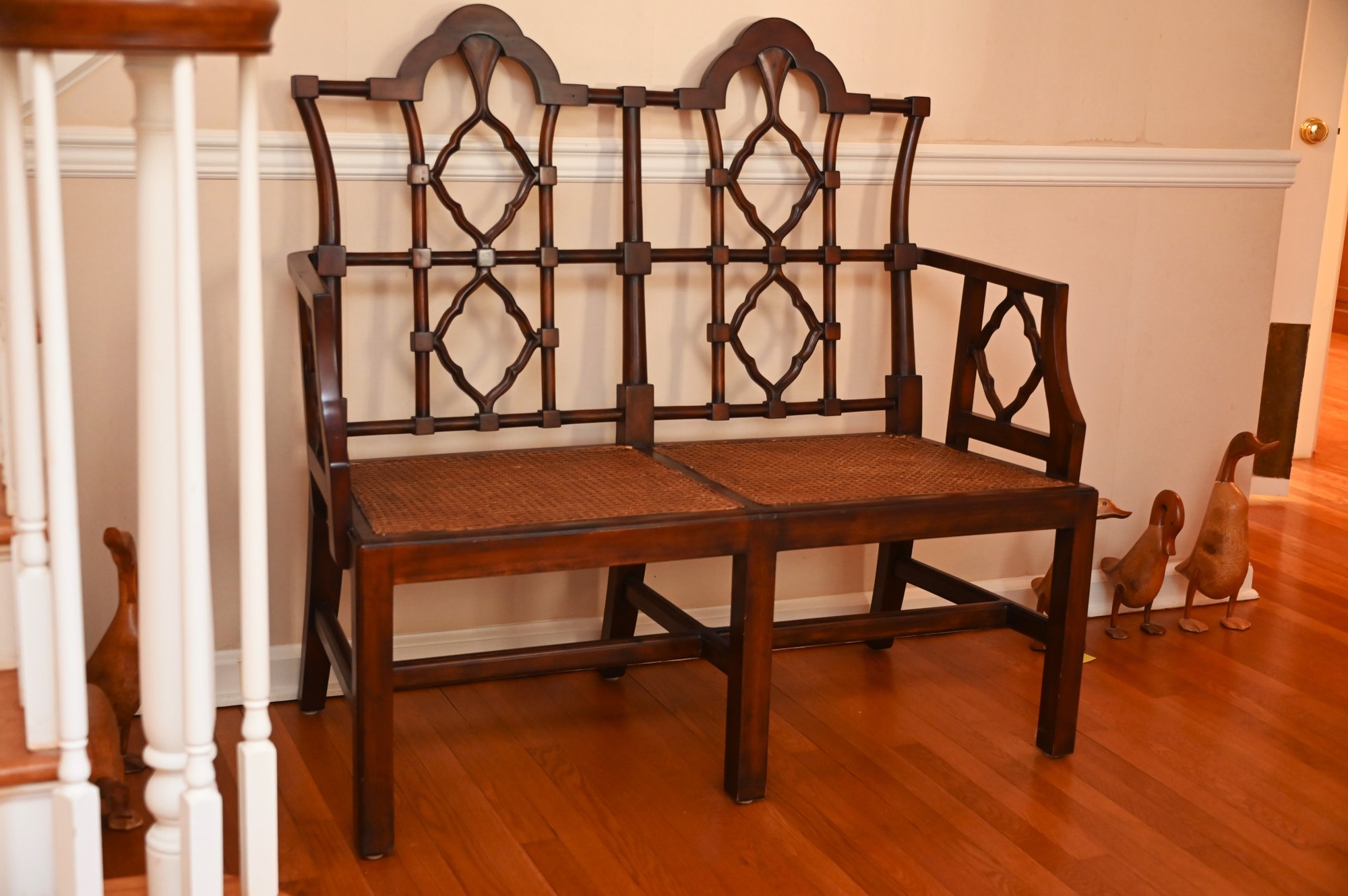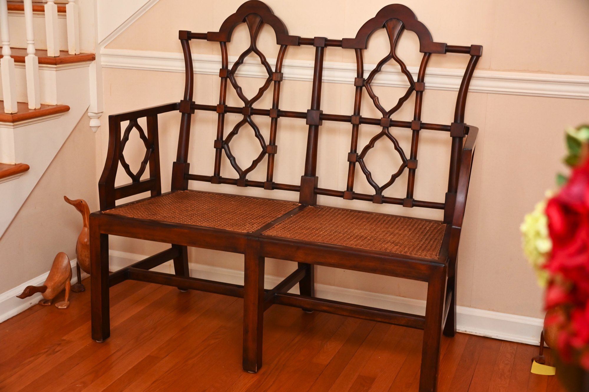 The seat is composed of woven cane, a classic element in traditional furniture that provides both durability and comfort. The armrests echo the lattice design, incorporating smaller cutout patterns that add to the bench’s cohesive and decorative appeal.