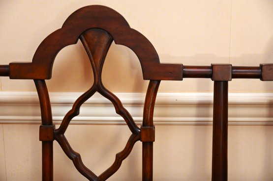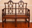 This Chippendale-style wooden bench features an elegant and intricate fretwork backrest with an interlaced geometric design. The high, slightly arched back showcases pierced lattice panels with shaped diamond motifs, framed by subtly curved uprights, giving the piece a refined and symmetrical aesthetic.