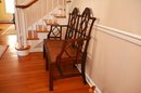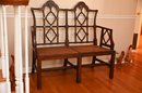 With its rich, dark wood finish, this bench exudes warmth and sophistication, reminiscent of Chinese Chippendale influences, popular in the 18th century. The sturdy, straight legs and stretchers add structural stability while maintaining an air of delicate craftsmanship. This piece is a timeless and stylish addition to an entryway, hallway, or seating area.