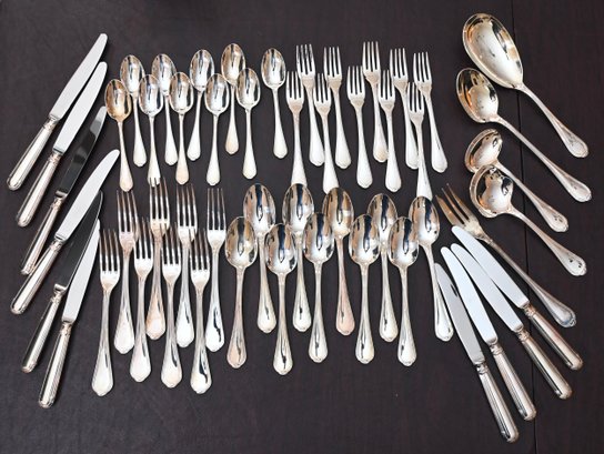 A beautifully arranged collection of fine silver-plated flatware, featuring an elegant, timeless design with gently curved handles and subtle detailing. This extensive set includes a variety of utensils such as dinner forks, salad forks, dinner knives, teaspoons, soup spoons, and serving pieces, including large ladles and serving forks. The polished finish adds a luxurious touch, making this set ideal for formal dining settings or collectors of classic silverware.
