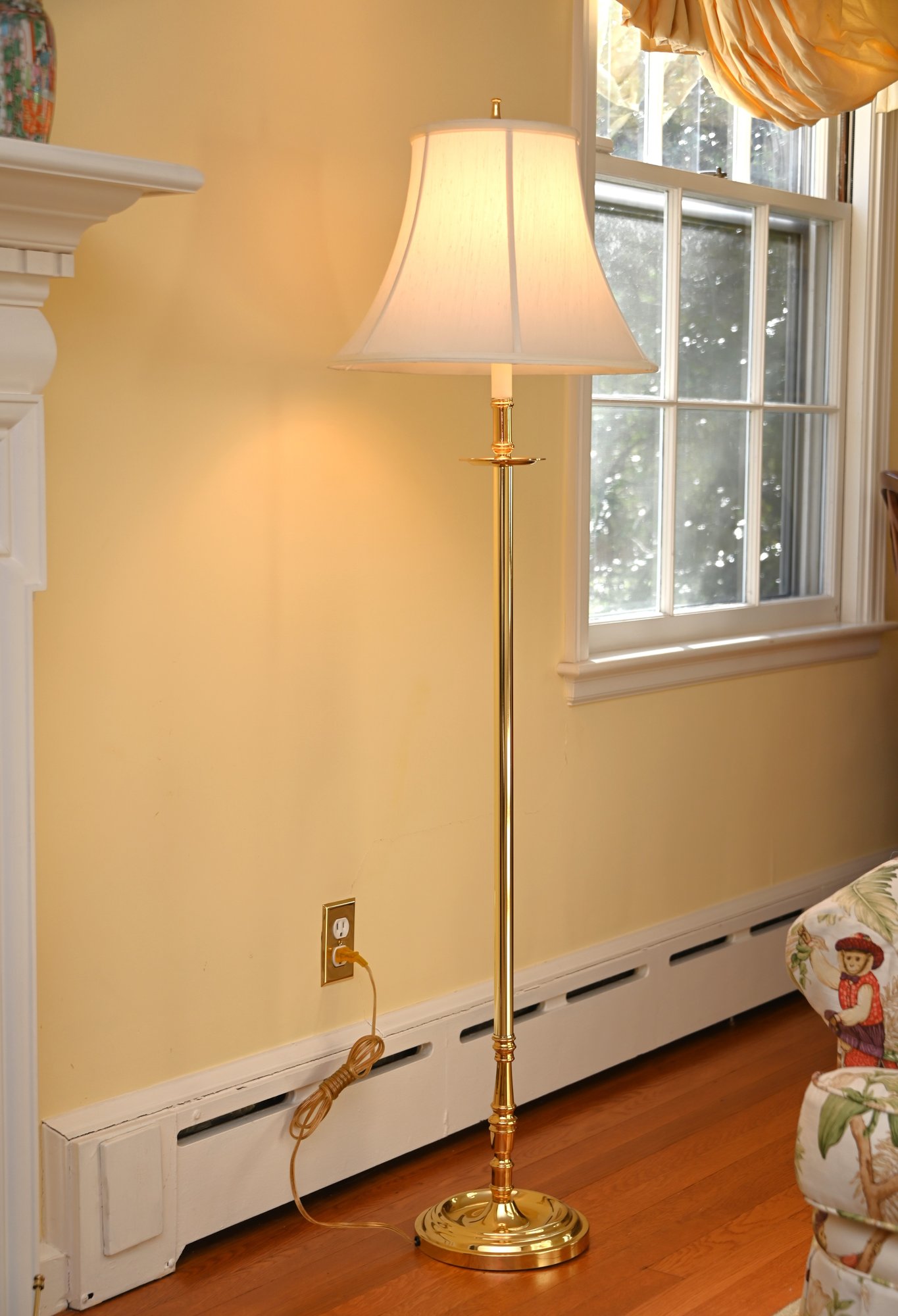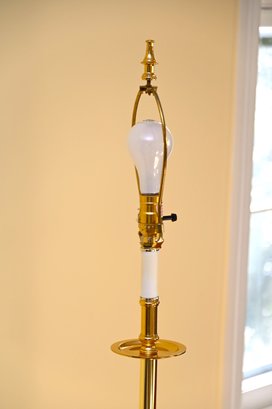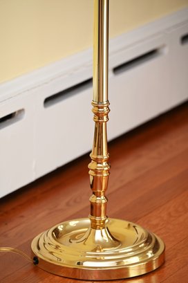 This is a classic brass floor lamp with a traditional design, featuring a polished brass finish and a cream-colored bell-shaped fabric lampshade. The lamp has a slender, elegant metal column with decorative accents near the base and midsection, giving it a refined, vintage appeal.
