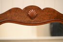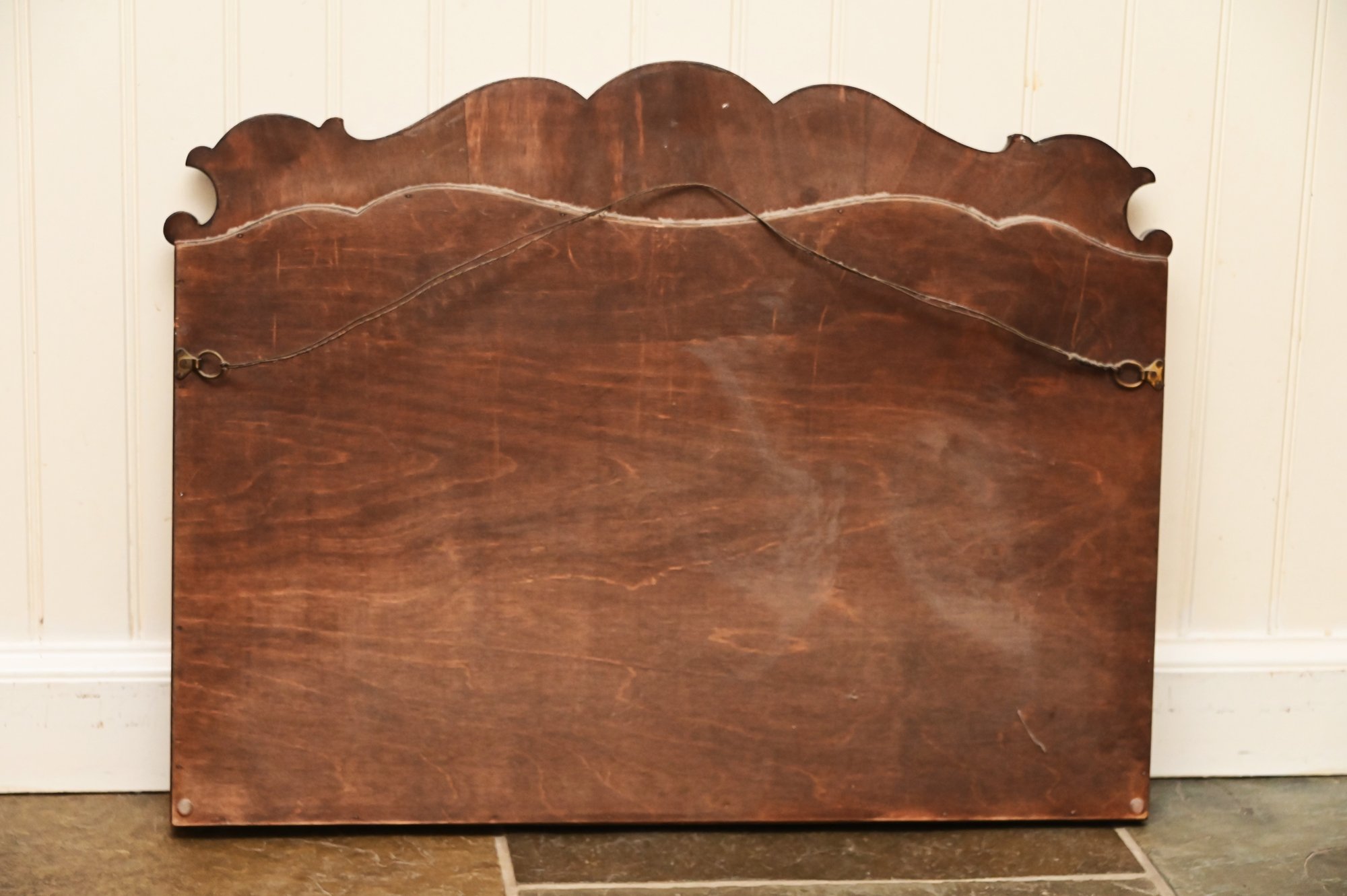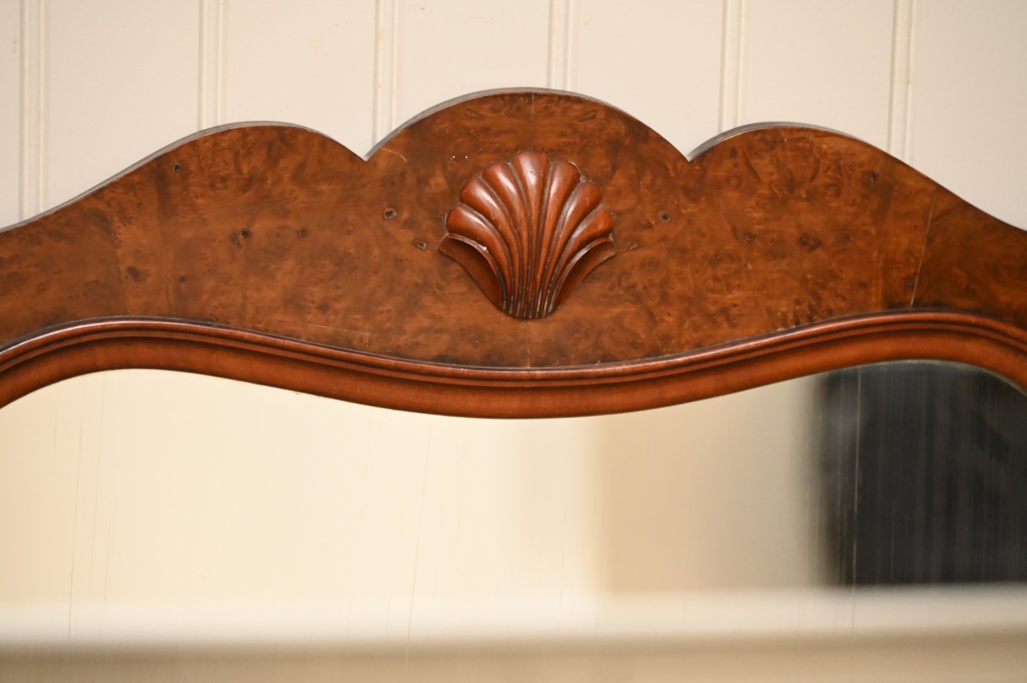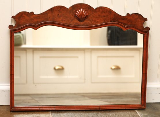 This is a classic wooden-framed mirror featuring an elegantly curved top with a rich, warm-toned wood finish. The frame is adorned with a decorative shell carving at the center of the crest, giving it a traditional and refined look. The mirror’s edges showcase a subtle molding design, adding depth and character to its overall aesthetic.