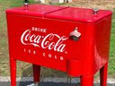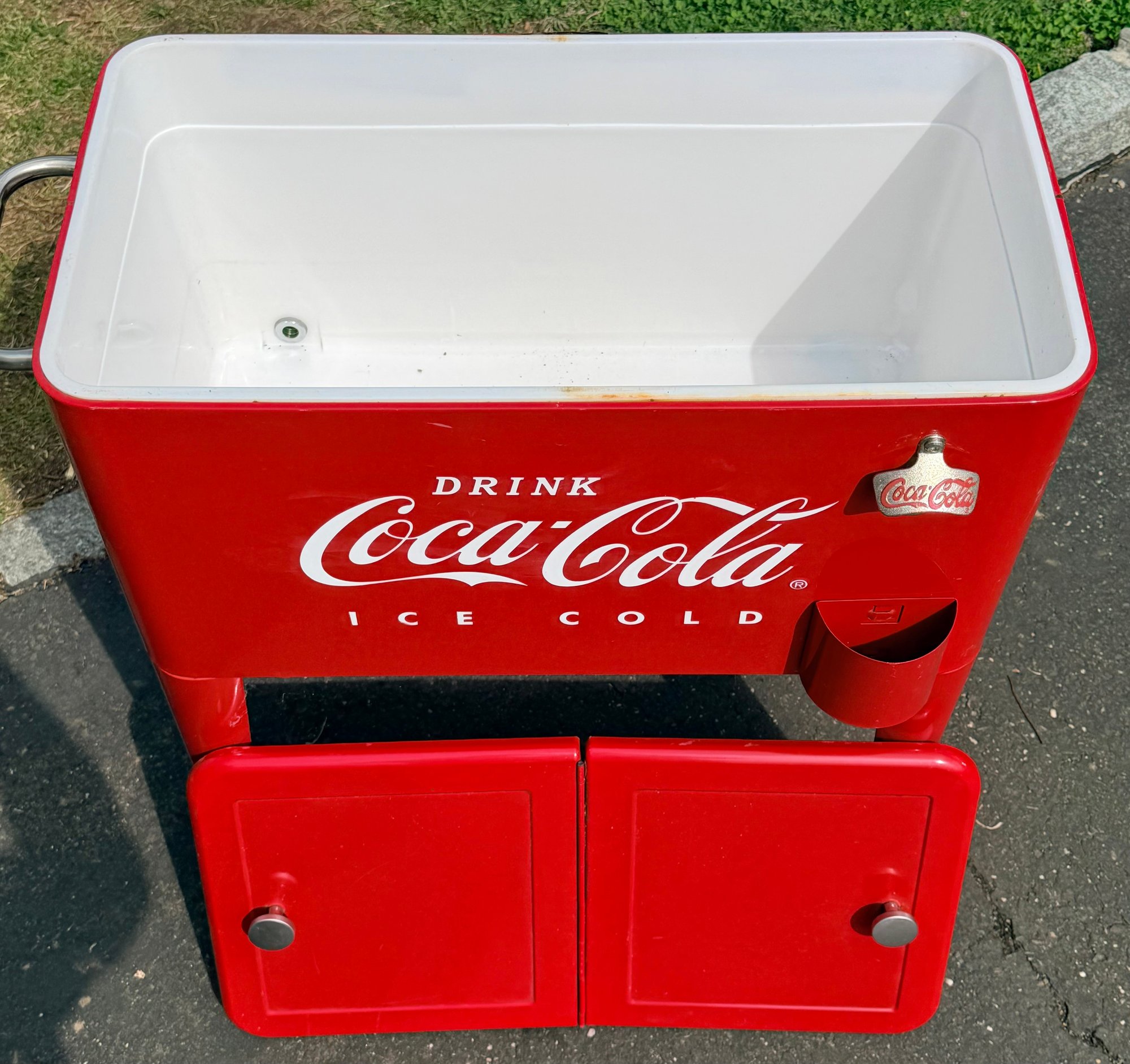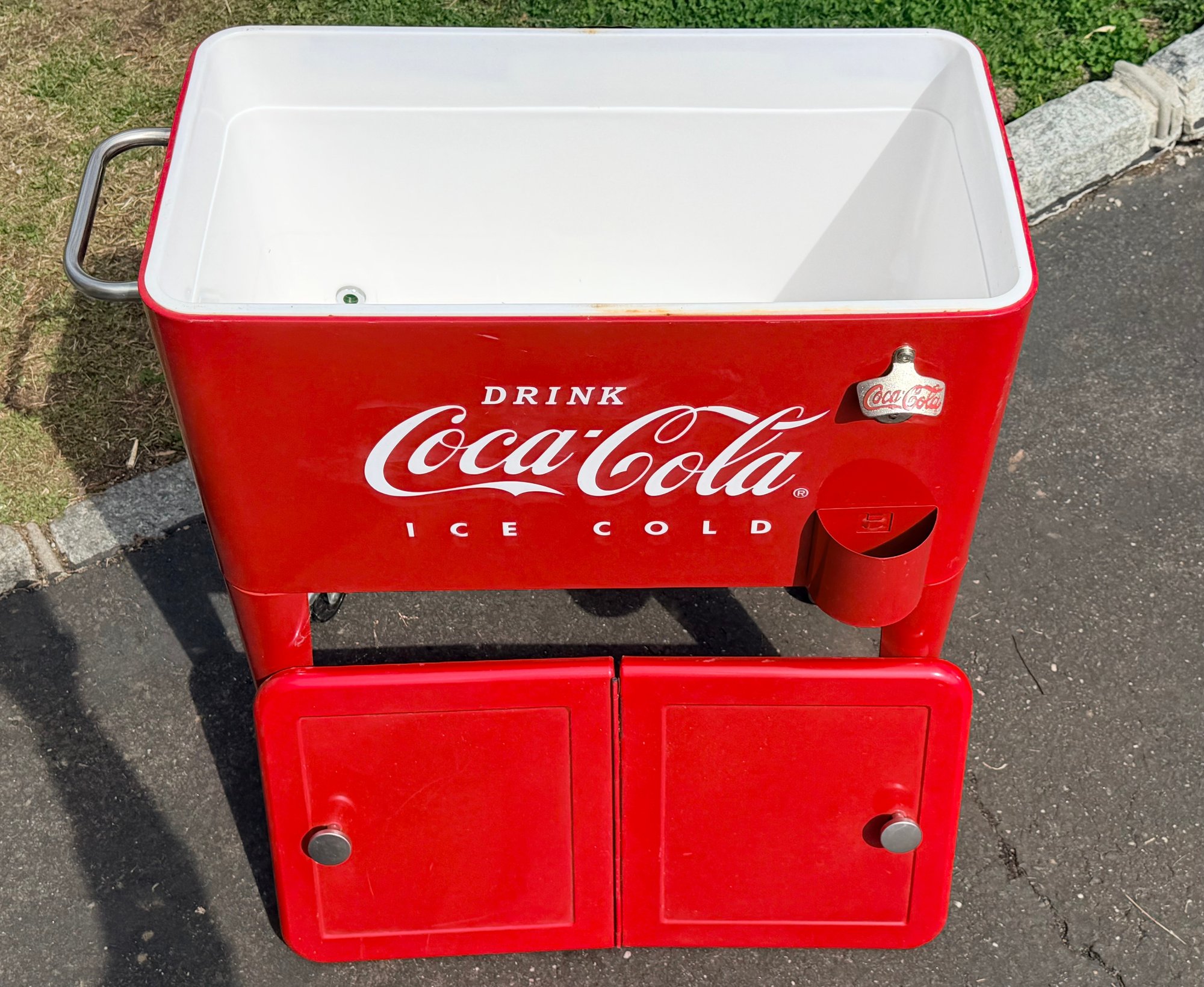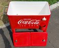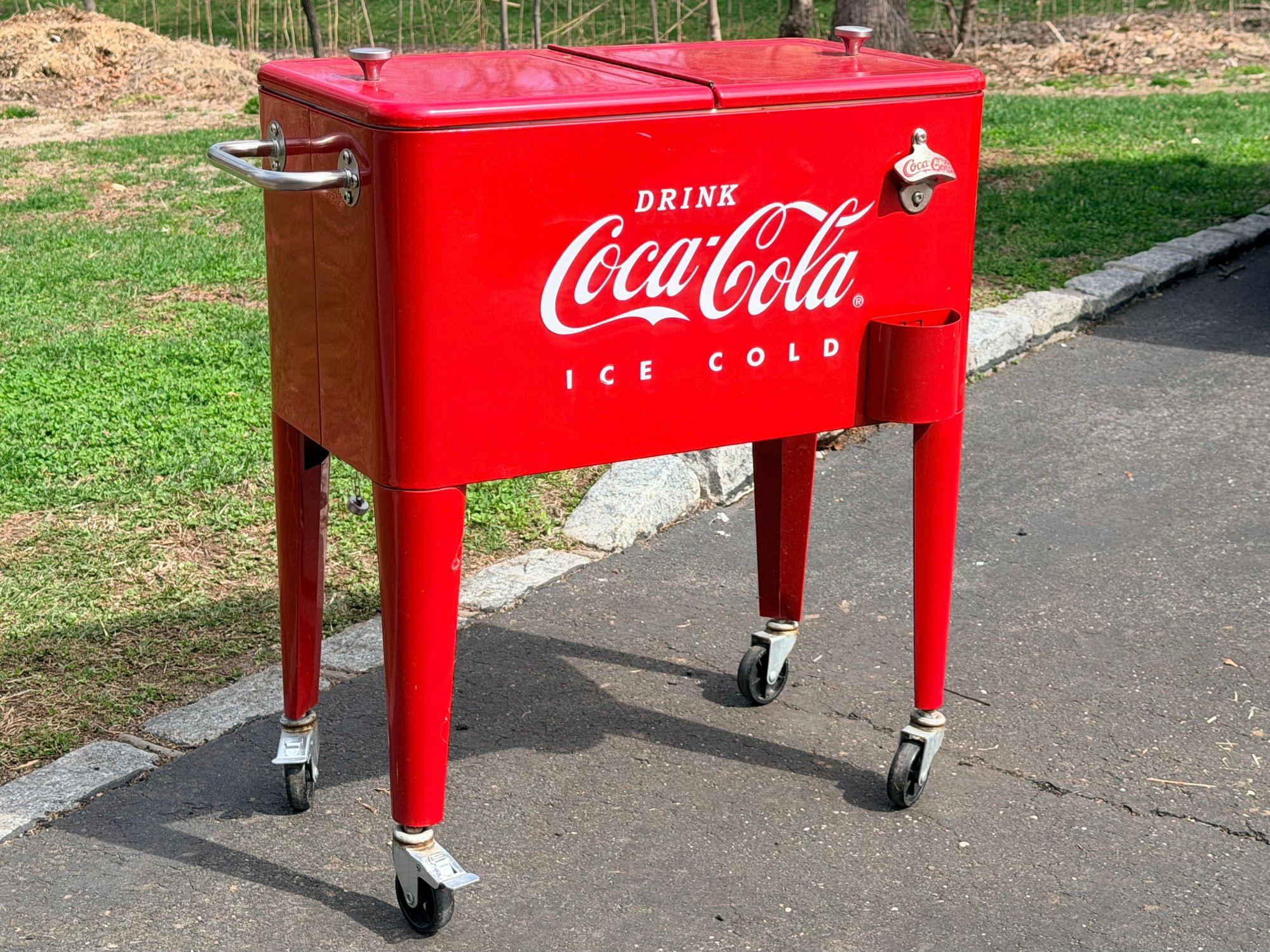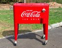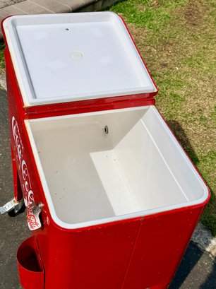 Vintage-style Coca-Cola cooler cart featuring a bright red painted metal body with classic “Drink Coca-Cola Ice Cold” branding. Rectangular insulated cooler with dual hinged lids and metal knob handles. Equipped with a mounted bottle opener and integrated cap catcher on the front. Side handles allow for lifting, and the unit is supported on four legs with caster wheels for mobility.