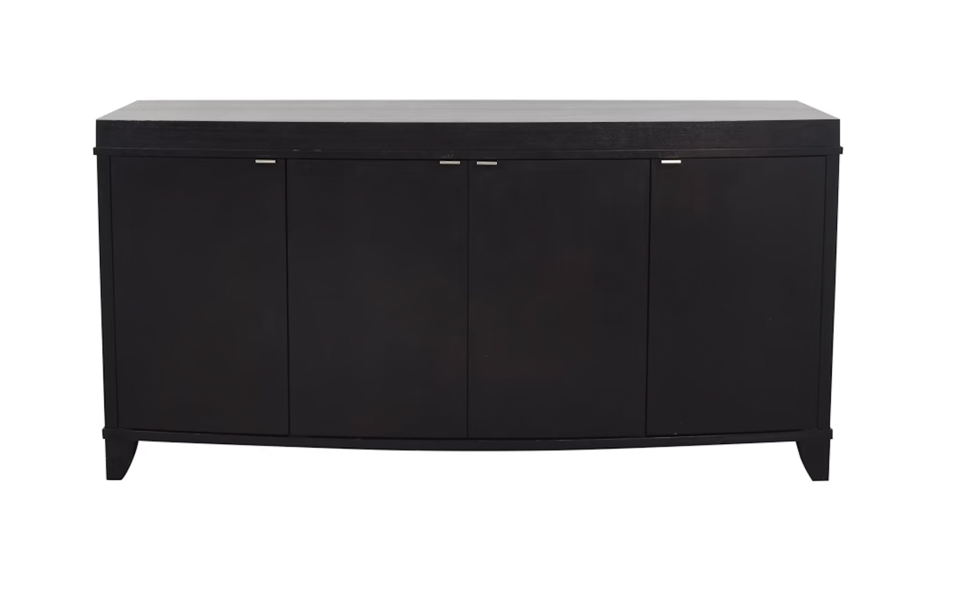 Black/espresso colored wooden tv credenza console in good condition. There are 4 doors and a middle drawer for storage. Some light wear near the feet.