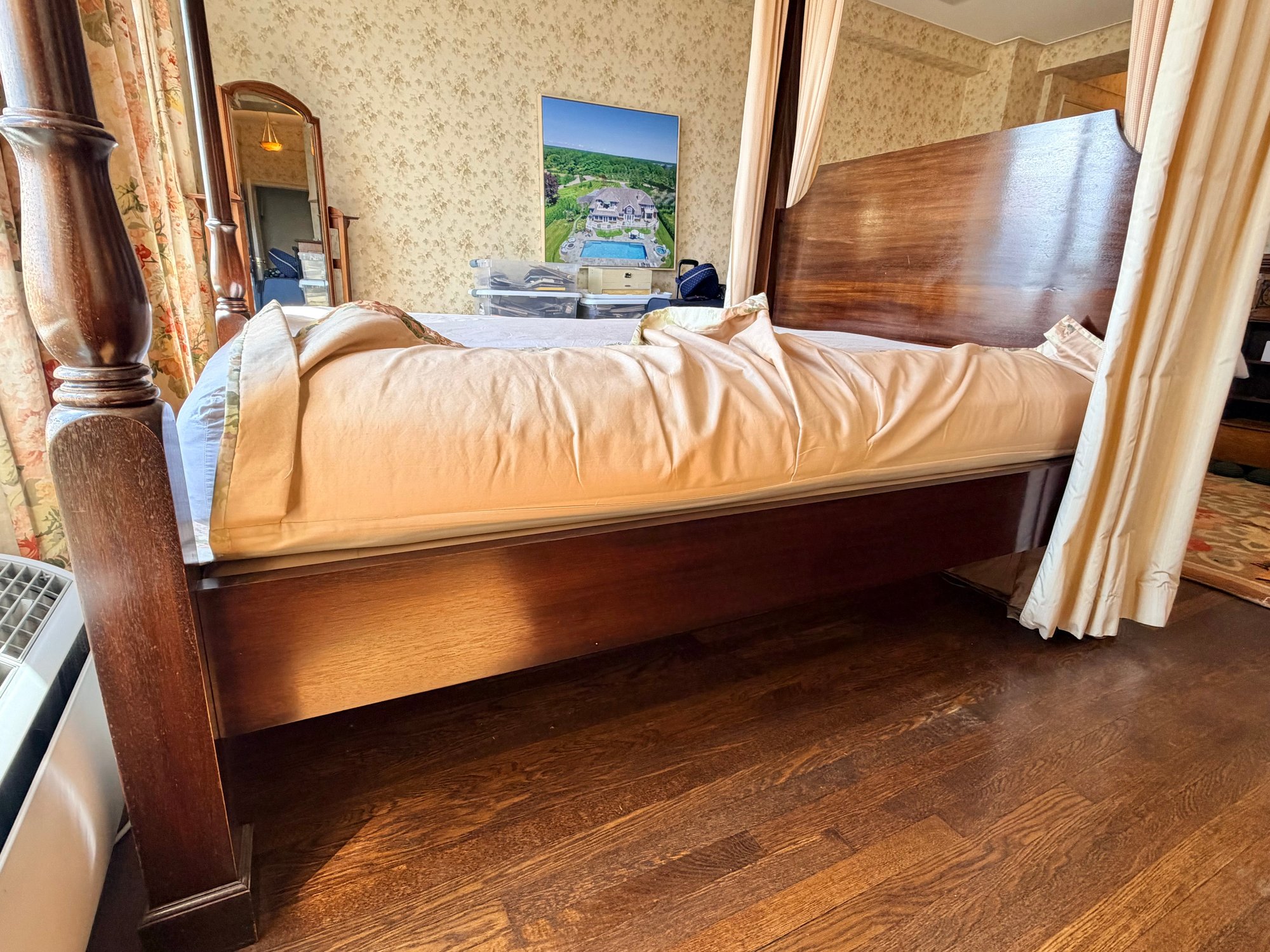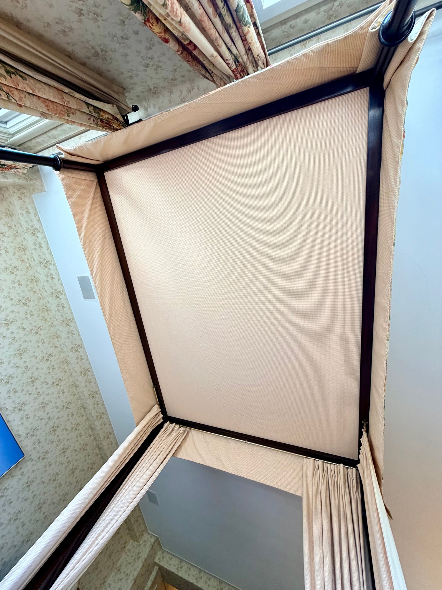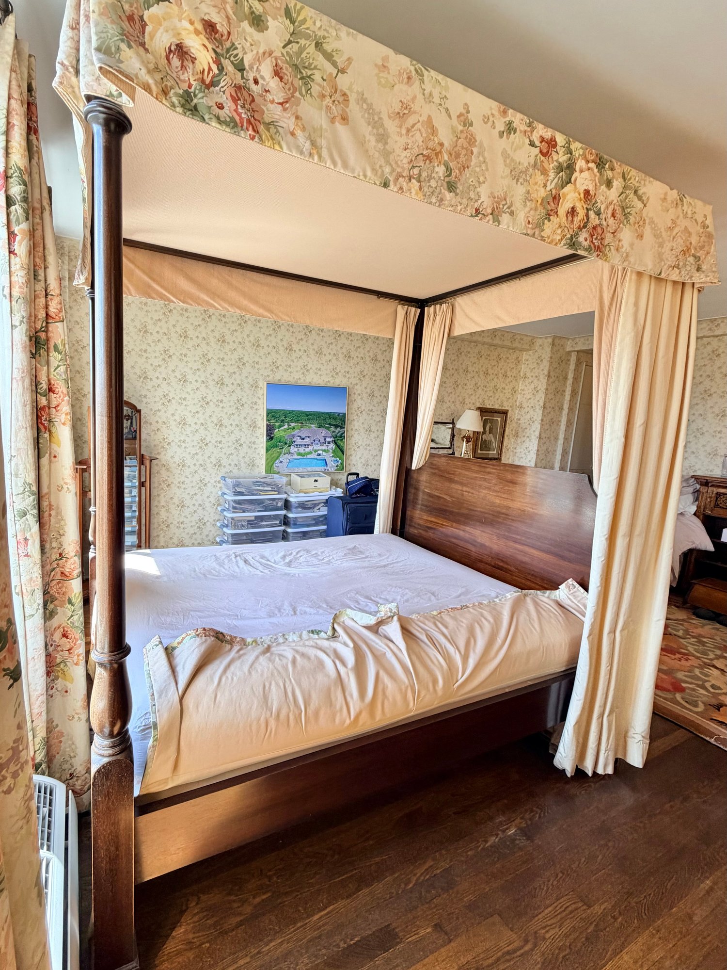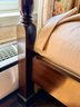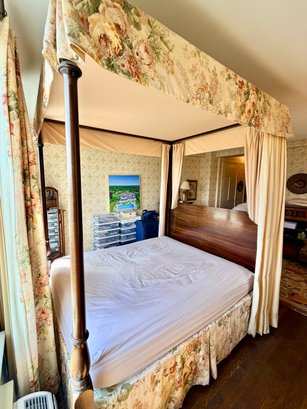 A custom-made four-poster canopy bed in Honduran mahogany, dating to 1999. The design features a square, tapered headboard and four posts with subtle tapering, supporting a simple rectangular canopy frame above. The bed is fitted with a tailored upholstered canopy and matching valance in a floral fabric, with coordinating side drapes that soften the structure and add a decorative, traditional character. The mahogany frame has a rich, warm tone with a smooth finish, complementing the light, patterned textile elements.