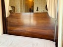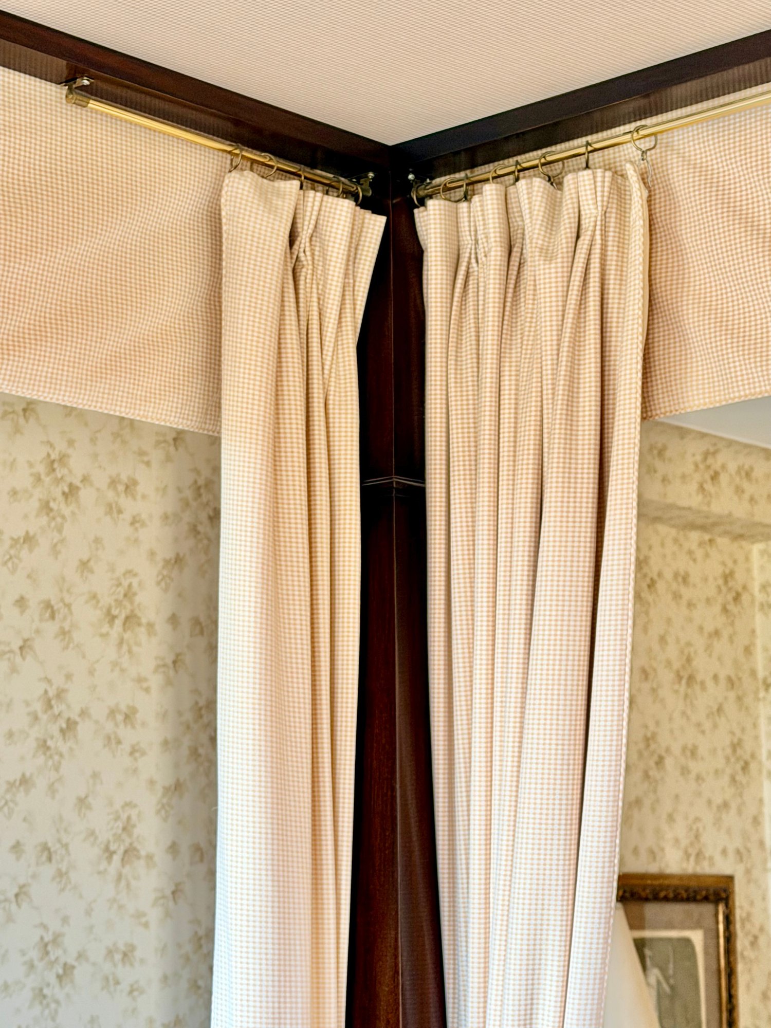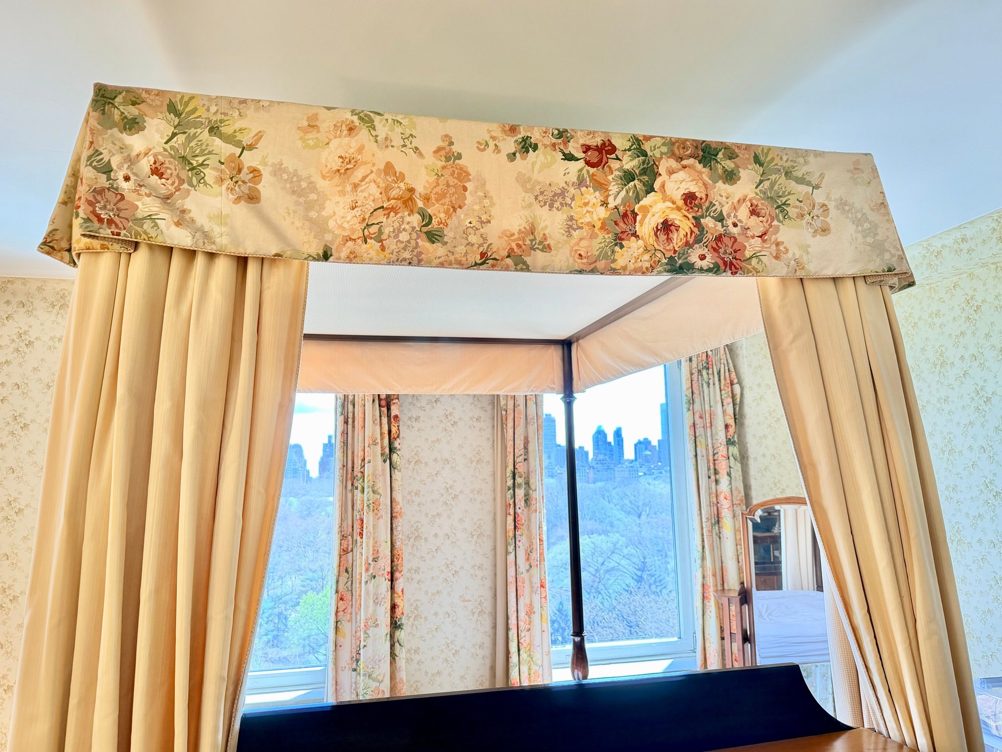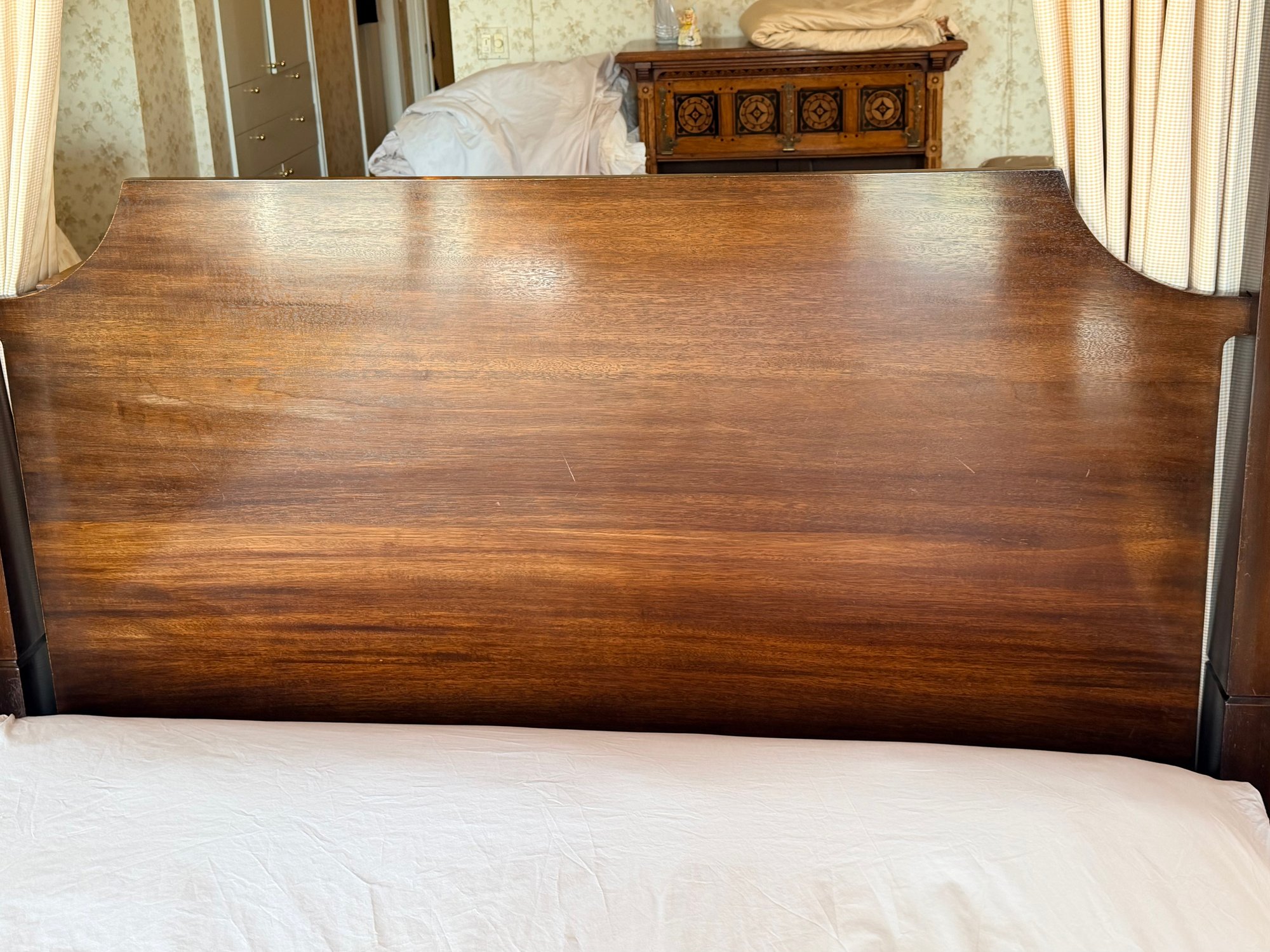 A custom-made four-poster canopy bed in Honduran mahogany, dating to 1999. The design features a square, tapered headboard and four posts with subtle tapering, supporting a simple rectangular canopy frame above. The bed is fitted with a tailored upholstered canopy and matching valance in a floral fabric, with coordinating side drapes that soften the structure and add a decorative, traditional character. The mahogany frame has a rich, warm tone with a smooth finish, complementing the light, patterned textile elements.