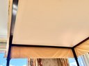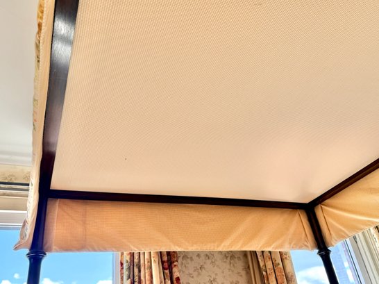 Good overall condition consistent with use. The wood frame shows minor surface wear and light marks. The upholstered canopy and fabric elements appear clean with some natural creasing and light wear. Structurally sound.