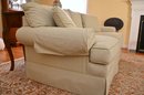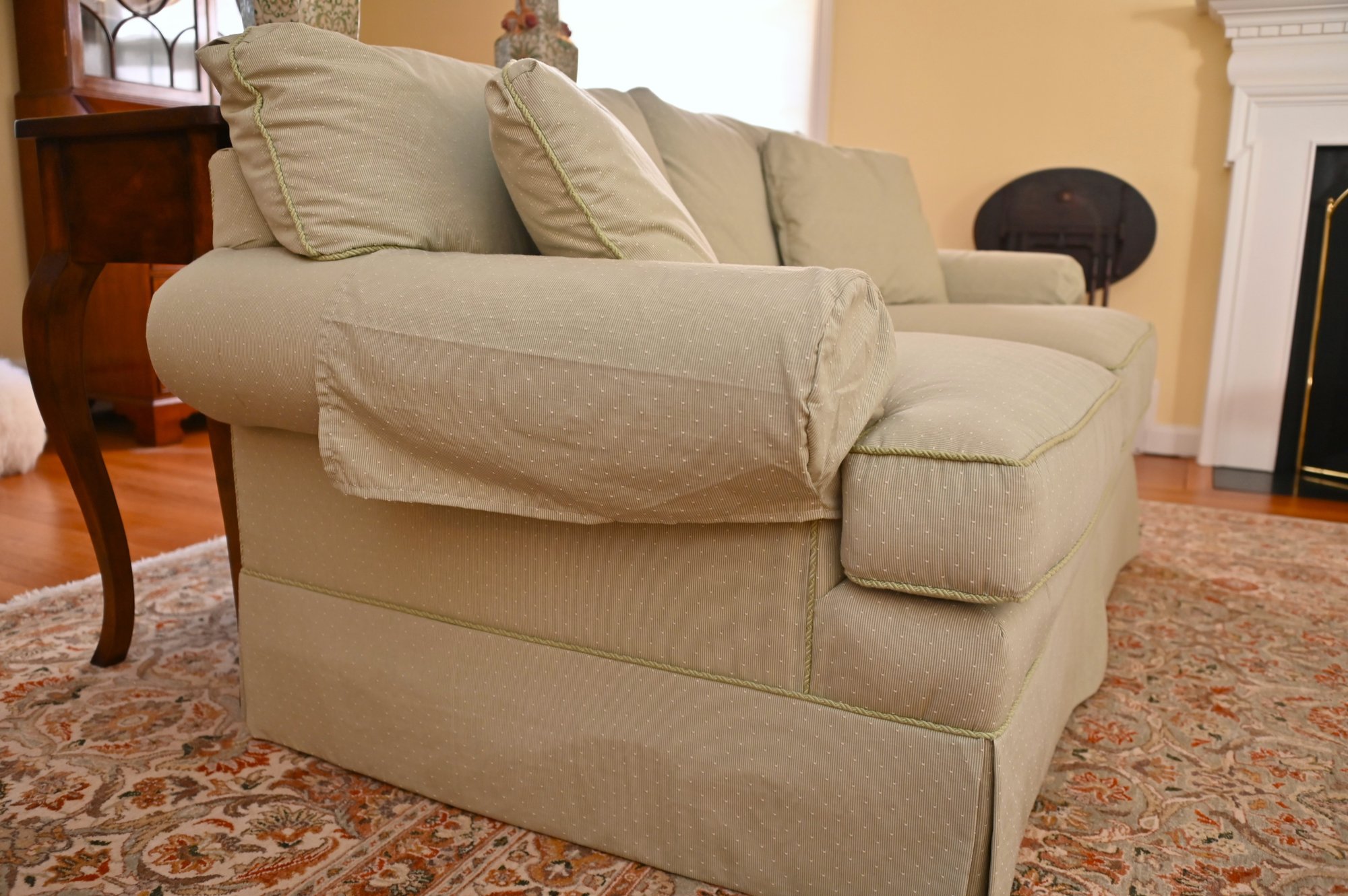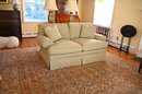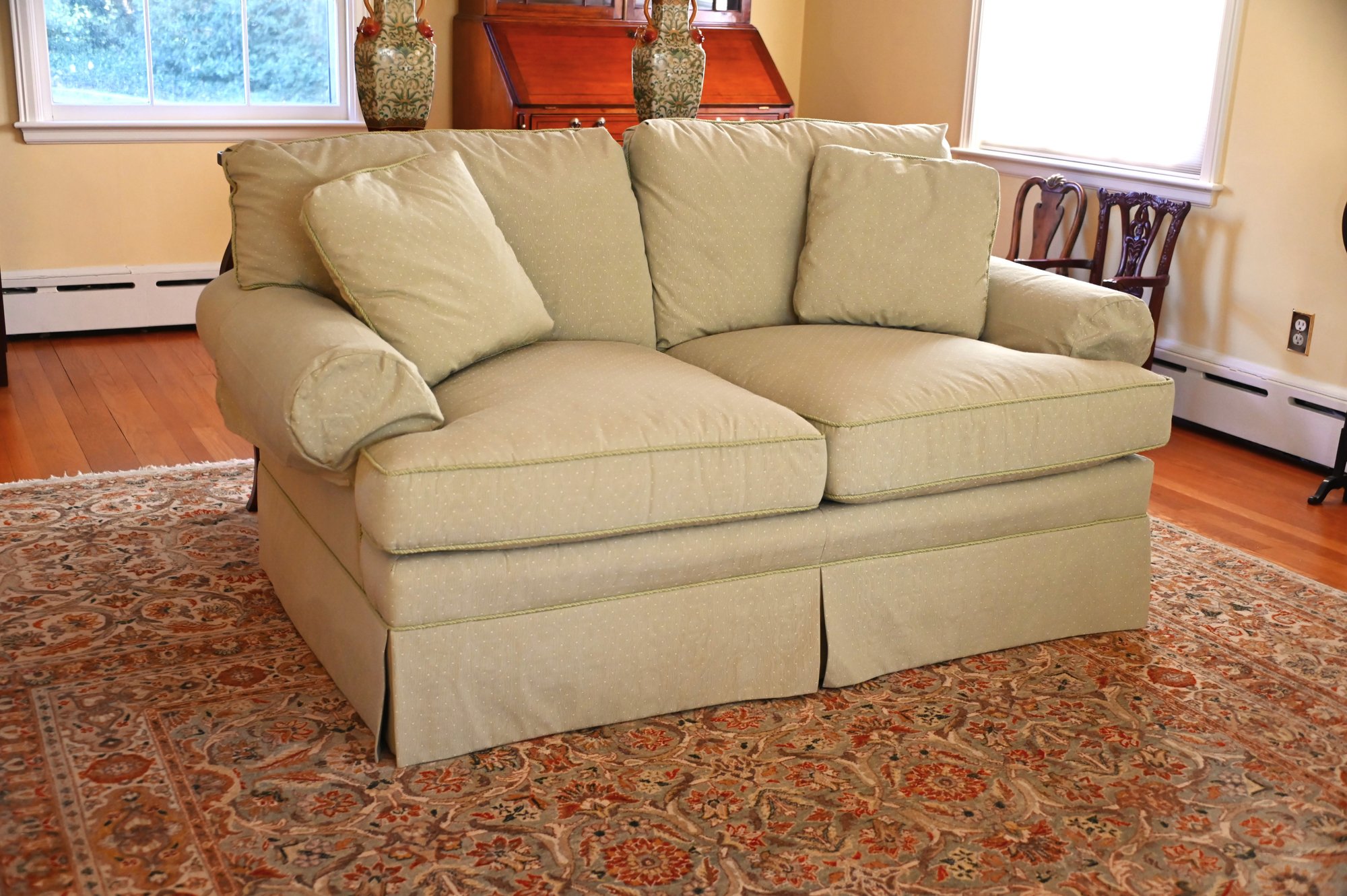 This is a classic two-seat upholstered loveseat with a soft pastel green fabric featuring a subtle dotted pattern. The loveseat has a traditional design with plush, removable seat and back cushions, along with matching side pillows that provide additional comfort. The arms are rounded and well-padded, enhancing its inviting and cozy appeal.