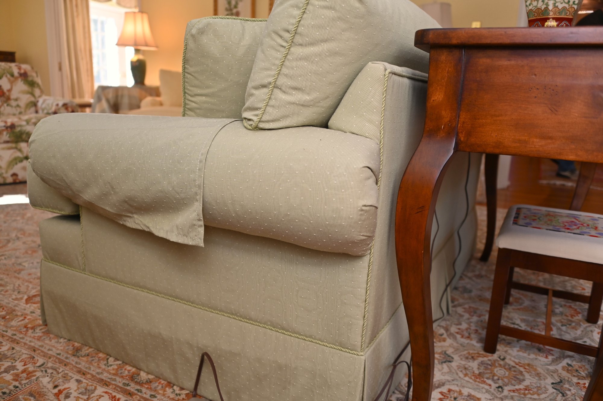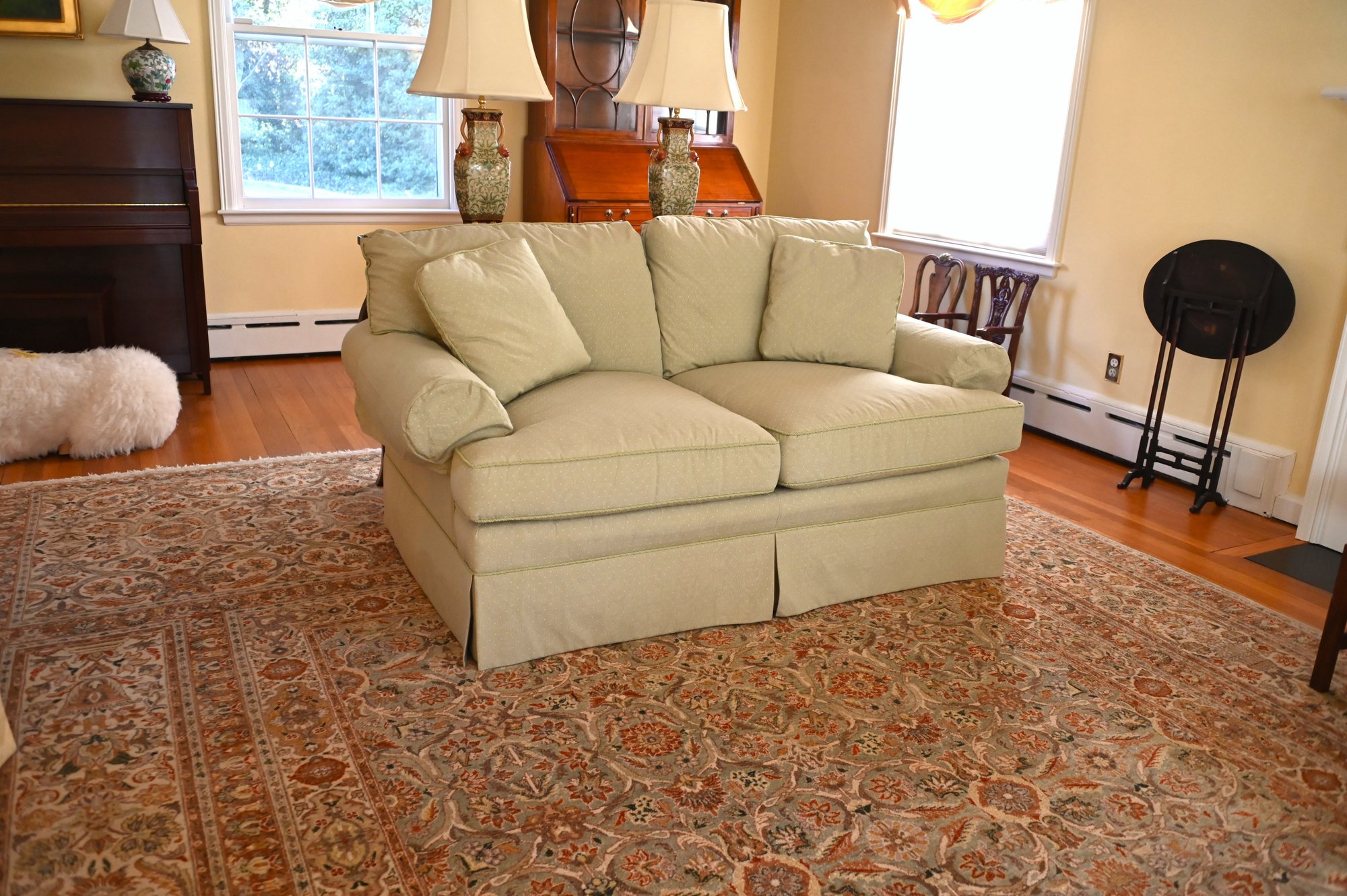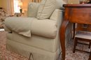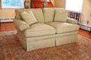 The base features a tailored skirt that conceals the legs, giving it a refined and timeless aesthetic suitable for both traditional and transitional home décor. The loveseat appears well-maintained, with piping detail along the edges of the cushions, adding a touch of sophistication. This piece is perfect for a formal sitting room, living room, or a cozy reading nook.
