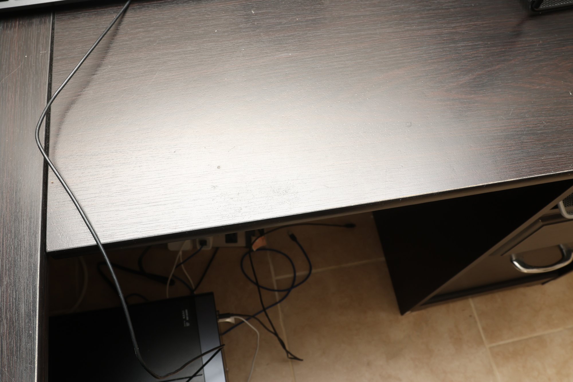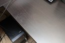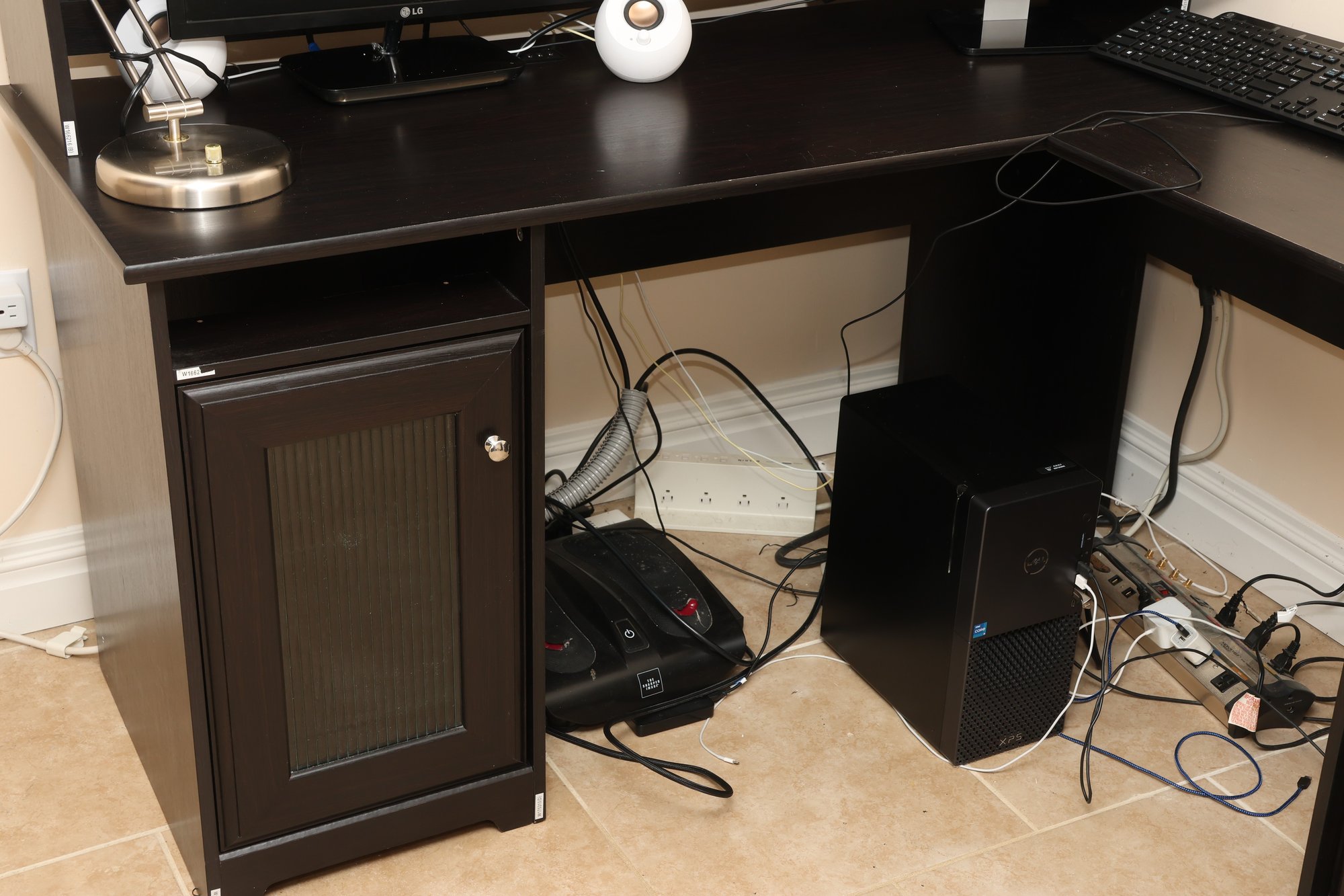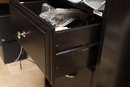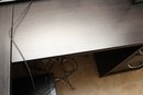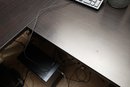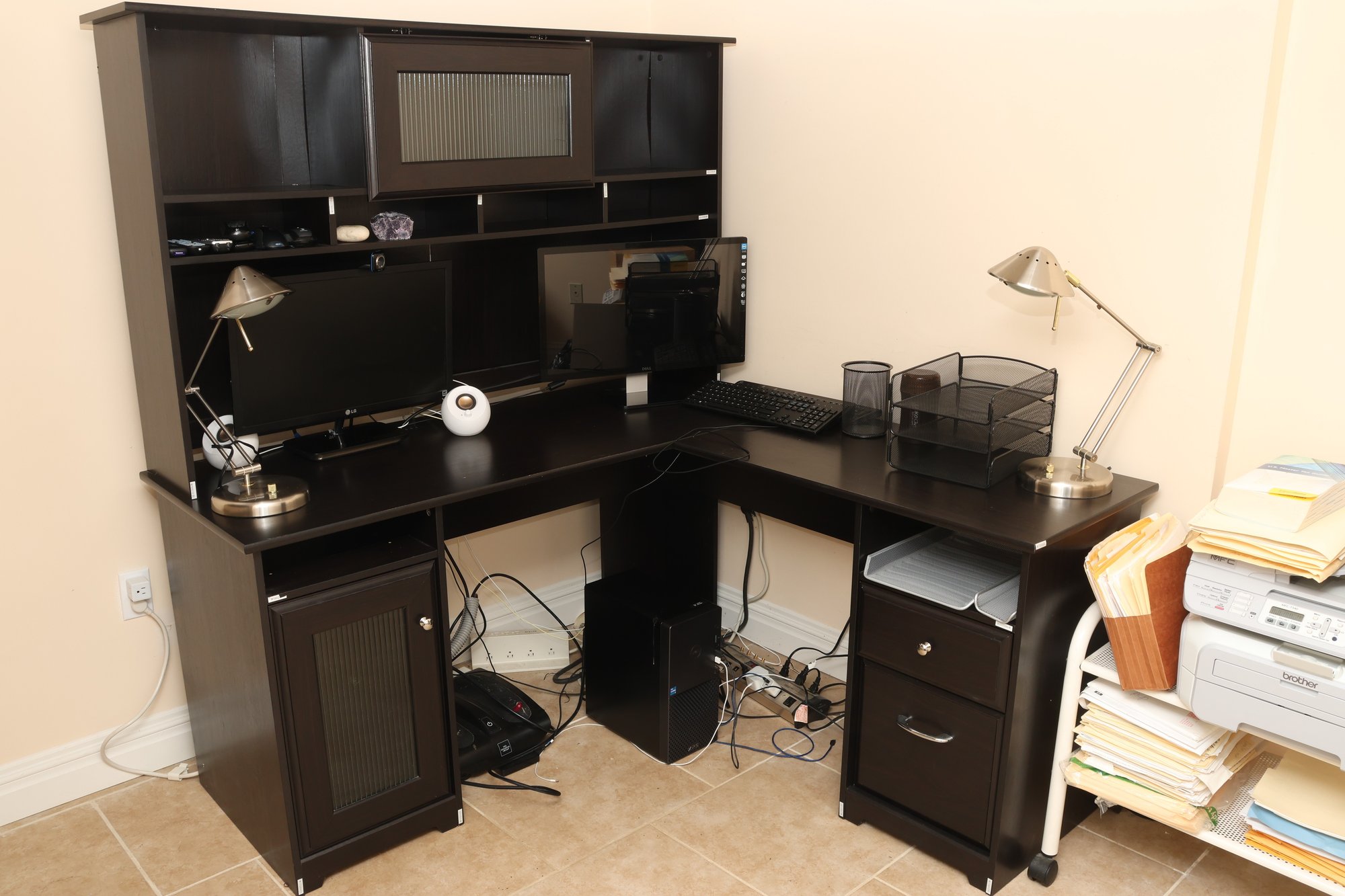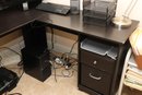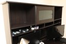 This is a dark brown L-shaped computer desk featuring a multi-tiered hutch and integrated storage solutions. The hutch includes open shelving and a cabinet with a textured panel door, while the desk base offers a left-side cabinet with a similar door, a pull-out keyboard tray, and a right-side drawer unit with an open shelf. Constructed from engineered wood with a laminate finish, this functional piece provides ample workspace and organization for an office setup.
