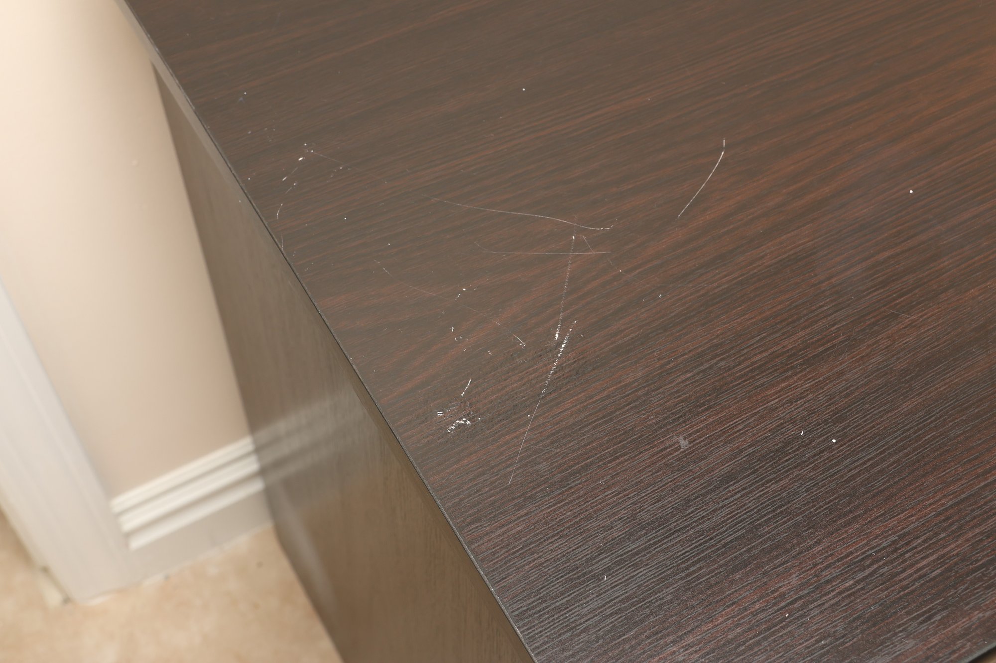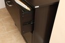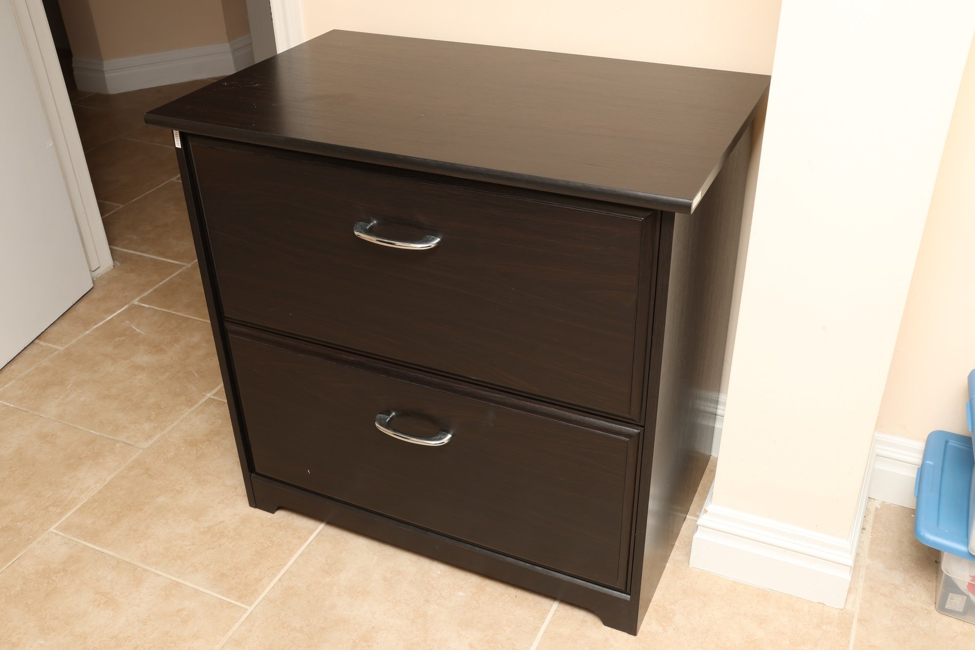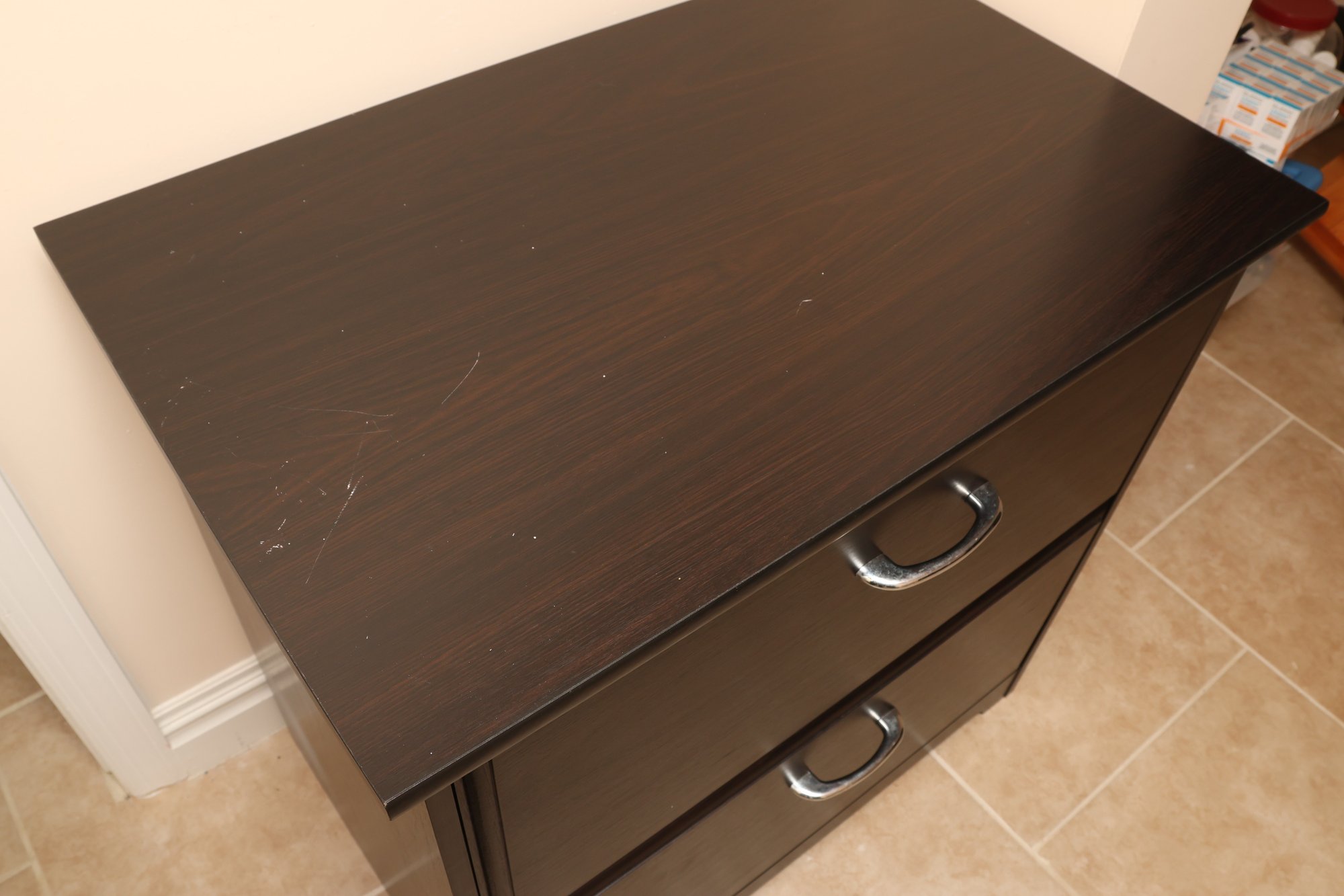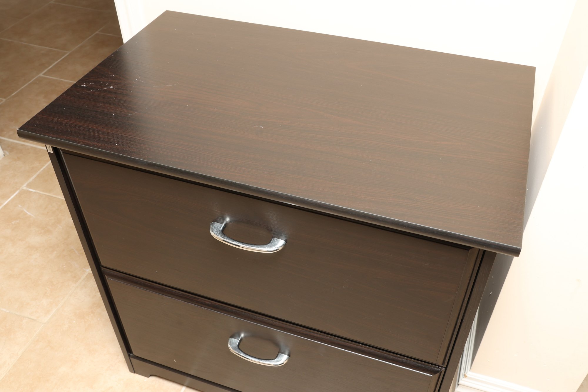 This is a dark brown, two-drawer filing cabinet crafted from wood or wood composite. It features two spacious pull-out drawers, each equipped with a sleek silver-tone metal bar handle. The cabinet presents a clean, contemporary design, ideal for office or home storage.