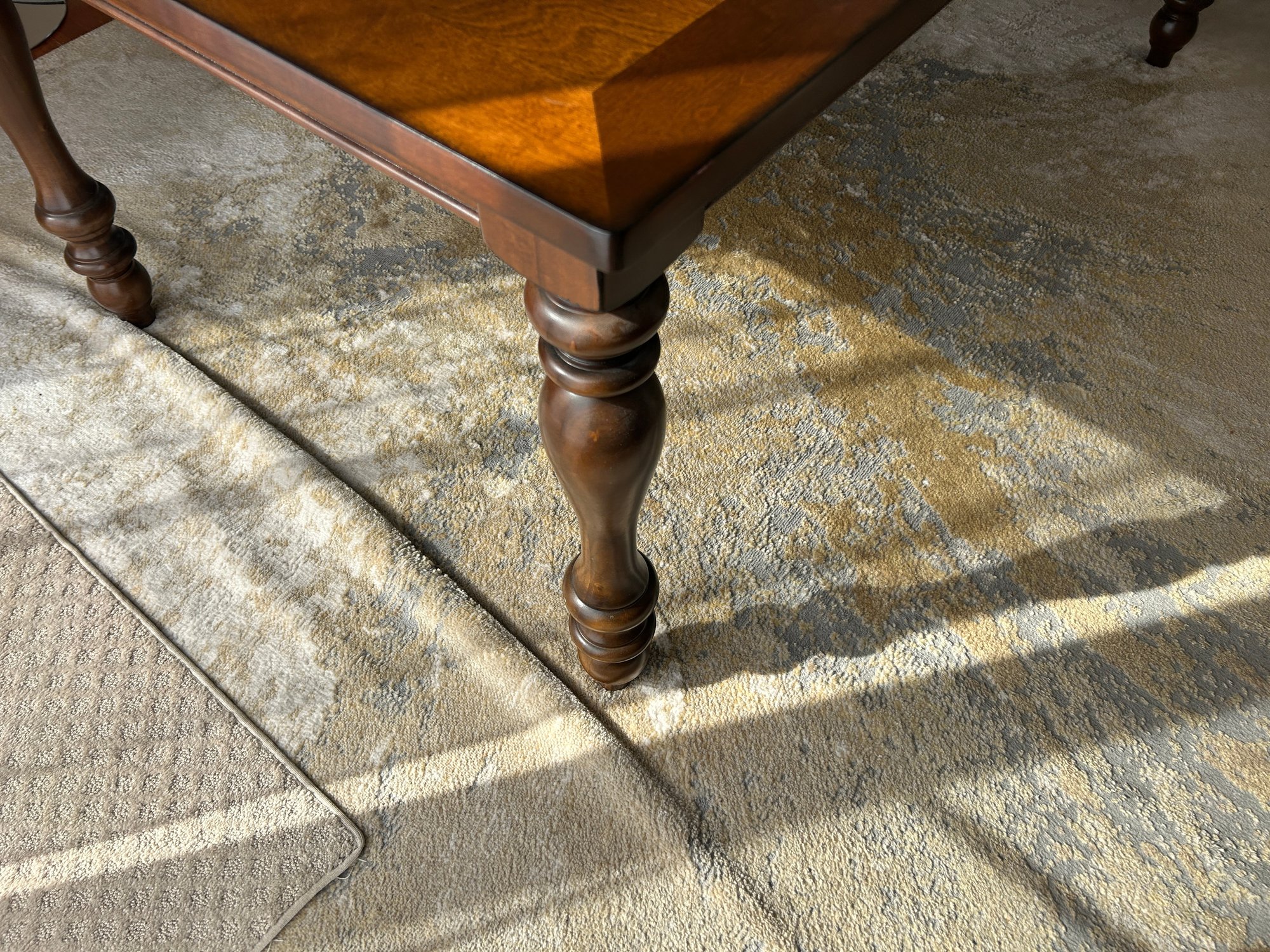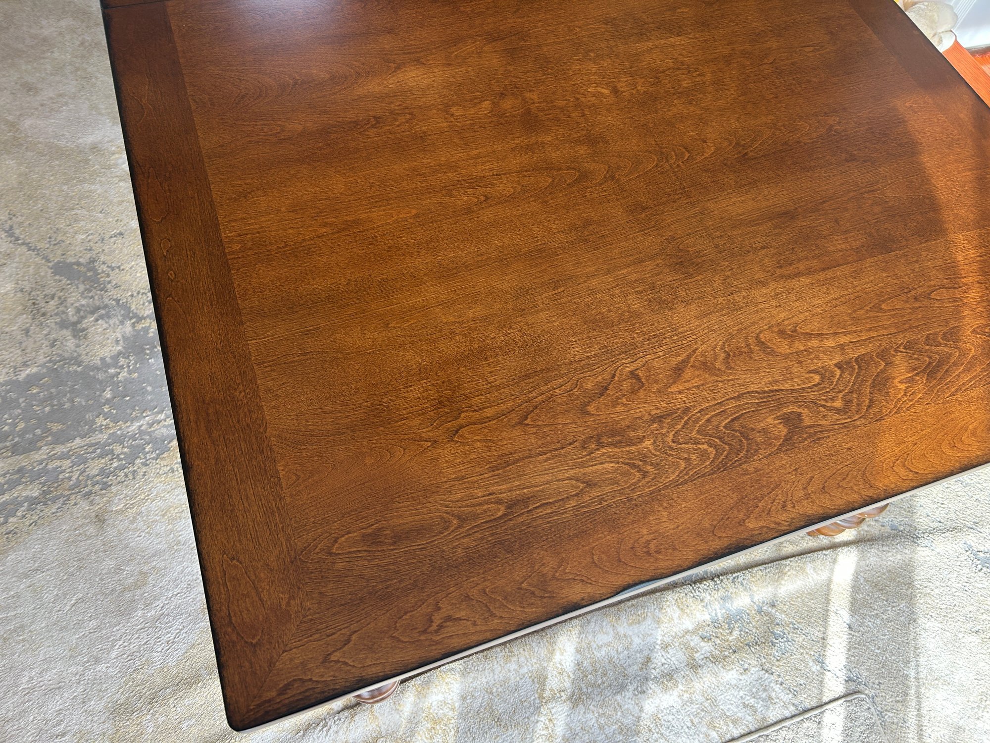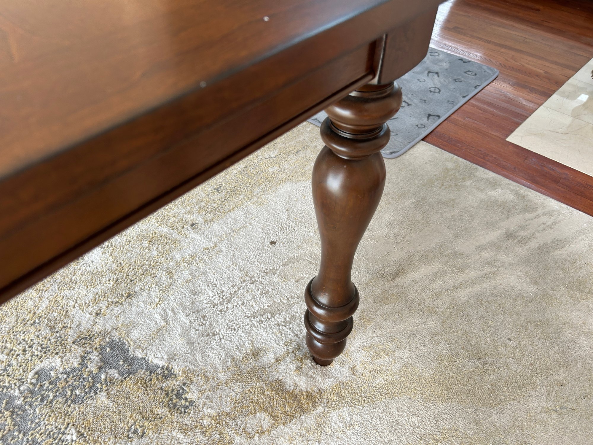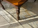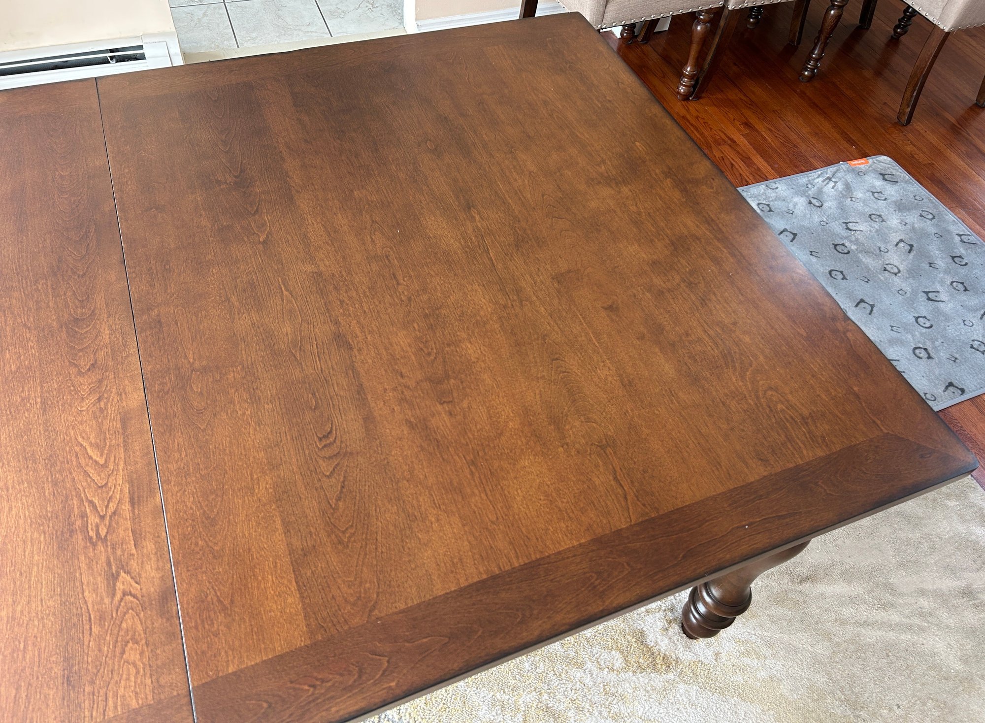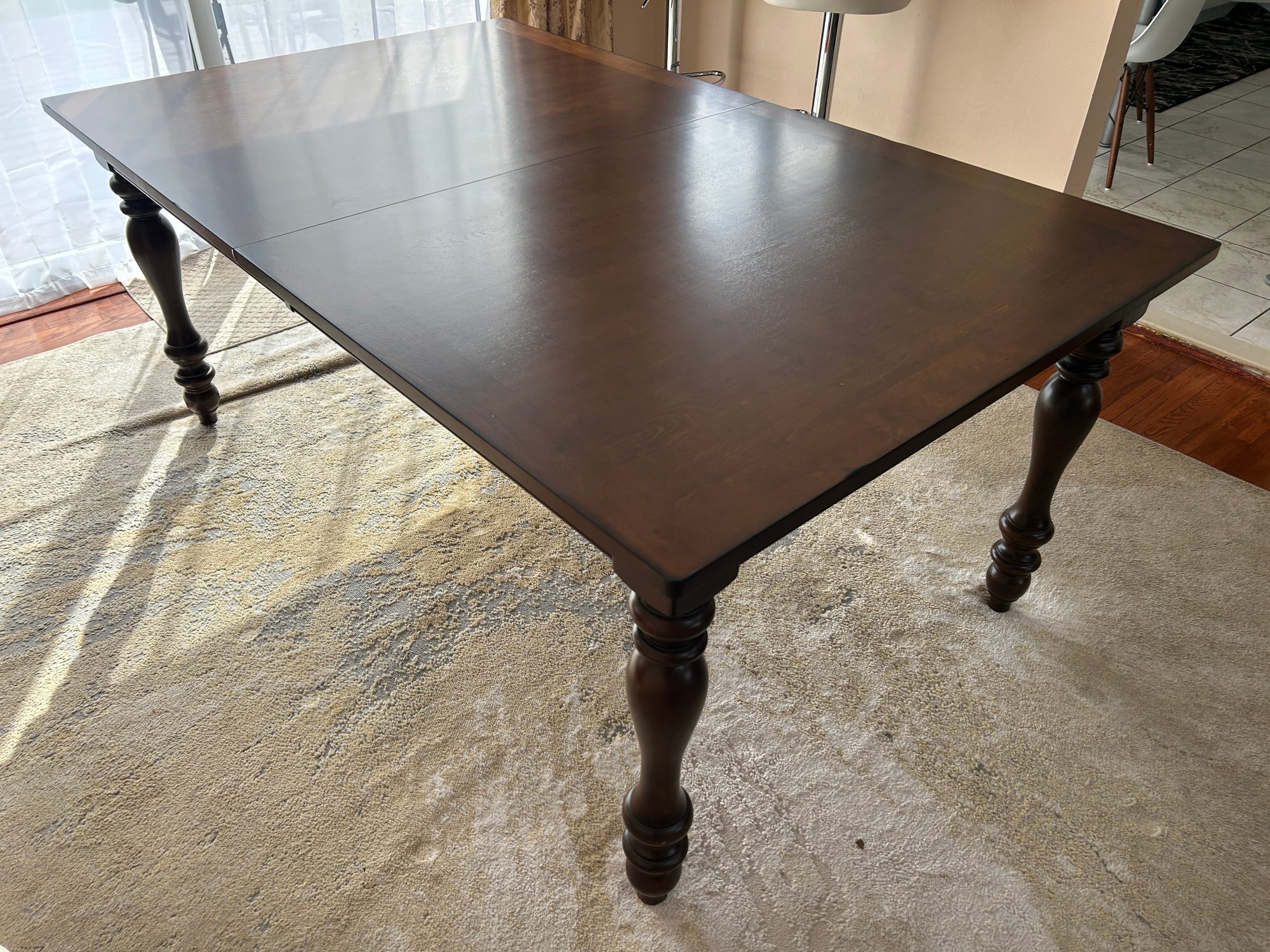 This is a dark brown wooden dining table featuring a rectangular top and four ornate, turned legs. The tabletop has a visible seam, indicating it is likely extendable. The surface appears polished and free from significant blemishes.