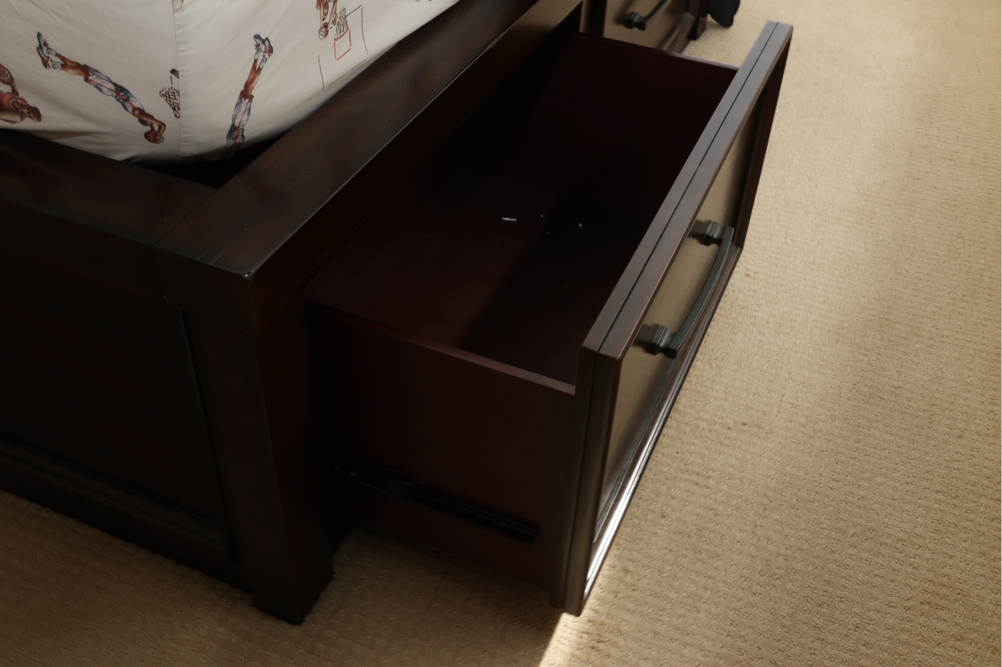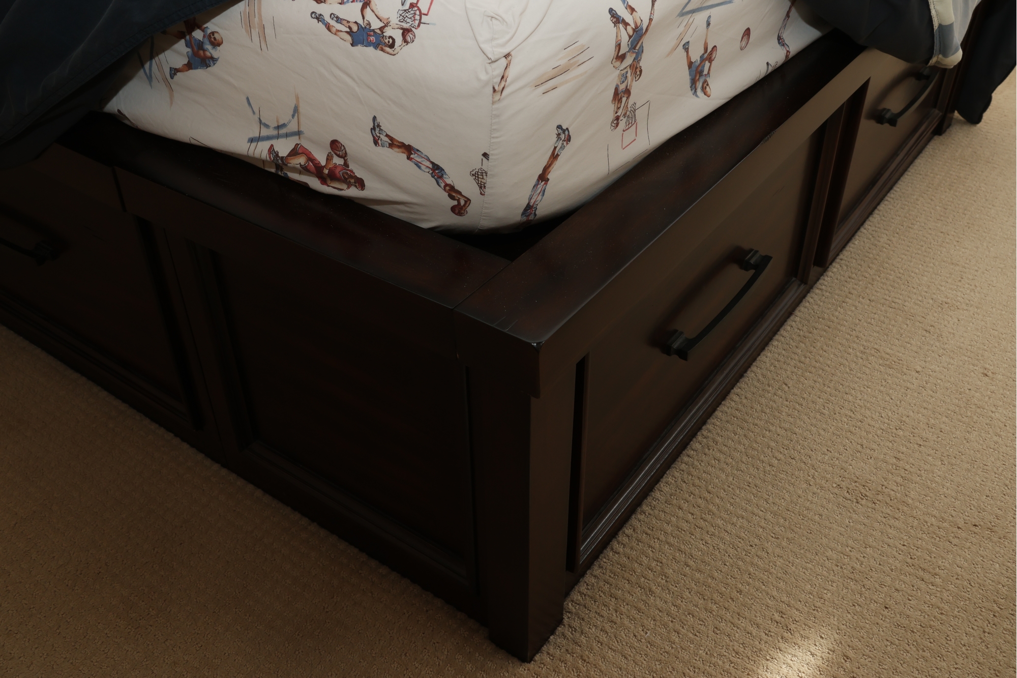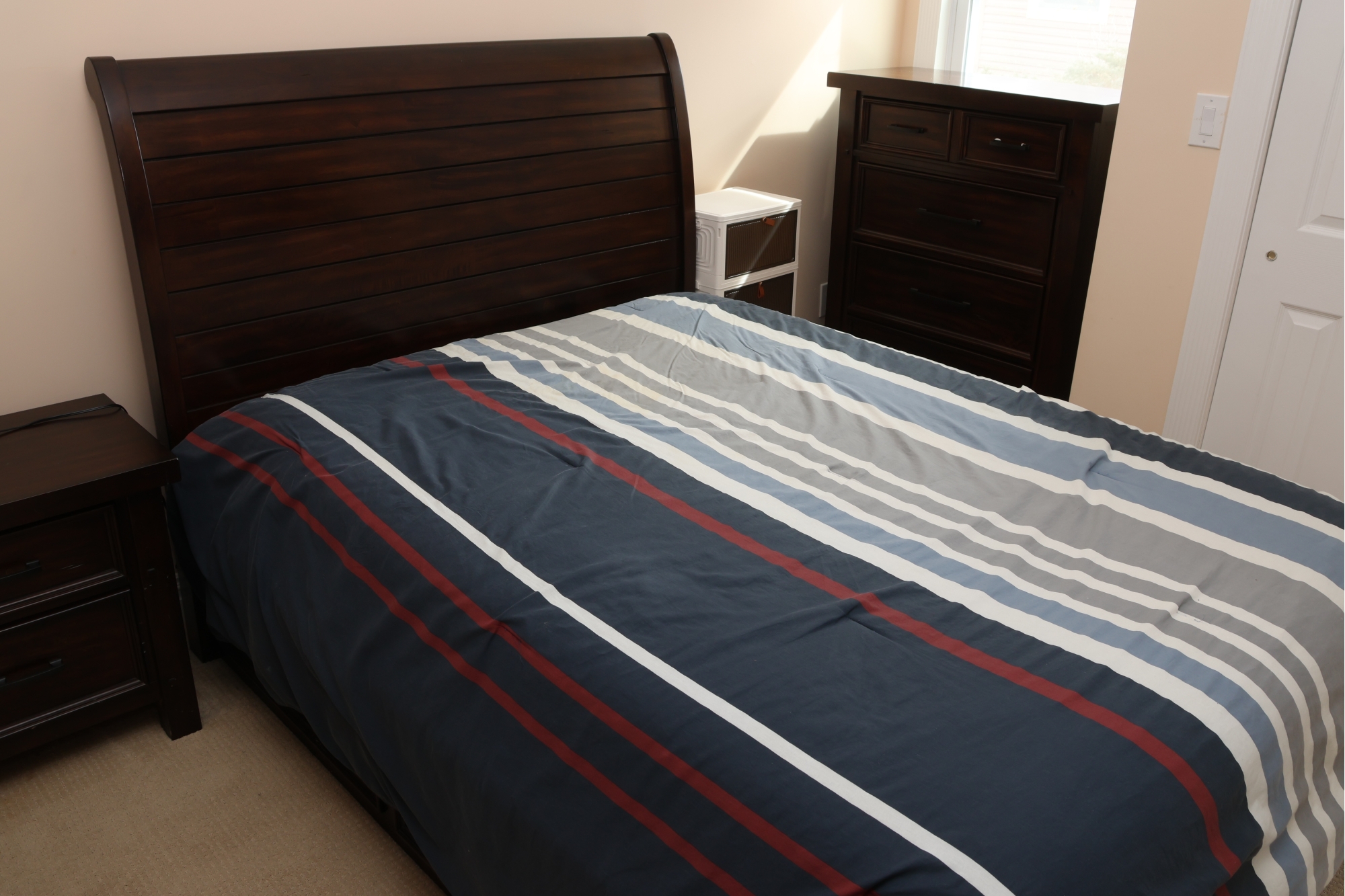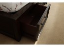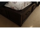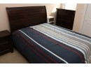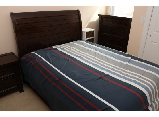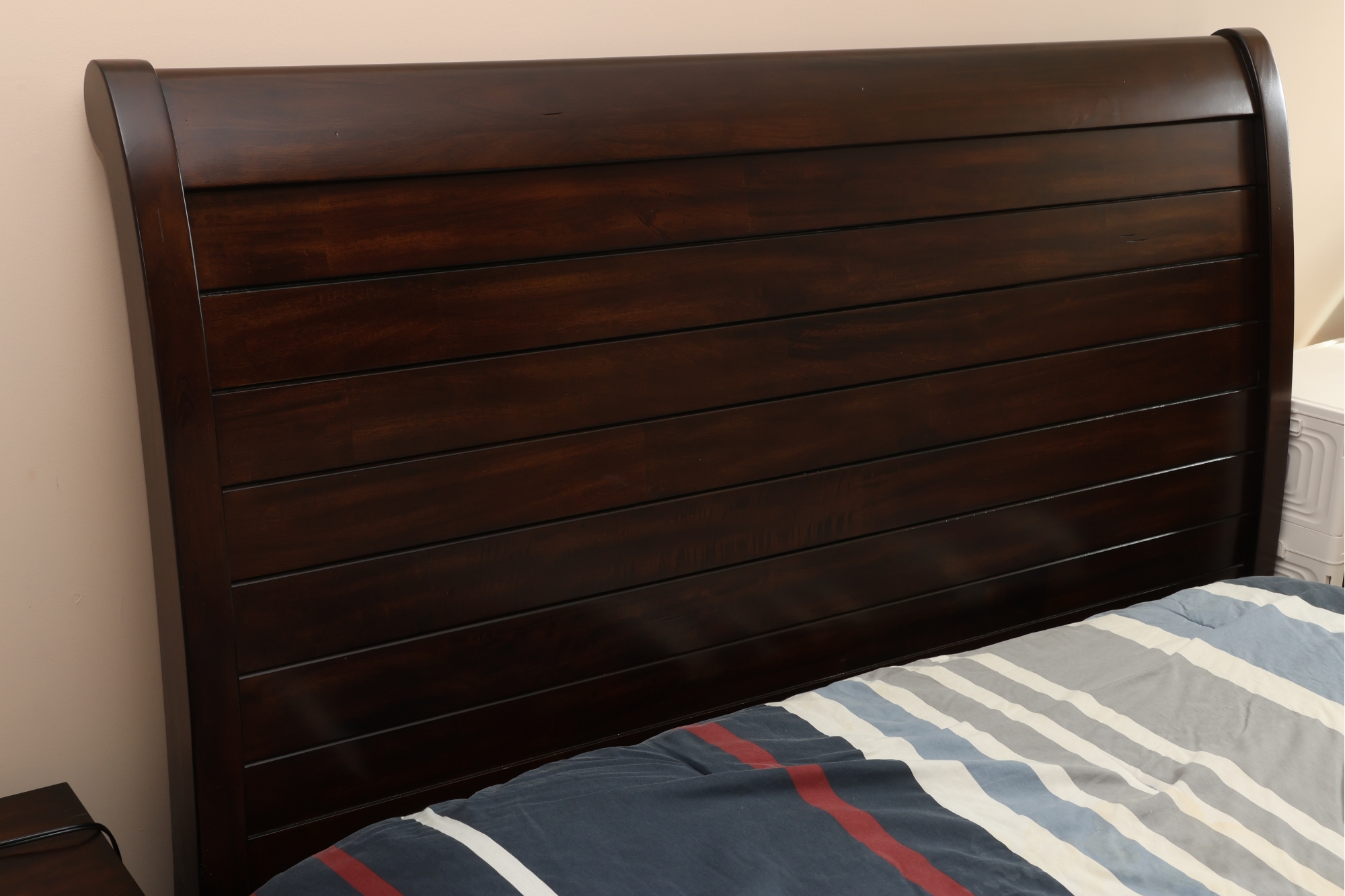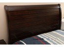This queen-sized bed frame is crafted from dark-stained wood, featuring a gracefully curved, sleigh-style headboard with horizontal slatted detailing. The bed measures approximately 84 inches long by 60 inches wide, with the headboard standing 51 inches tall.