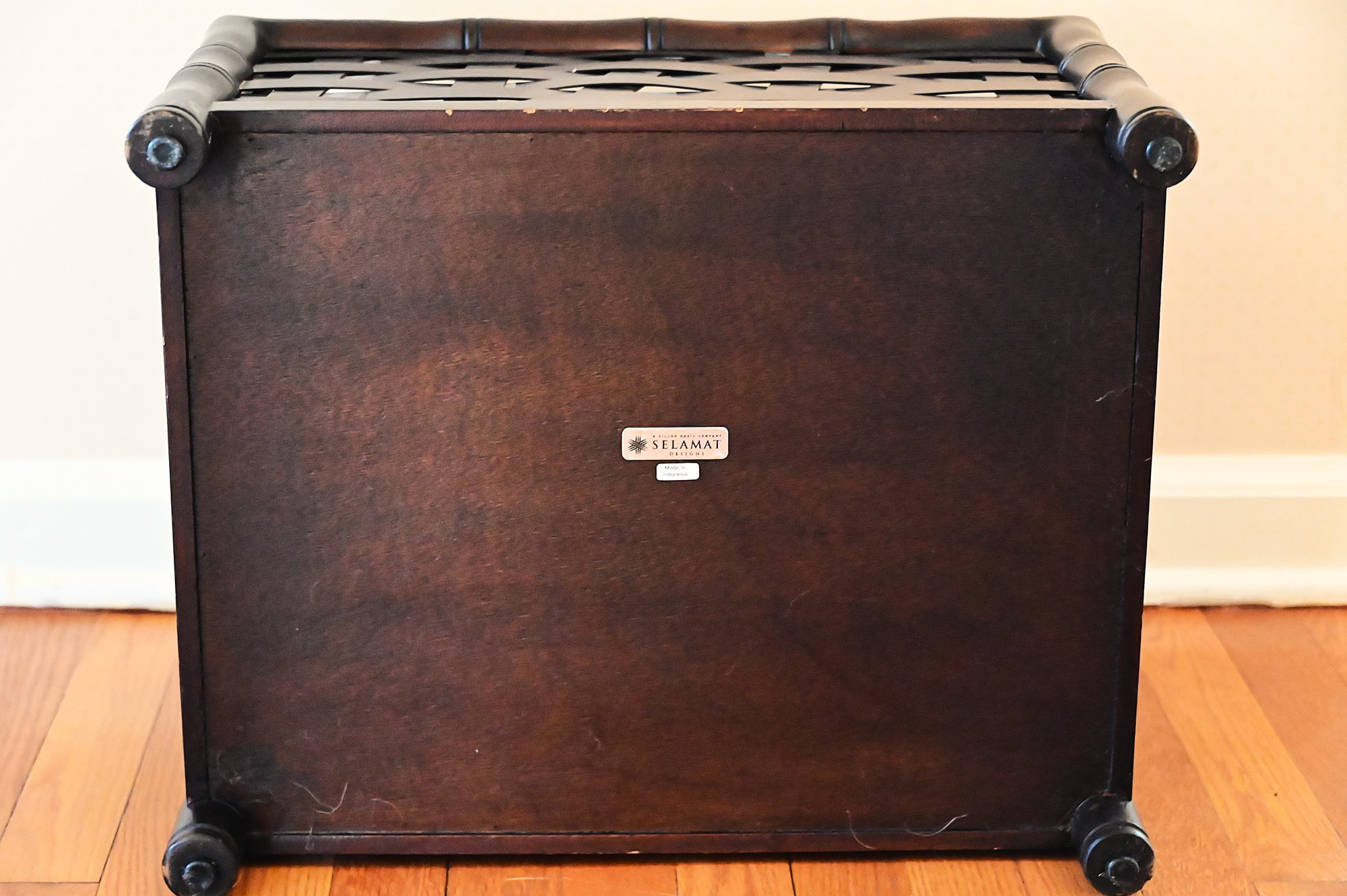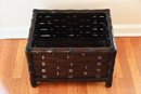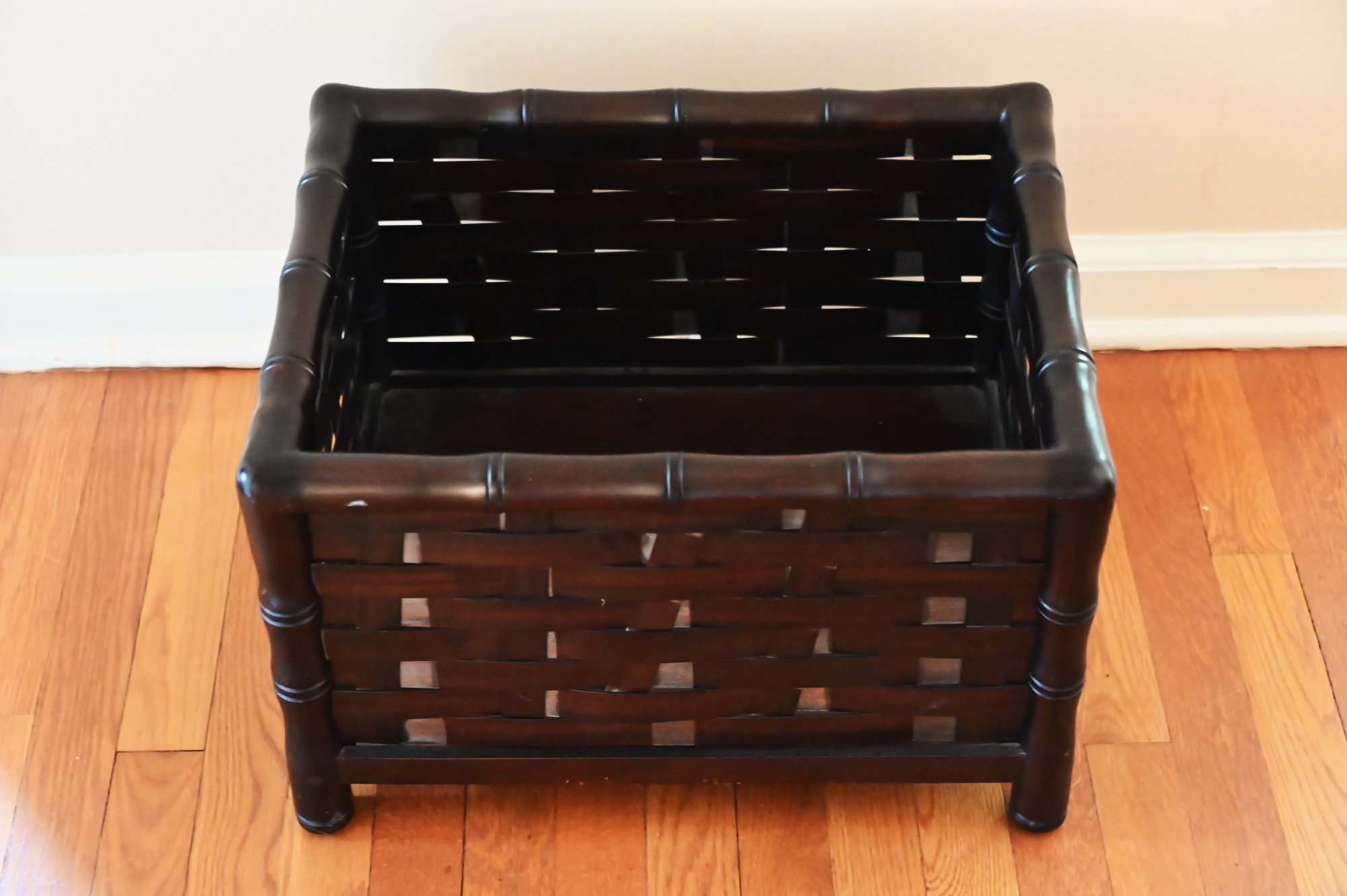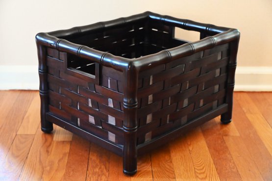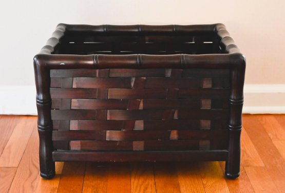 This is a dark wooden woven storage basket with an elegant and structured design. The frame is crafted to resemble bamboo, with smooth, rounded edges and joint-like details at the corners, giving it an organic yet refined appearance. The sides feature an interwoven wood pattern, adding depth and texture while allowing for airflow and visibility.