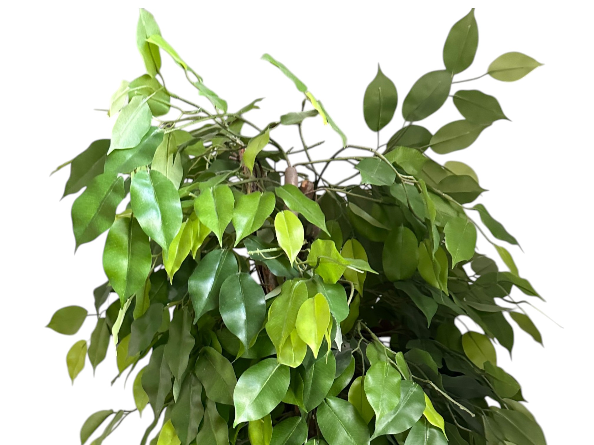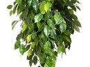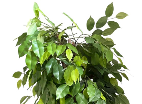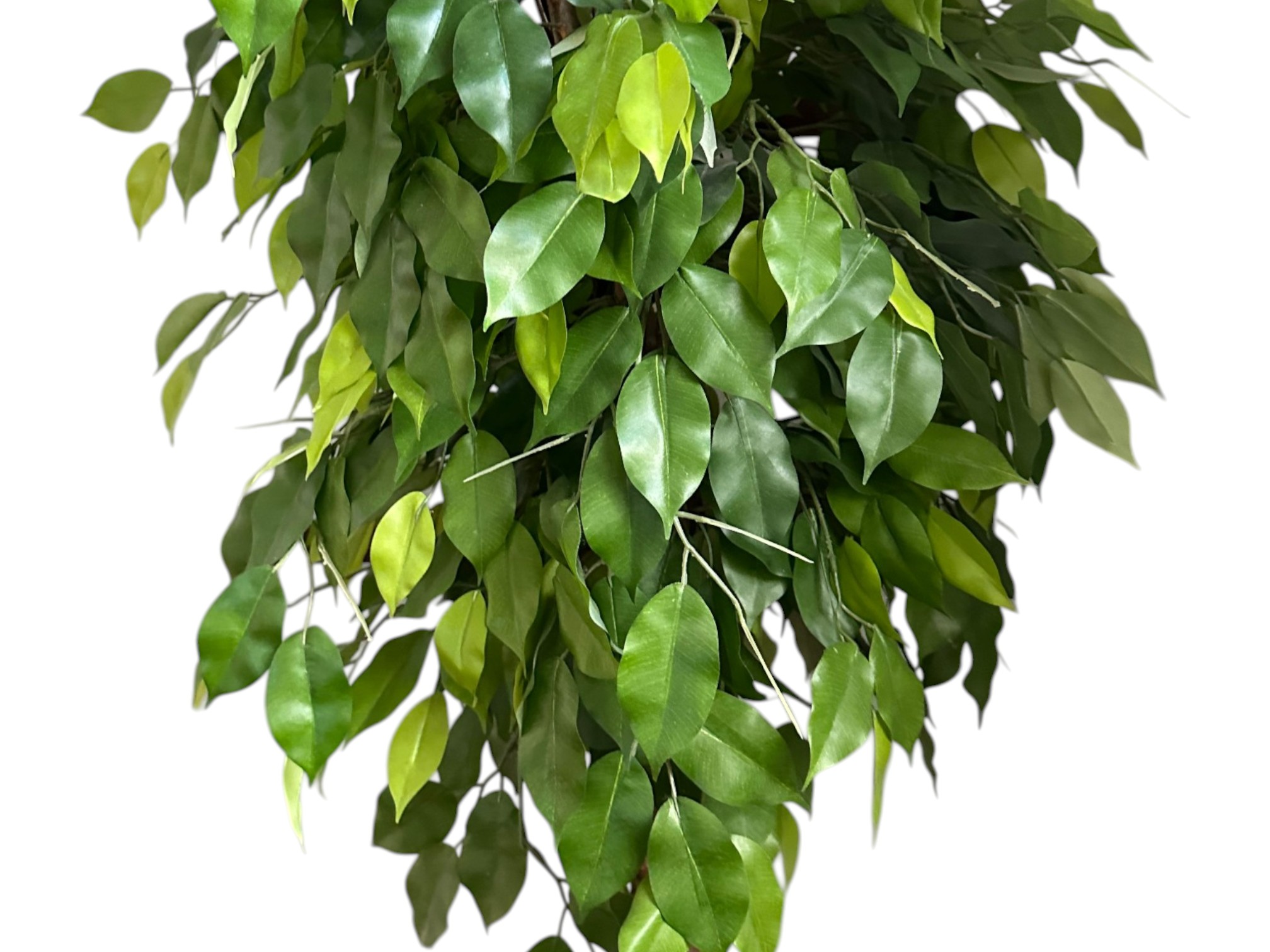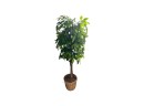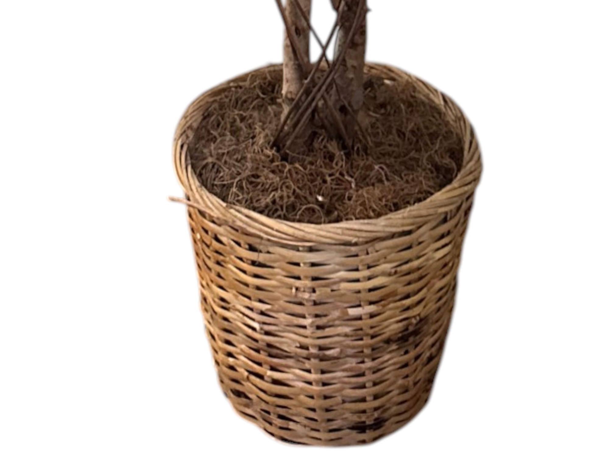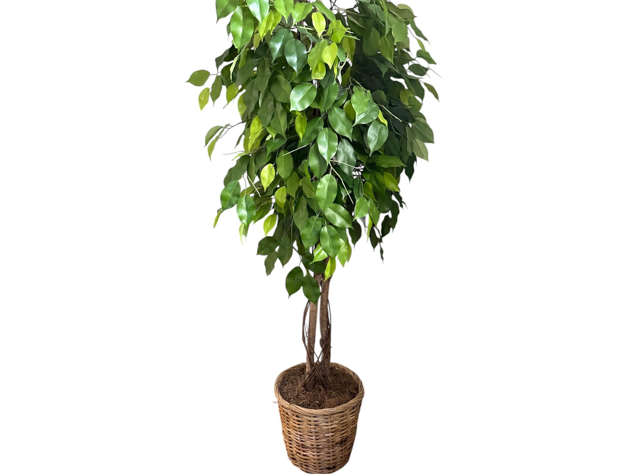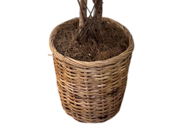 Artificial ficus tree, featuring a natural wood trunk and a woven rattan basket.