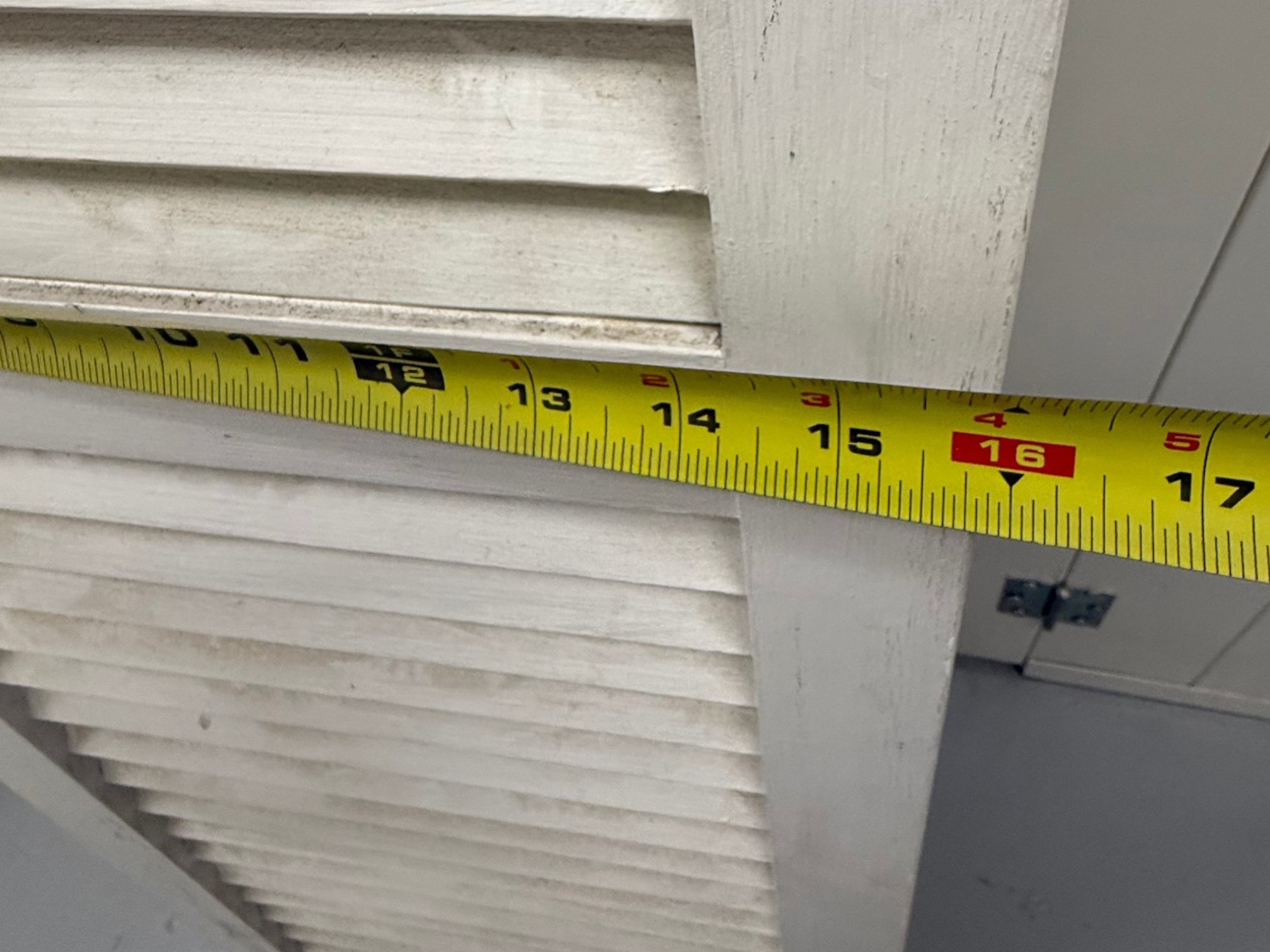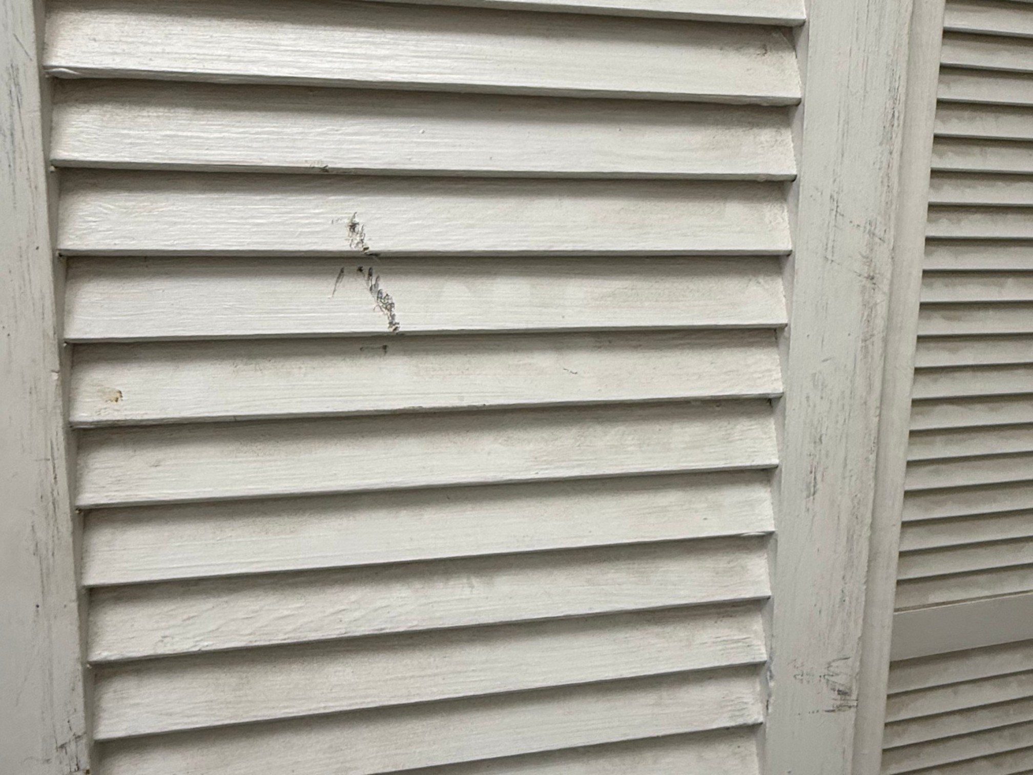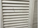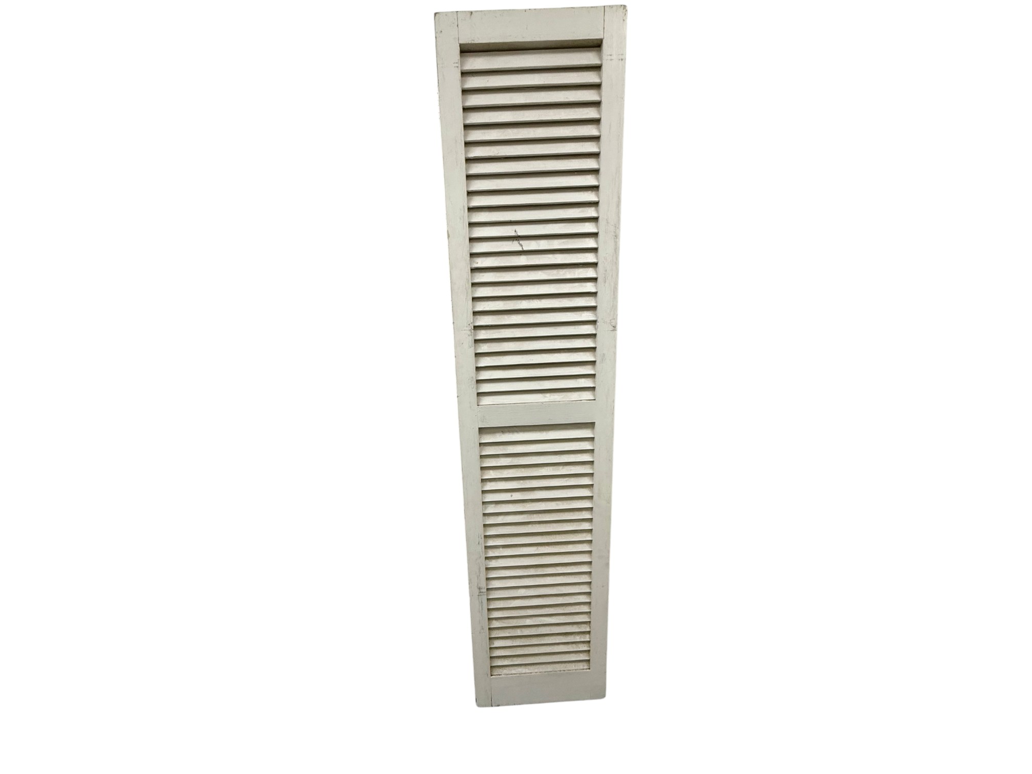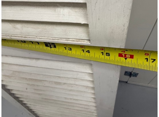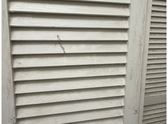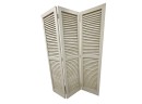 Rustic farmhouse style three-panel foldable wooden shutter screen or room divider, featuring a classic louvered shutter design with fixed slats that allow light filtering and metal hinges for flexible folding and easy storage. May require dusting.