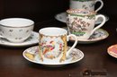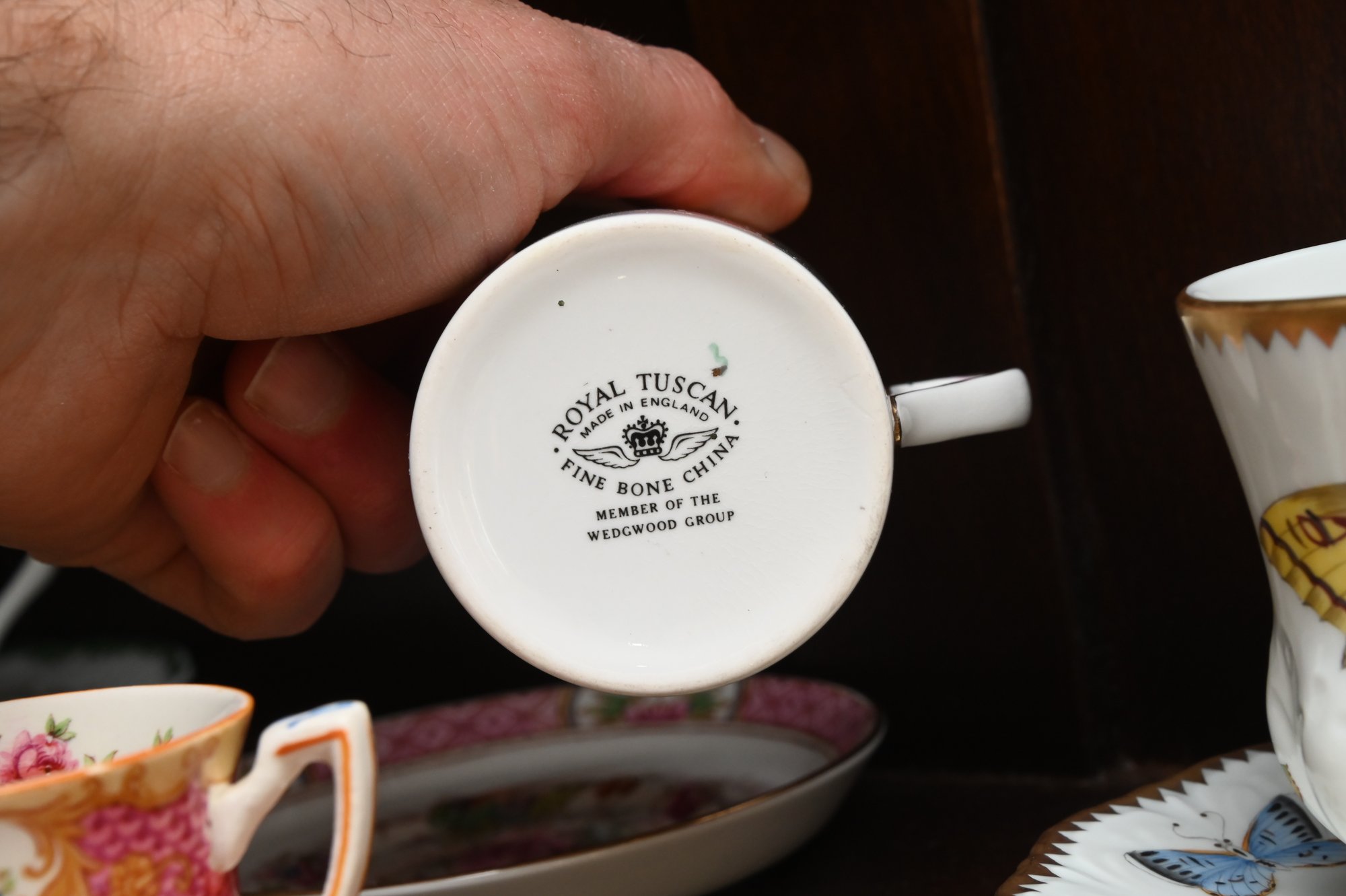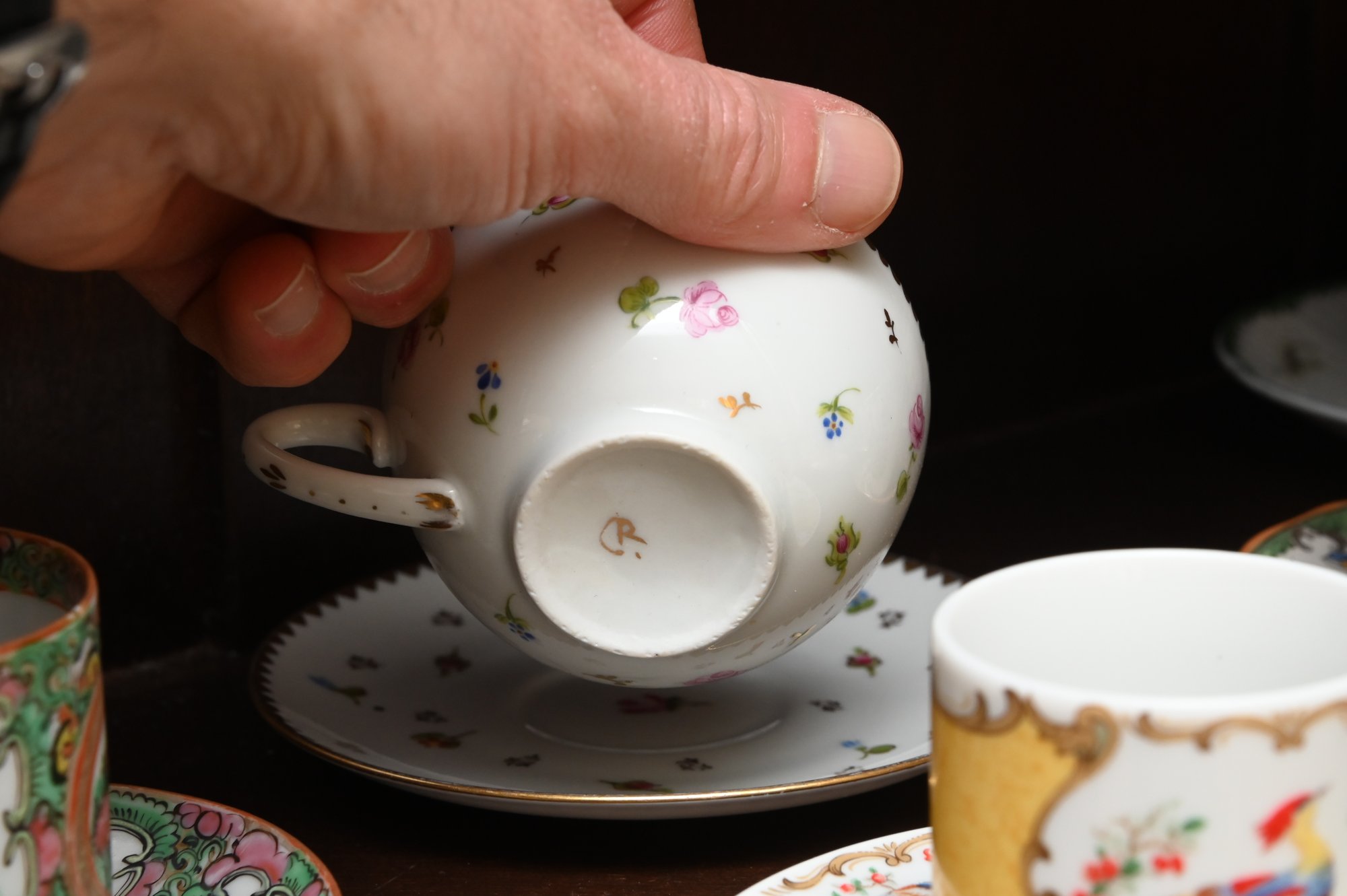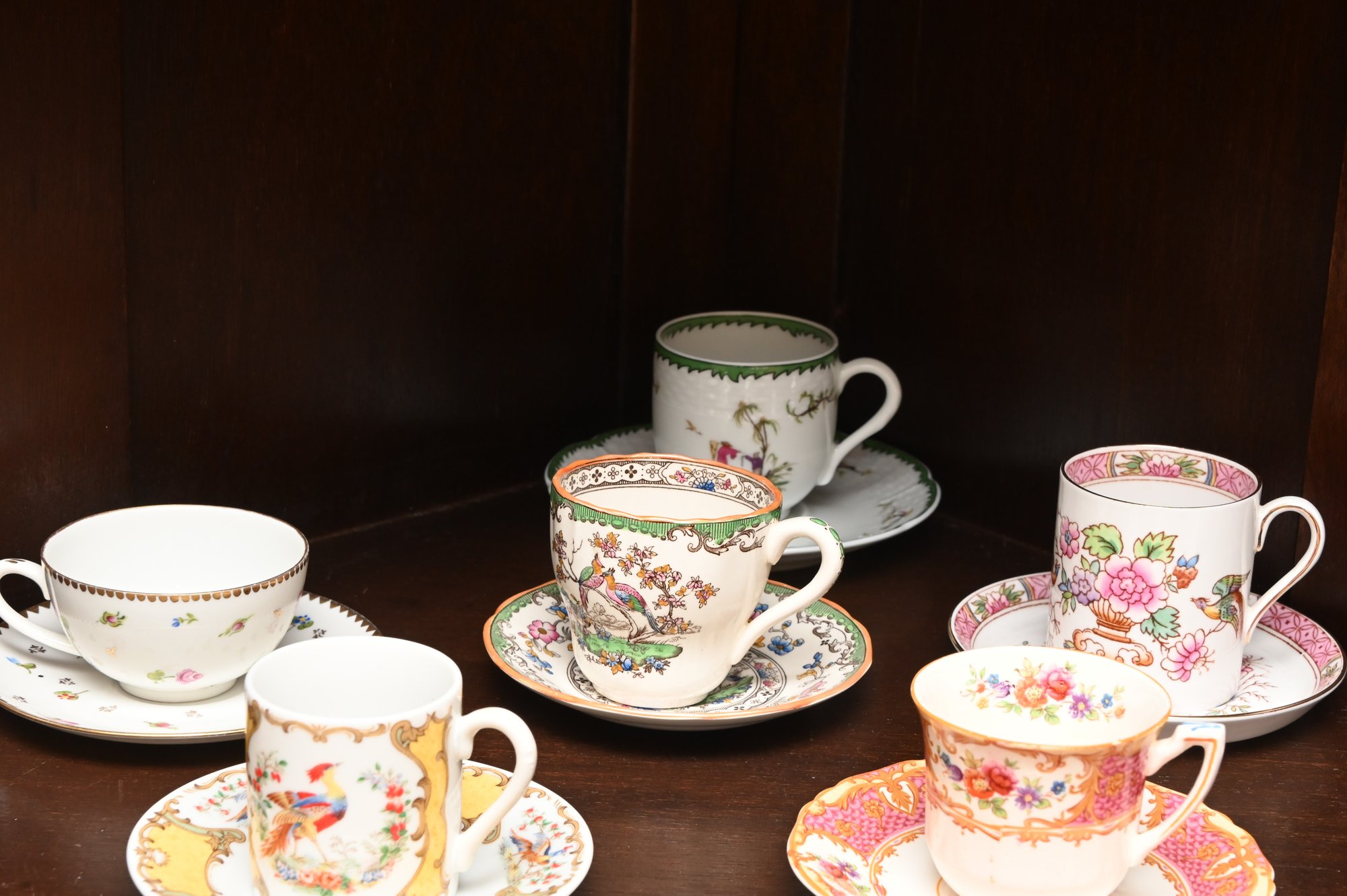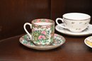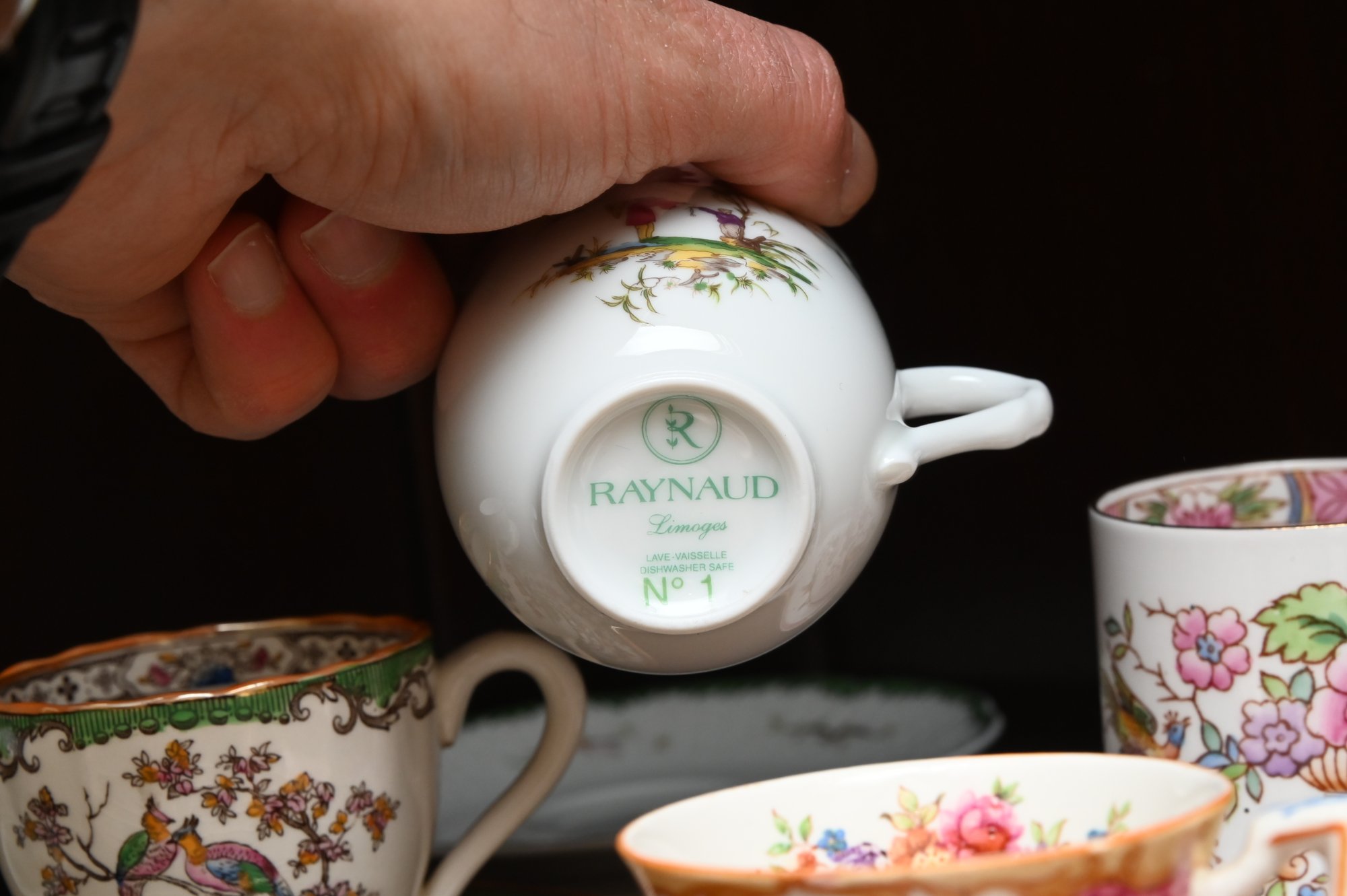 The assortment includes finely crafted porcelain cups with intricate hand-painted floral motifs, delicate gold accents, and elegant scalloped edges. Some of the pieces appear to be of European origin, possibly from renowned makers such as Spode and Limoges, while others feature classic Asian-inspired blue-and-white porcelain patterns, reminiscent of traditional Chinese export ware.