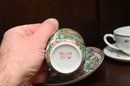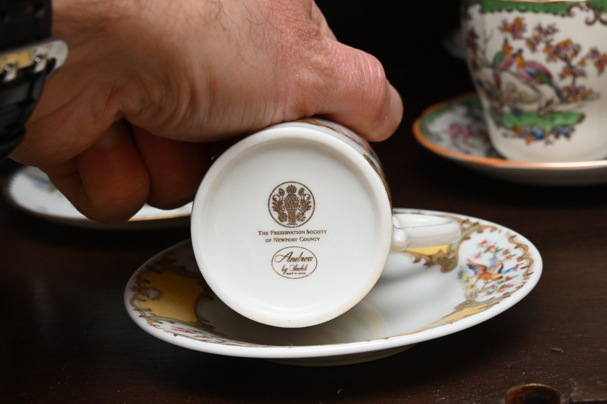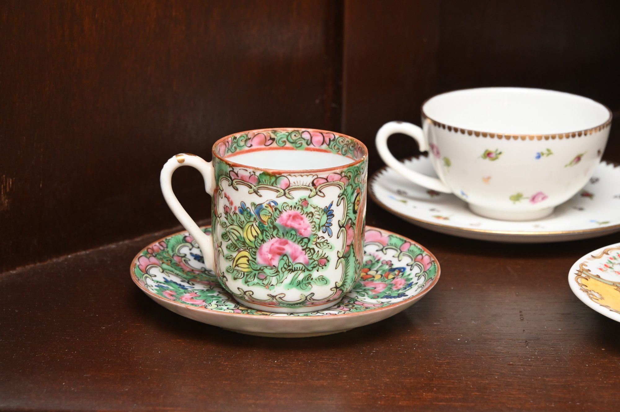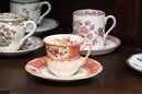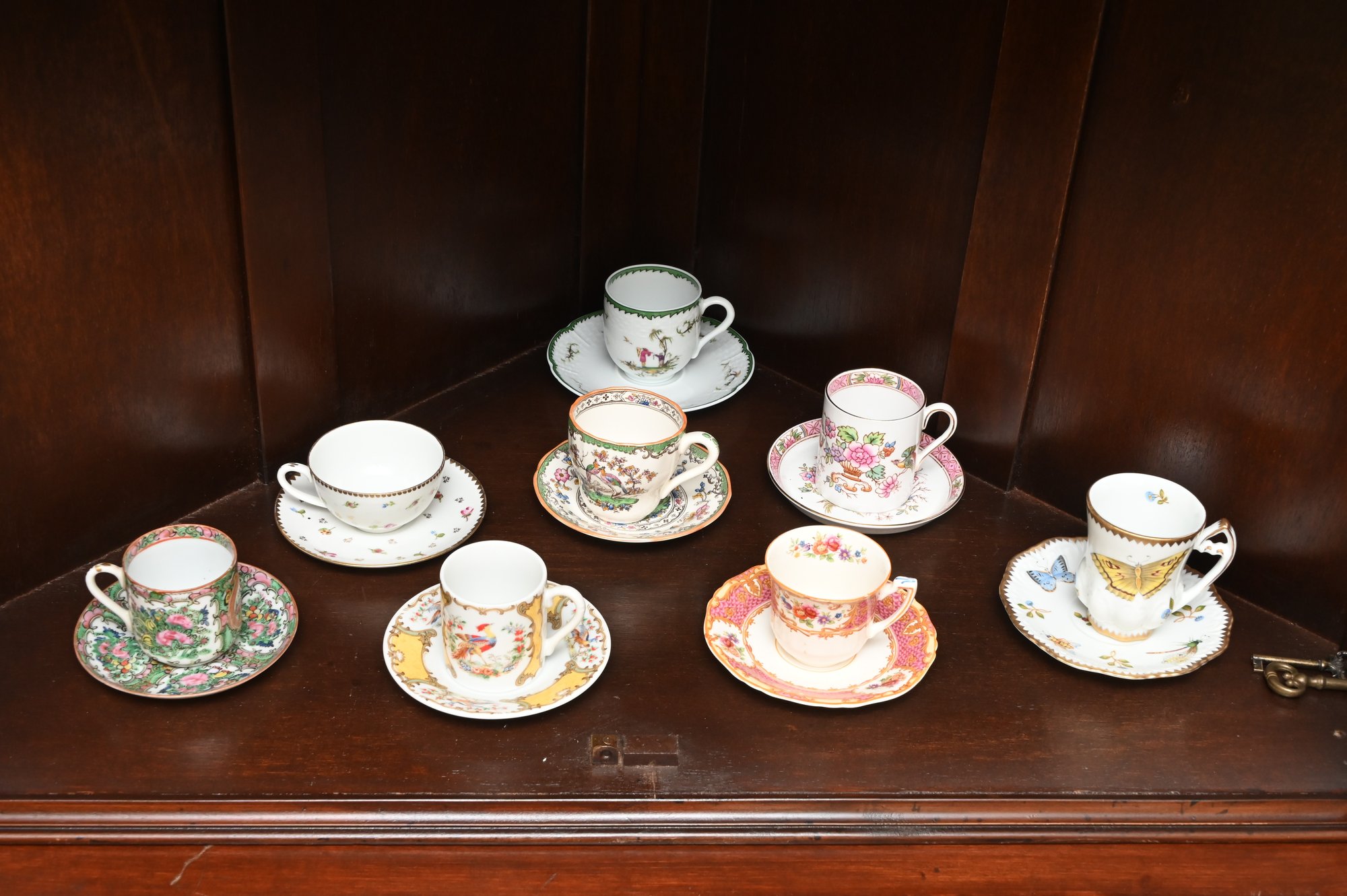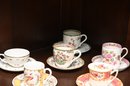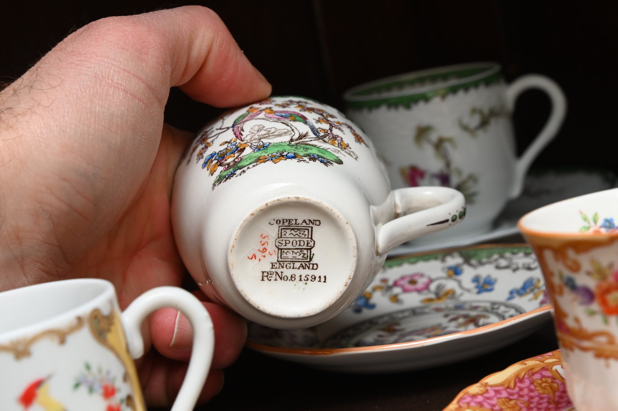 The assortment includes finely crafted porcelain cups with intricate hand-painted floral motifs, delicate gold accents, and elegant scalloped edges. Some of the pieces appear to be of European origin, possibly from renowned makers such as Spode and Limoges, while others feature classic Asian-inspired blue-and-white porcelain patterns, reminiscent of traditional Chinese export ware.
