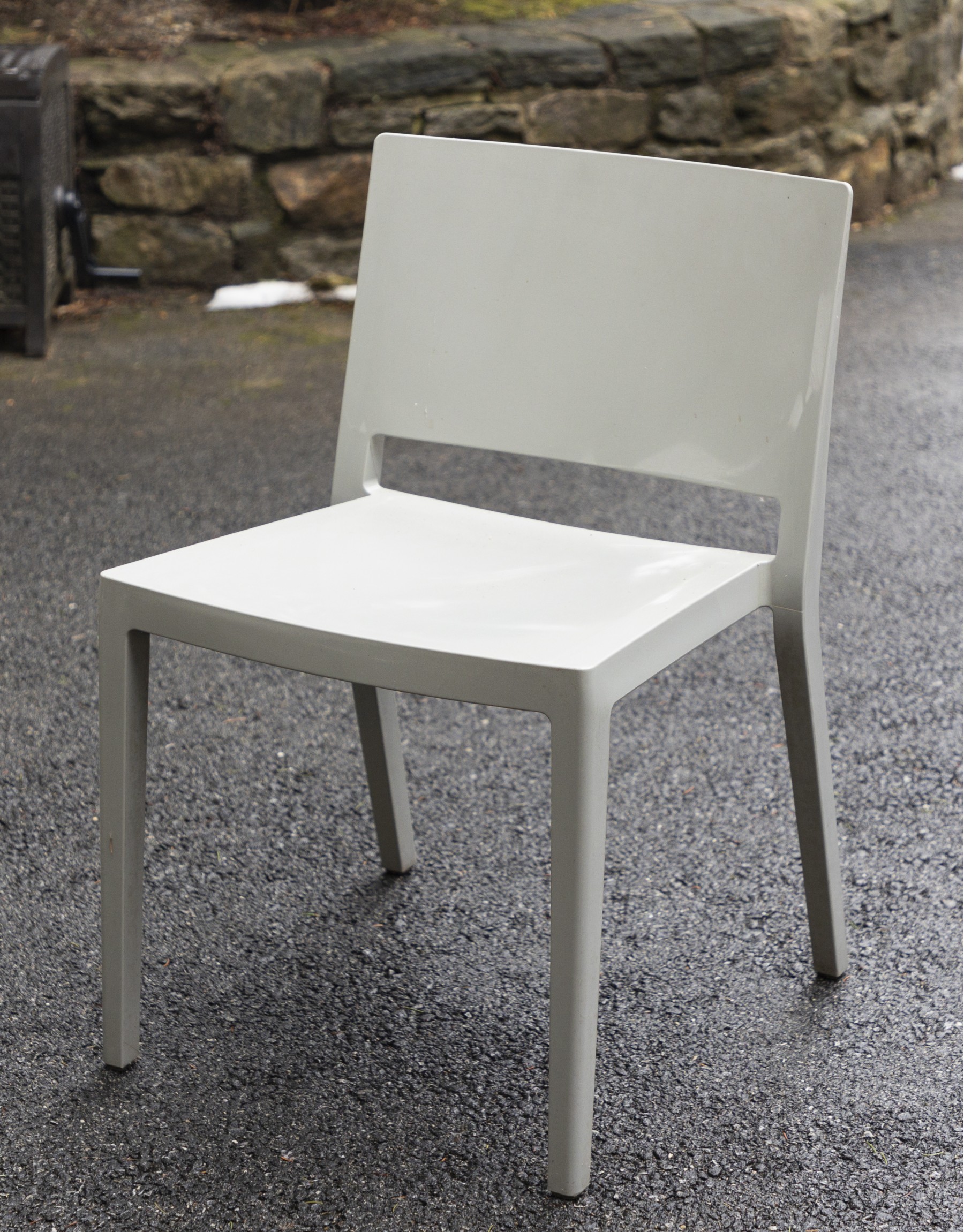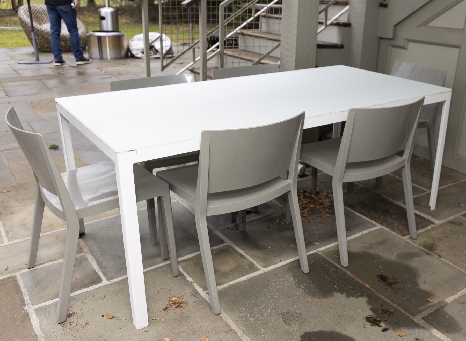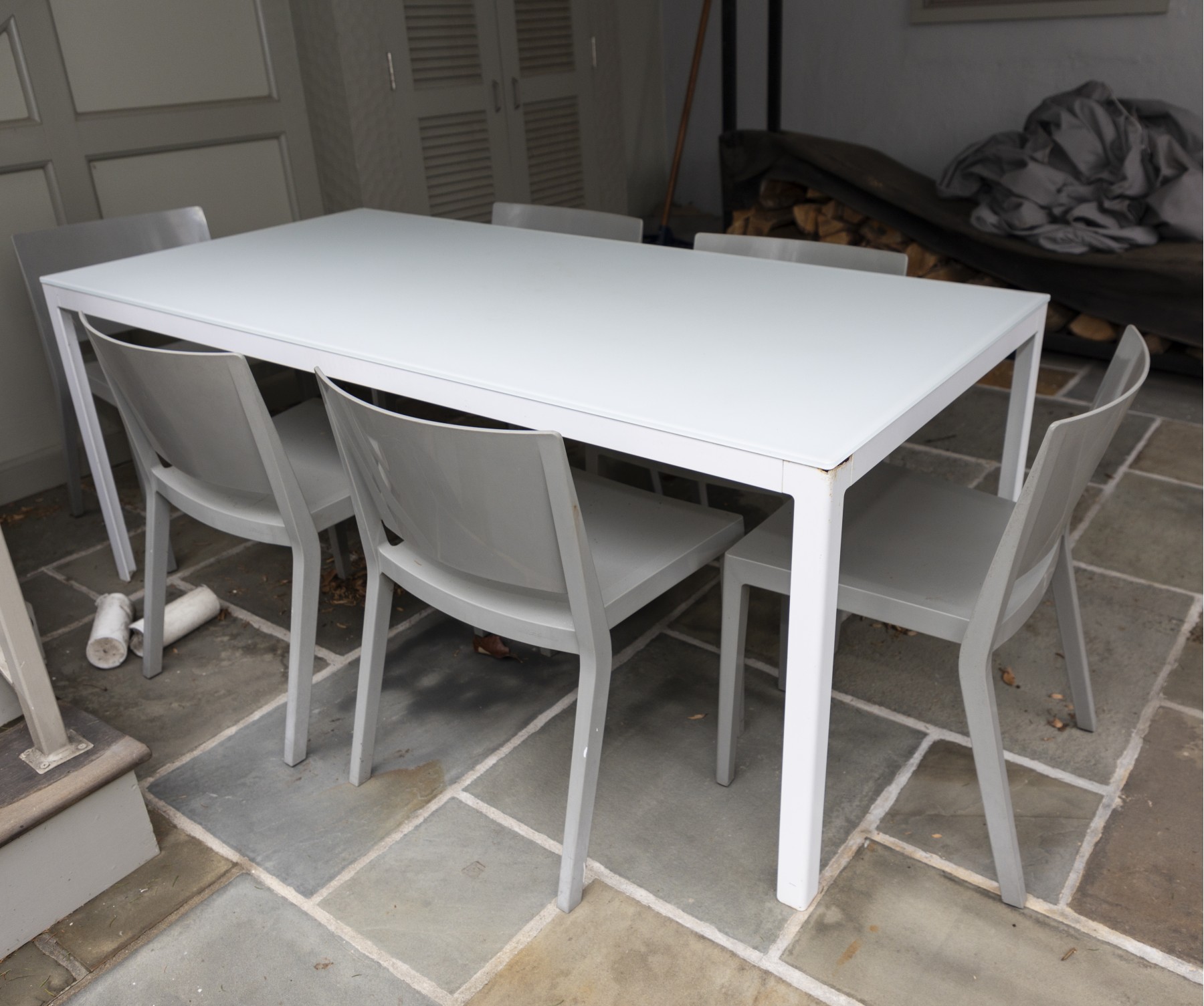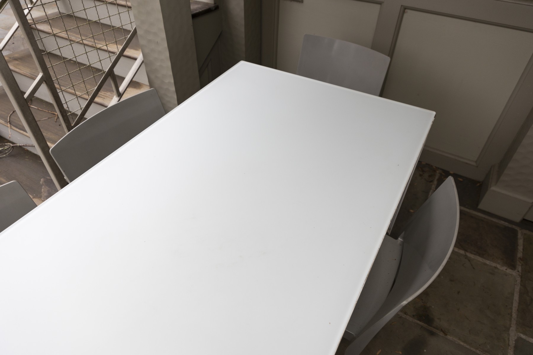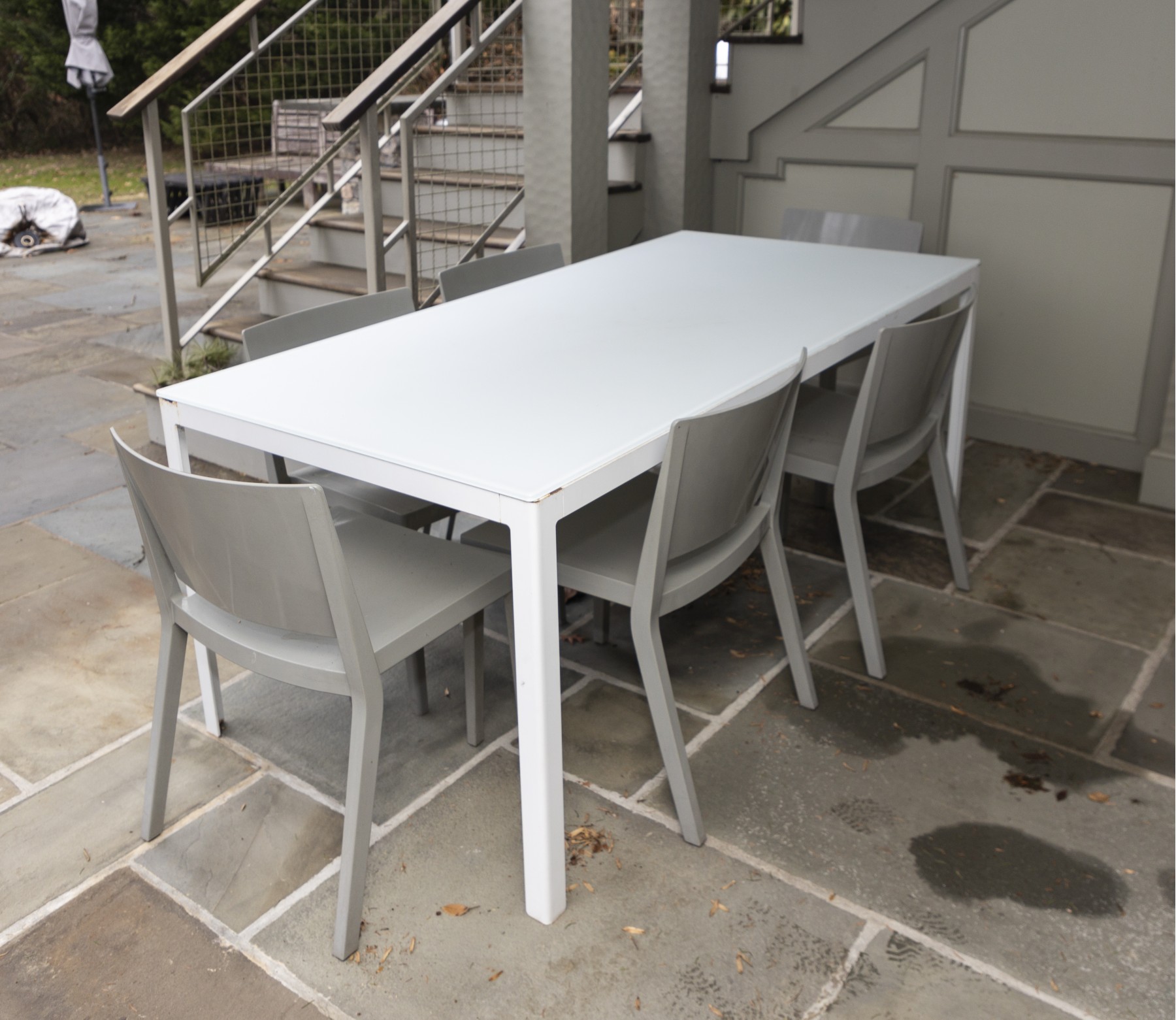 DWR glass top table and 6 Lizzy chairs. Table taken well care of and covered prior to photography