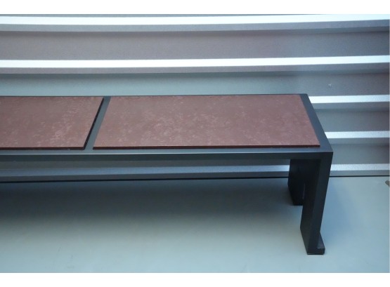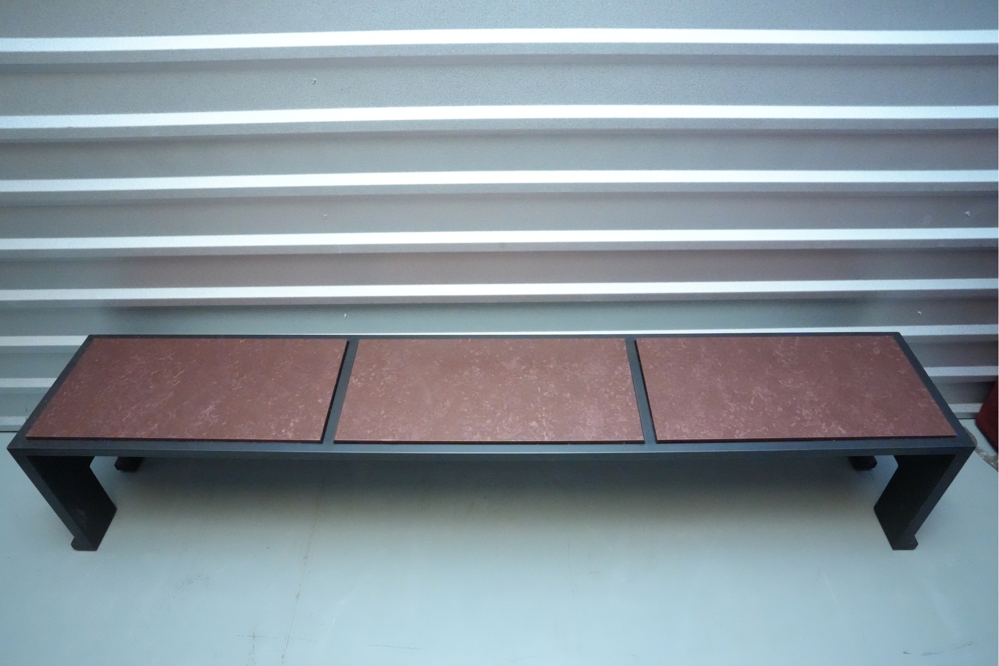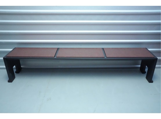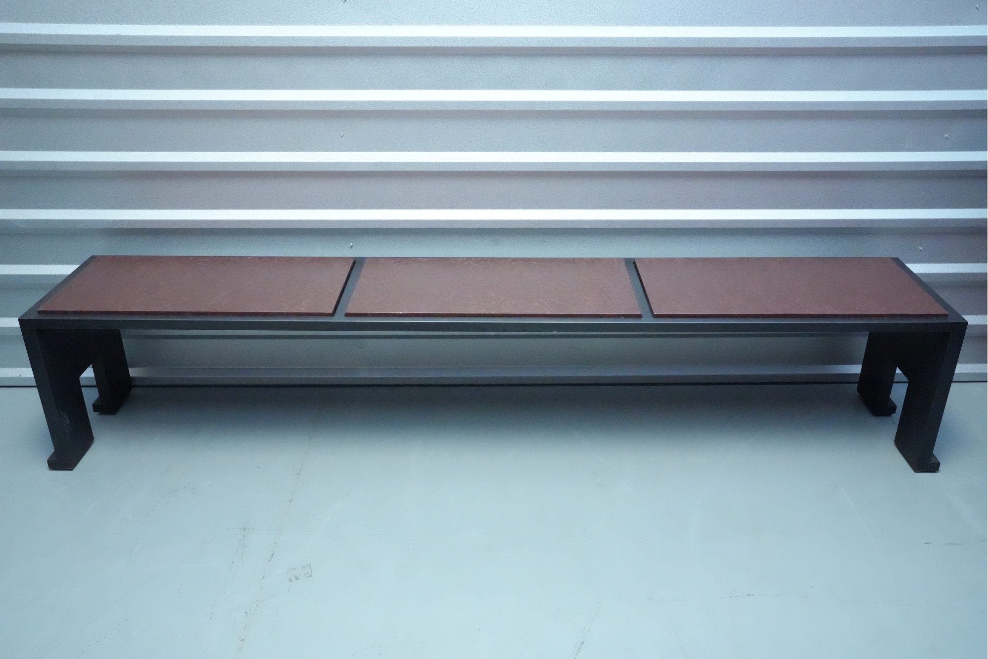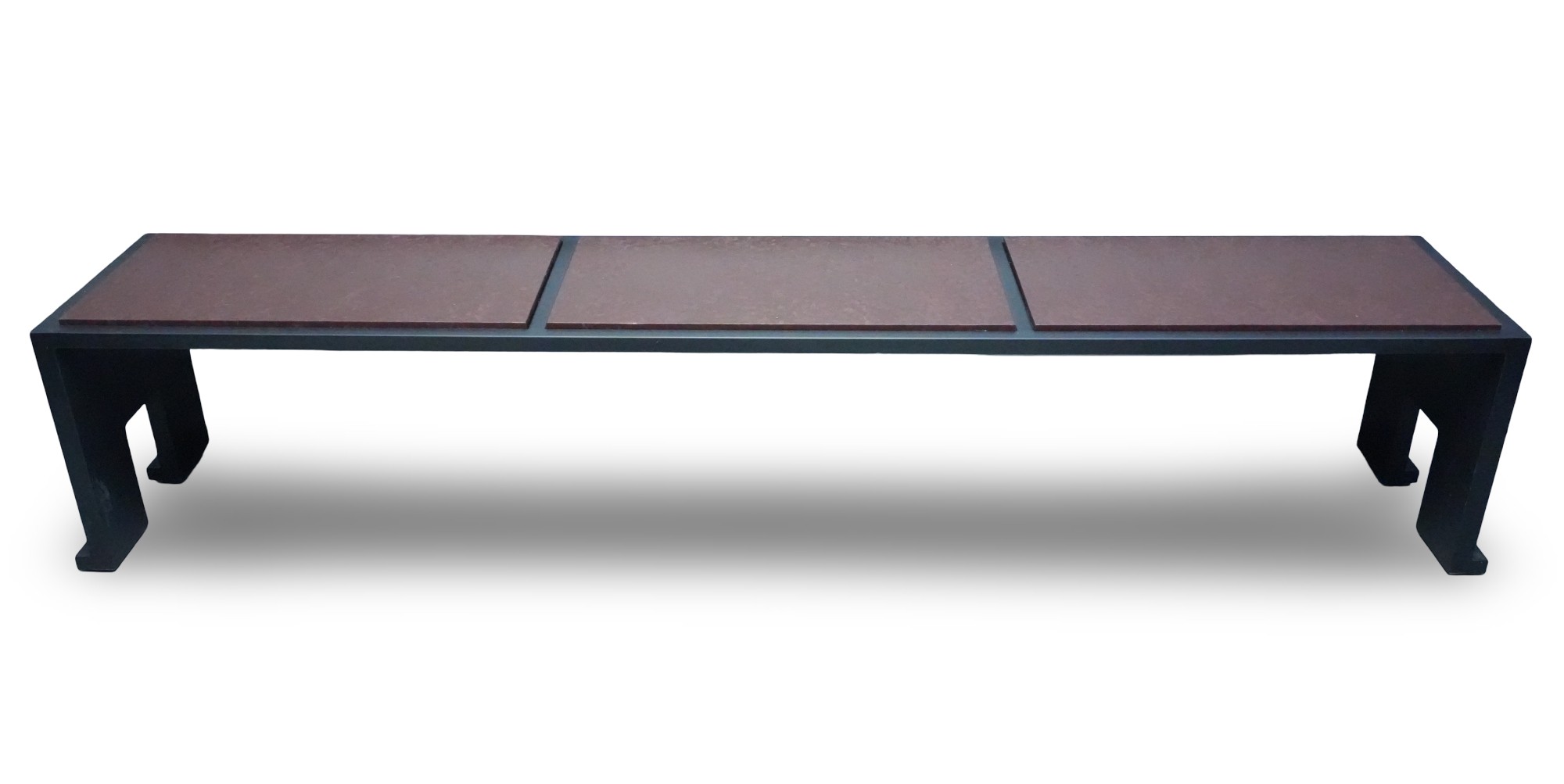 Minimalist-style modern bench featuring a black-painted metal base and three rectangular reddish-brown seat panels.