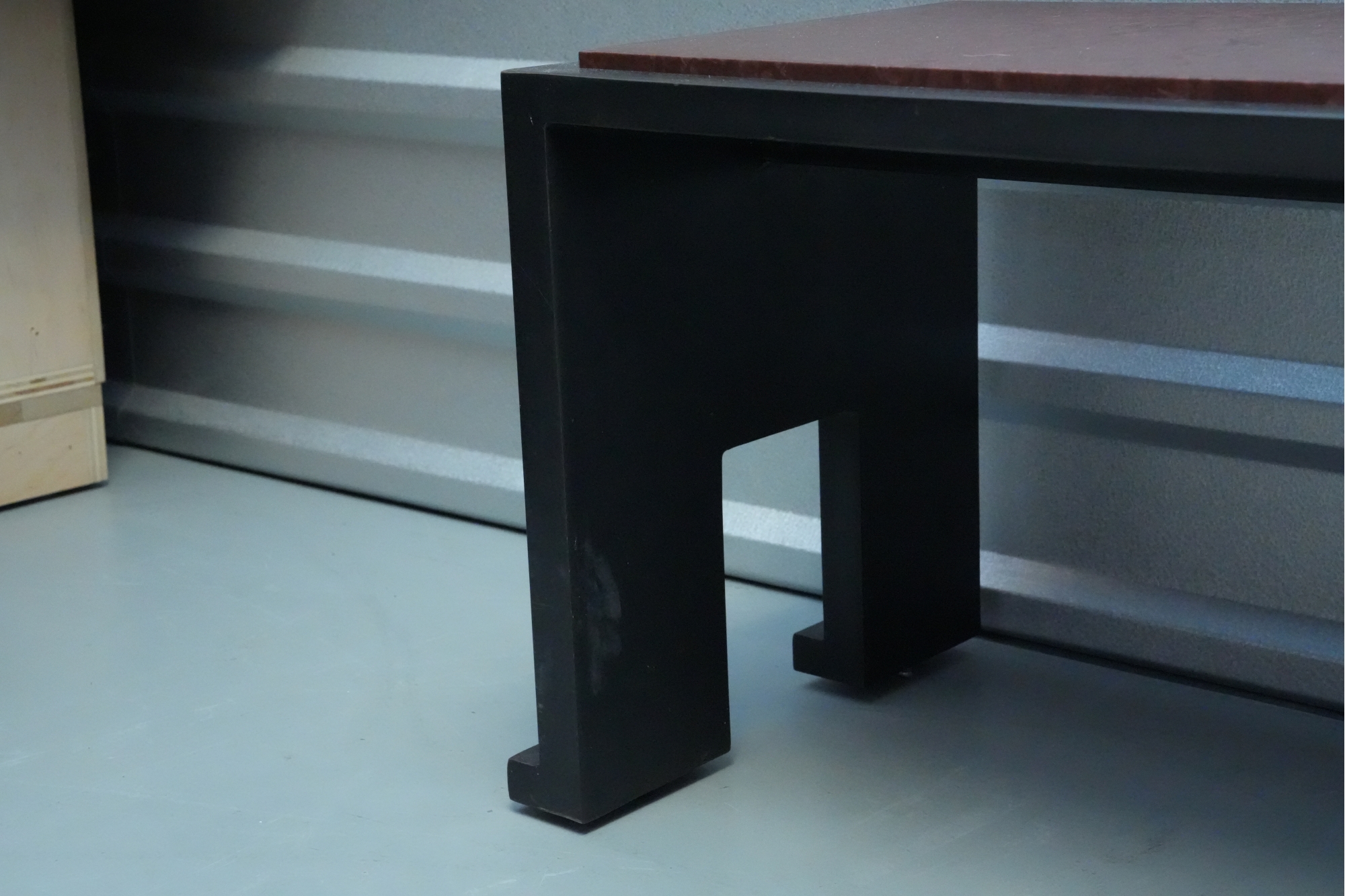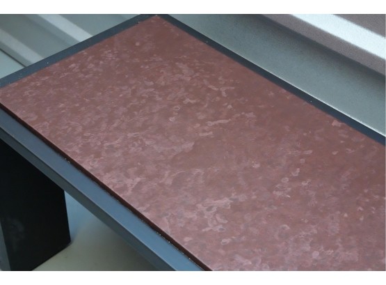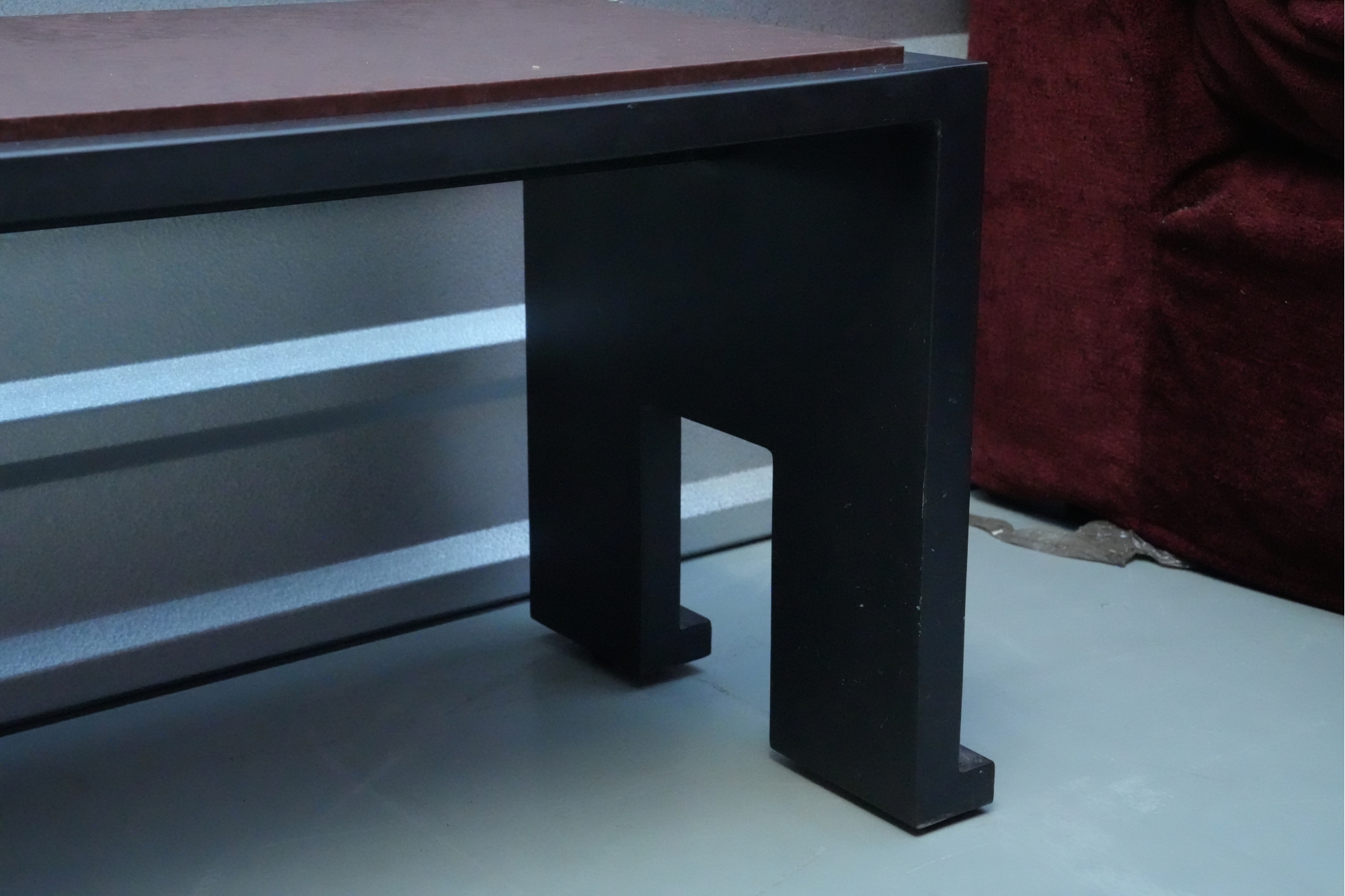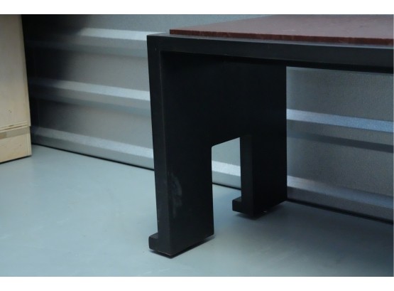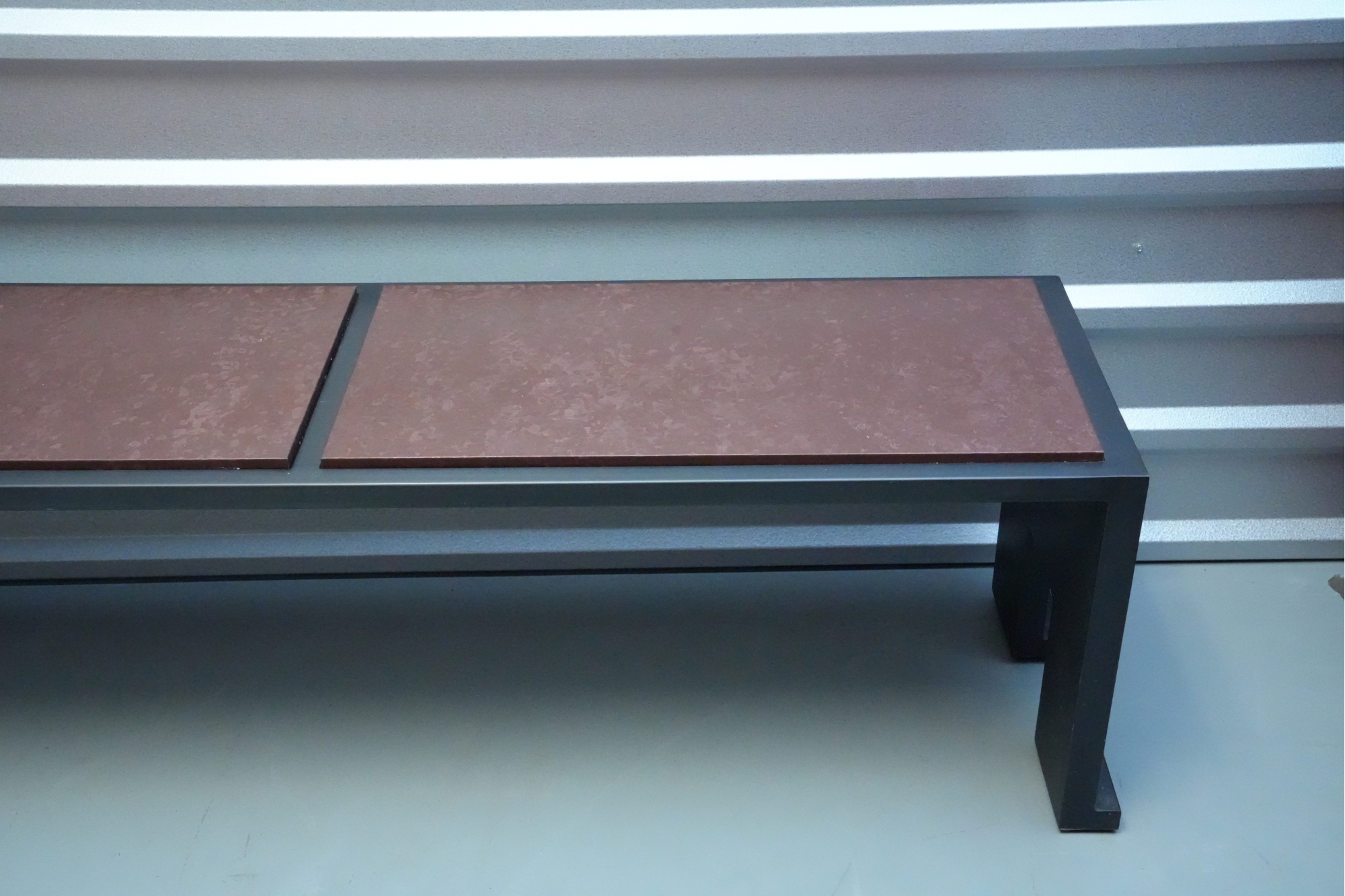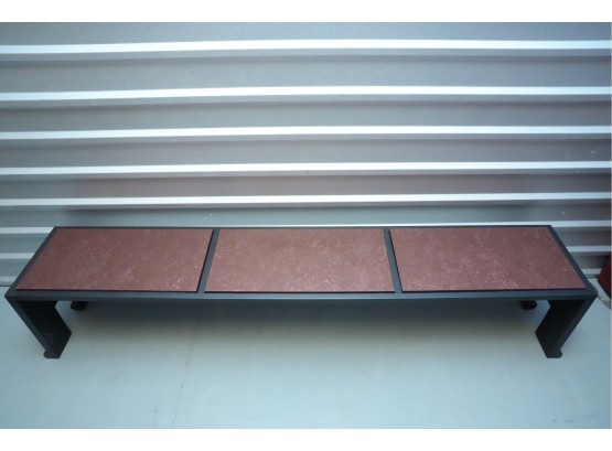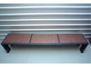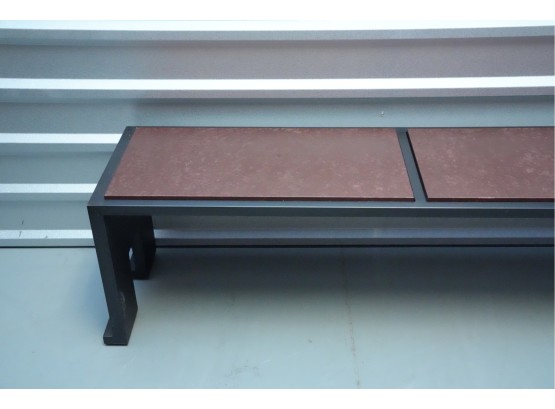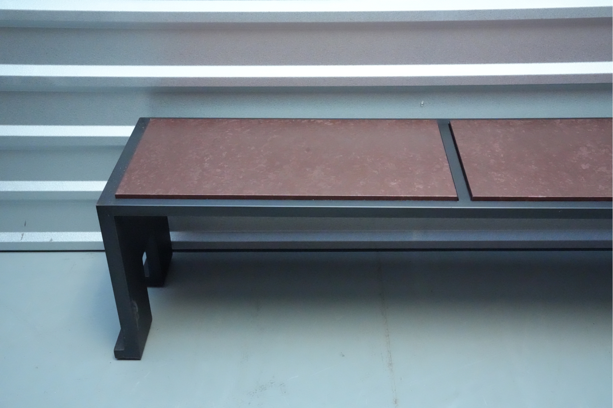 Minimalist-style modern bench featuring a black-painted metal base and three rectangular reddish-brown seat panels.