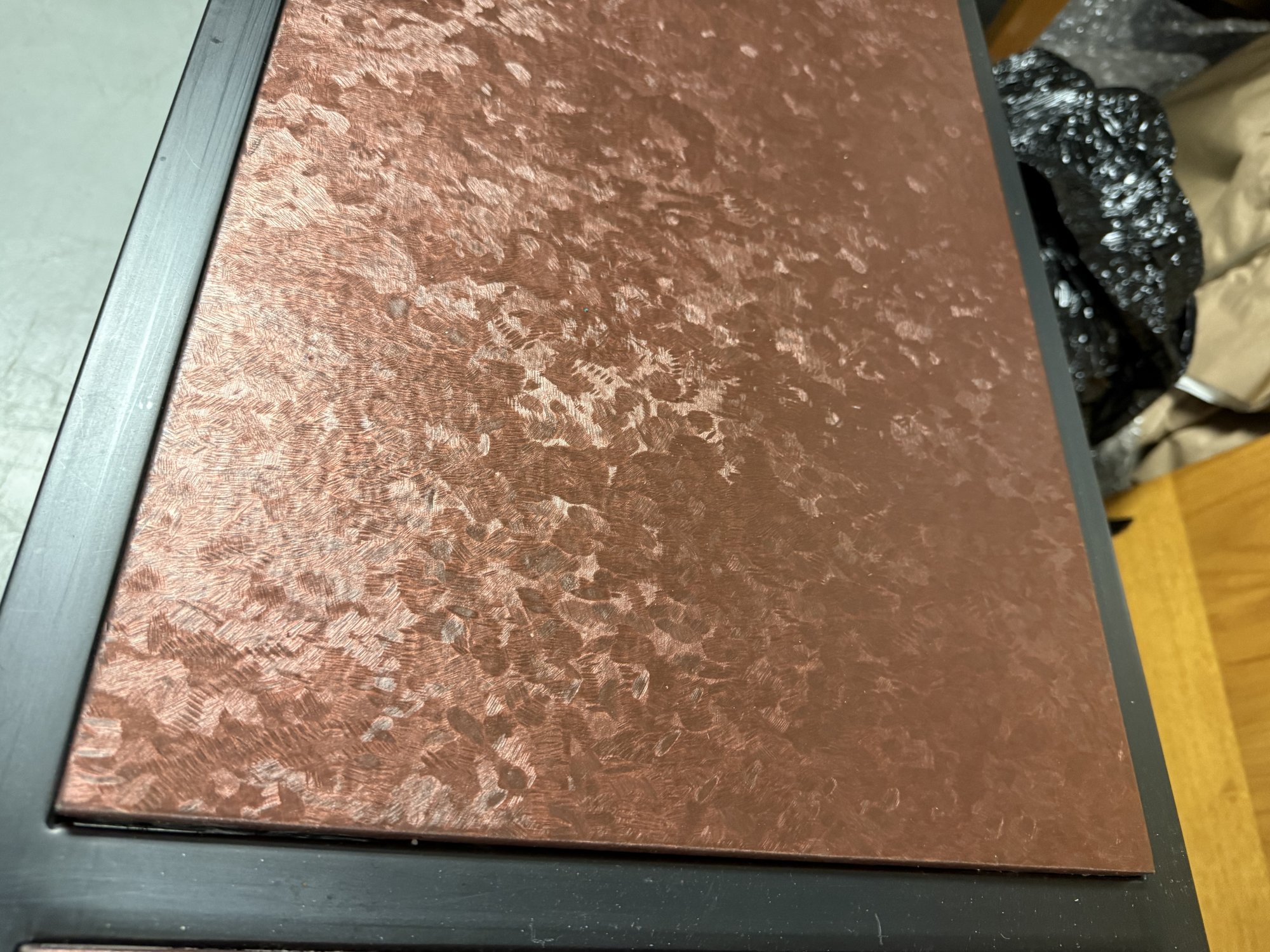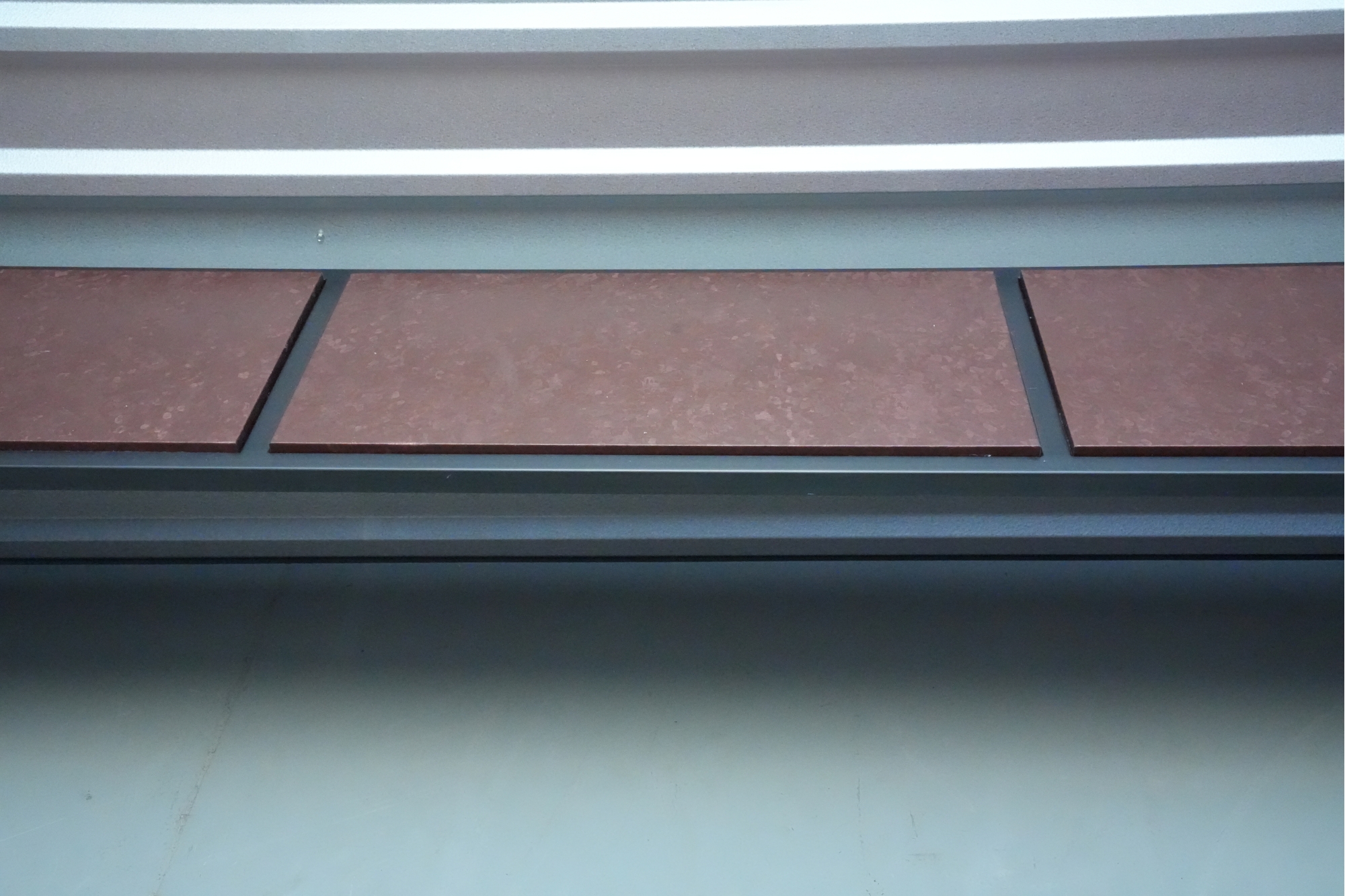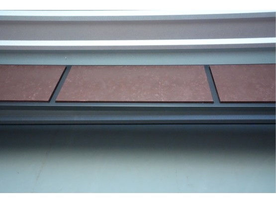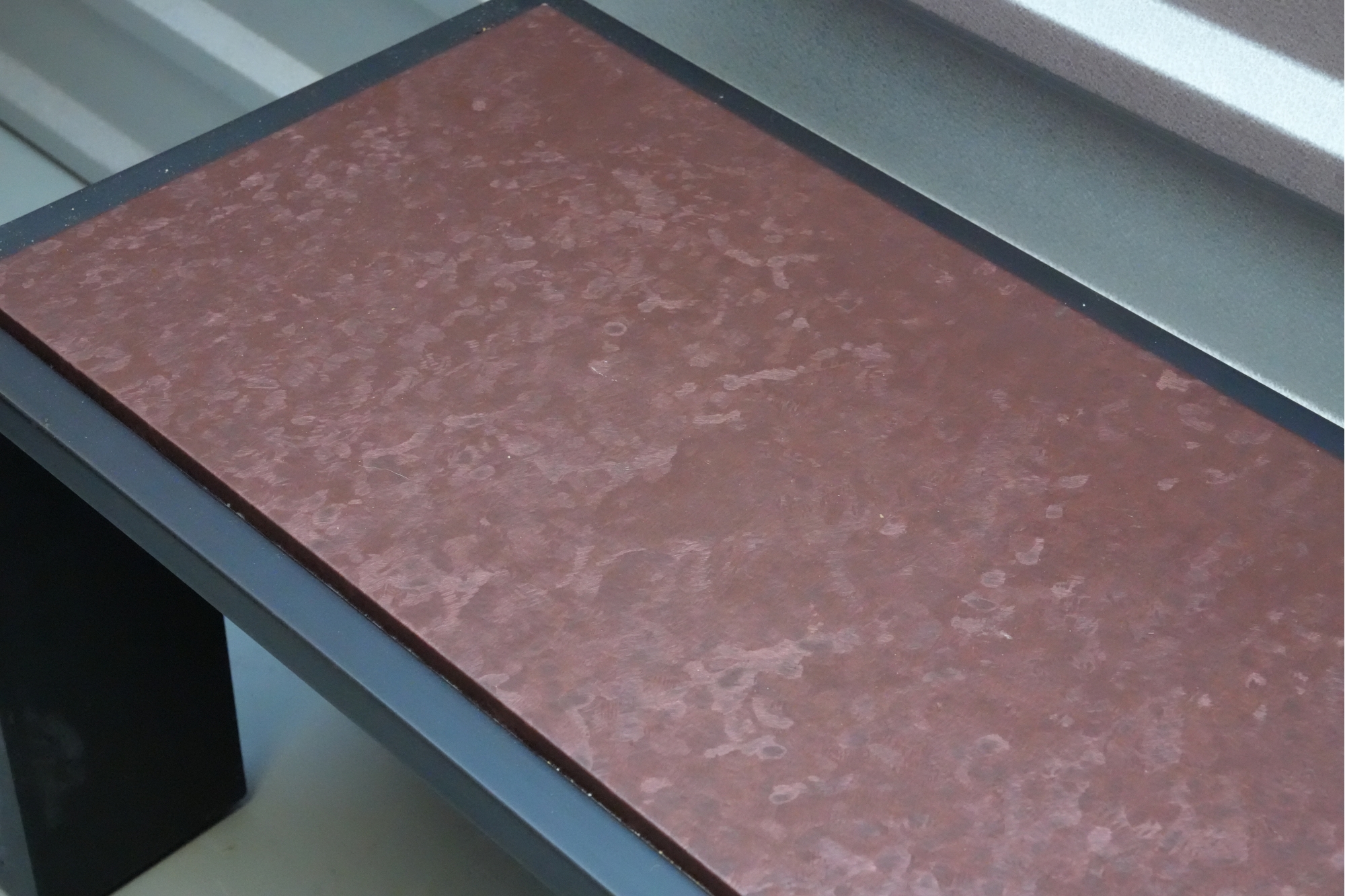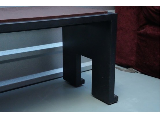Minimalist-style modern bench featuring a black-painted metal base and three rectangular reddish-brown seat panels.