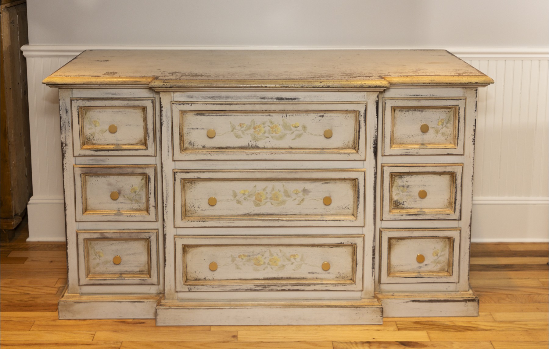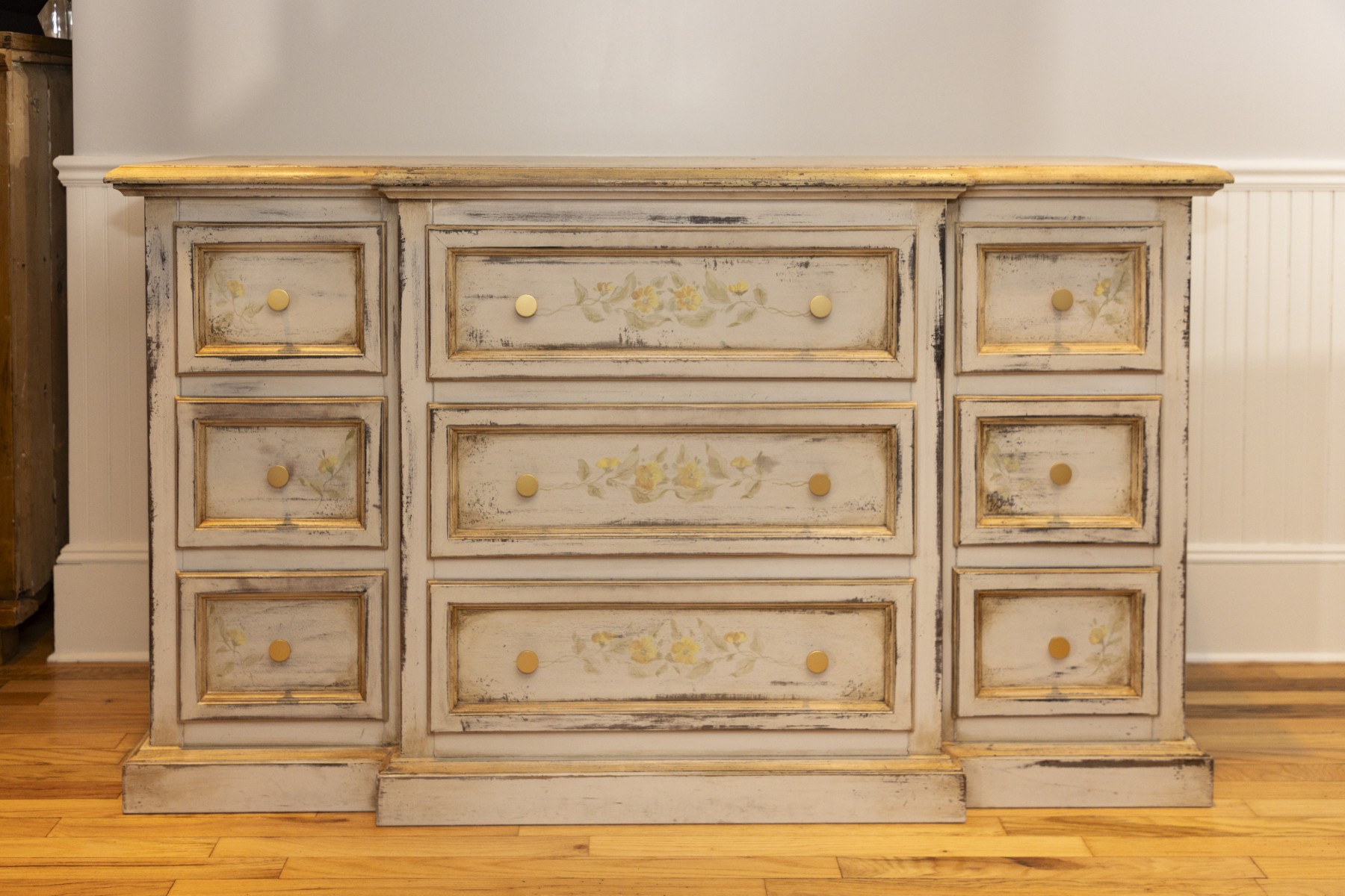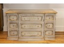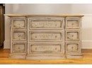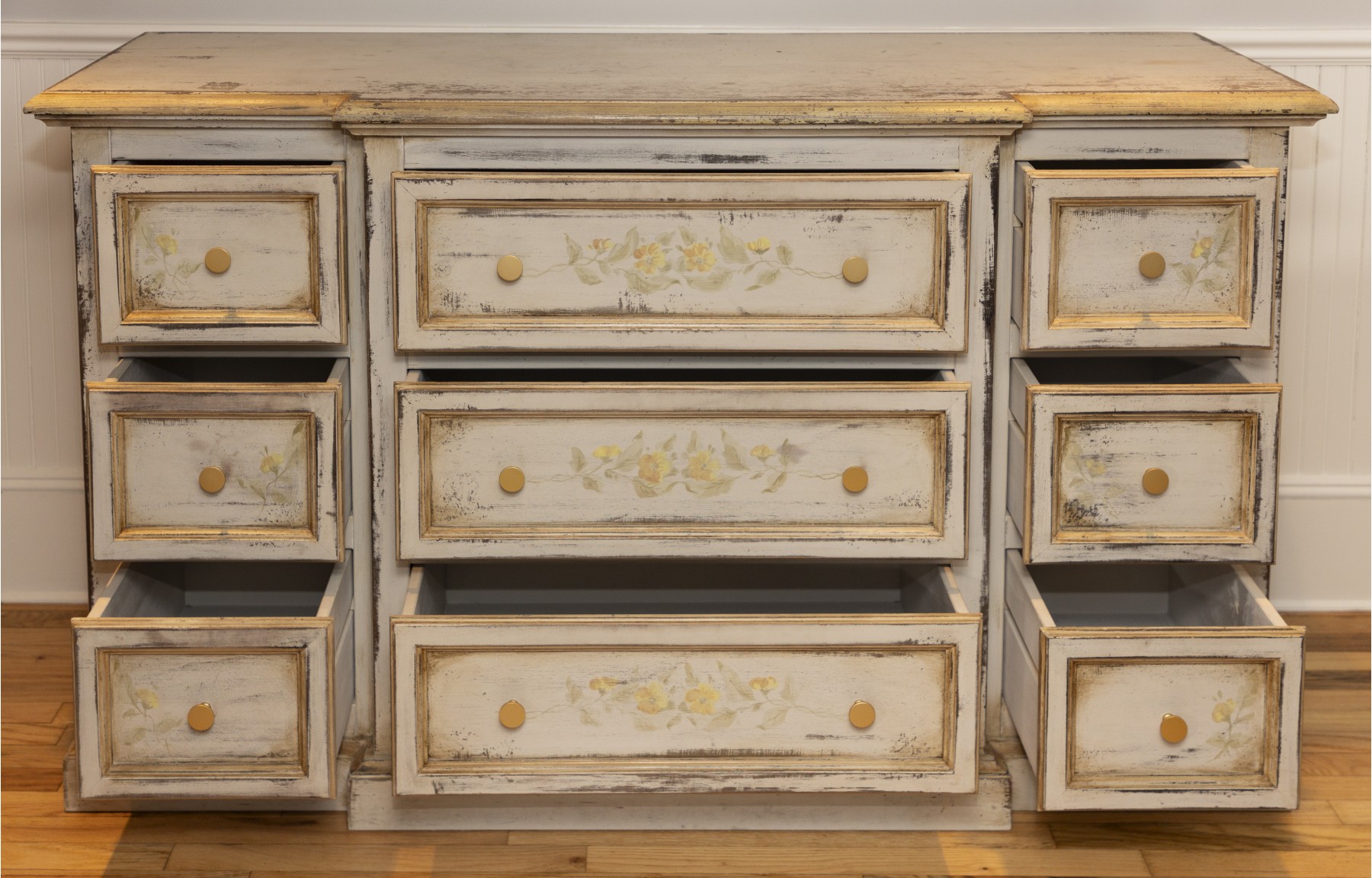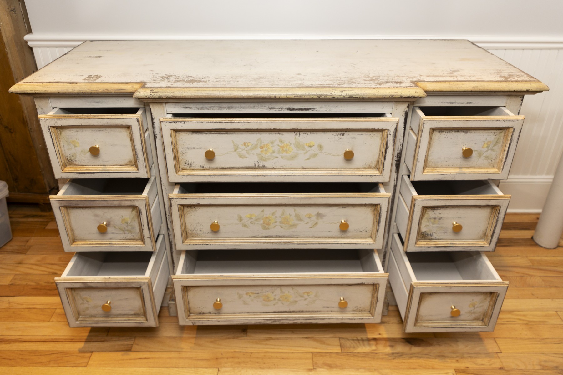 polychrome style painted front, this 9 drawer dresser is in good condition