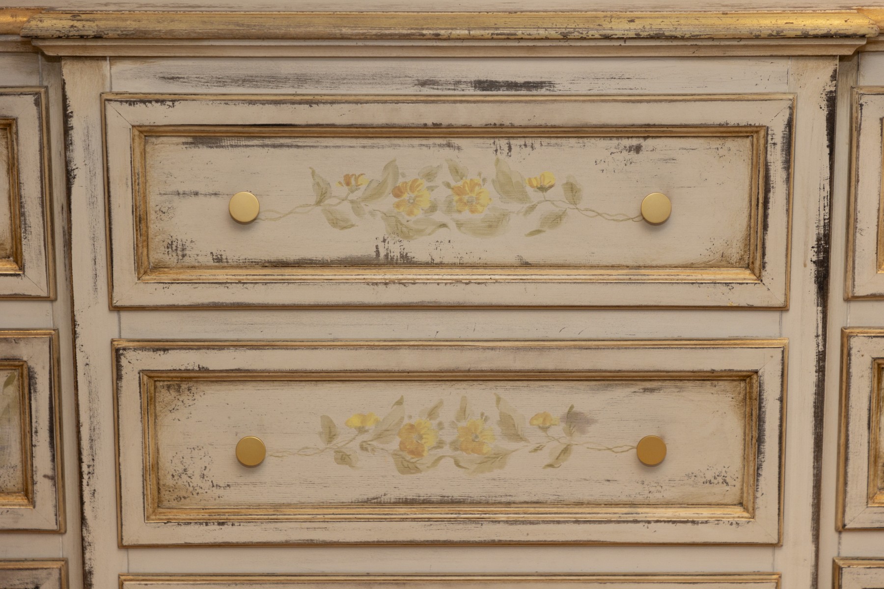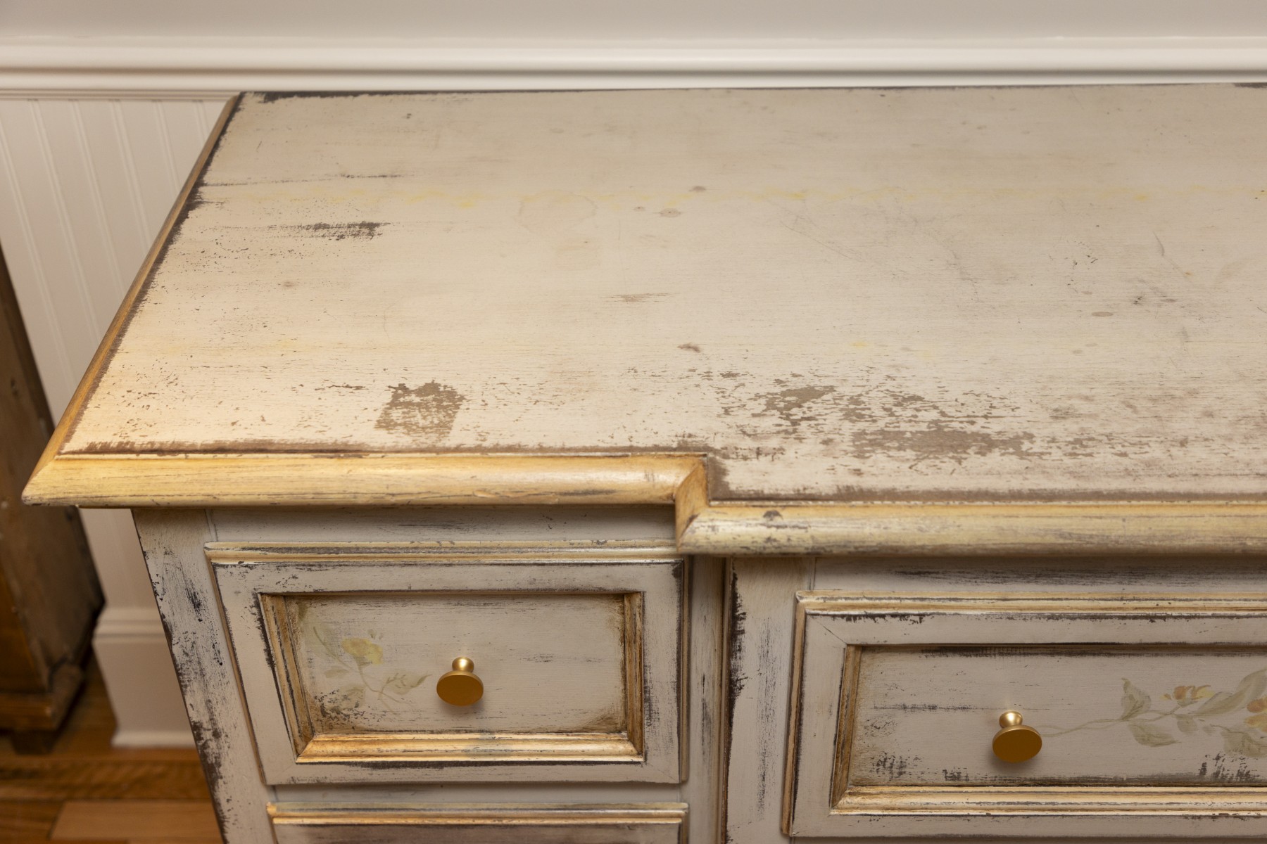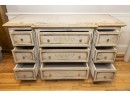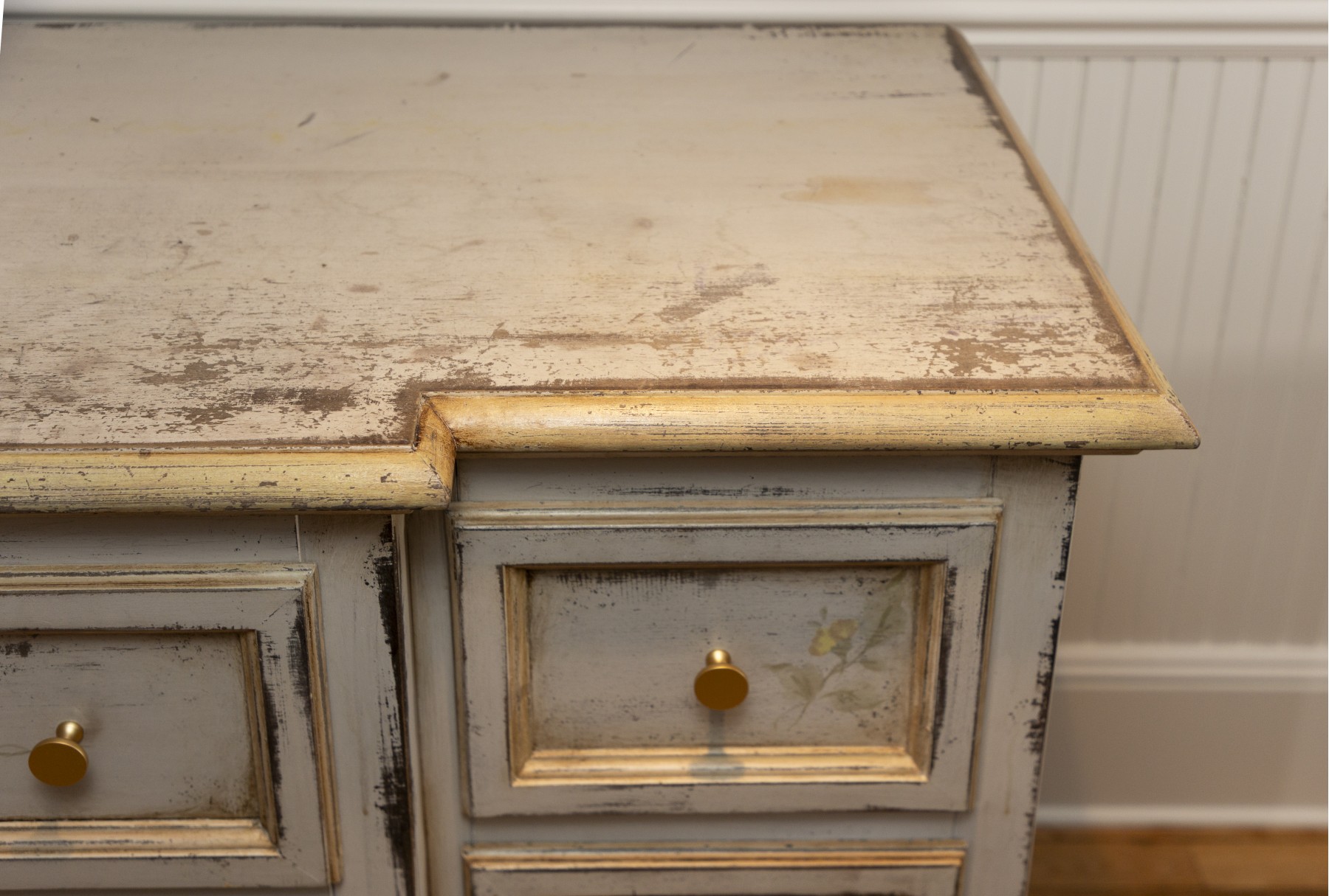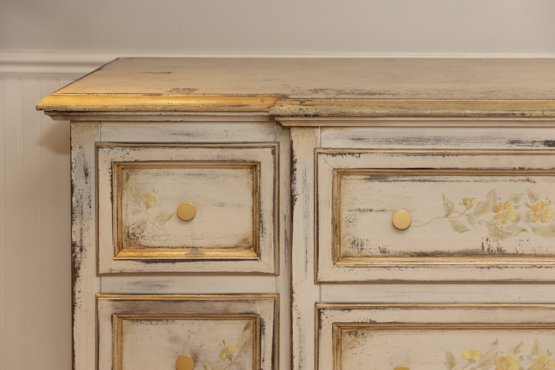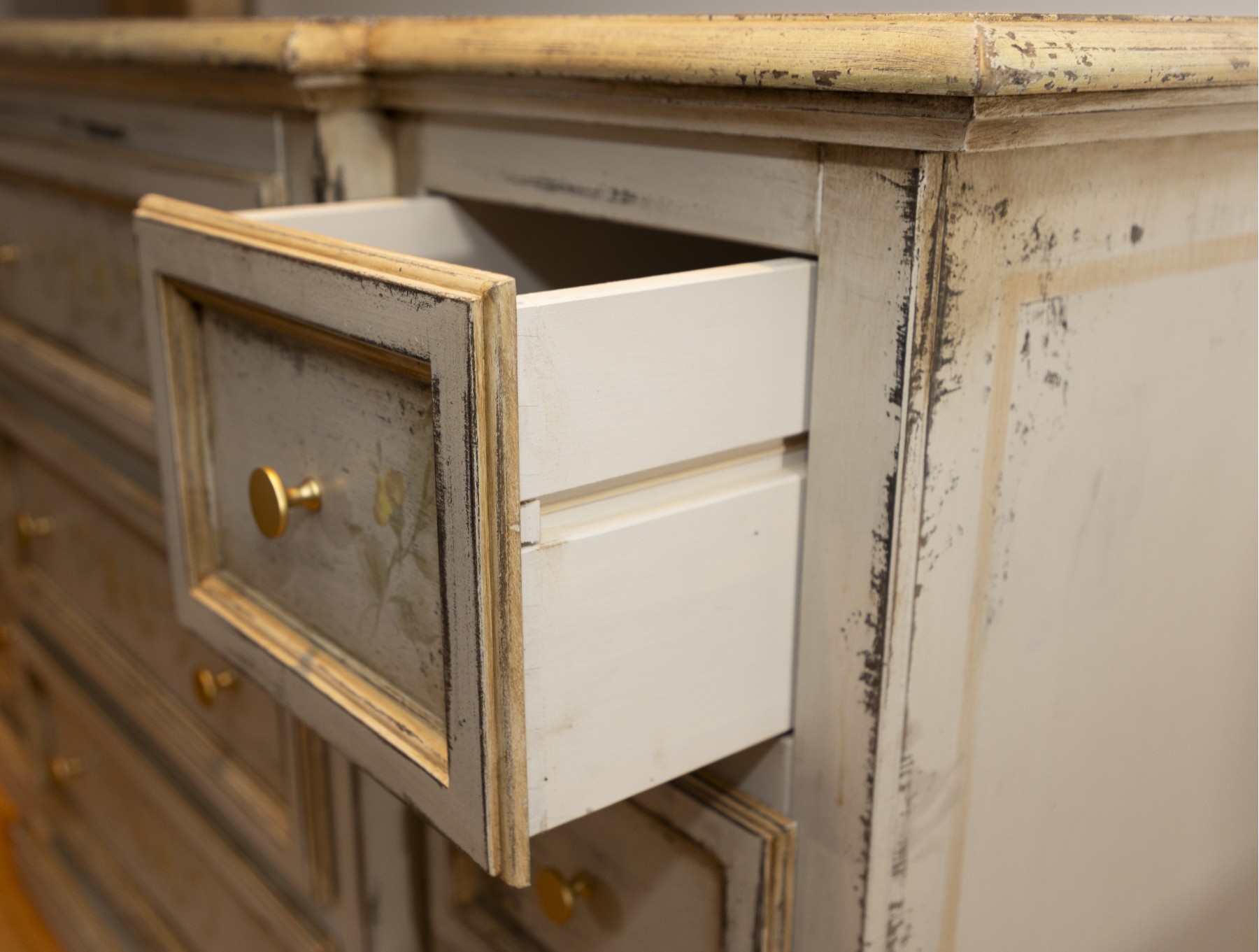 polychrome style painted front, this 9 drawer dresser is in good condition