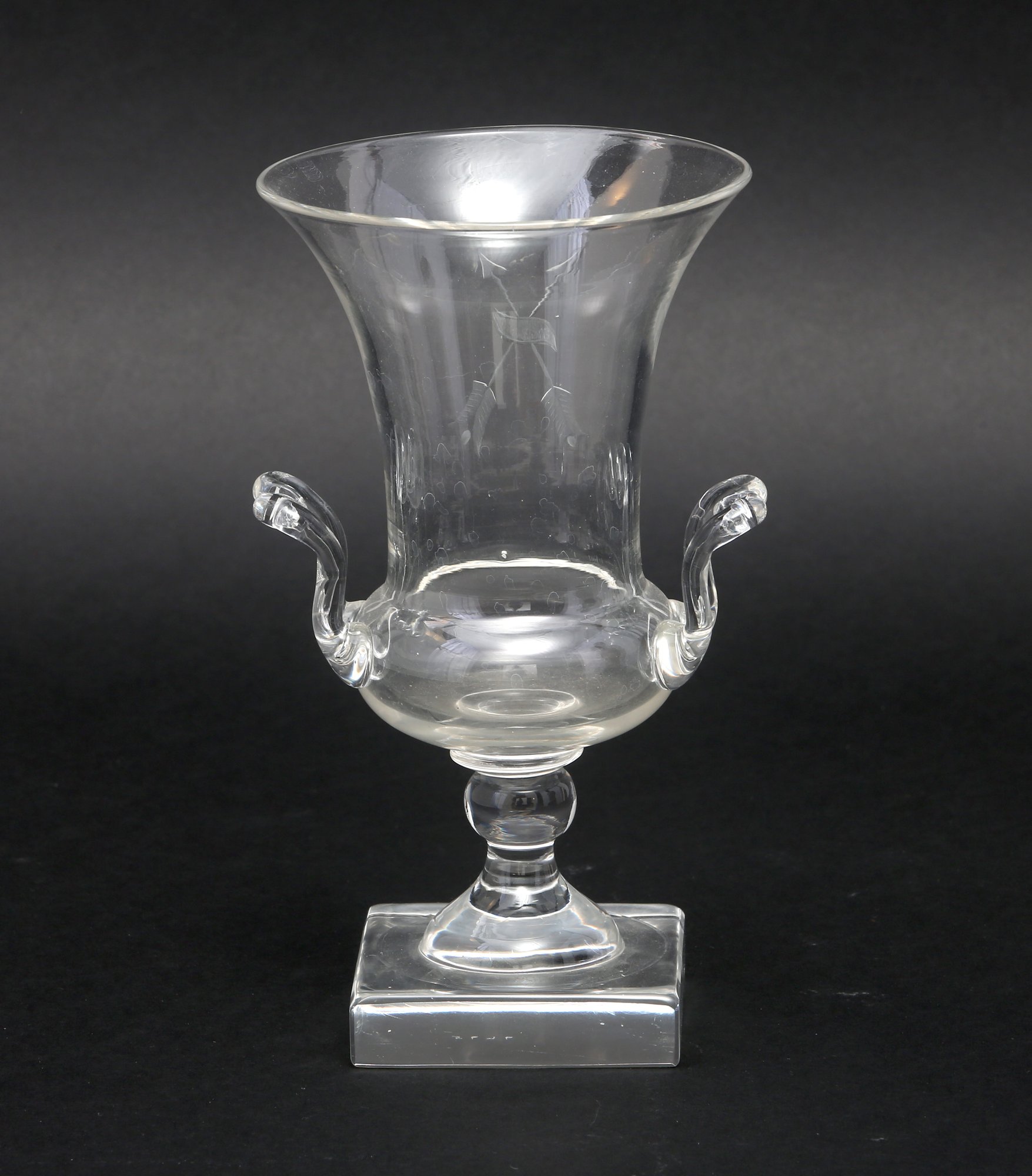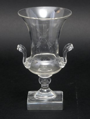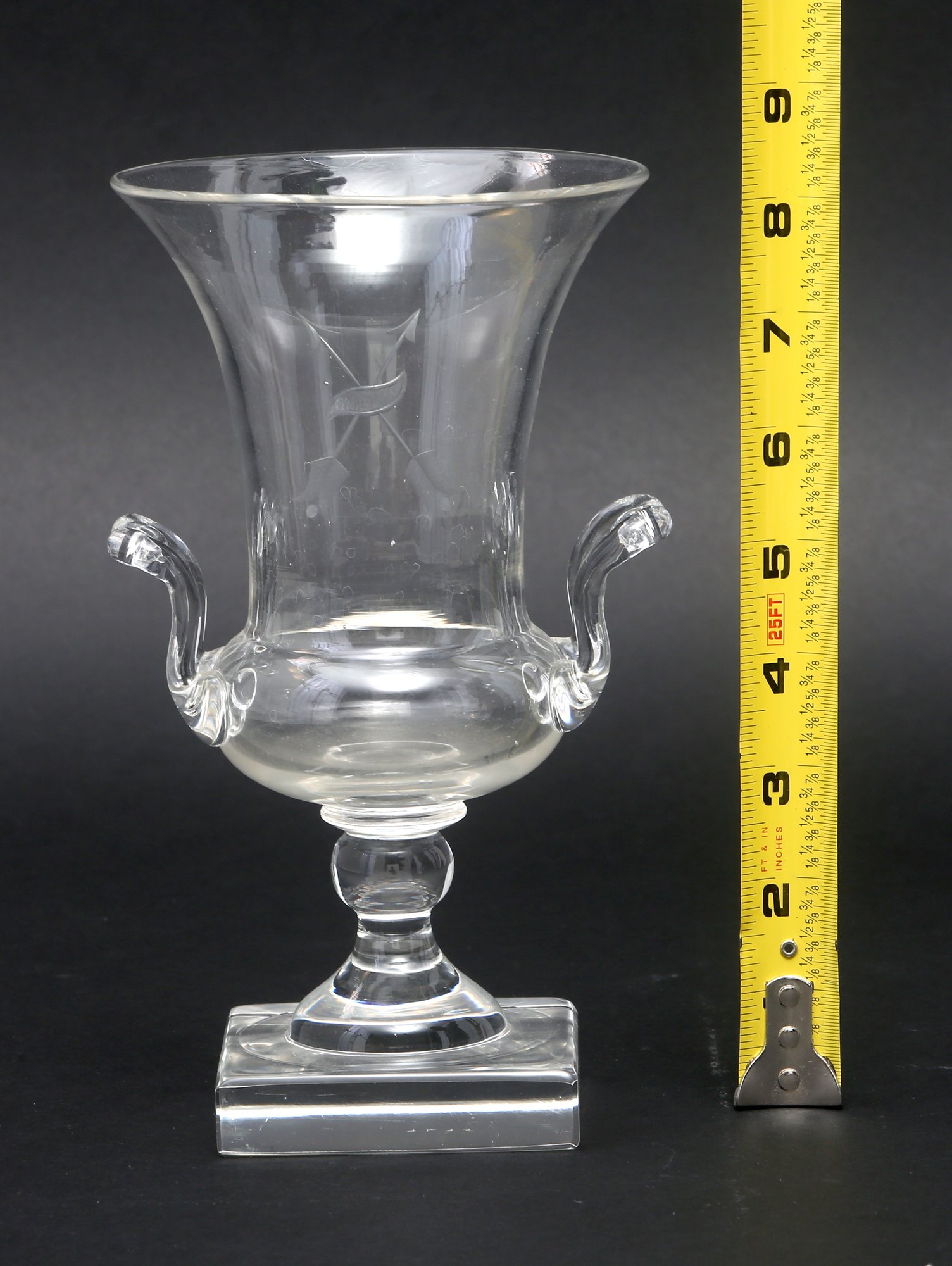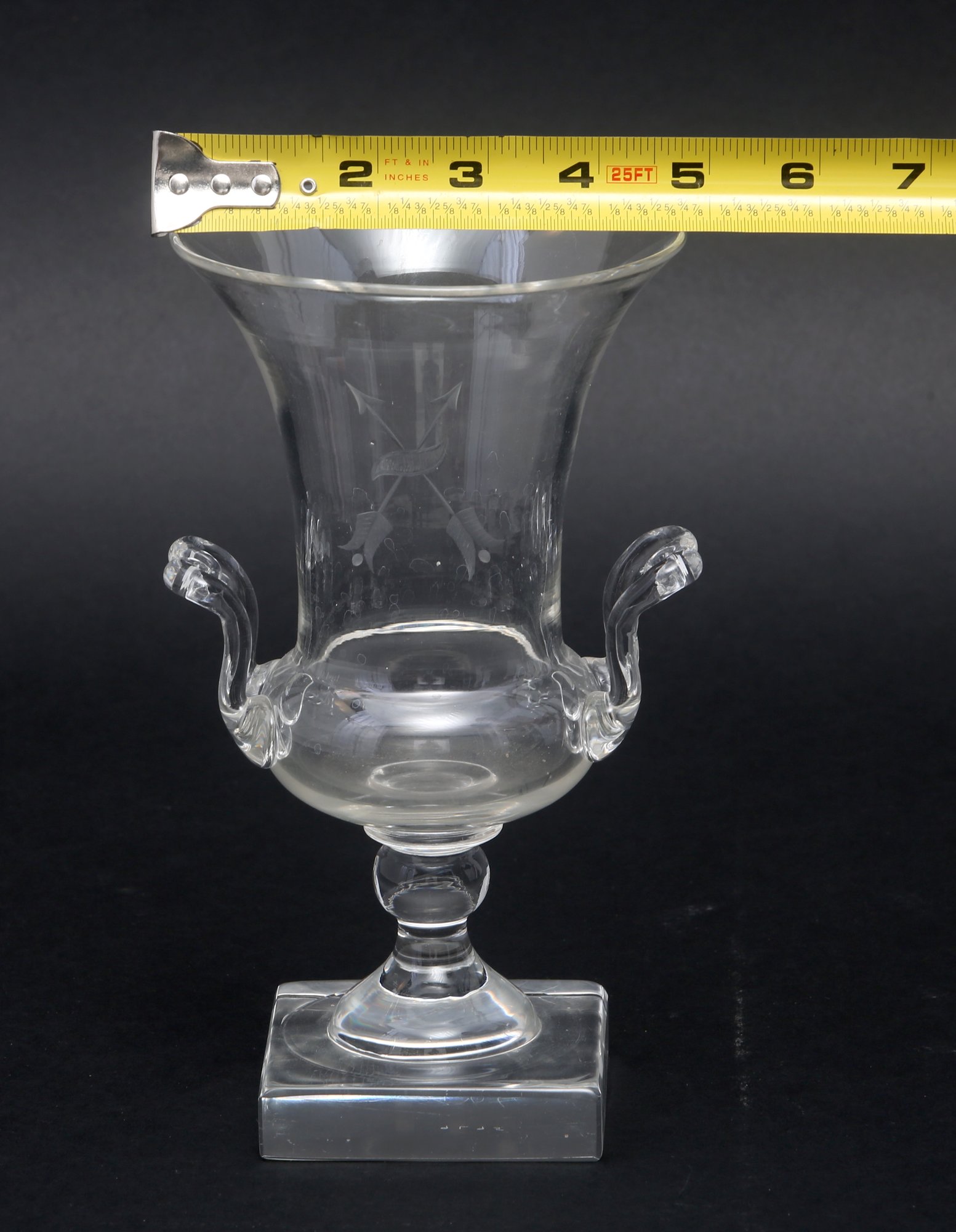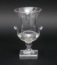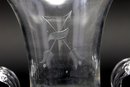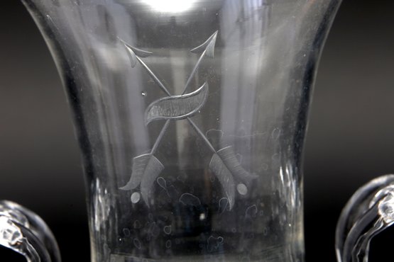 Dual Shoulder Crystal Urn Vase that measures 8.5 inches tall and had crossing arrows etched on the body- good condition
