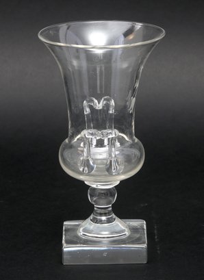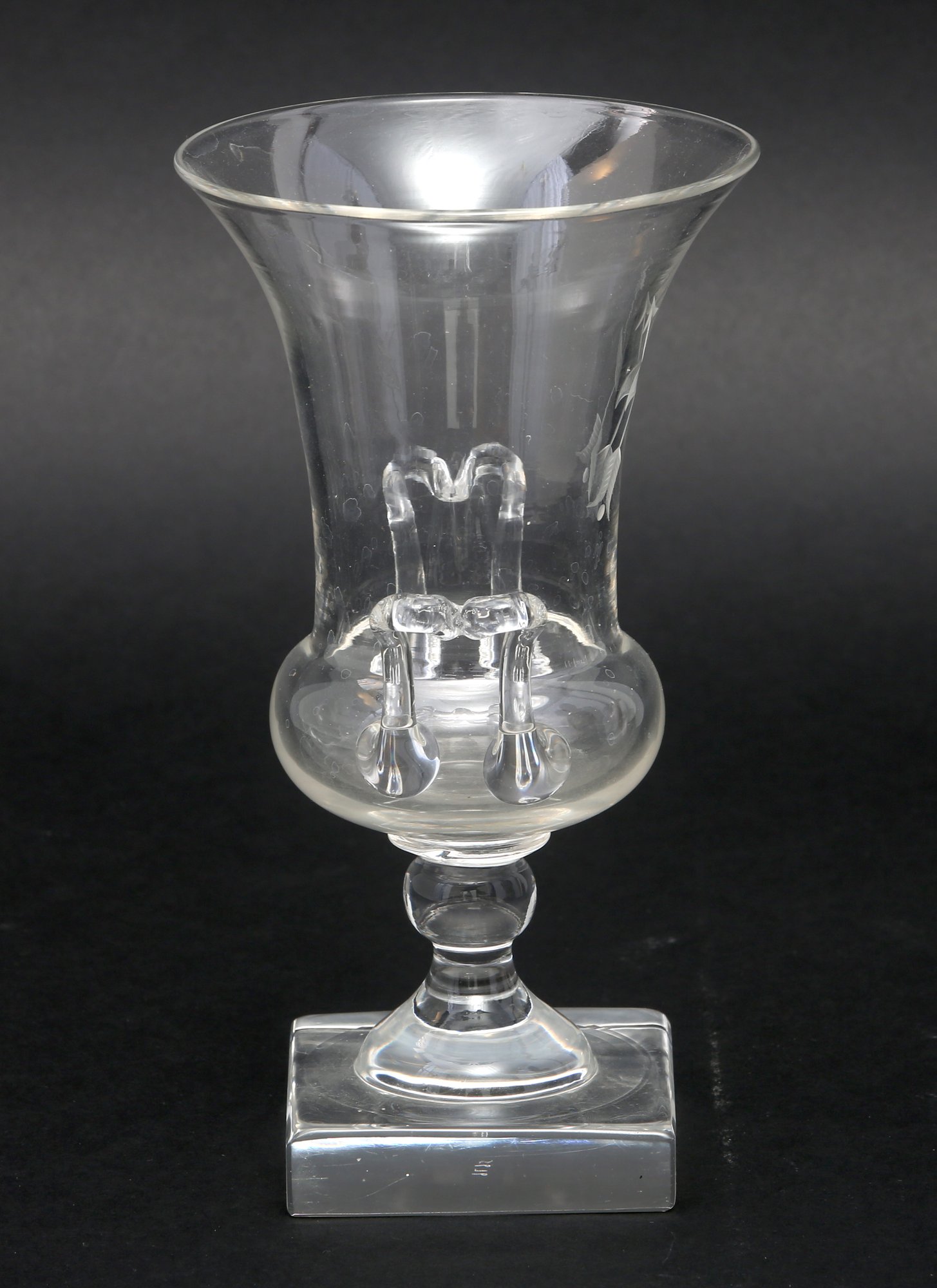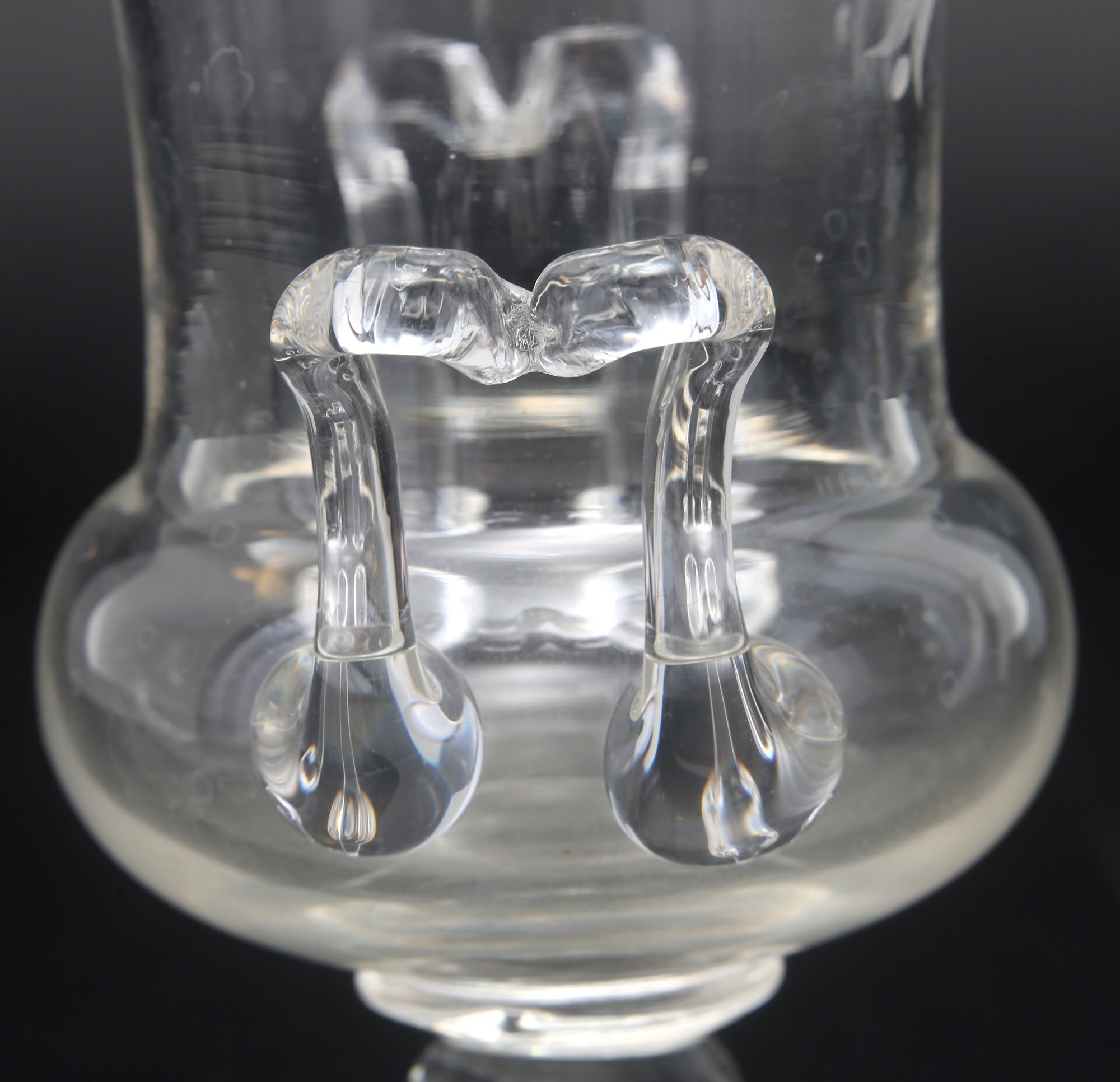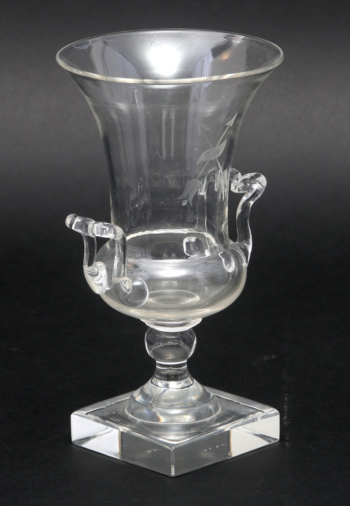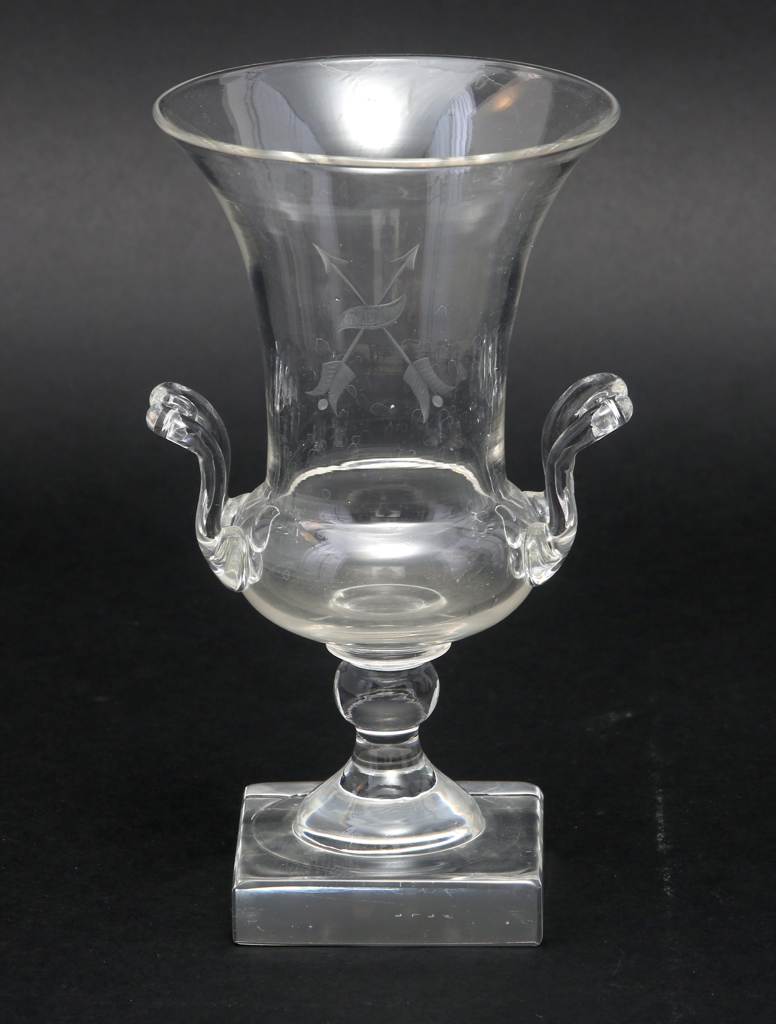 Dual Shoulder Crystal Urn Vase that measures 8.5 inches tall and had crossing arrows etched on the body- good condition