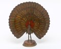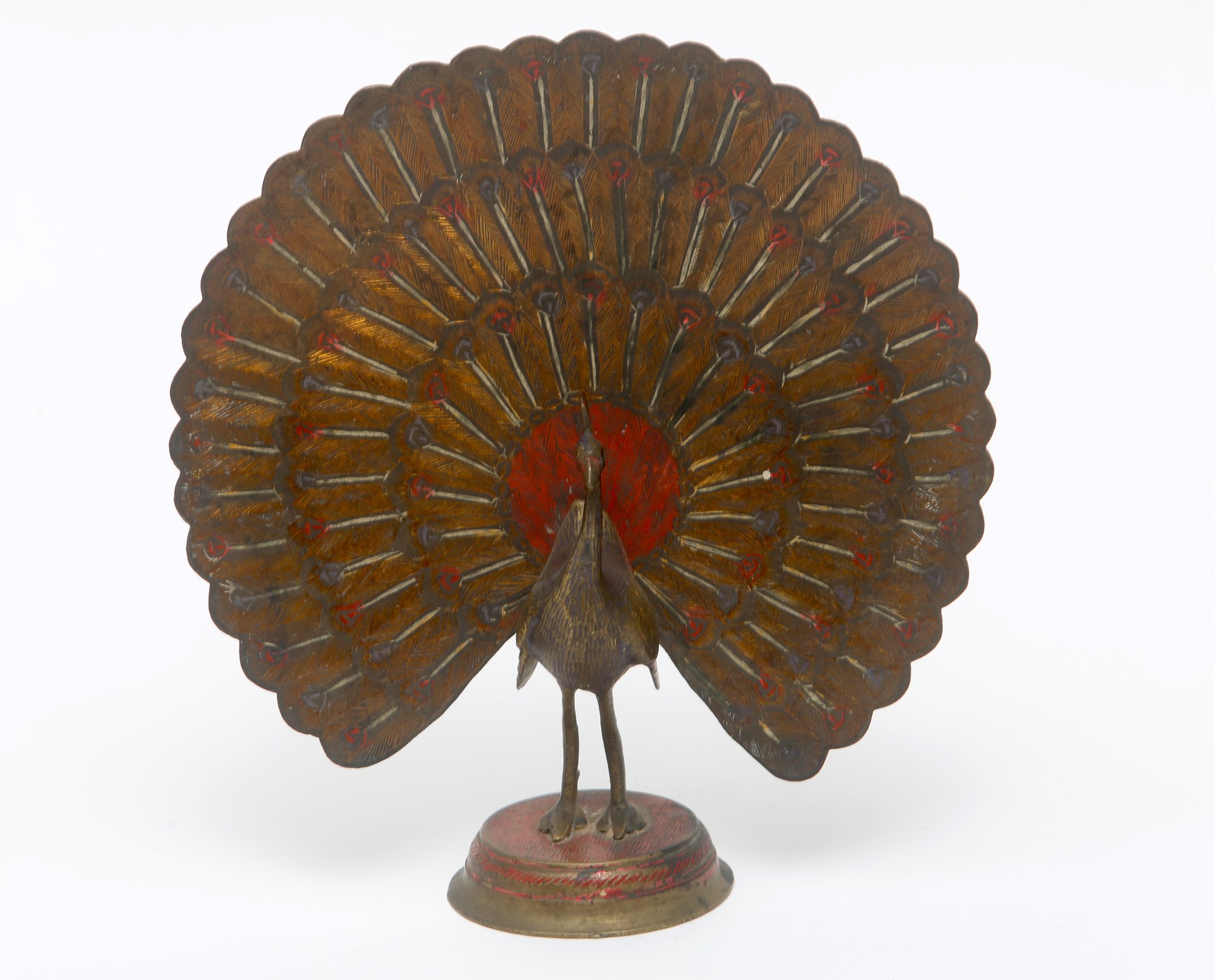 Beautifully rendered etched brass peacock, showing his feathers in full regalia. The surface highlighted with gold and red paint. An exceptional decorative piece, bringing joy to any room.