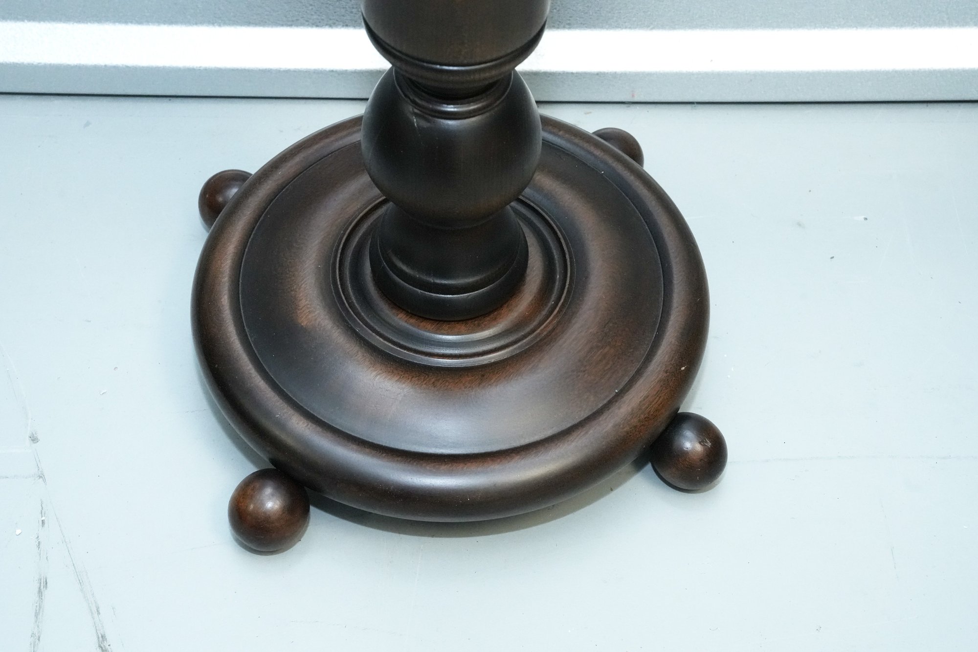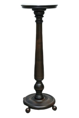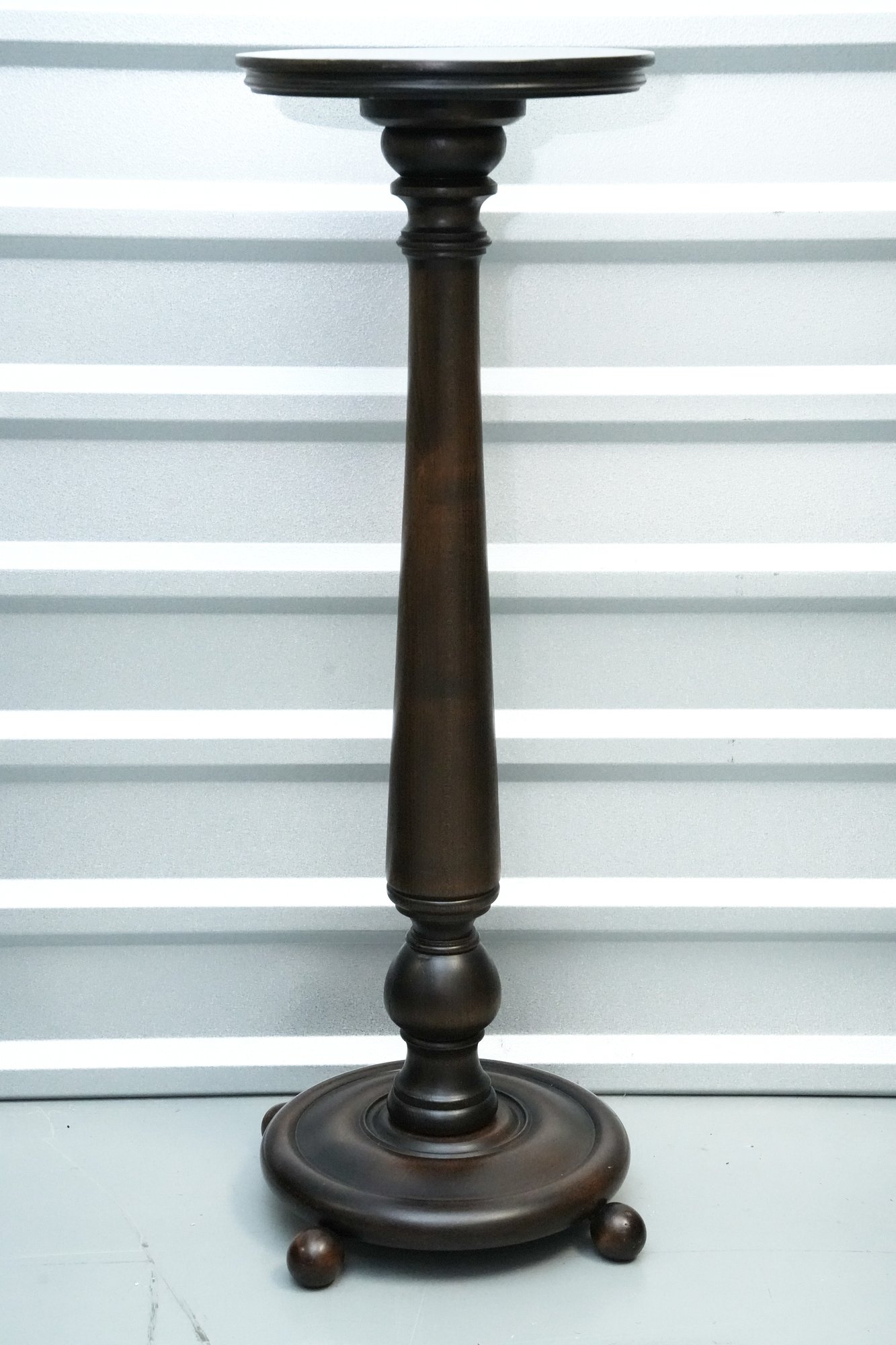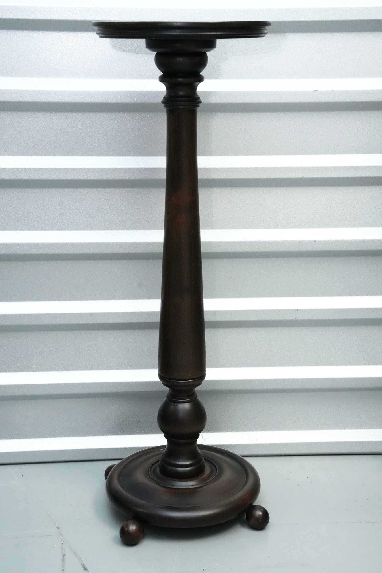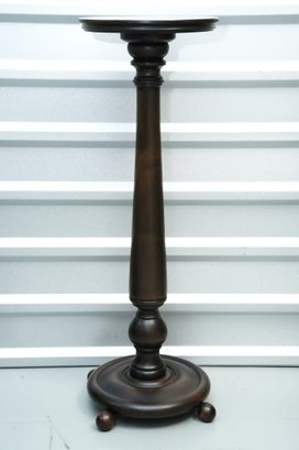 Dark‑stained pedestal plant stand with a round top, a finely turned central column, and a circular base resting on small ball feet. Signs of wear due to age and use.