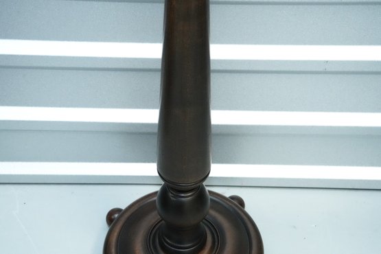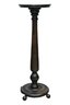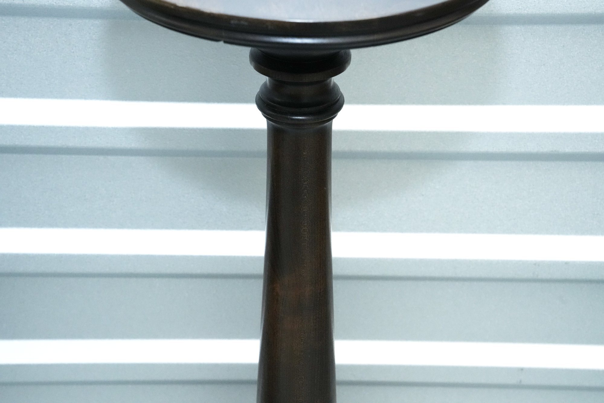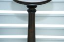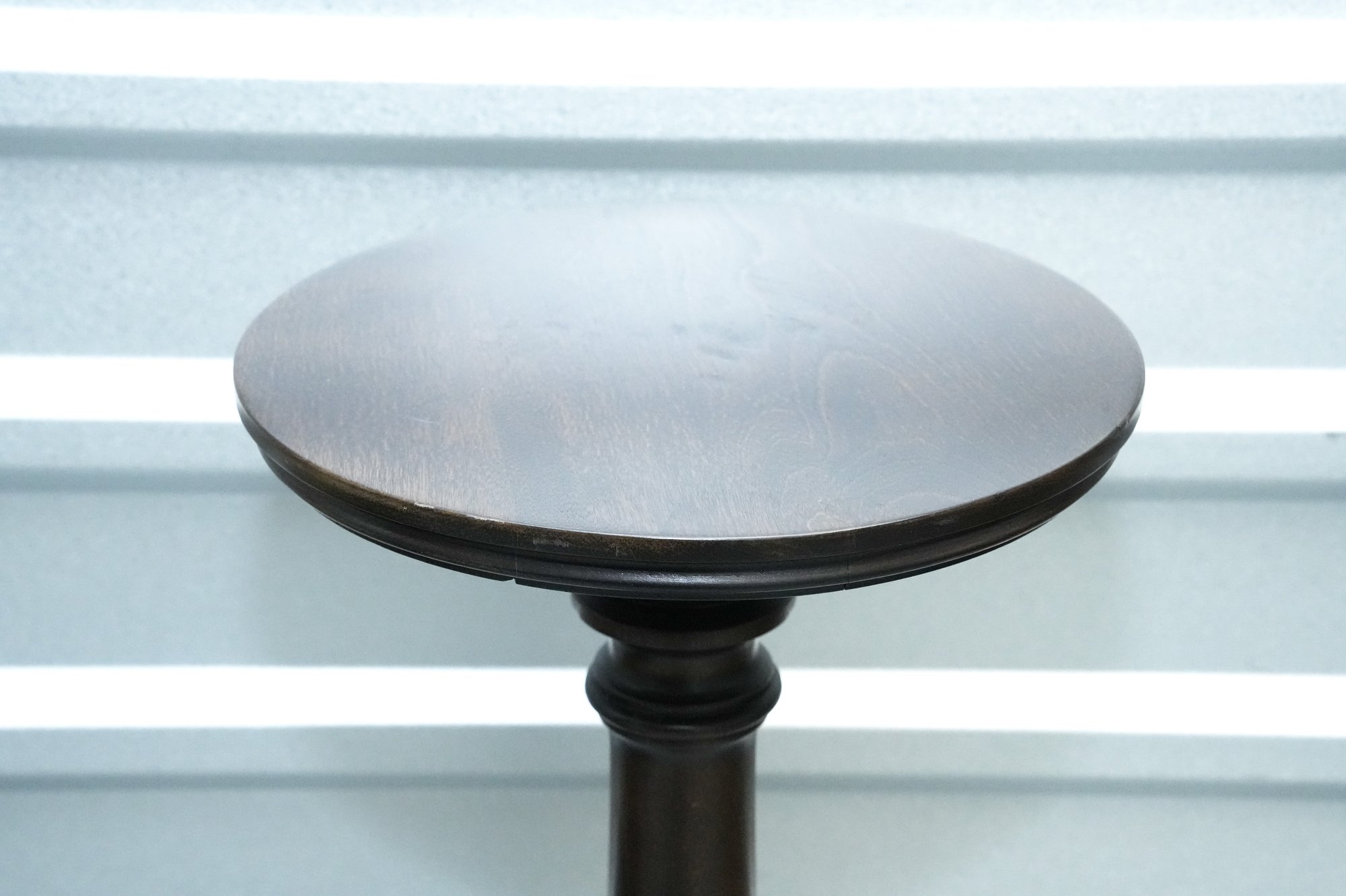 Dark‑stained pedestal plant stand with a round top, a finely turned central column, and a circular base resting on small ball feet. Signs of wear due to age and use.