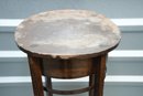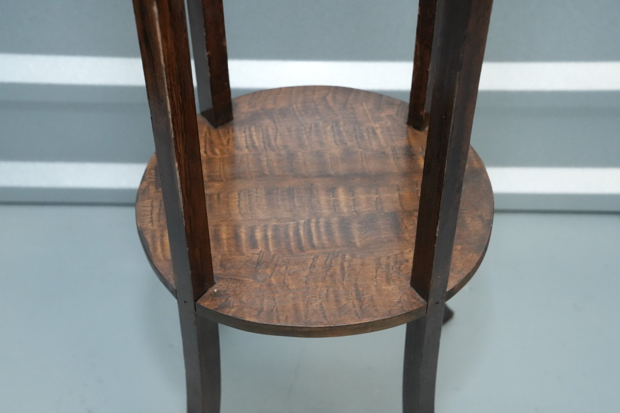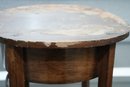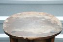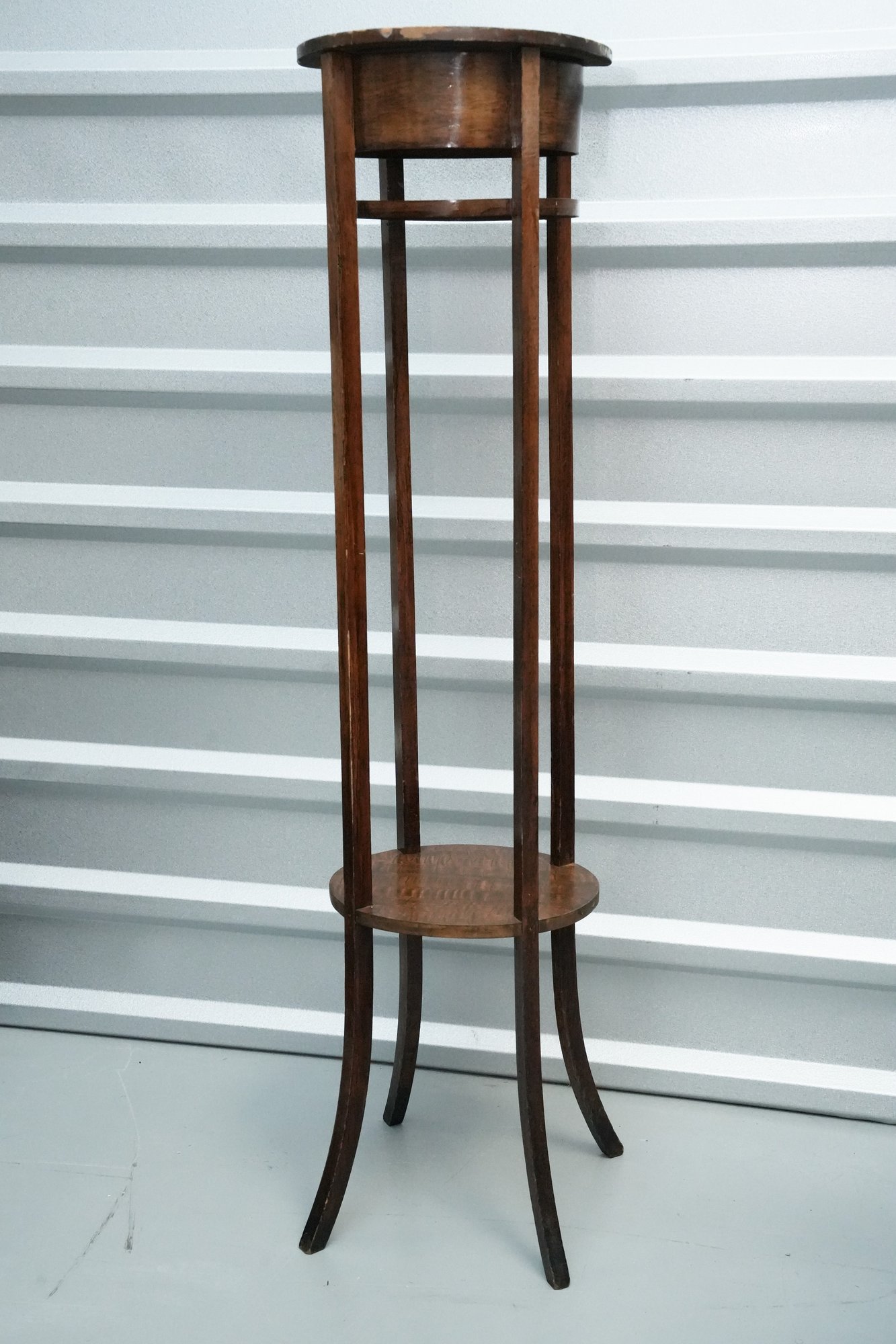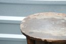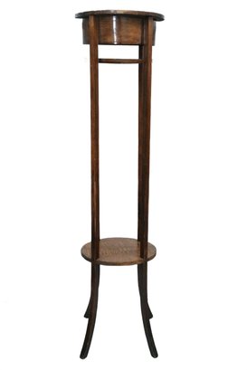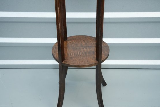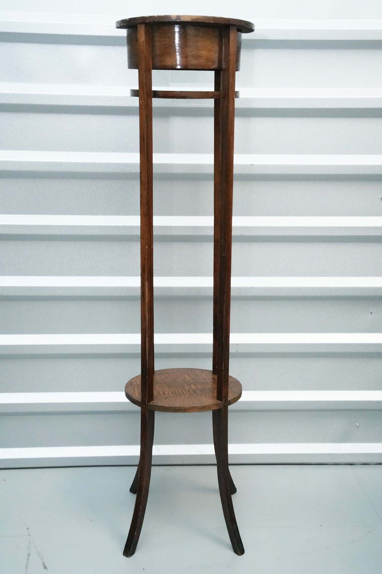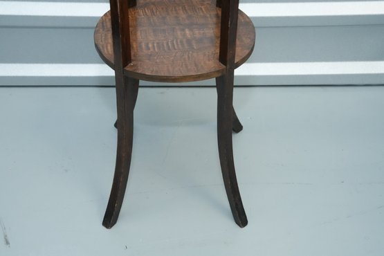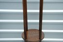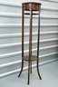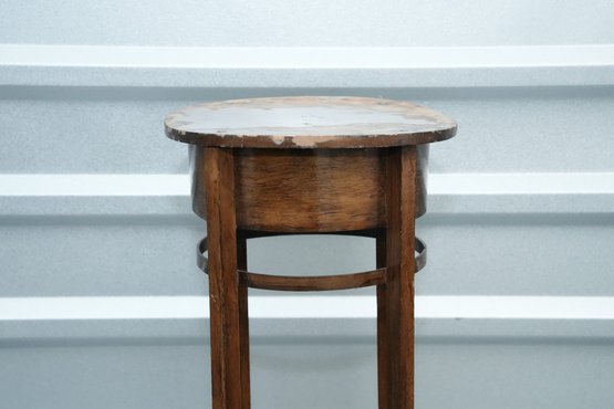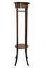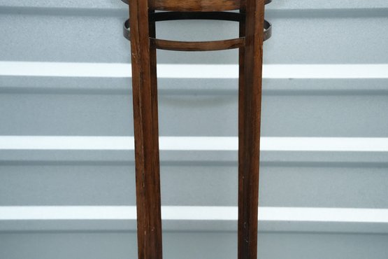 Vintage (late 20th c.) round green marble top pedestal plant stand rests on a dark wood tripod base, each leg accented with a decorative brass medallion.