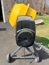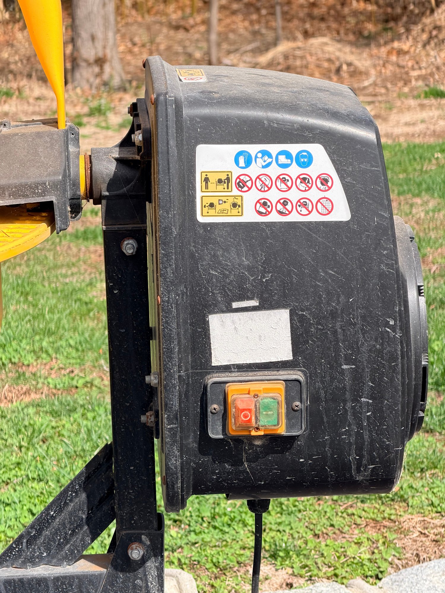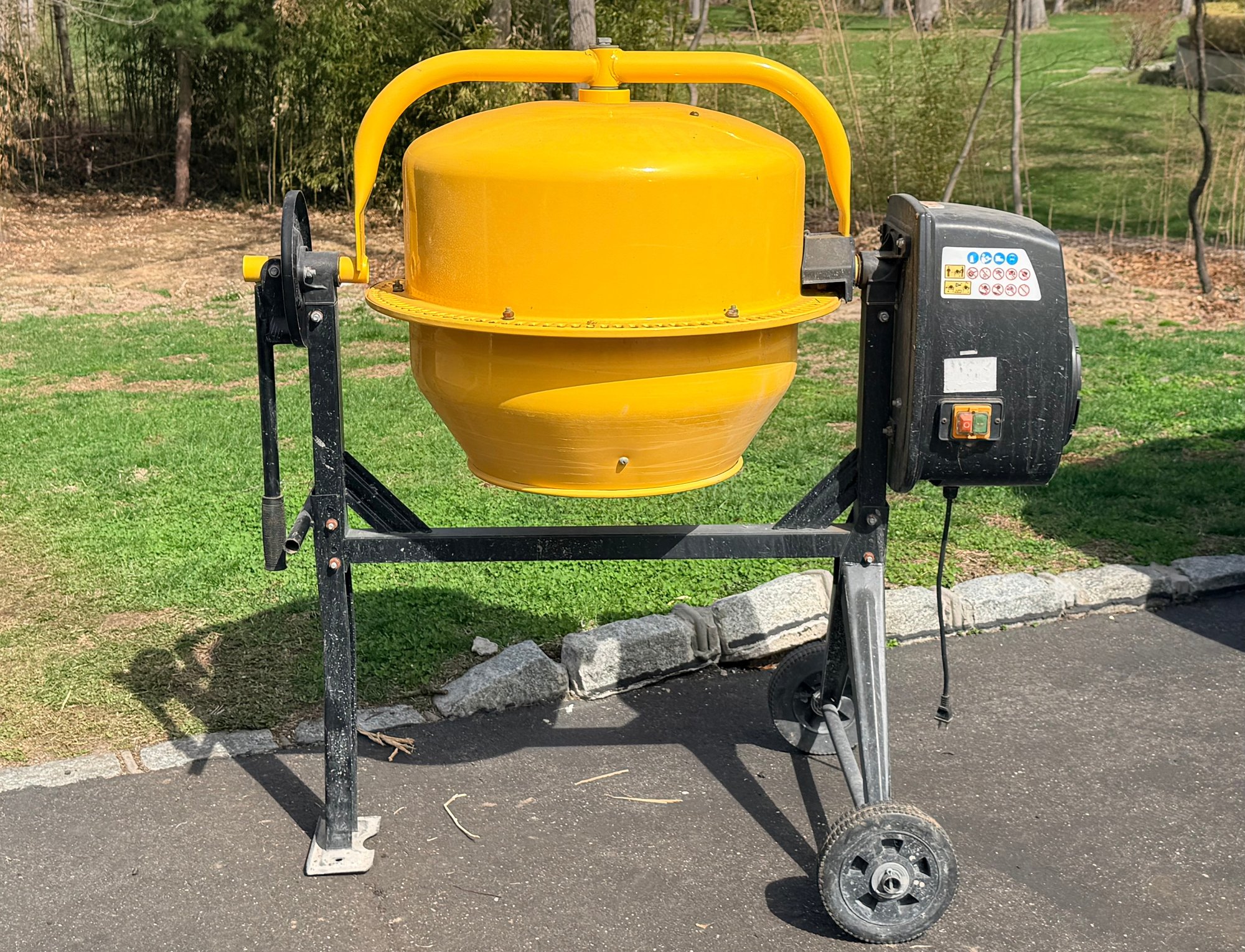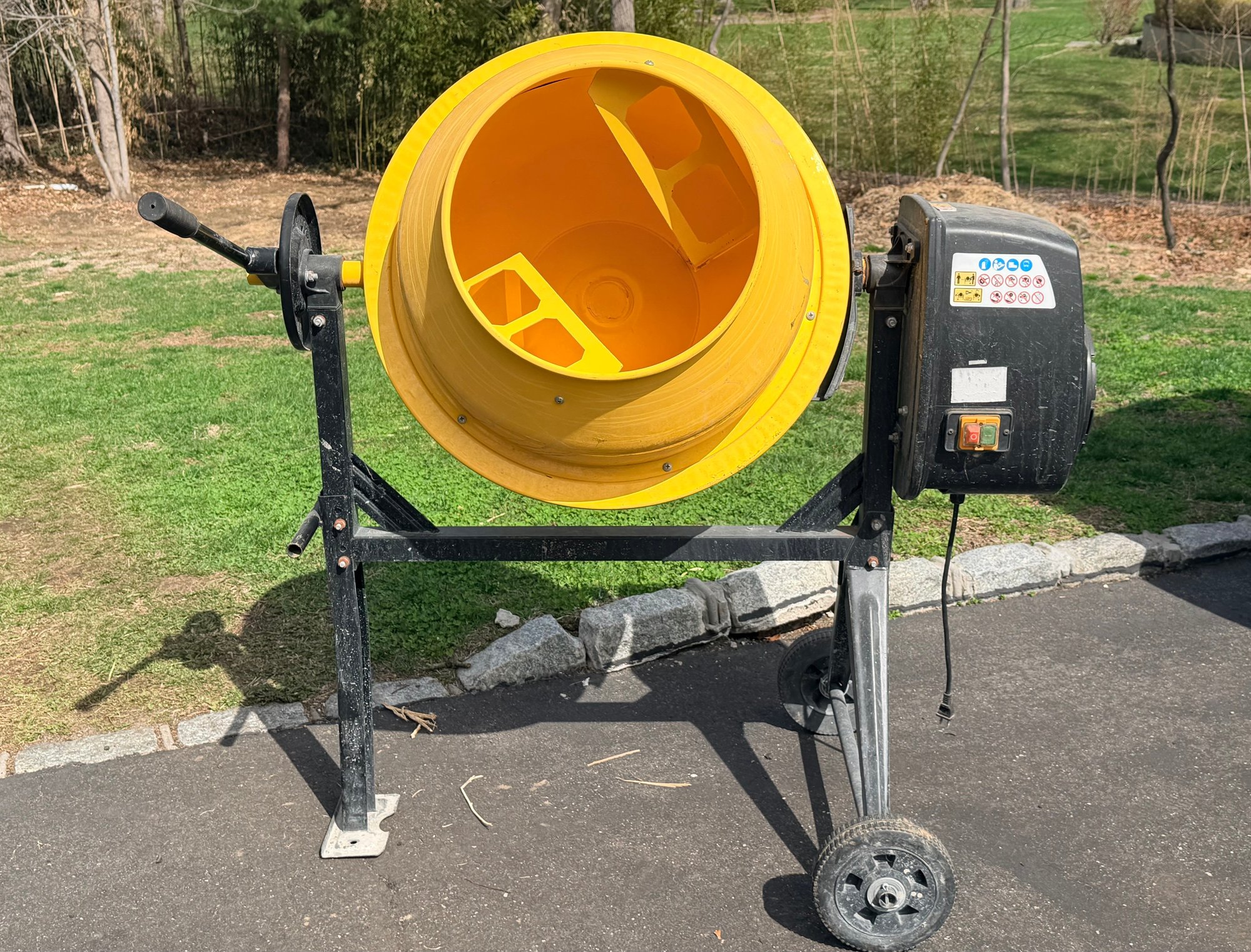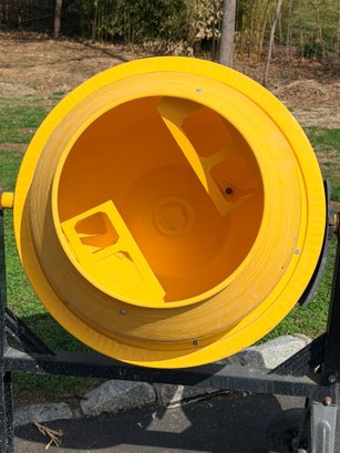 Compact electric concrete mixer featuring a yellow steel drum with internal mixing paddles, mounted on a black metal frame. Designed for mixing concrete, mortar, or other construction materials. The unit includes a hand wheel/handle for tilting and dumping the drum, along with an electric motor housing and on/off switch. Supported by a two-wheel base for mobility and rear stabilizing legs for use.