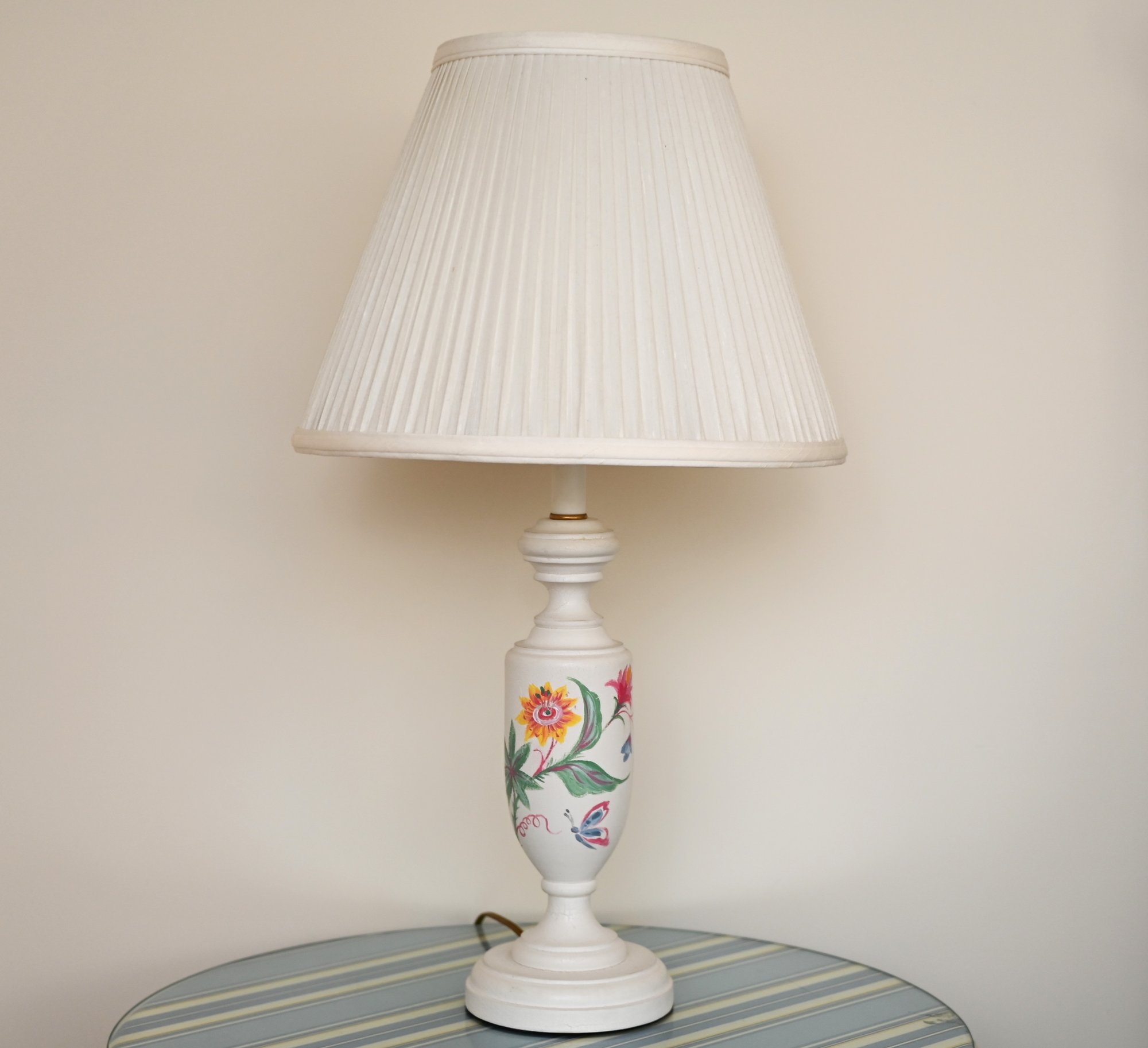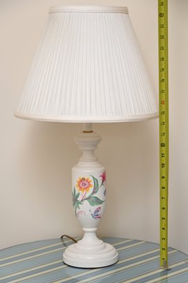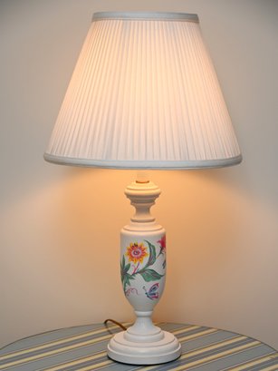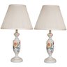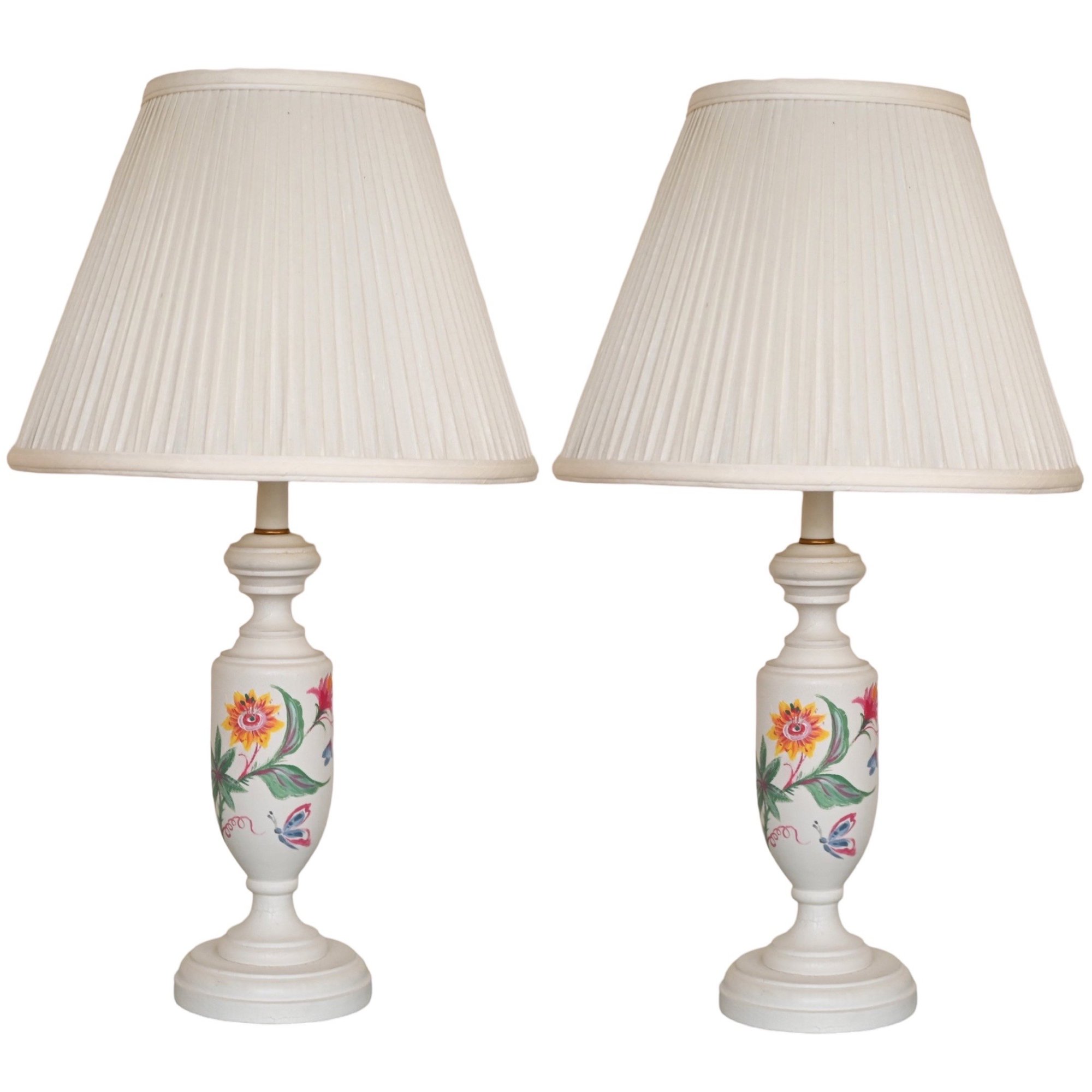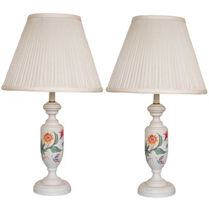 This image showcases a pair of elegant table lamps with a classic design. Each lamp features a white ceramic base adorned with hand-painted floral motifs in vibrant colors, including shades of yellow, pink, blue, and green. The bases have a traditional urn shape with a slightly tapered profile and a pedestal bottom. The lamps are topped with pleated off-white fabric shades that diffuse light softly, enhancing their vintage appeal.