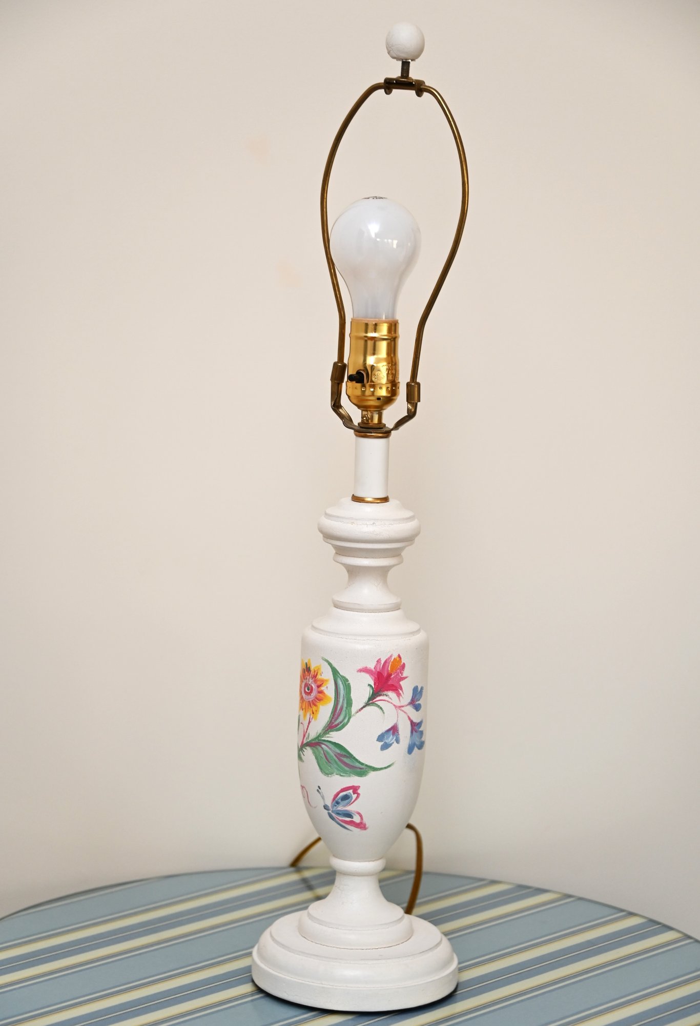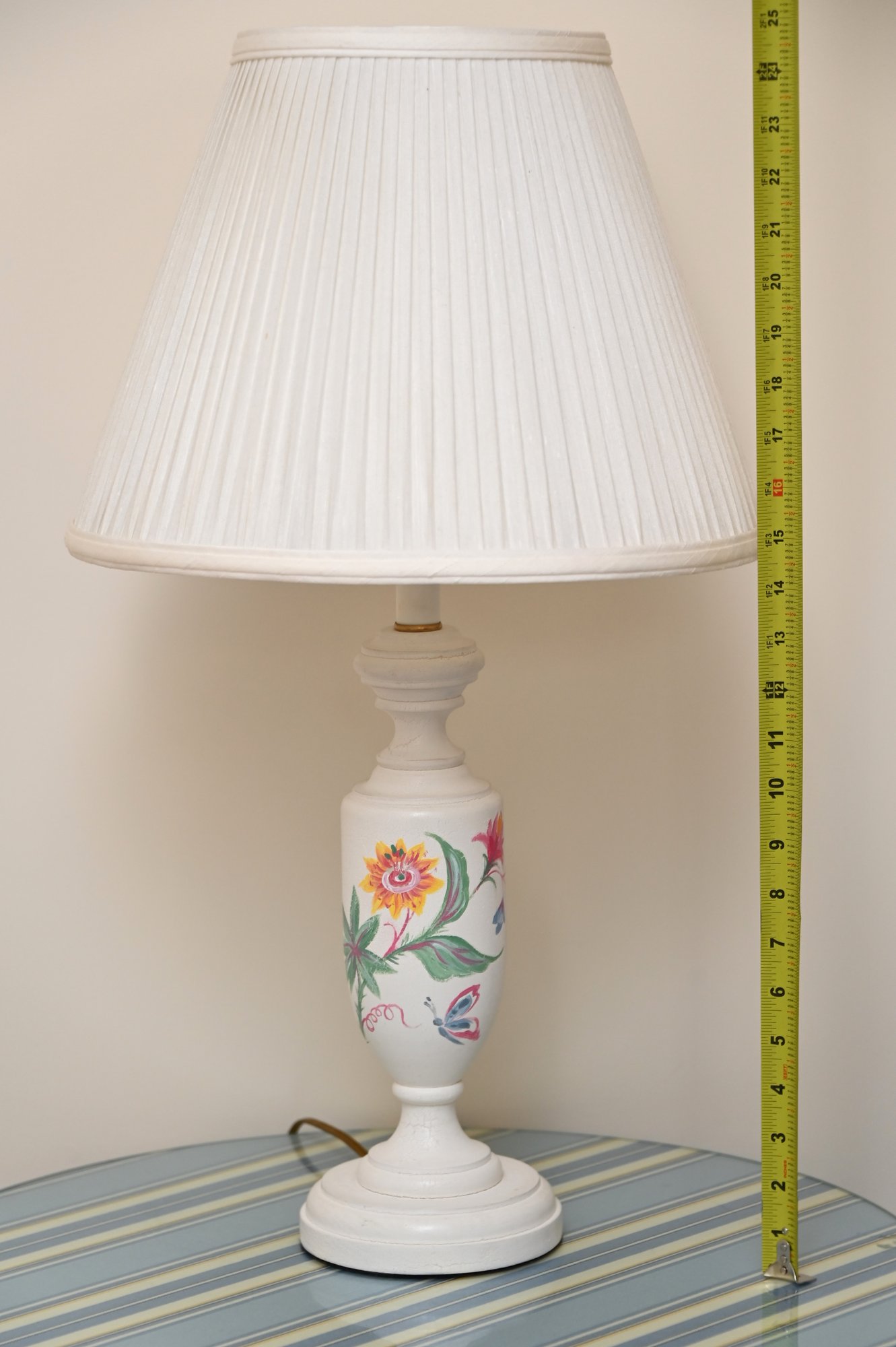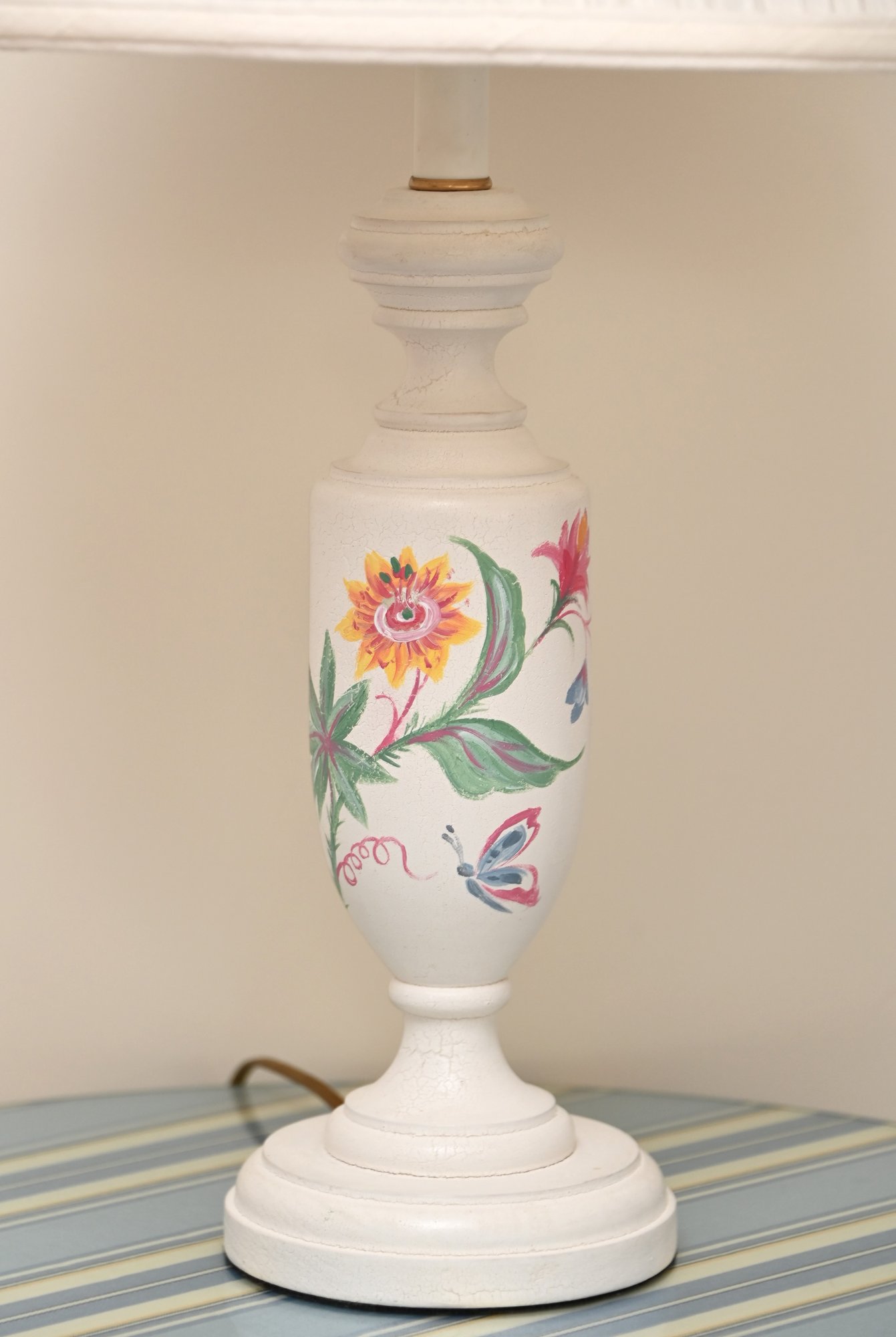 This image showcases a pair of elegant table lamps with a classic design. Each lamp features a white ceramic base adorned with hand-painted floral motifs in vibrant colors, including shades of yellow, pink, blue, and green. The bases have a traditional urn shape with a slightly tapered profile and a pedestal bottom. The lamps are topped with pleated off-white fabric shades that diffuse light softly, enhancing their vintage appeal.