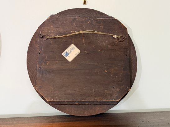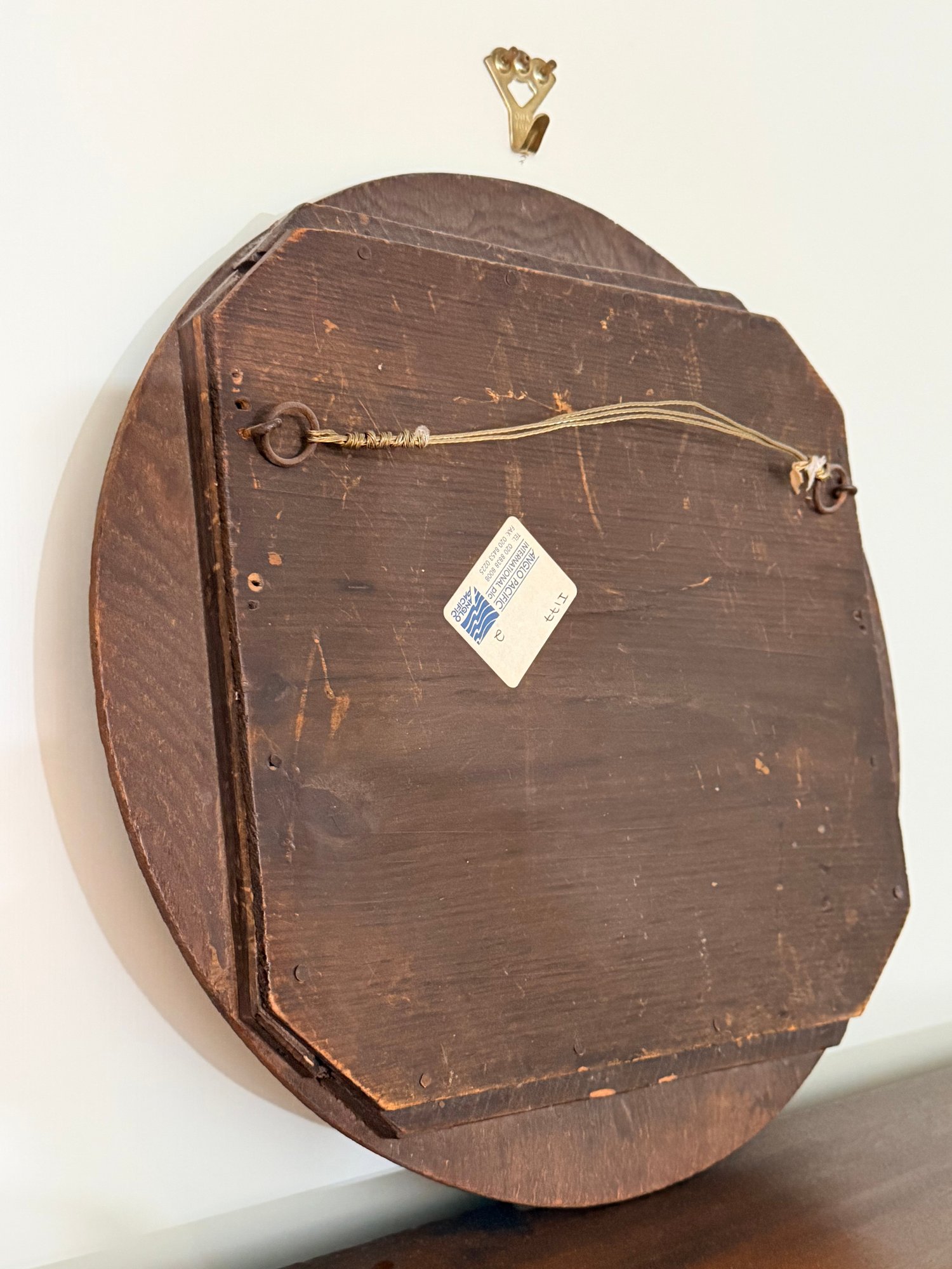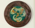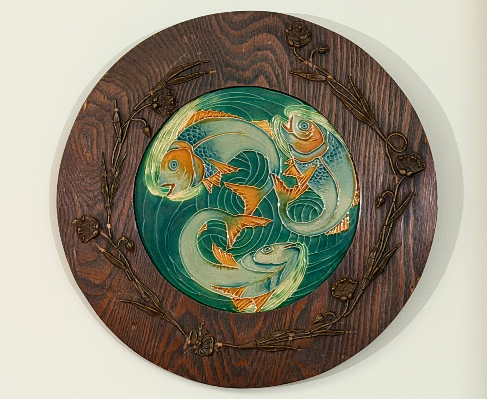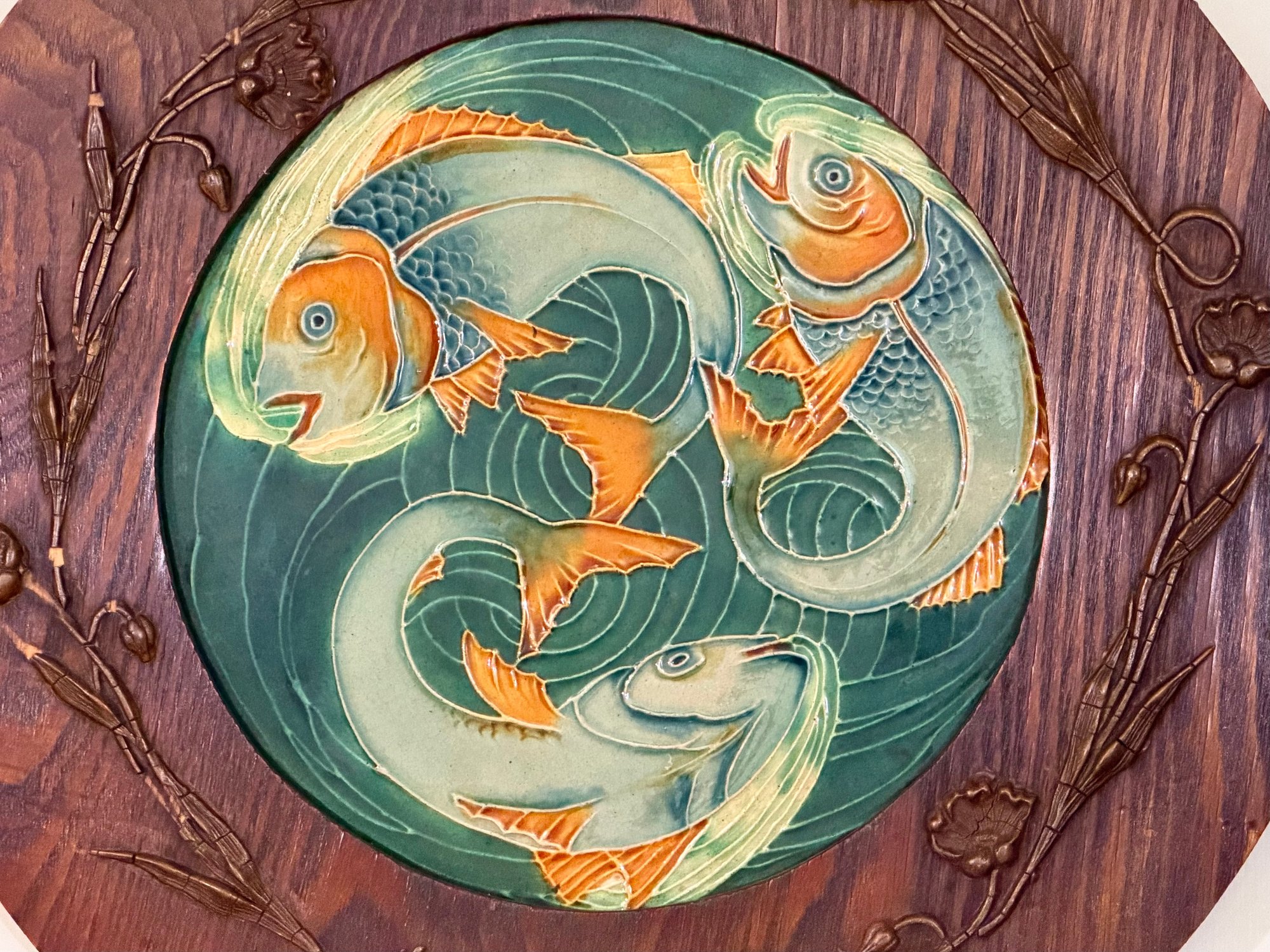 An English glazed porcelain plaque of circular form, showing three (3) fish riding waves, rendered in turquoise, blue, orange, and white, set in an oak frame with an applied floral motif. Minton, Stoke-on-Trent. Circa 1900. Diameter: 8 3/4 inches. Diameter of frame: 14 5/8 inches.