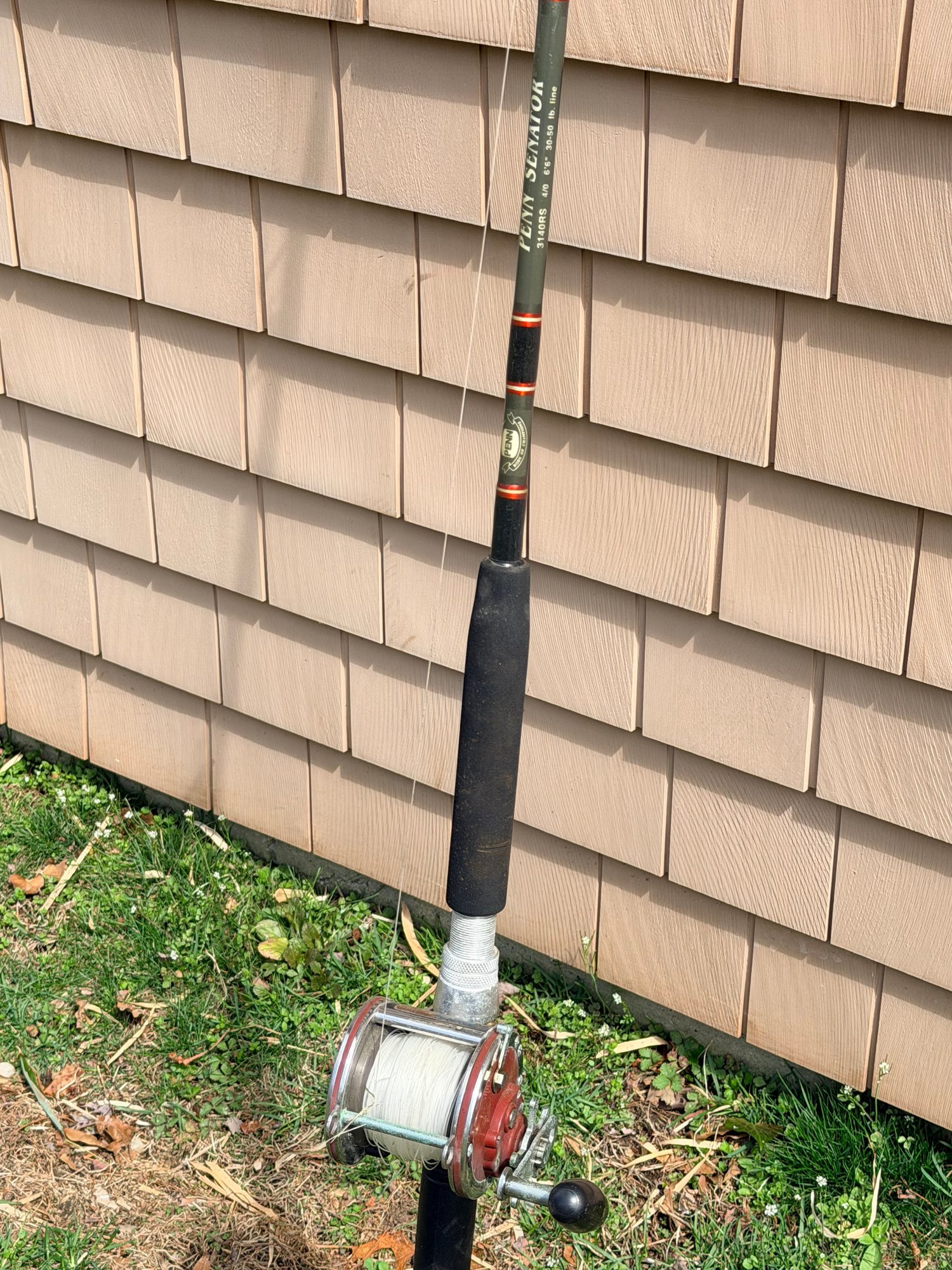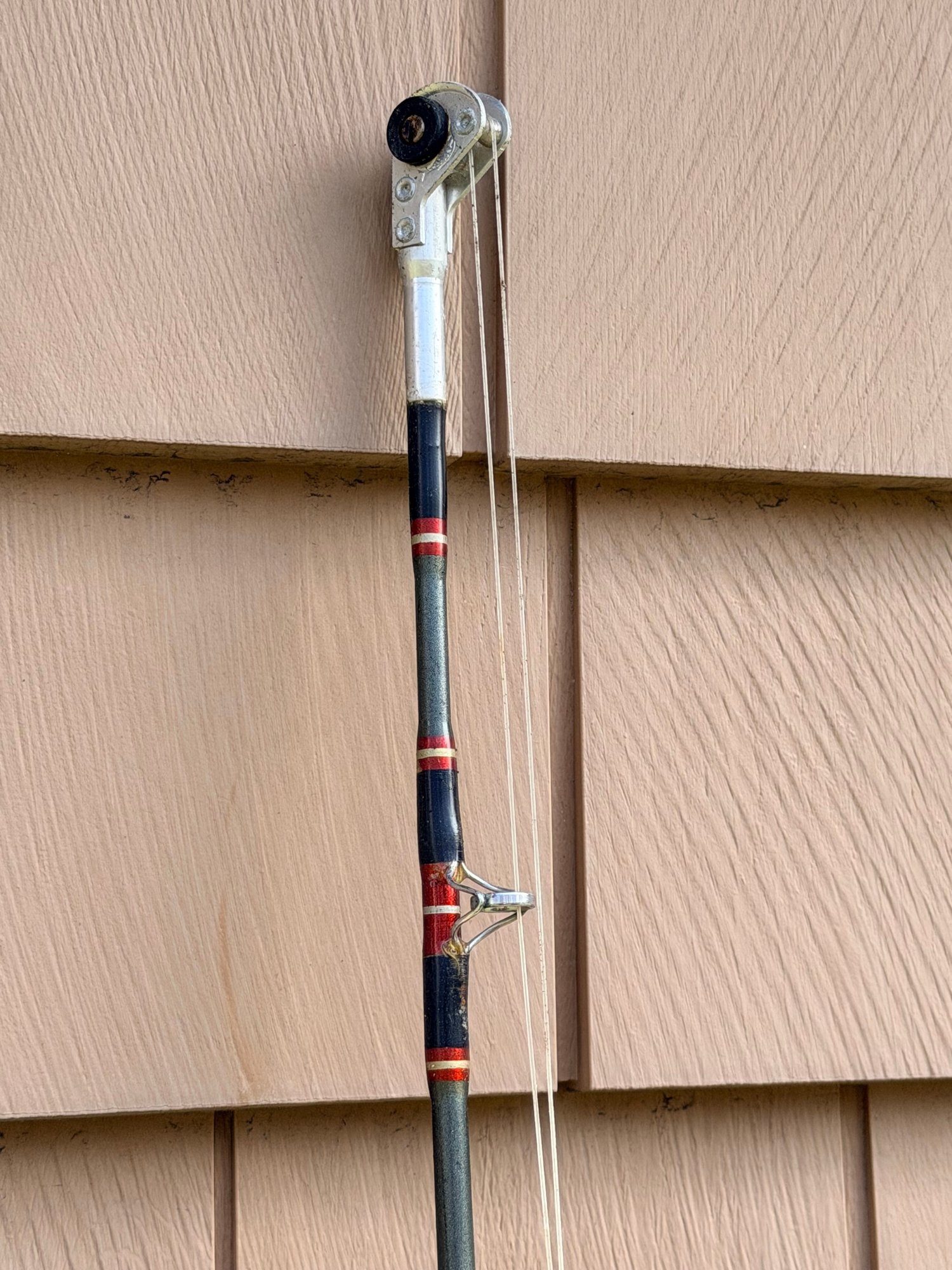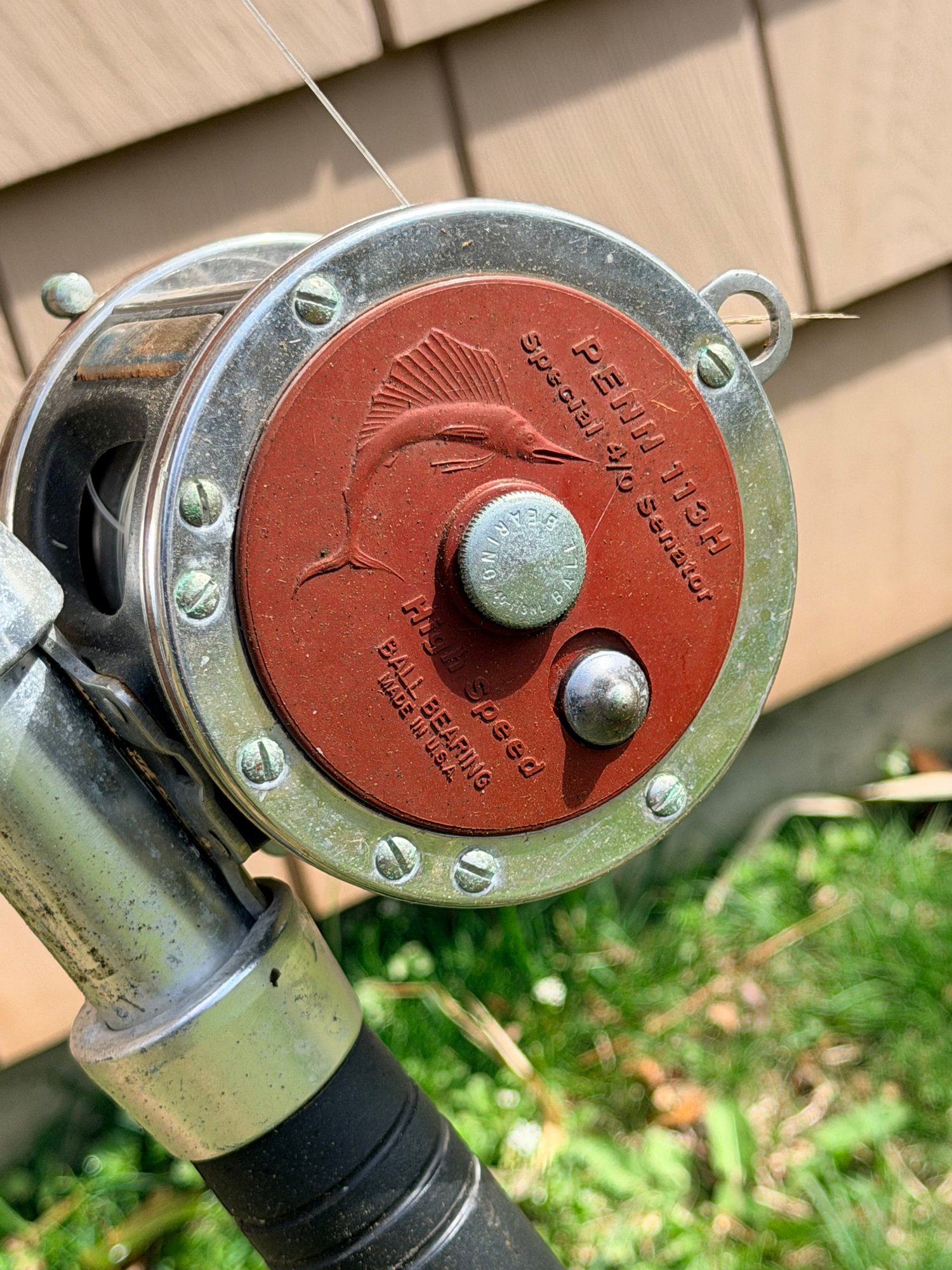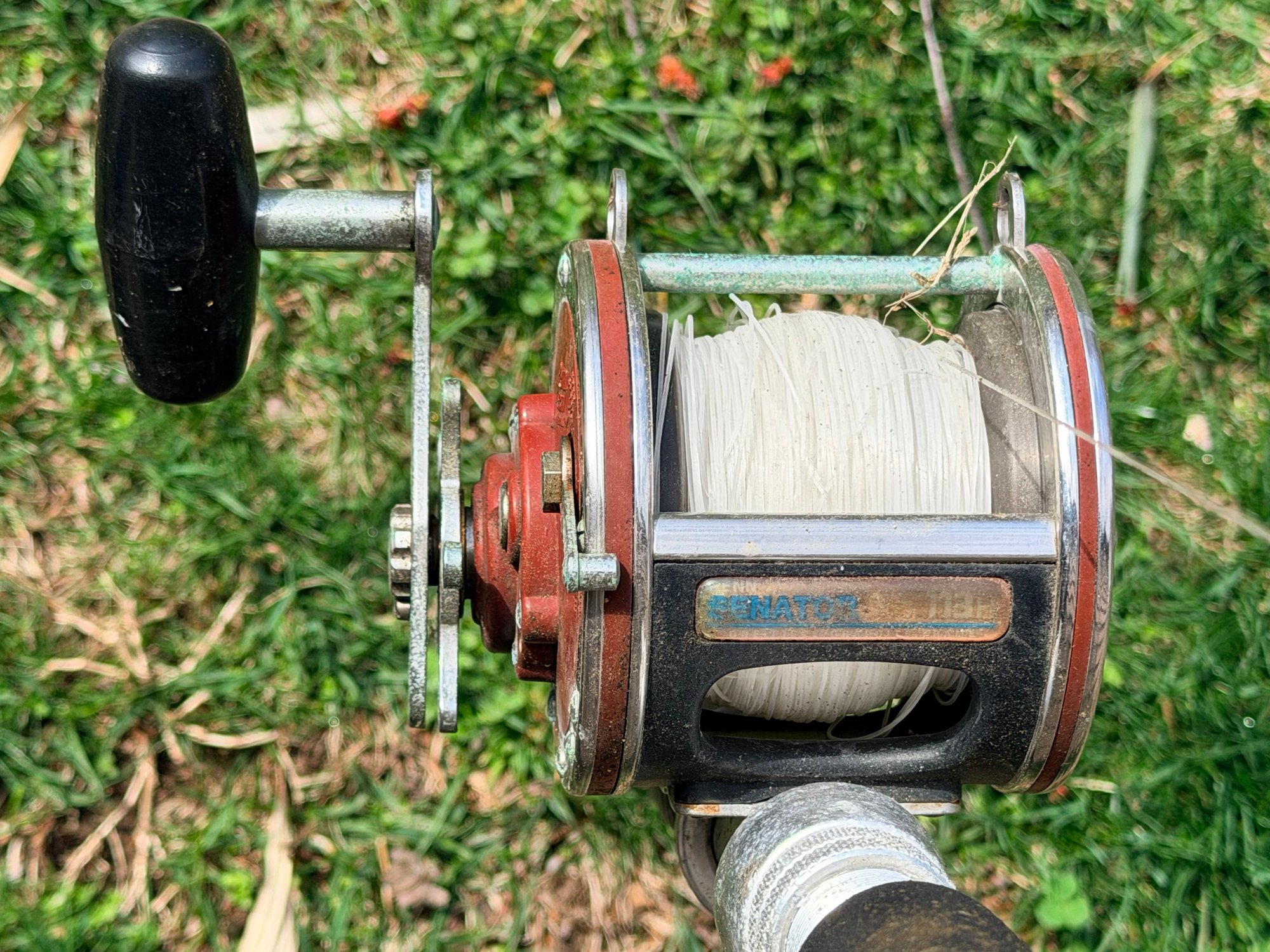 Good used condition with visible wear from outdoor use, including oxidation and patina on metal components and light scuffing to the rod and grip