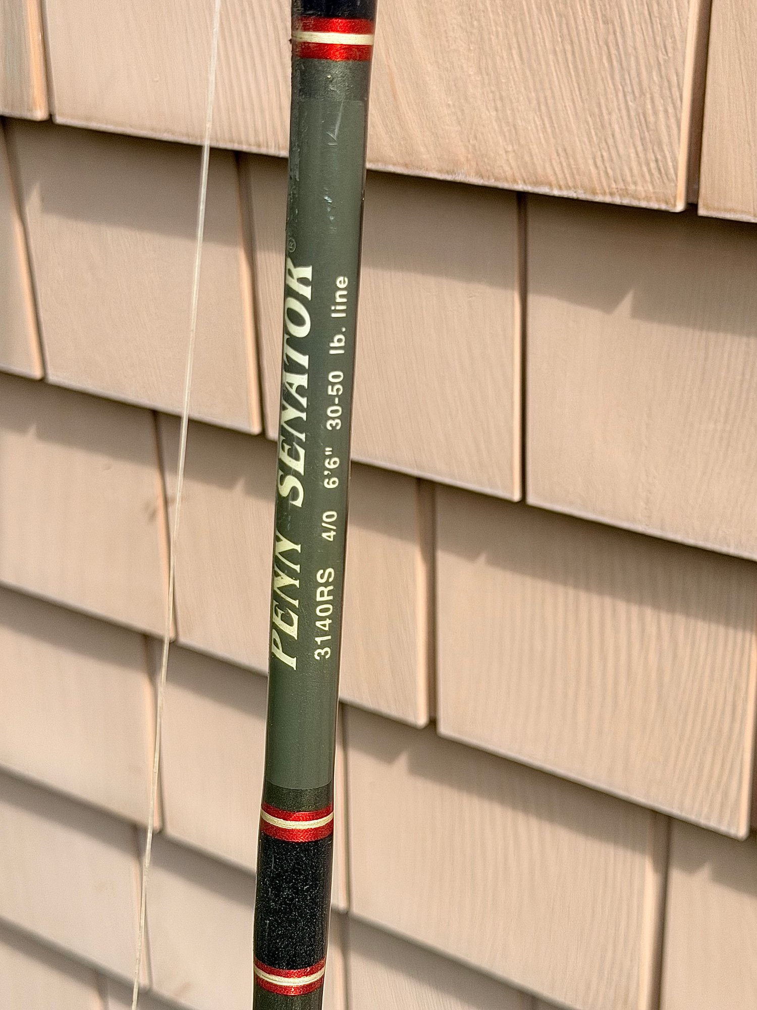 Penn Senator 3140RS conventional fishing rod and reel combo featuring a 6’6” rod rated for 30–50 lb line, paired with a Penn 113H Special 4/0 Senator reel with high-speed ball bearing construction, finished in classic green and red livery with foam grip handle and metal reel seat, suitable for offshore or heavy-duty saltwater fishing.