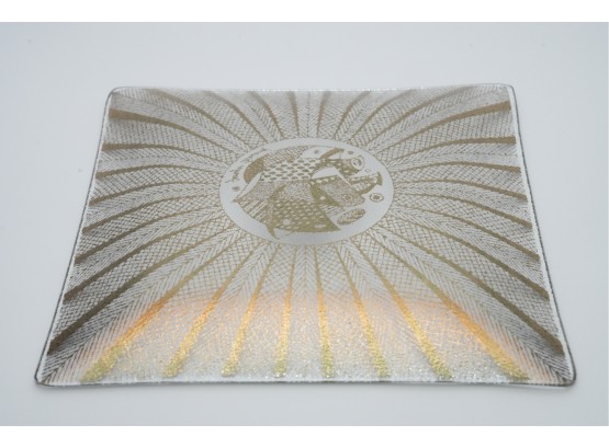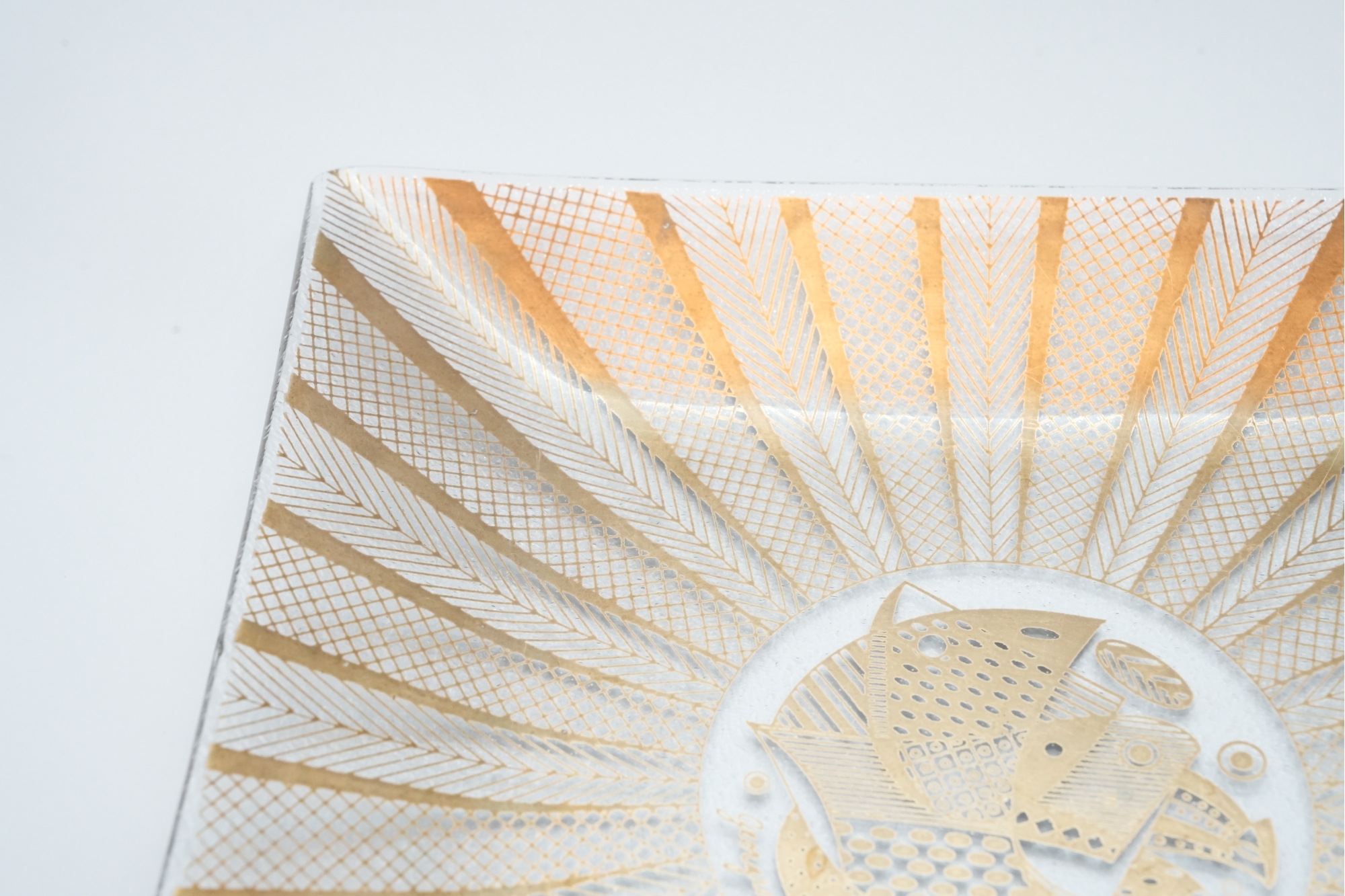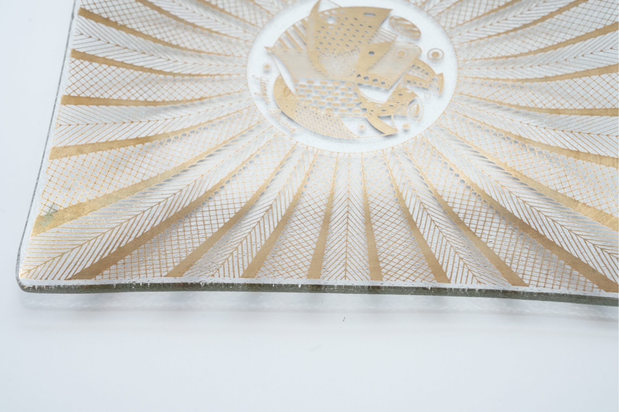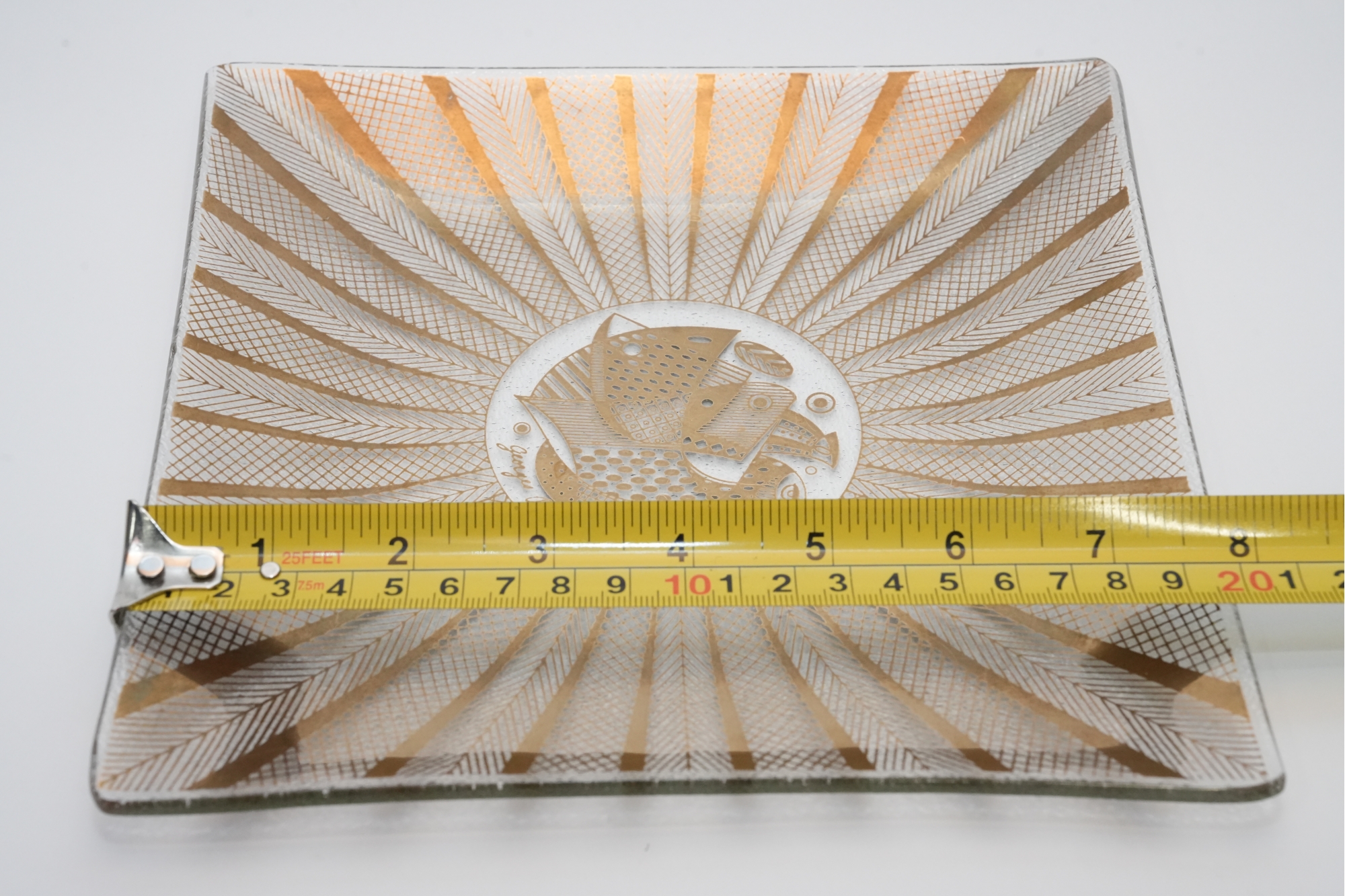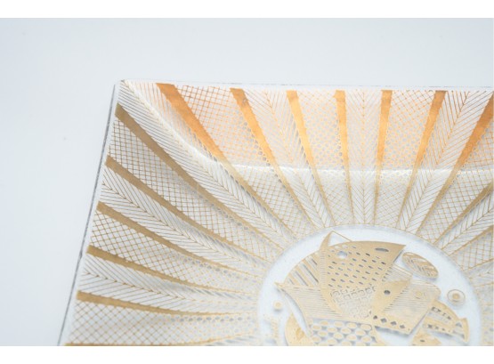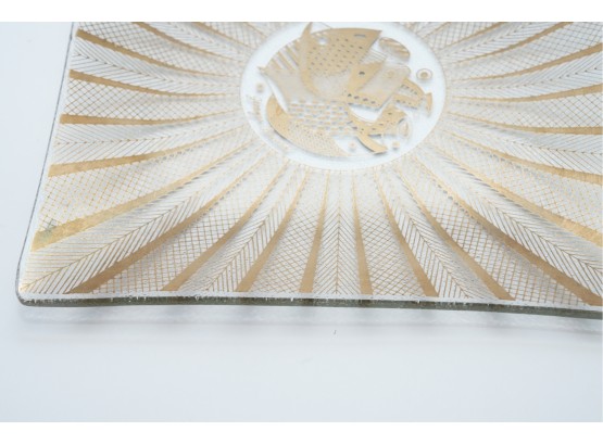 Mid century modern square glass serving tray designed by Georges Briard, featuring a striking gold sunburst pattern radiating from a central abstract motif. The design showcases Briard’s signature blend of bold geometric styling and metallic detailing, with finely etched and gilded decoration on clear glass. The tray has gently upturned edges and a substantial feel, making it ideal for barware service, cocktails, or display as a decorative accent piece.