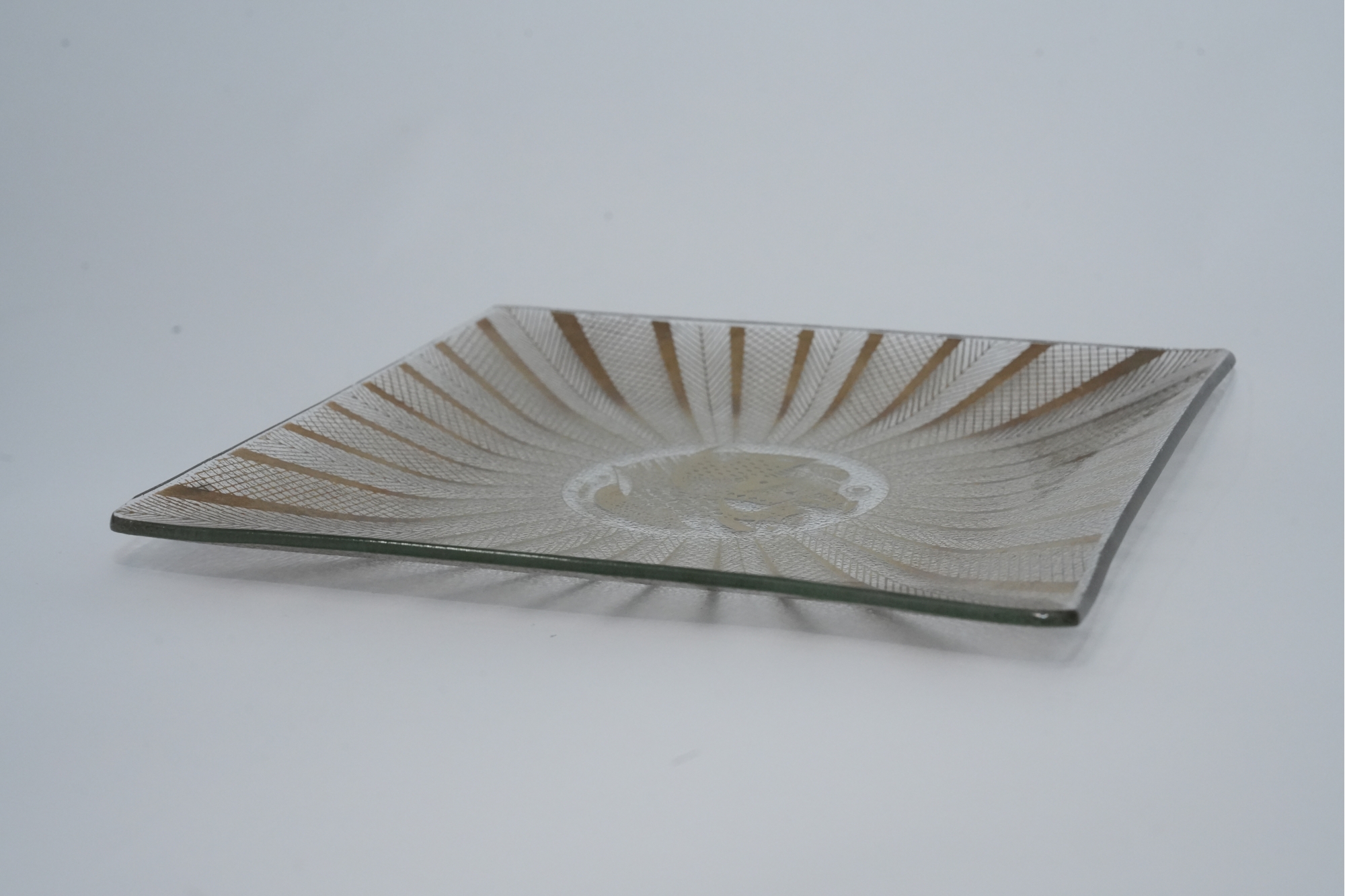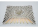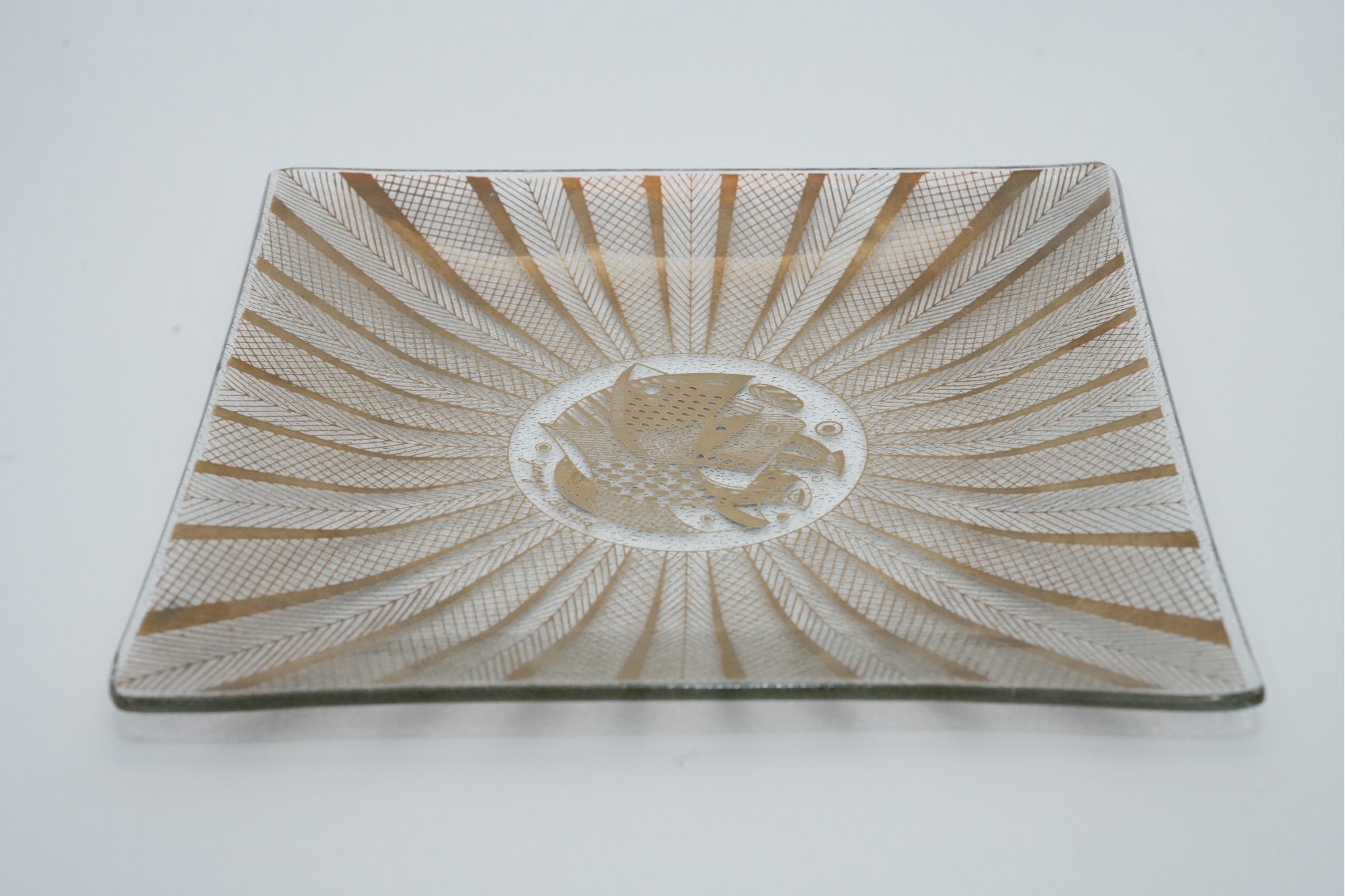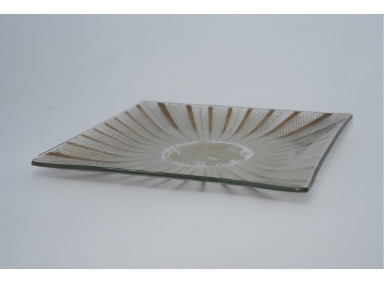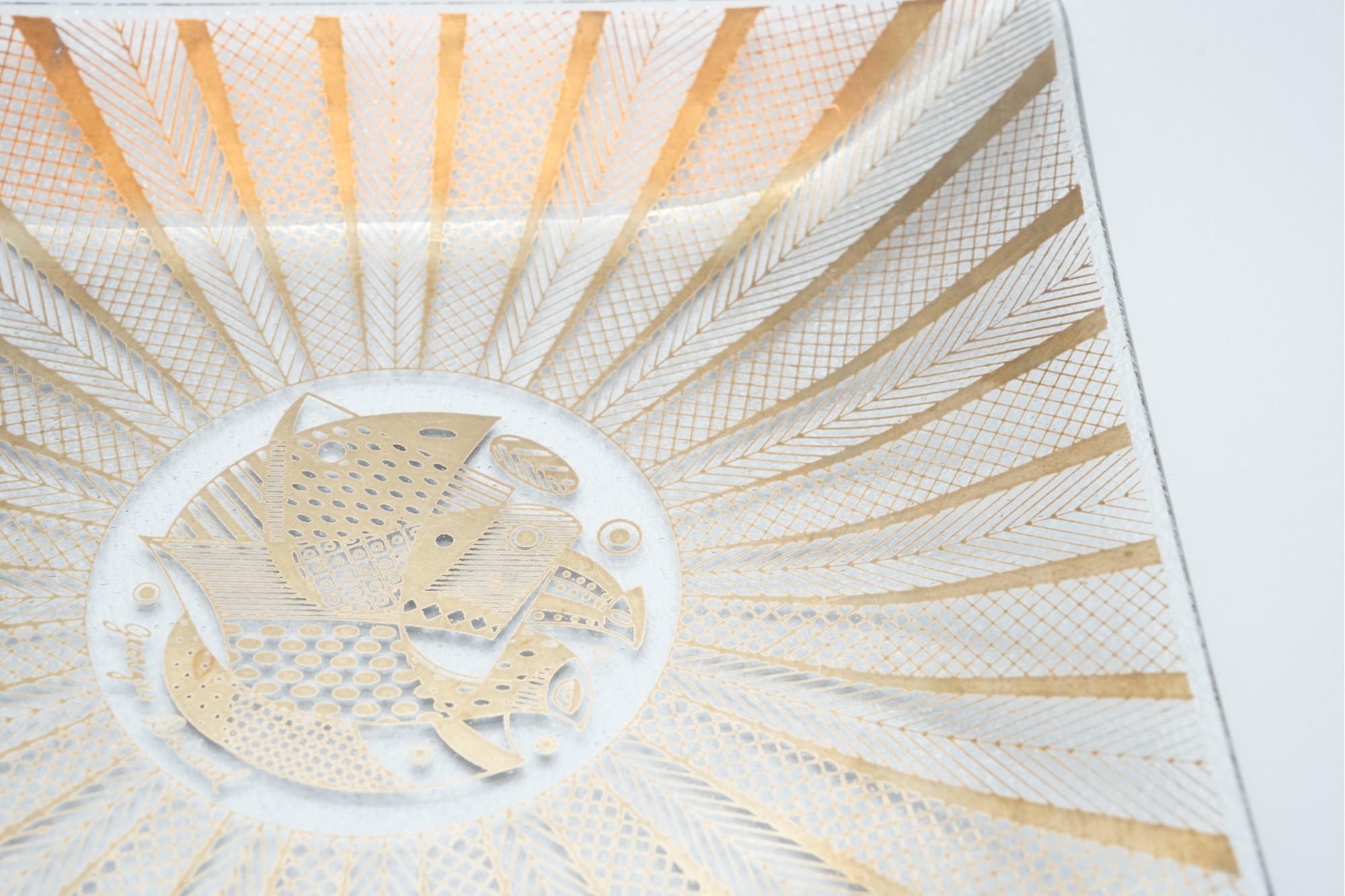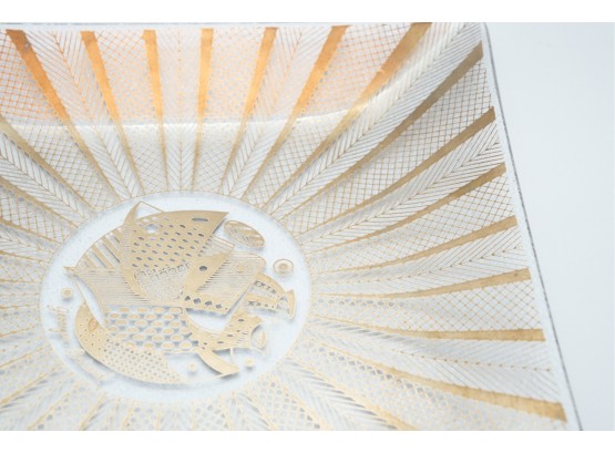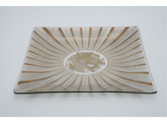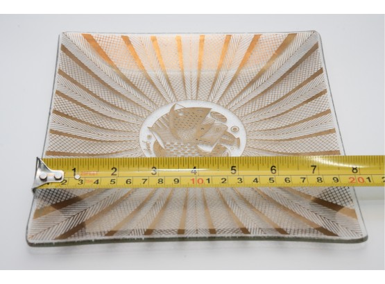 Mid century modern square glass serving tray designed by Georges Briard, featuring a striking gold sunburst pattern radiating from a central abstract motif. The design showcases Briard’s signature blend of bold geometric styling and metallic detailing, with finely etched and gilded decoration on clear glass. The tray has gently upturned edges and a substantial feel, making it ideal for barware service, cocktails, or display as a decorative accent piece.